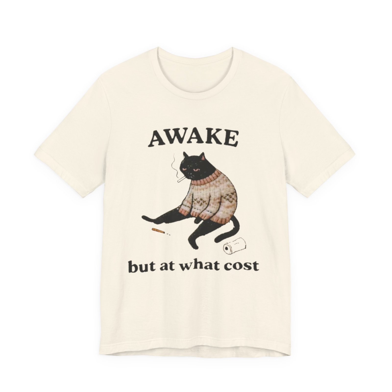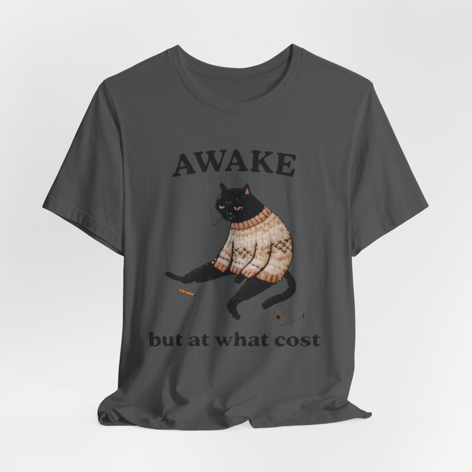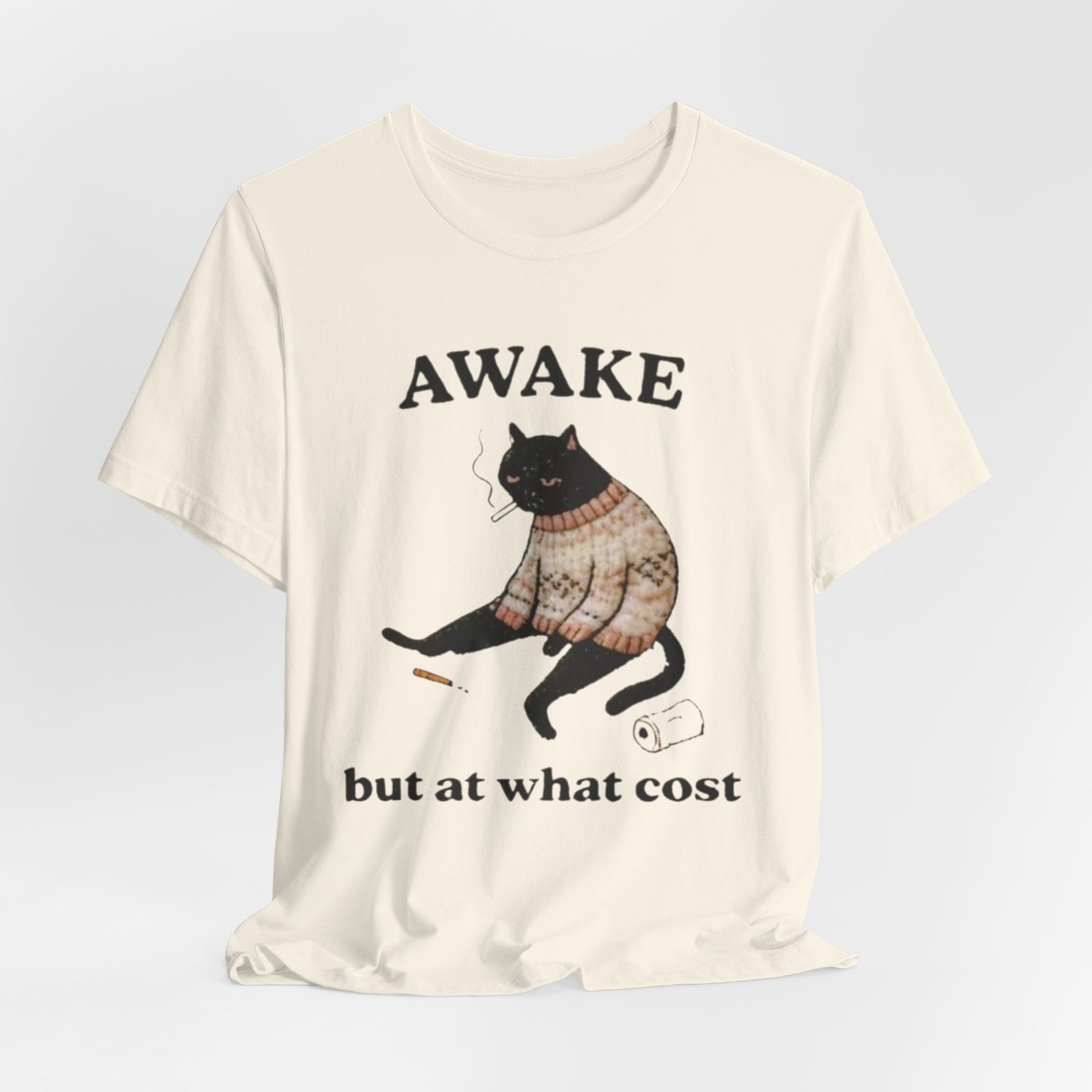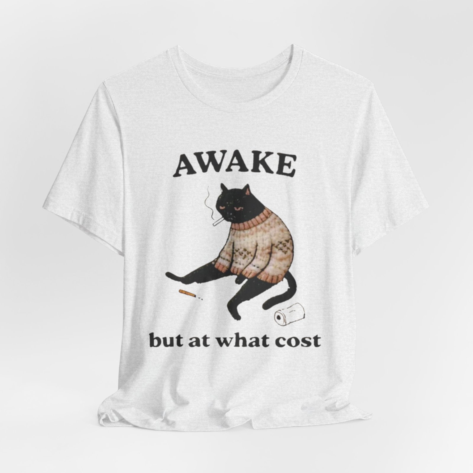 This lightweight tee carries a cozy, slightly sardonic mood — a sleepy black cat in a knitted sweater, half-listless, surrounded by the detritus of late-night life. The headline “AWAKE” sits above the cat, with “but at what cost” below, turning that bleary, caffeine-fueled energy into a wry inside joke. Wear it on slow mornings, long study nights, or when you want to signal dry humor without saying a word. The retail crew neck and soft Airlume combed cotton feel breathable against the skin and layer cleanly under jackets or over a long-sleeve for cooler days. It’s cut for a tidy silhouette that still moves with you — comfortable for errands, coffee runs, or curled-up reading sessions.