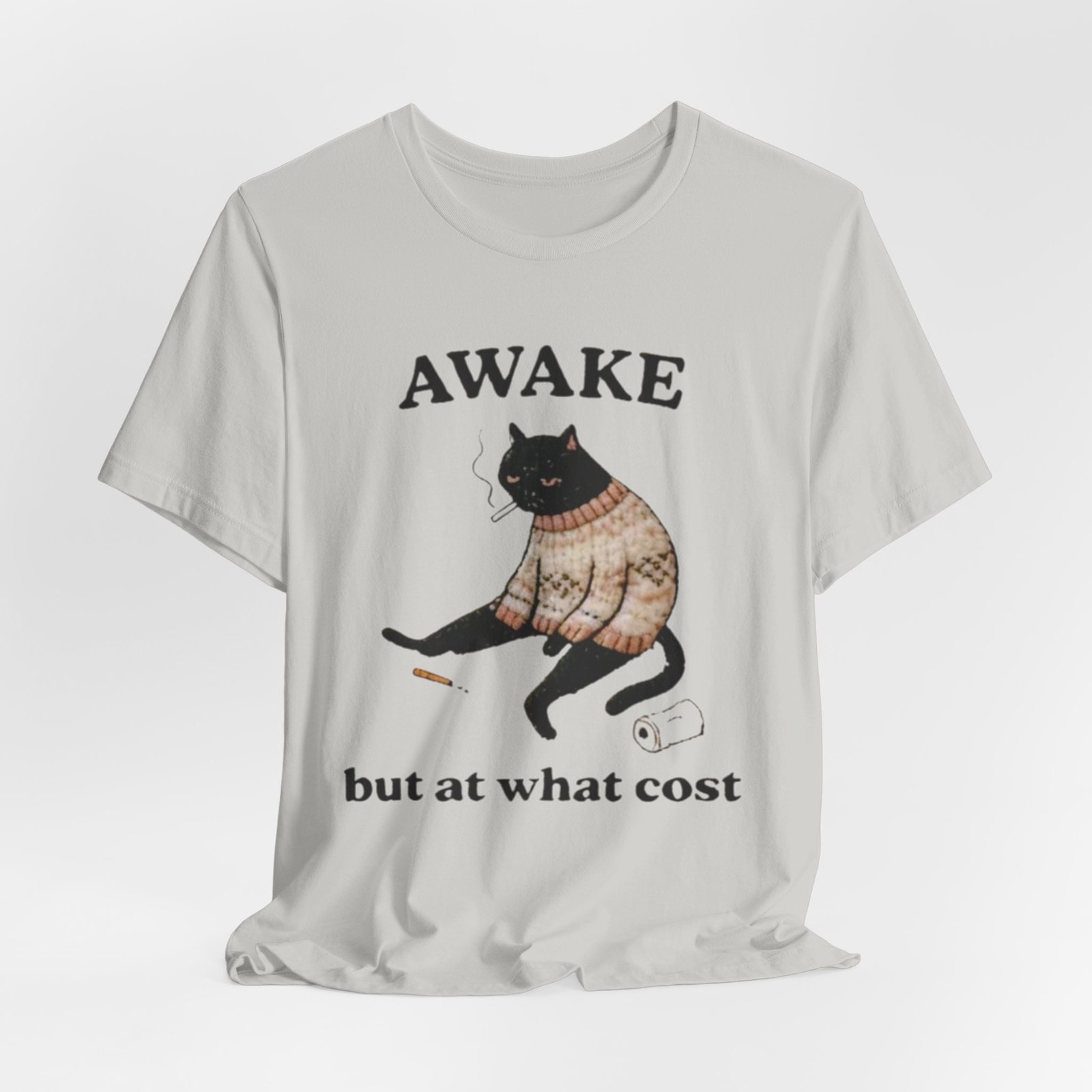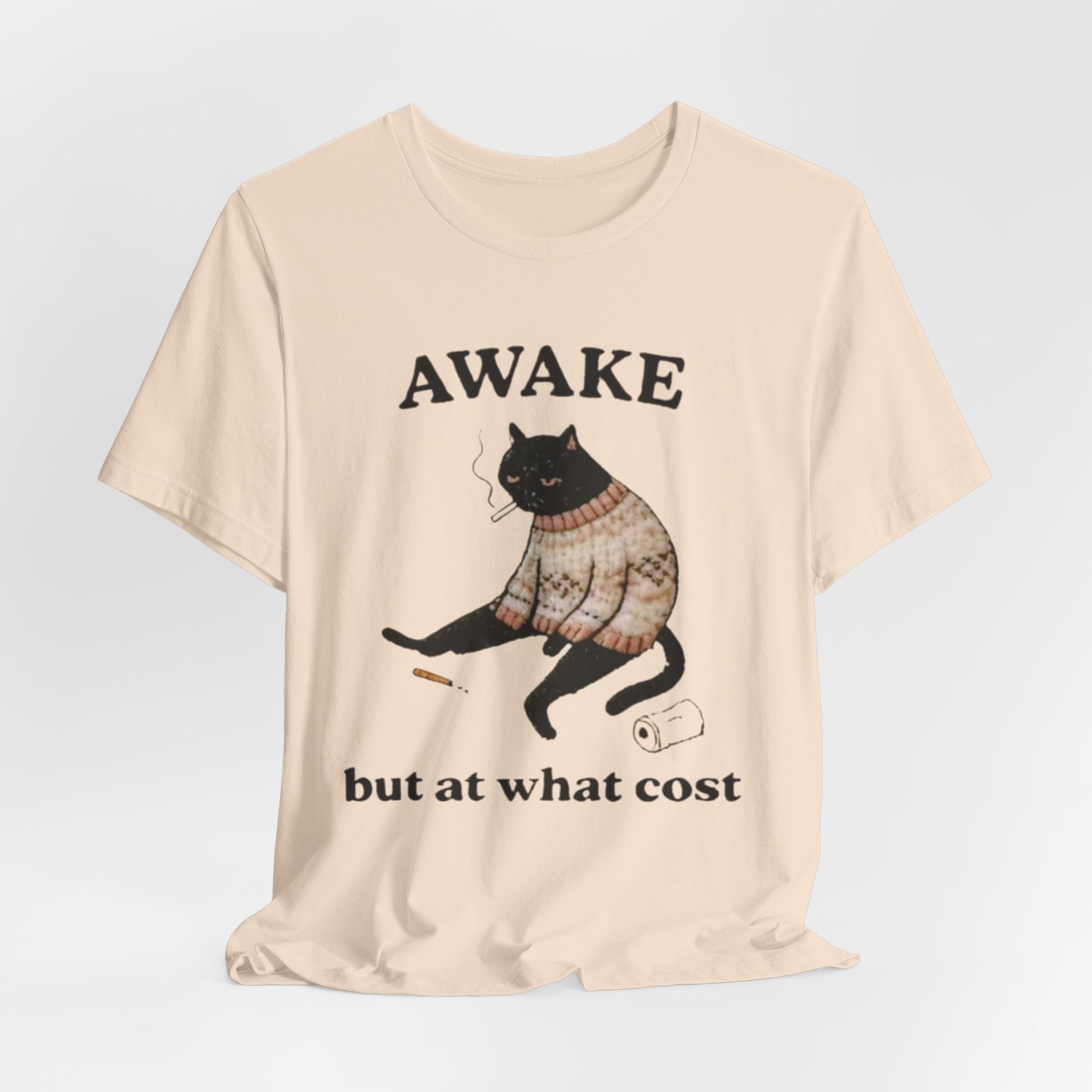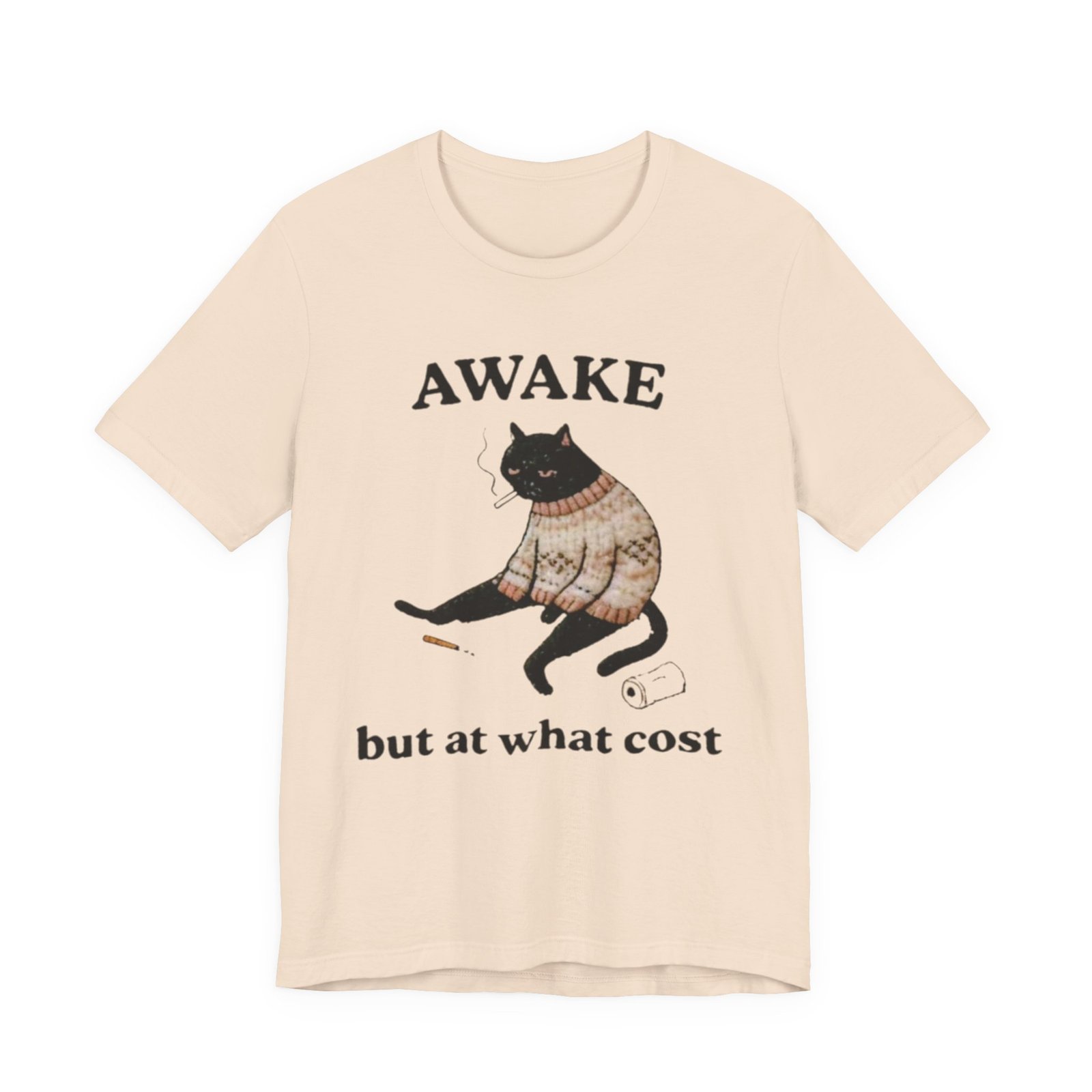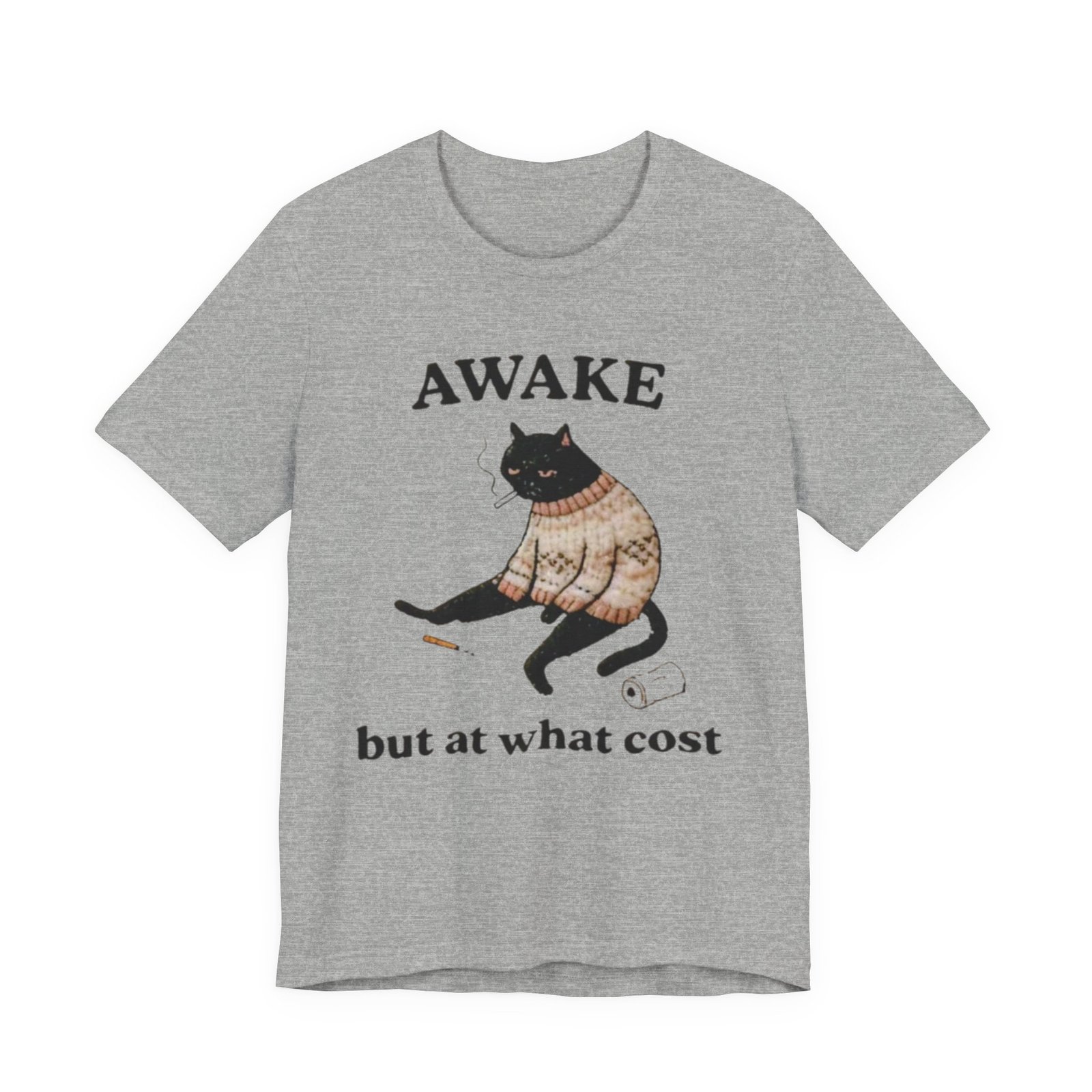 This lightweight tee carries a cozy, slightly sardonic mood — a sleepy black cat in a knitted sweater, half-listless, surrounded by the detritus of late-night life. The headline “AWAKE” sits above the cat, with “but at what cost” below, turning that bleary, caffeine-fueled energy into a wry inside joke. Wear it on slow mornings, long study nights, or when you want to signal dry humor without saying a word. The retail crew neck and soft Airlume combed cotton feel breathable against the skin and layer cleanly under jackets or over a long-sleeve for cooler days. It’s cut for a tidy silhouette that still moves with you — comfortable for errands, coffee runs, or curled-up reading sessions.
