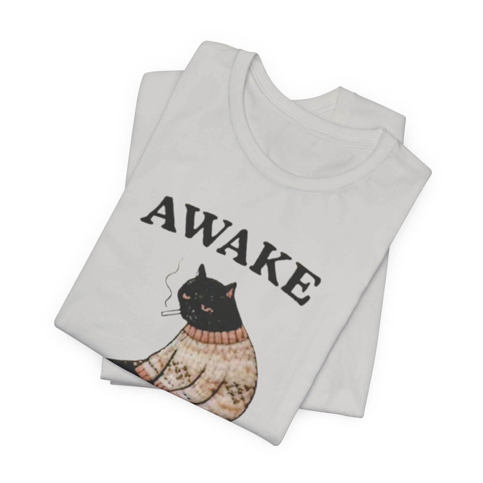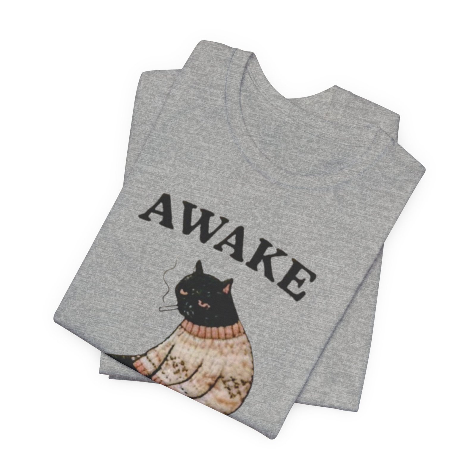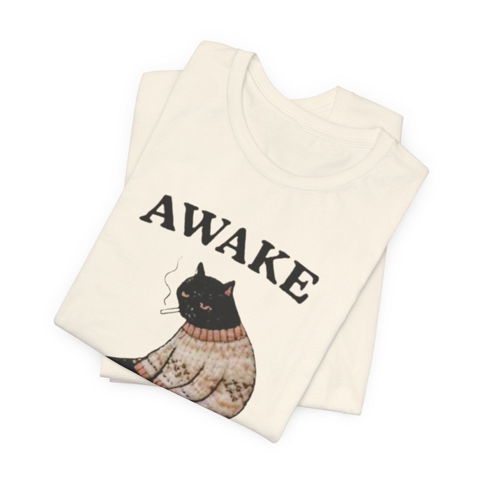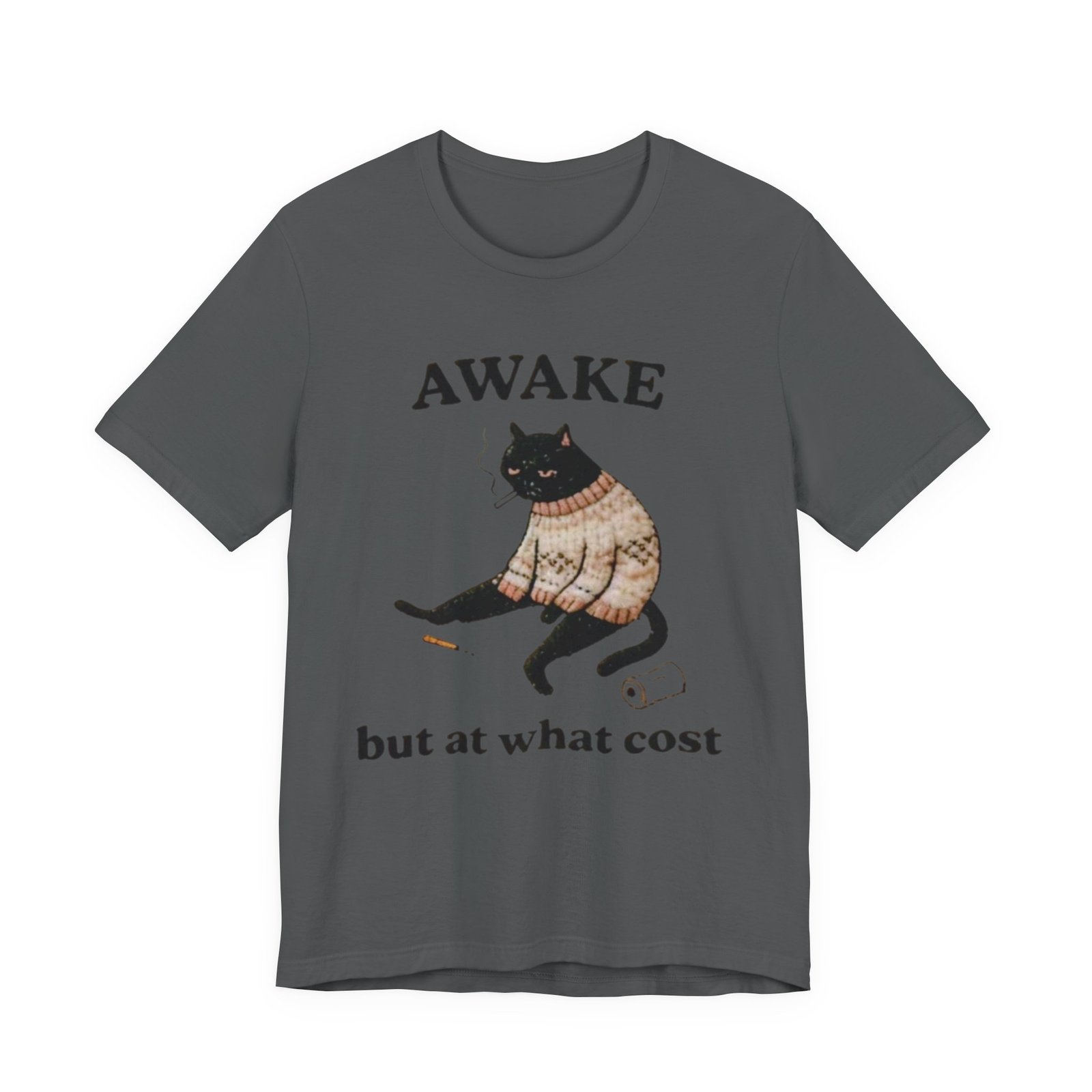This lightweight tee carries a cozy, slightly sardonic mood — a sleepy black cat in a knitted sweater, half-listless, surrounded by the detritus of late-night life. The headline “AWAKE” sits above the cat, with “but at what cost” below, turning that bleary, caffeine-fueled energy into a wry inside joke. Wear it on slow mornings, long study nights, or when you want to signal dry humor without saying a word. The retail crew neck and soft Airlume combed cotton feel breathable against the skin and layer cleanly under jackets or over a long-sleeve for cooler days. It’s cut for a tidy silhouette that still moves with you — comfortable for errands, coffee runs, or curled-up reading sessions.