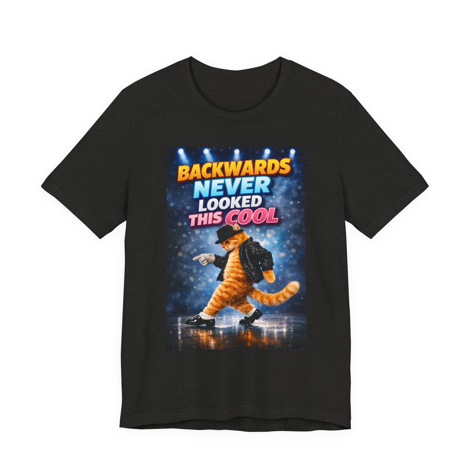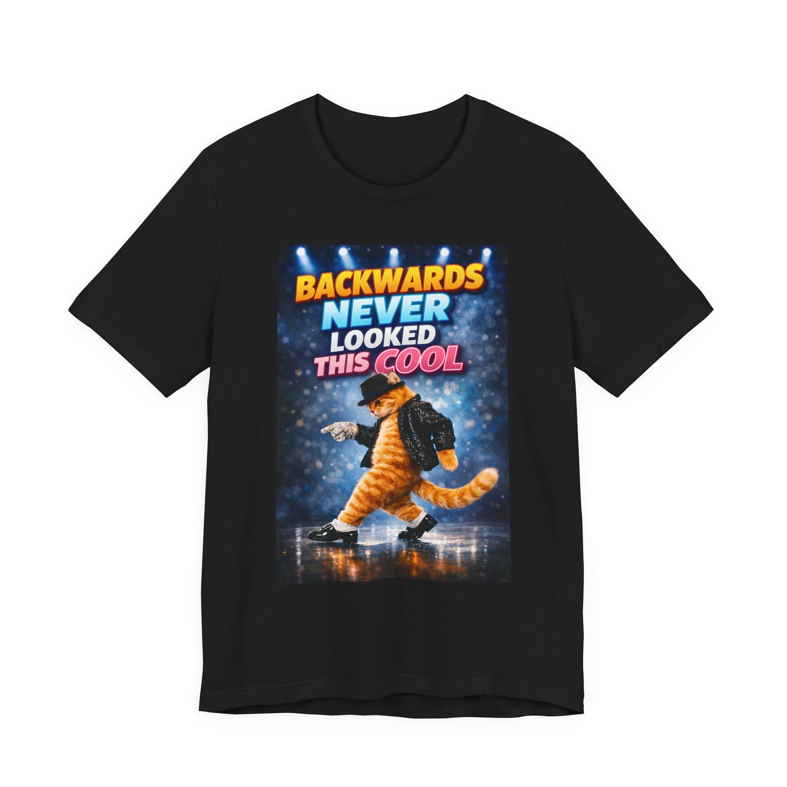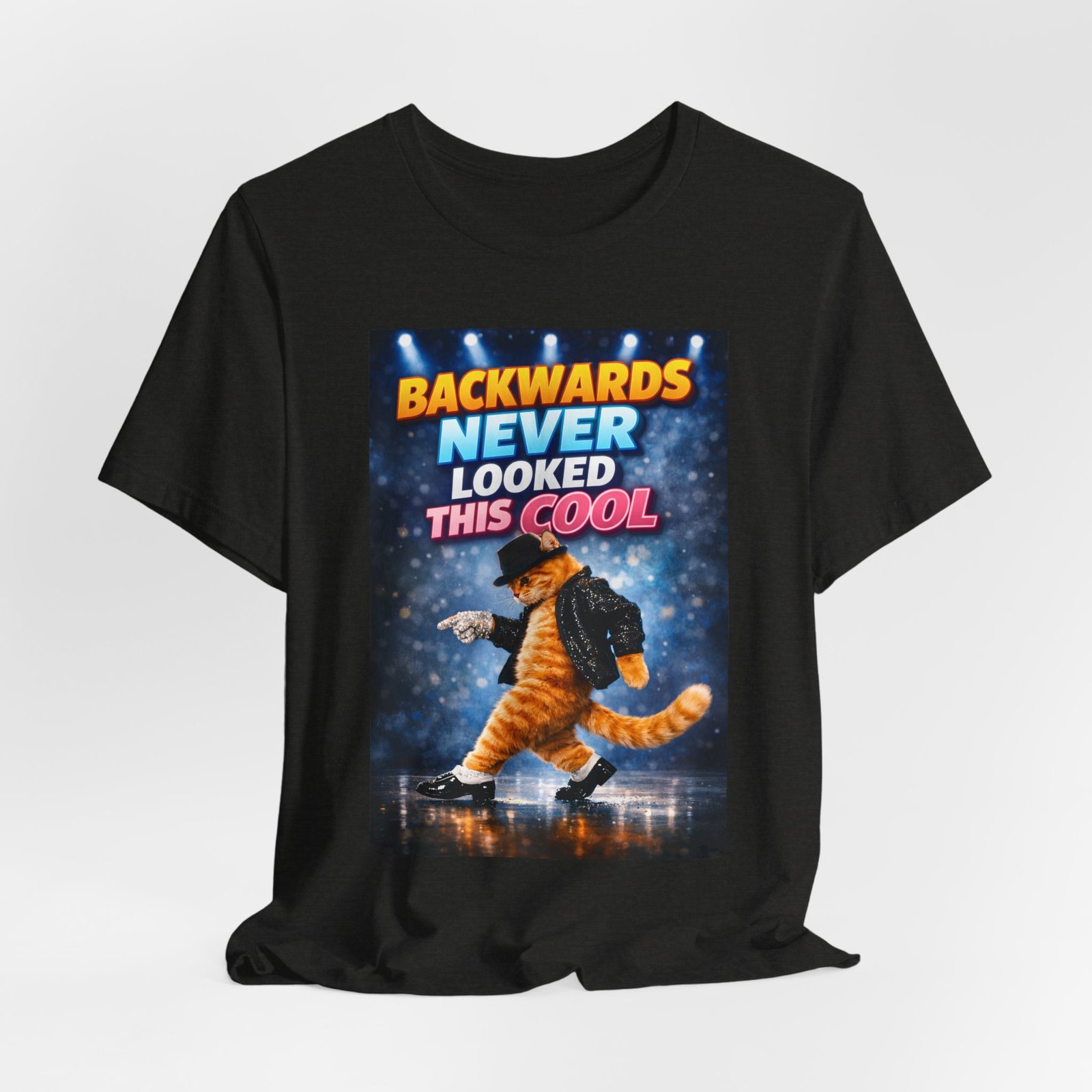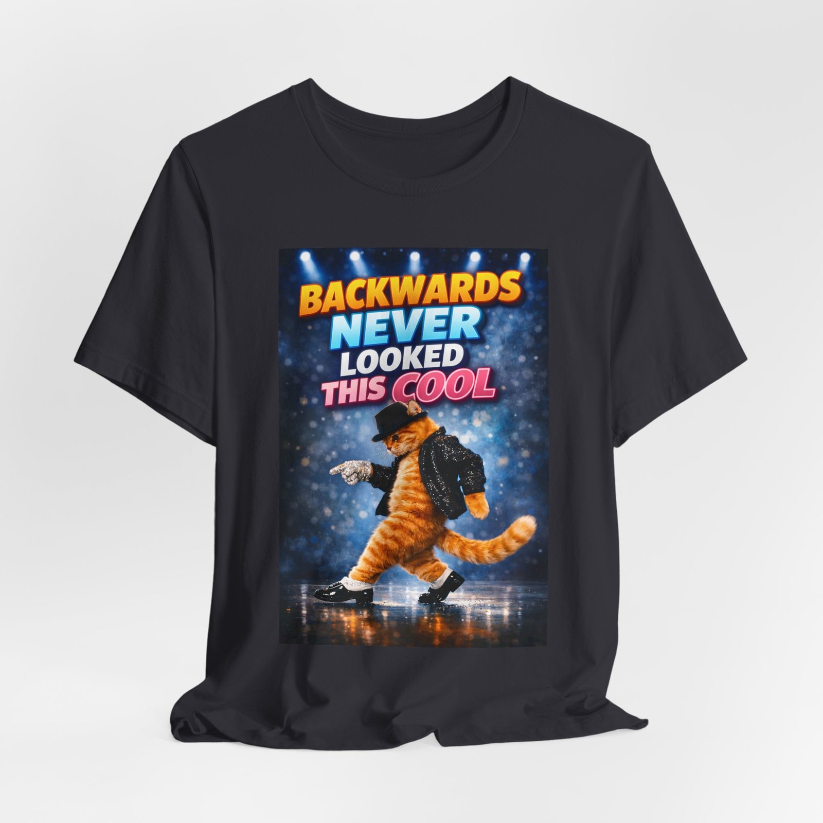 A lightweight, breathable tee that channels playful confidence. This soft cotton shirt features a bold, retro-inspired graphic of a moonlit stage and a striking character mid-dance, with the cheeky slogan “BACKWARDS NEVER LOOKED THIS COOL.” It sits comfortably on the body thanks to side seams and a retail fit, while the ribbed knit collar and shoulder tape keep the shape crisp after many wears. Tear-away label and responsible manufacturing make it easy on the skin and the conscience. Wear it when you want to bring humor and swagger to nights out, casual meetups, or anytime you need a statement piece that’s both comfortable and eye-catching.