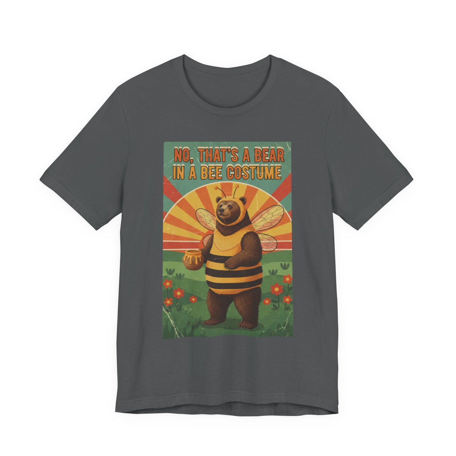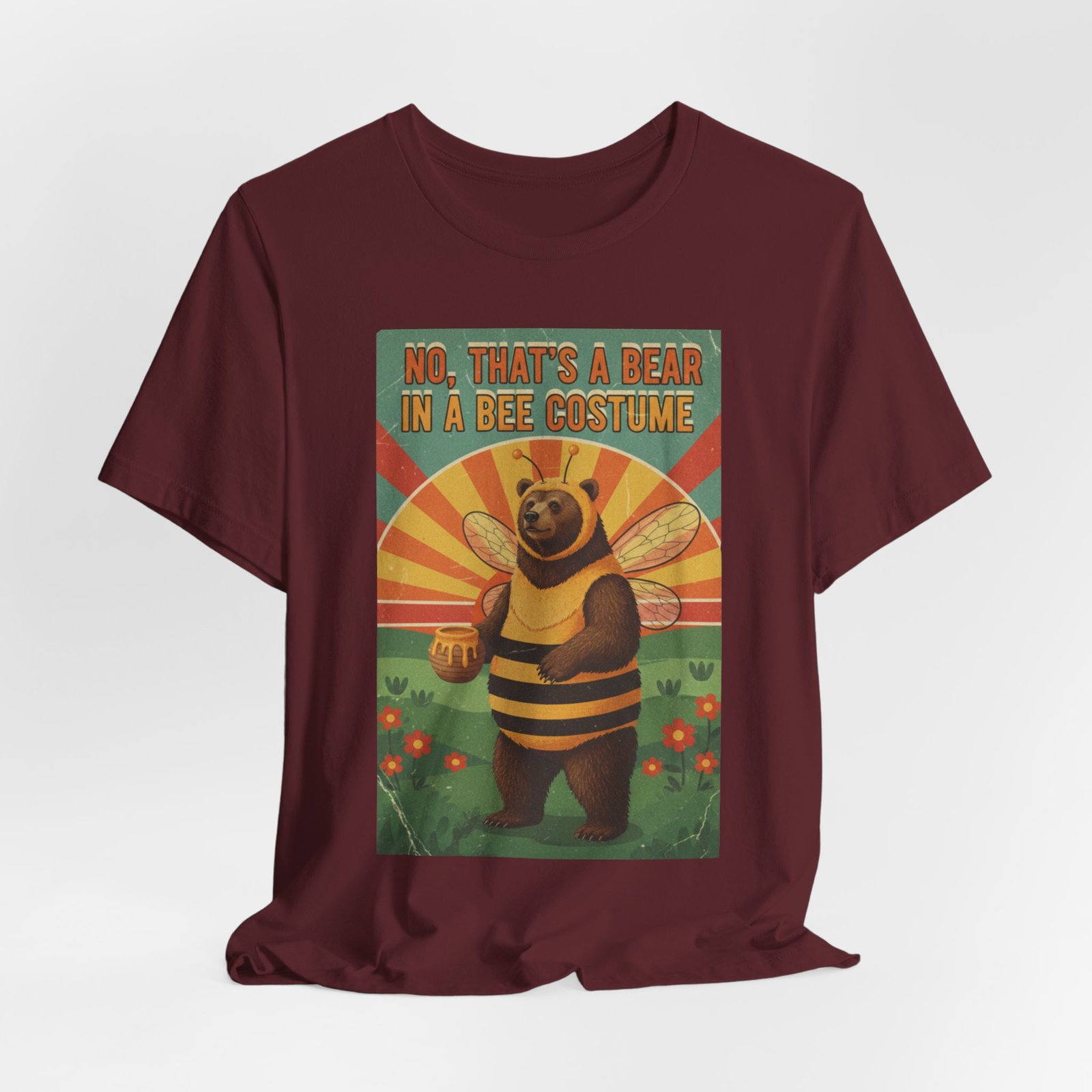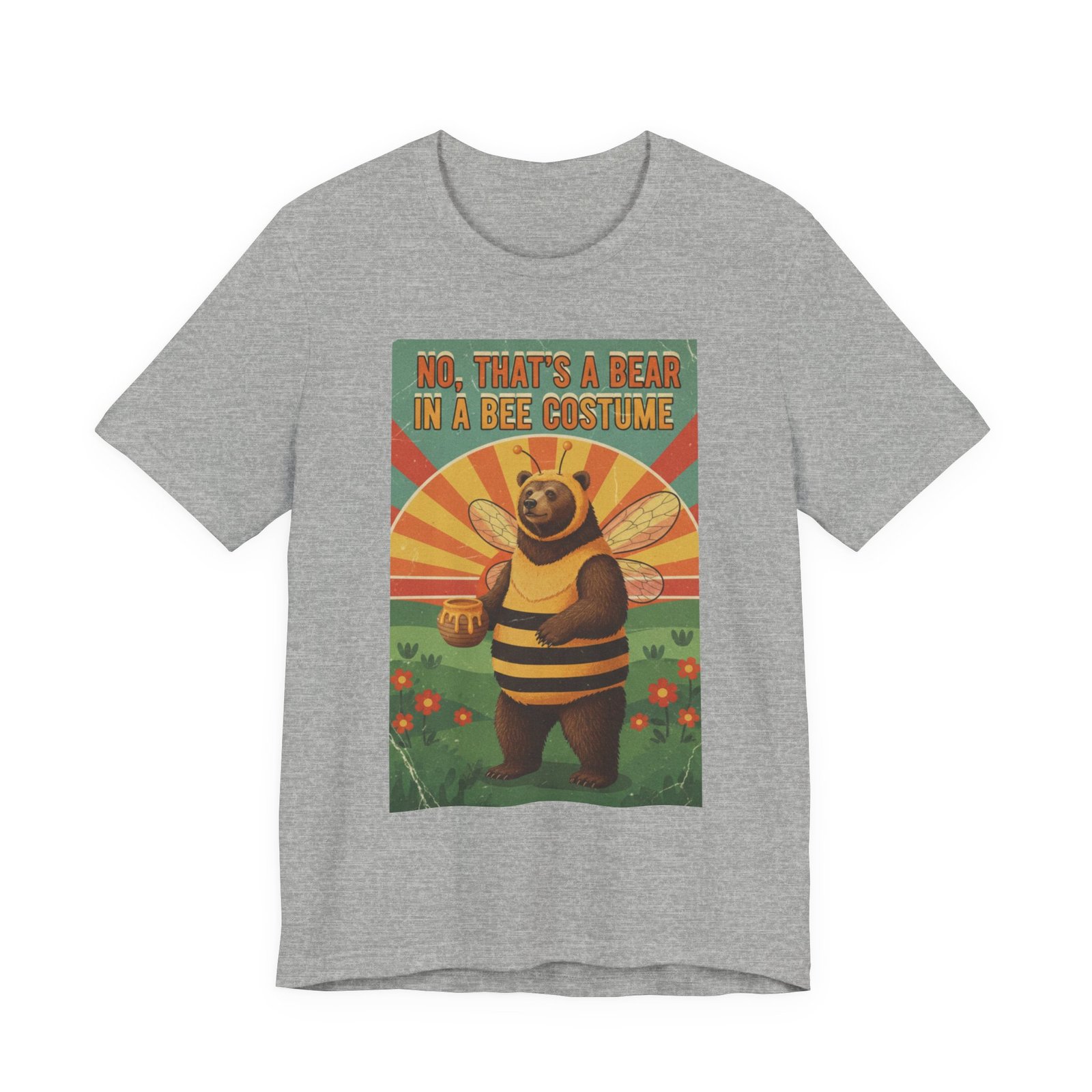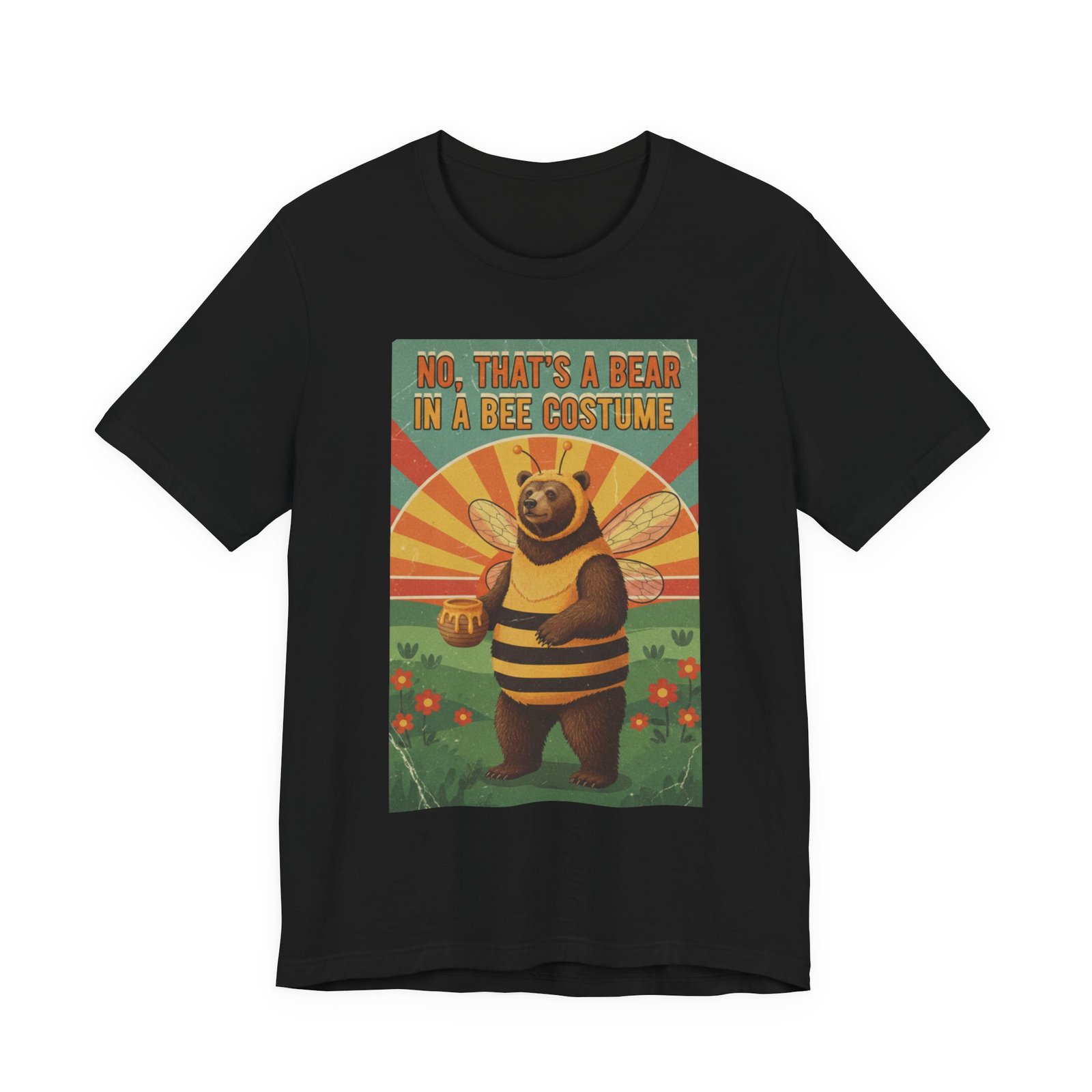 Soft, breathable tee with a playful vintage-style illustration of a bear dressed as a bee. The artwork sits centered on the chest with warm retro colors and sunburst lines, giving the shirt a nostalgic, storybook feel. Lightweight Airlume combed cotton keeps the fabric comfortable for everyday wear and easy layering. Clean crew neckline and retail fit make it look put-together while staying casual. Ethically produced and REACH certified for peace of mind.