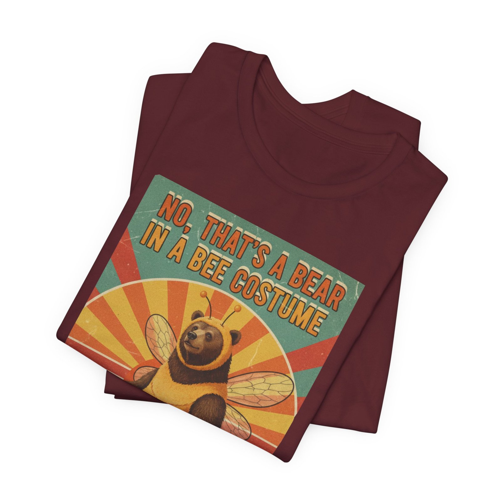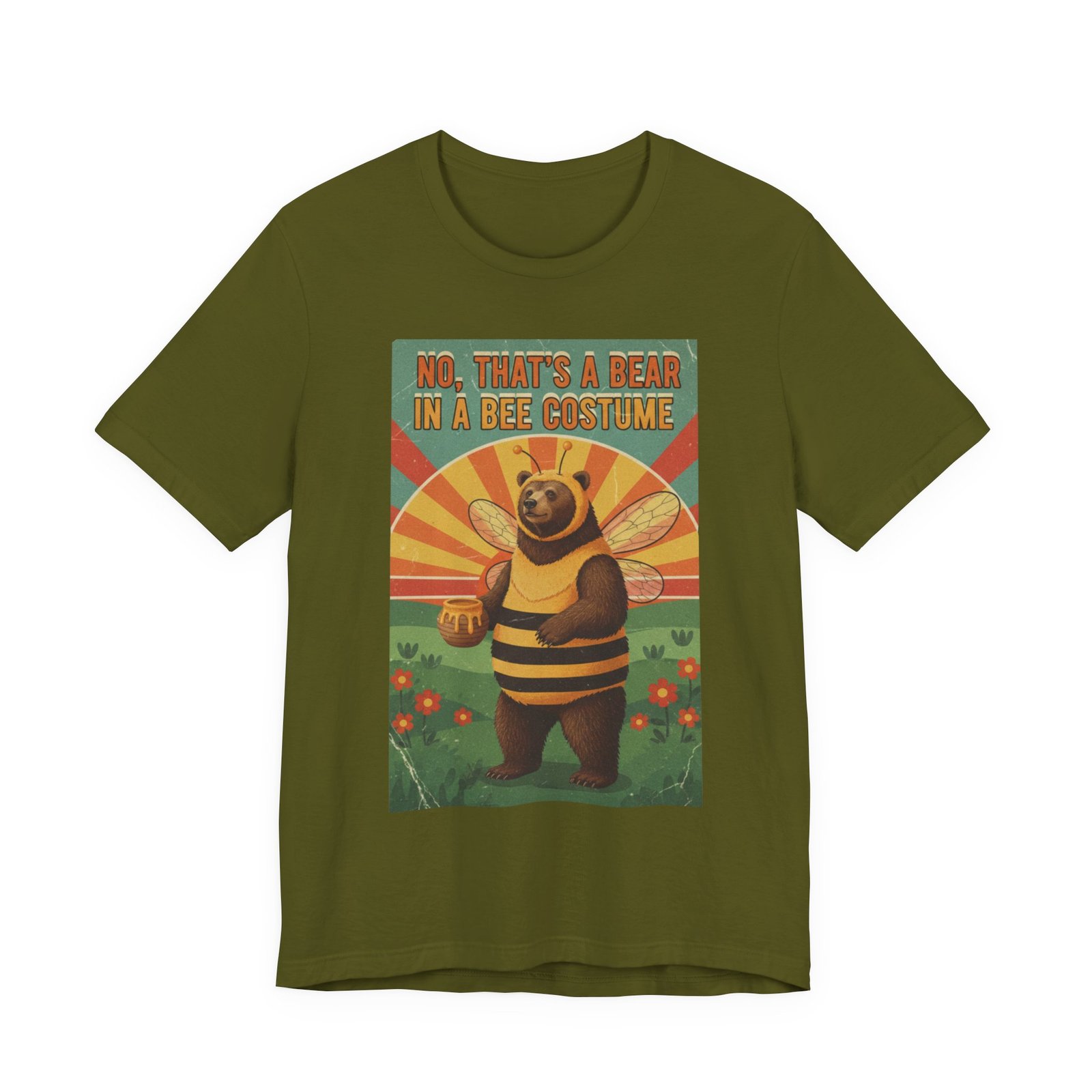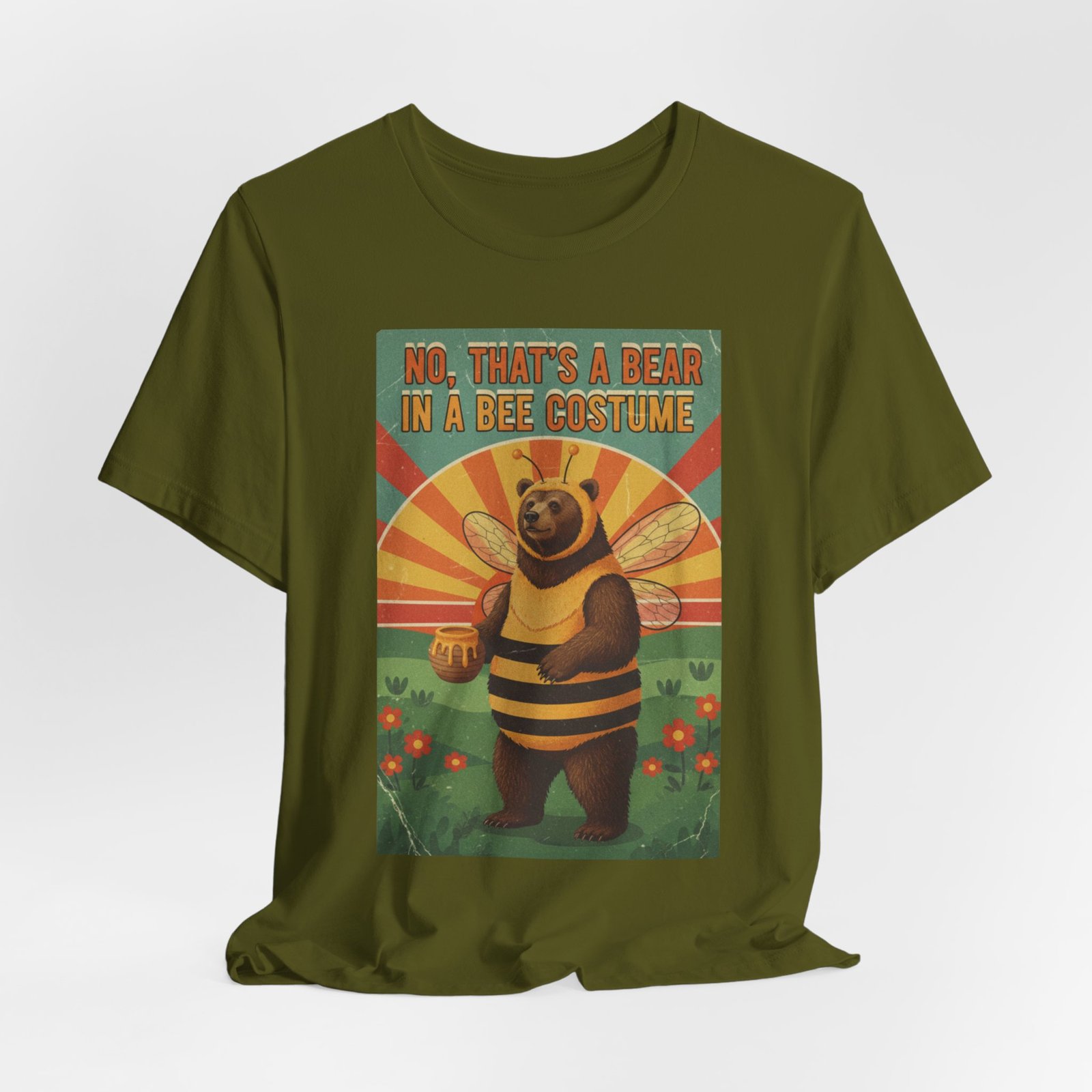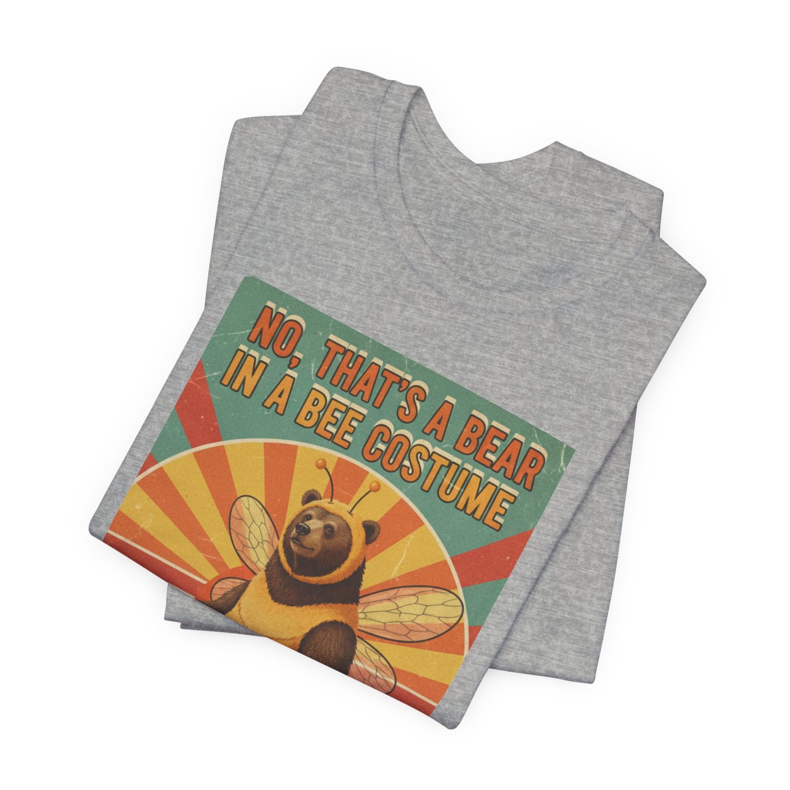 Soft, breathable tee with a playful vintage-style illustration of a bear dressed as a bee. The artwork sits centered on the chest with warm retro colors and sunburst lines, giving the shirt a nostalgic, storybook feel. Lightweight Airlume combed cotton keeps the fabric comfortable for everyday wear and easy layering. Clean crew neckline and retail fit make it look put-together while staying casual. Ethically produced and REACH certified for peace of mind.