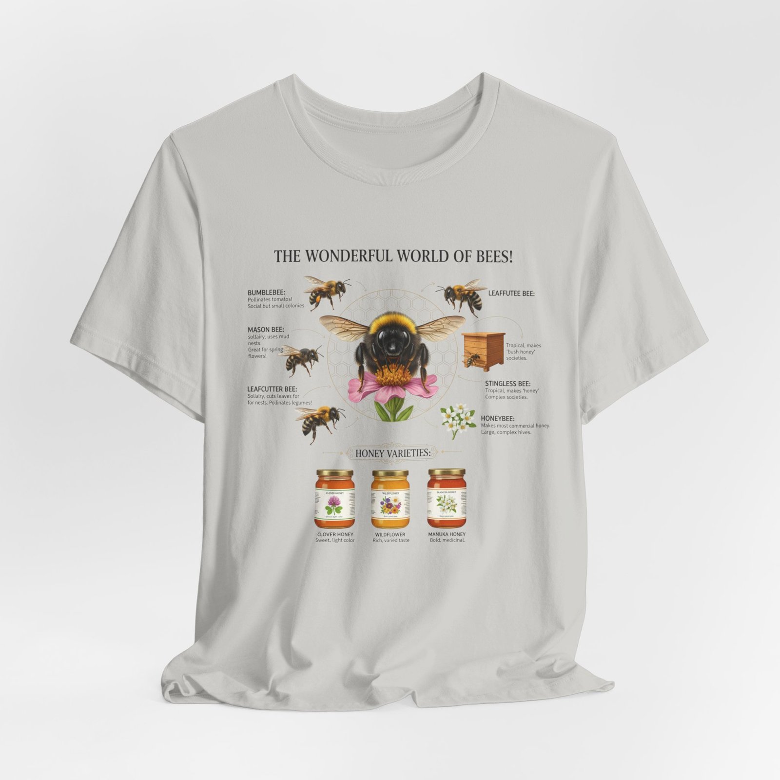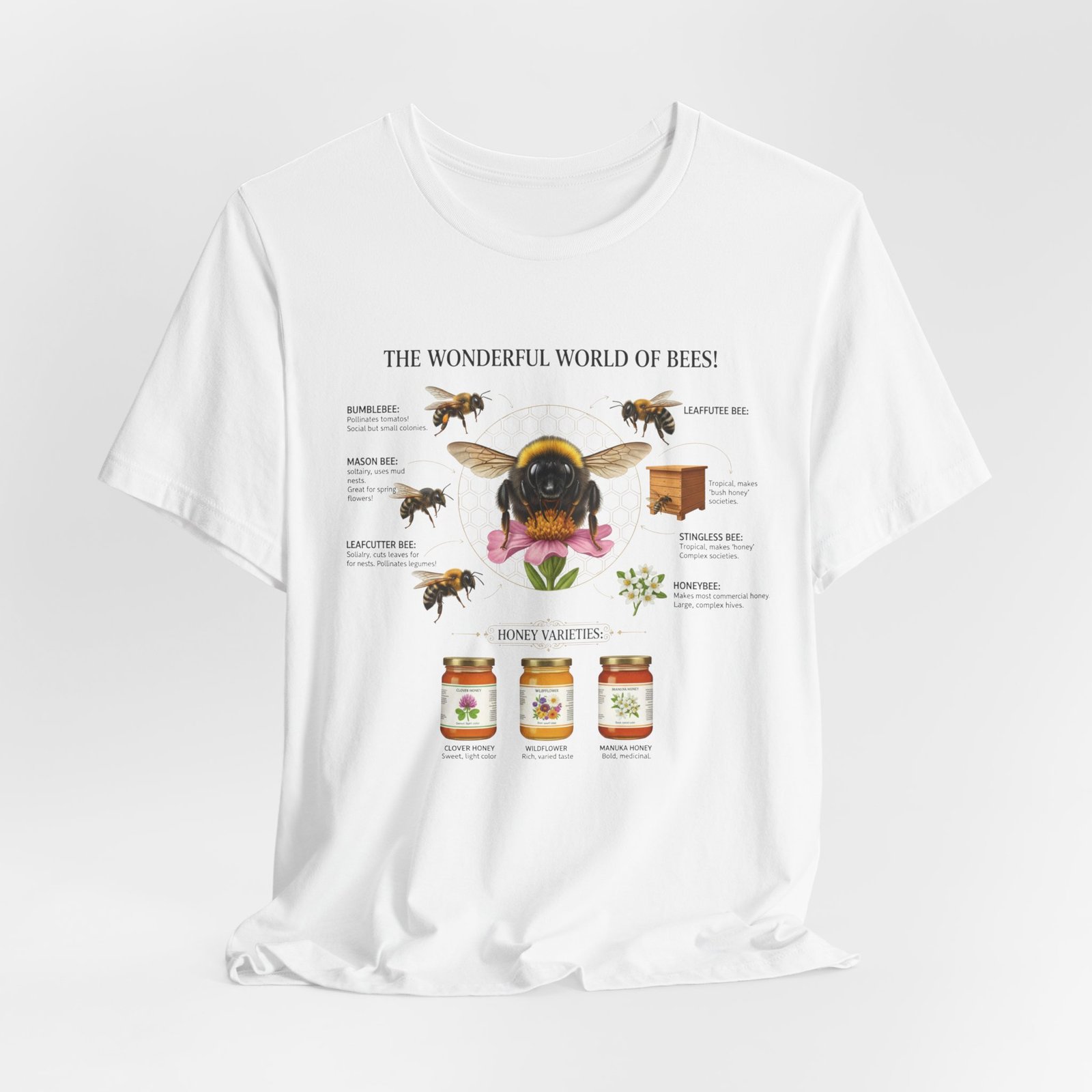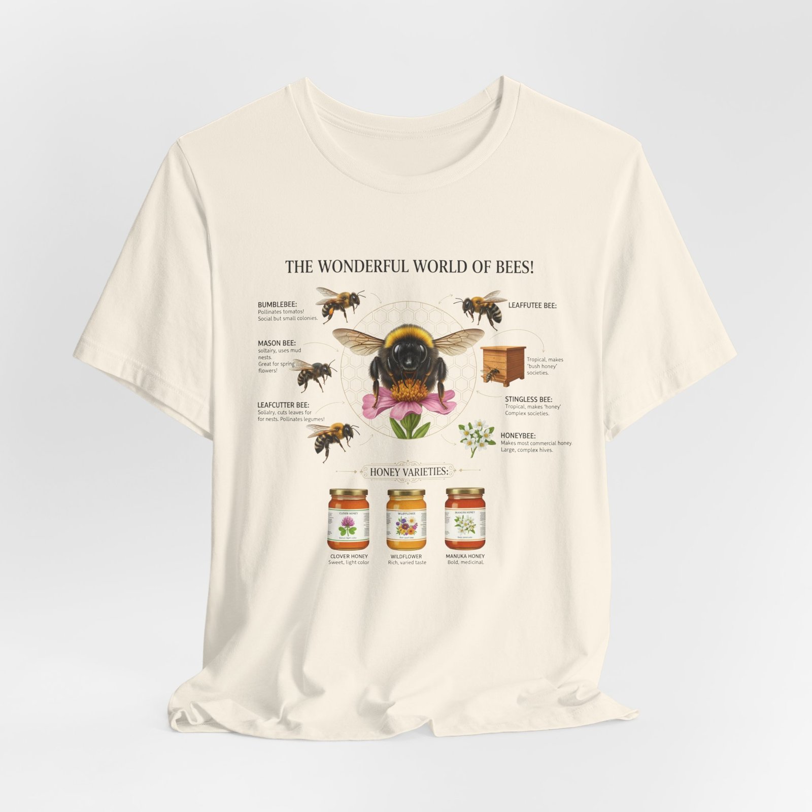 This lightweight tee brings the quiet joy of backyard beekeeping into everyday wear. Soft, breathable cotton rests gently against the skin while a beautifully detailed bee chart sits at the chest — labeled sketches of worker, queen, drone, hive parts and honey jars that invite a closer look. It feels like a warm morning among wildflowers: curious, informed, and quietly proud. Wear it on garden mornings, at farmers’ markets, or during informal meetups with other apiarists. The subtle retail fit and crew neckline make it easy to layer under a chore jacket or pair with jeans and boots for a casual, thoughtful outfit that shows you care about pollinators and craft honey. The artwork speaks the language of hobbyist beekeepers and nature lovers: botanical notes, hive anatomy, and honey varieties presented like a page from a field guide. It’s calm and conversational — wear it to seed swaps, observational hive inspections, or low-key community workshops where people trade tips and jars of seasonal honey. The tee’s responsibly produced fabric and tear-away label keep comfort high during long days outside, and the durable side seams and shoulder tape help it keep shape after repeated wear and washes. Product features – 100% Airlume combed ring-spun cotton (lightweight 4.2 oz) for breathable comfort – Side seams and shoulder tape preserve fit and structure over time – Ribbed knit collar with seam and retail crew neckline for a neat, classic look – DTF/DTG friendly print areas produce crisp, detailed chest and sleeve designs – Tear-away label, REACH certified; responsibly manufactured (Bella+Canvas supply chain) Care instructions – Machine wash: cold (max 30C or 90F) – Non-chlorine: bleach as needed – Tumble dry: low heat – Iron, steam or dry: medium heat – Do not dryclean