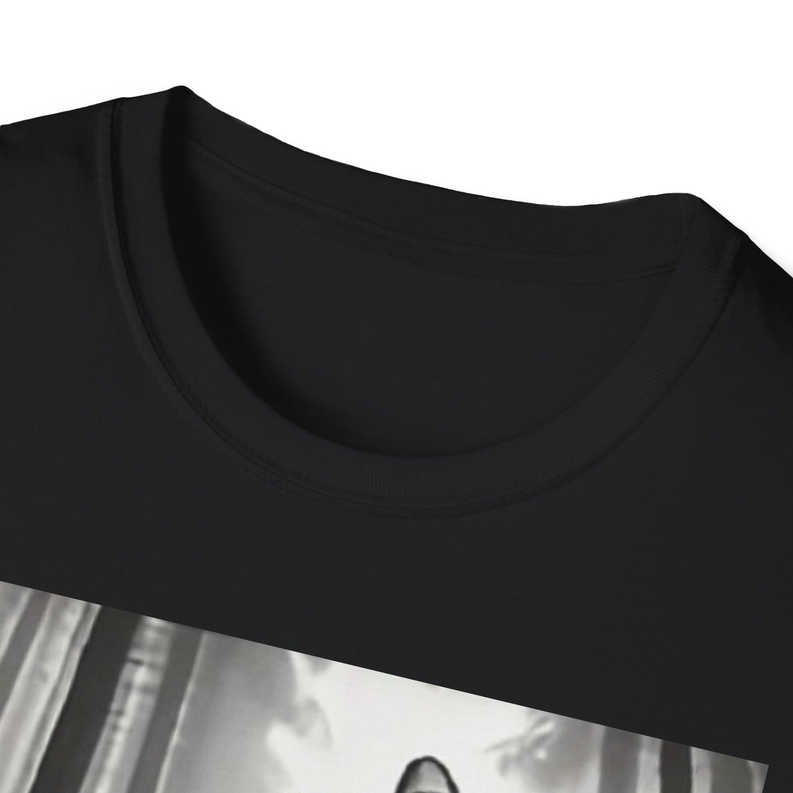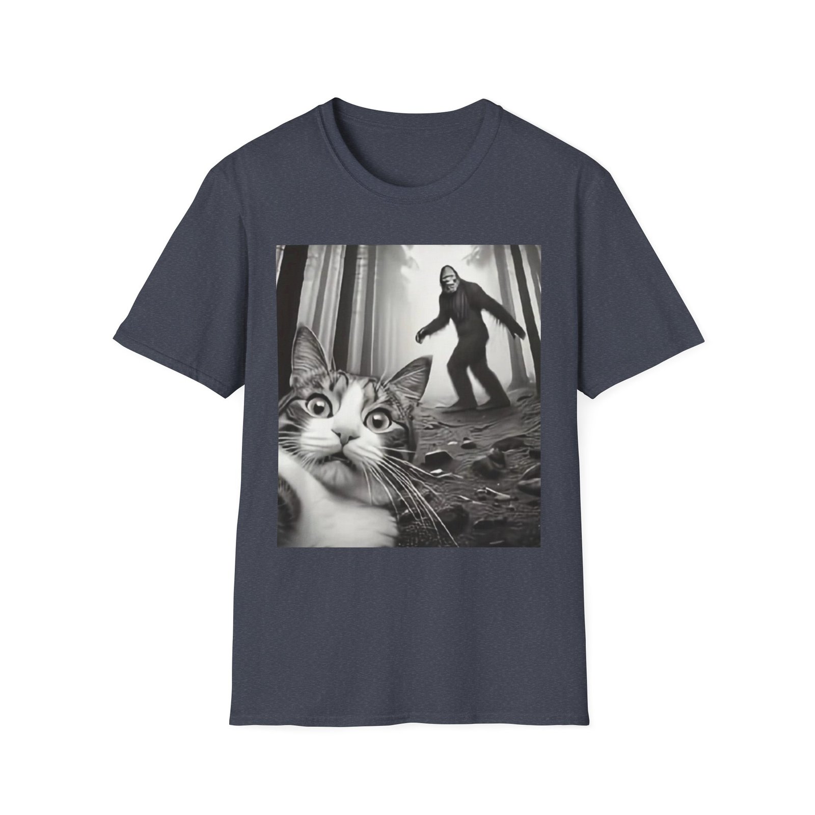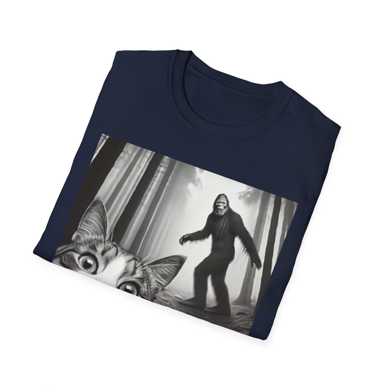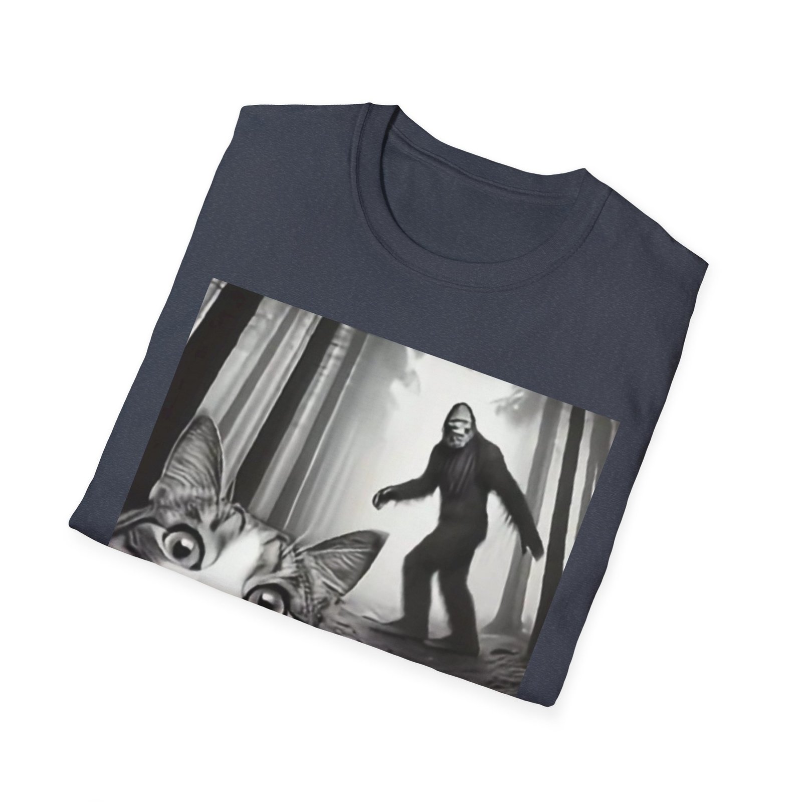 A soft, breathable tee that tells a small, strange story with every wear. The lightweight ring-spun cotton sits cool against skin while a black-and-white square print captures a startled cat in the foreground and a lumbering Sasquatch in the fogged woods behind — a snapshot of absurdity that invites smiles and double-takes. The crew neckline and classic fit keep the silhouette clean so the image stays the focal point. Wear it on casual days, at low-key meetups, or on walks when you want something that sparks conversation and quiet laughter. The smooth print and tear-away label make it comfortable for all-day use, and the ethical cotton and Oeko-Tex certification mean you’re choosing a thoughtful blank as the canvas for this playful design.