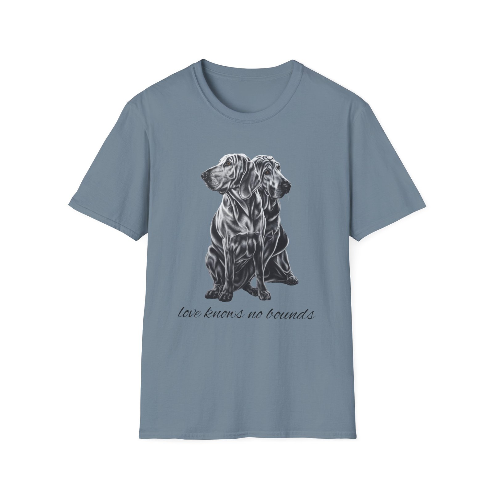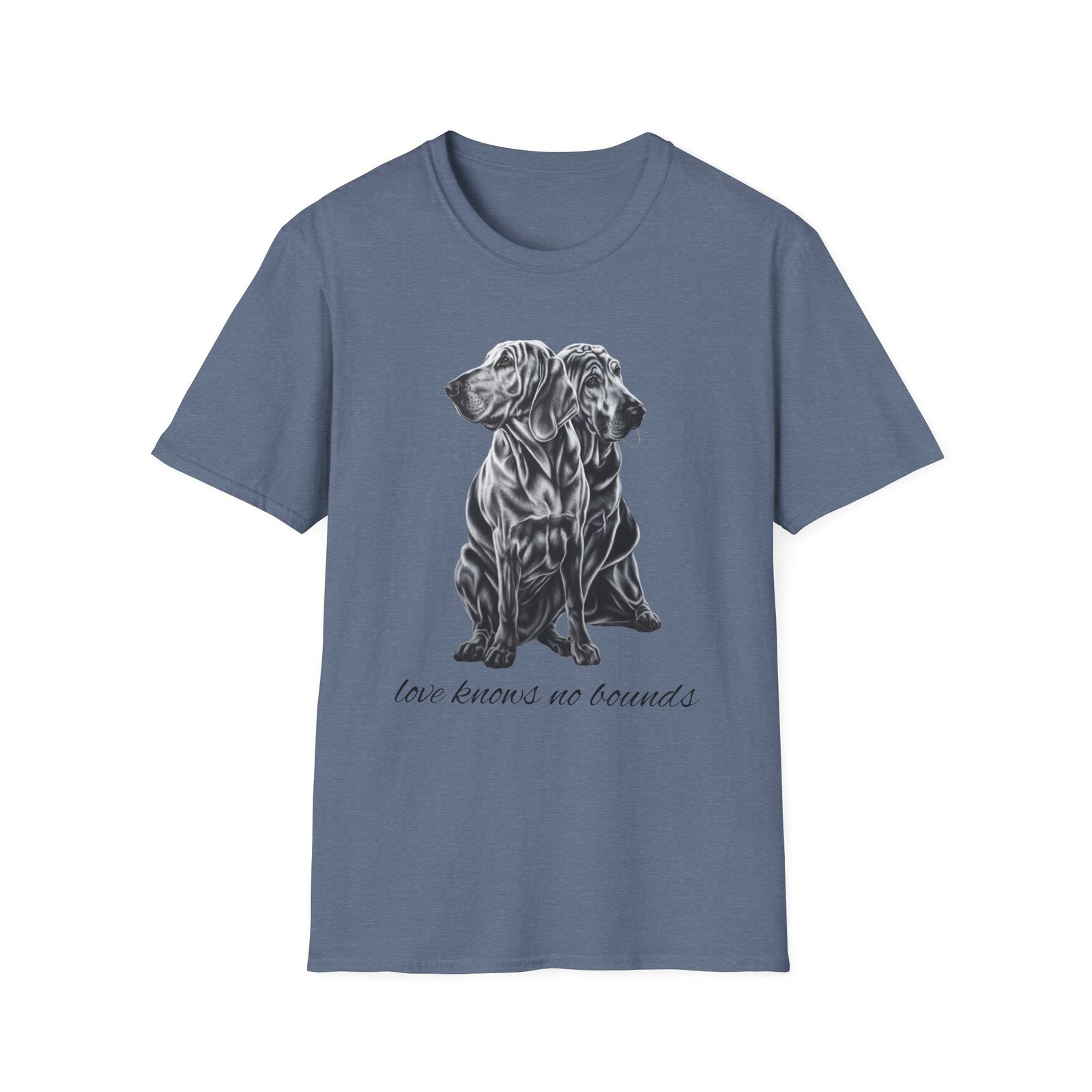 This Bloodhound tshirt with the quote ‘love knows no bounds’ exudes a sense of unconditional love and loyalty. Perfect for dog lovers and those who value deep connections, this t-shirt can be worn casually or dressed up for a meaningful style statement. Ideal for Valentine’s Day, Anniversaries, and dog-related celebrations.