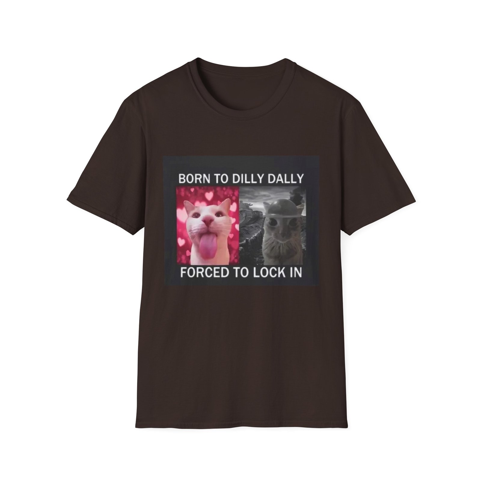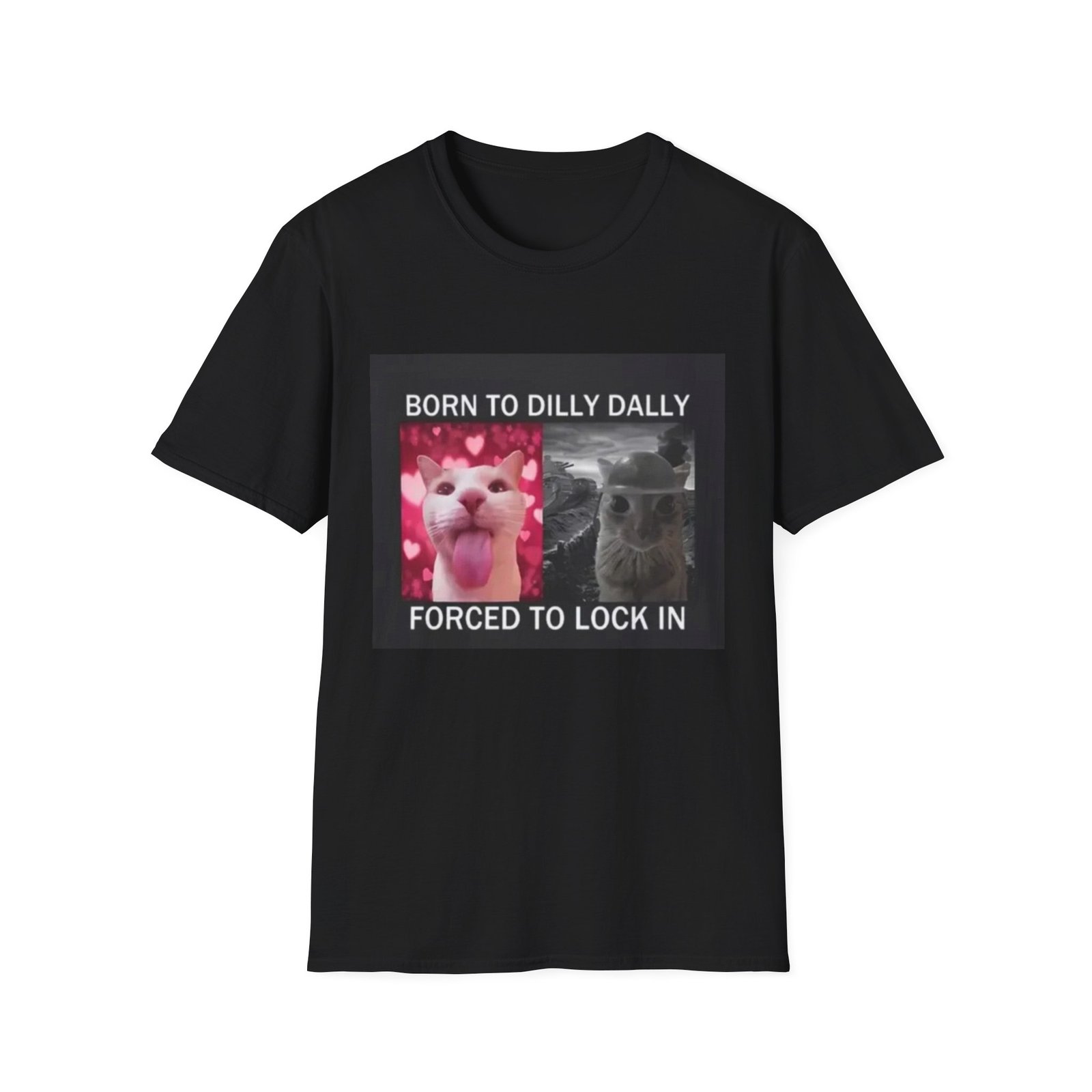 This lightweight cotton tee carries a tongue-in-cheek meme energy that brightens up quiet days at home or quick trips out for coffee. Two contrasting dog photos — one goofy and pink, the other gloomy and grayscale — sit inside a simple black frame with the caption “BORN TO DILLY DALLY / FORCED TO LOCK IN.” The result feels honest and playful: a wearable shrug against responsibility for anyone who prefers naps, snacks, and slow afternoons. Soft, breathable fabric and a clean crew neckline make it easy to layer or wear alone. It’s the sort of shirt you reach for when you want to signal your mood without saying a word.