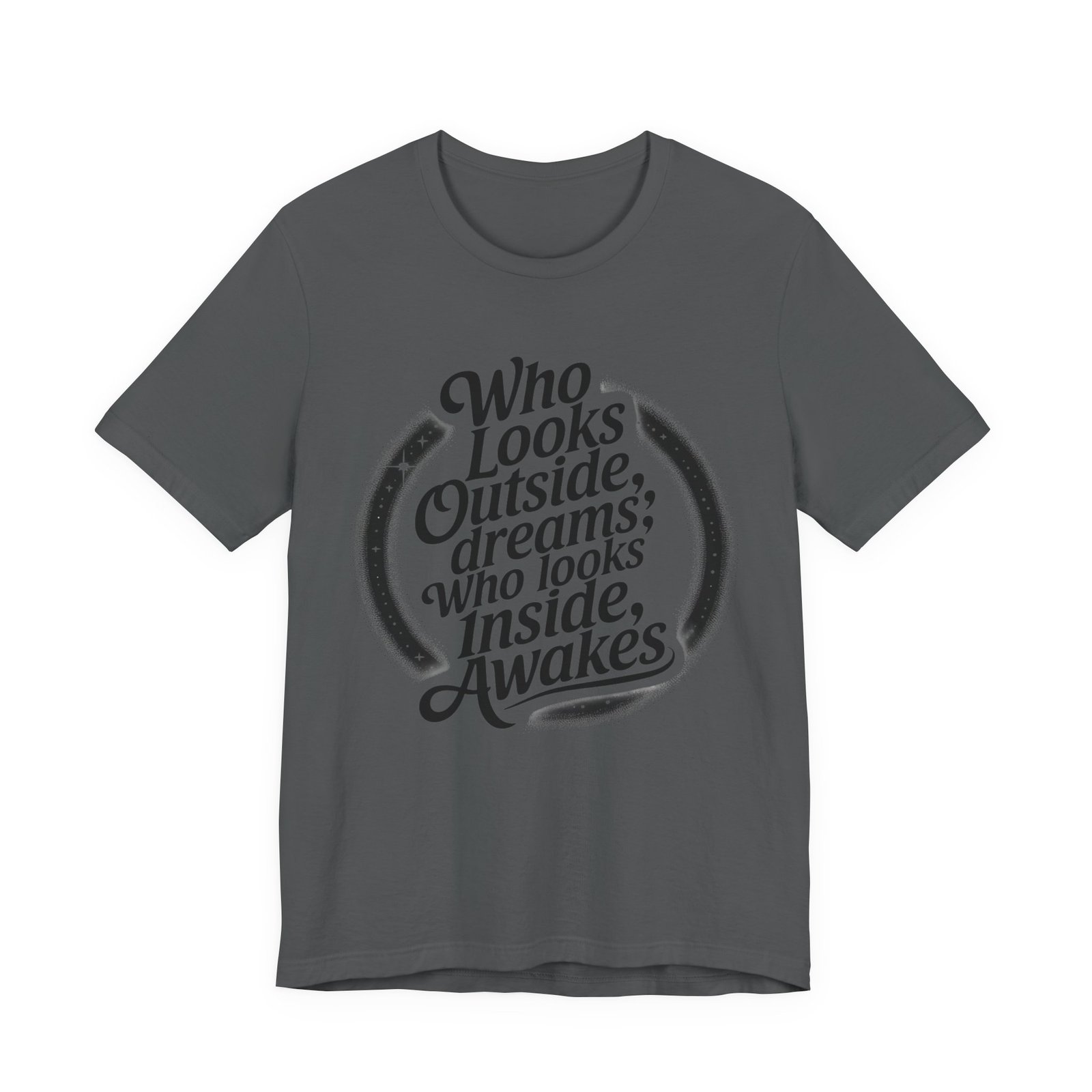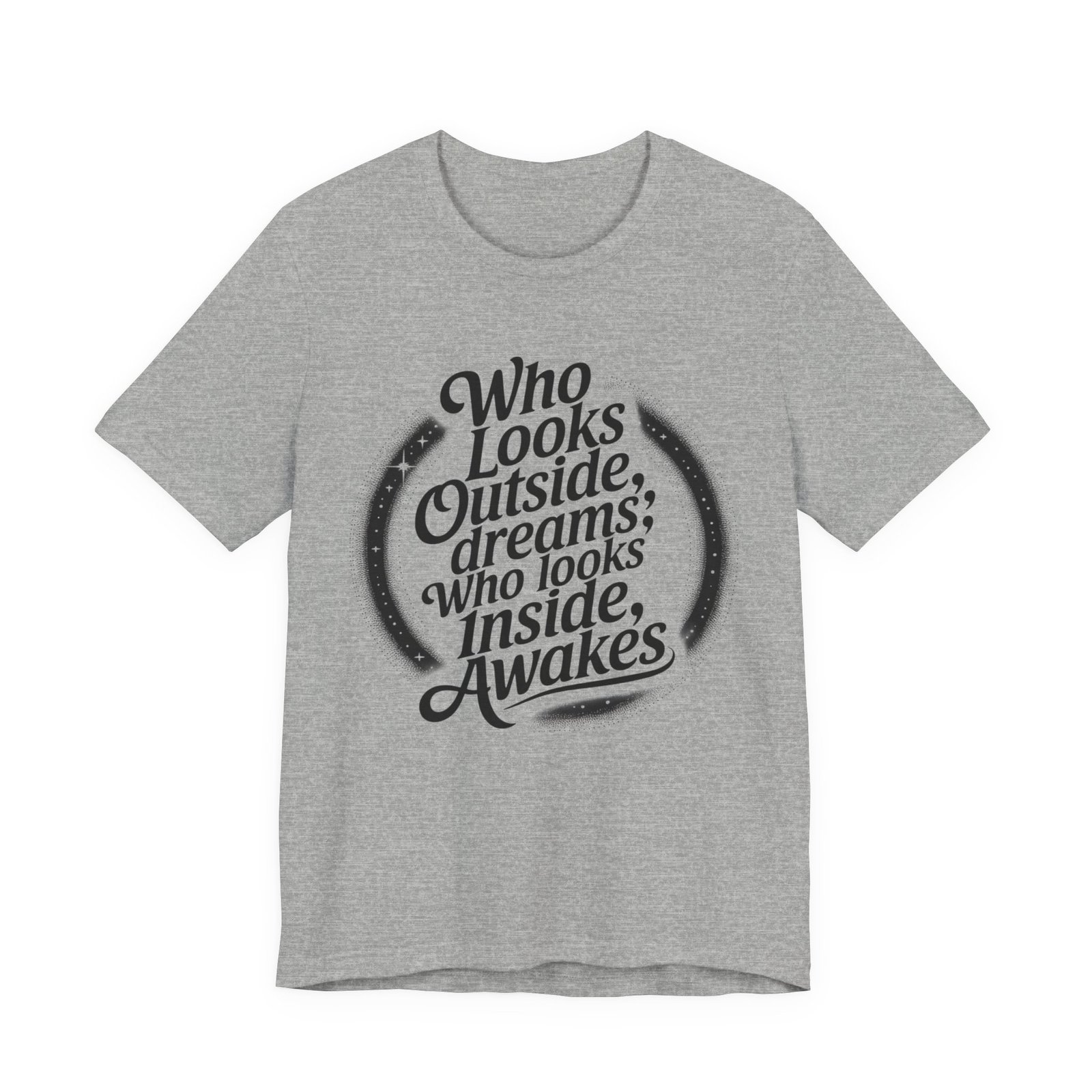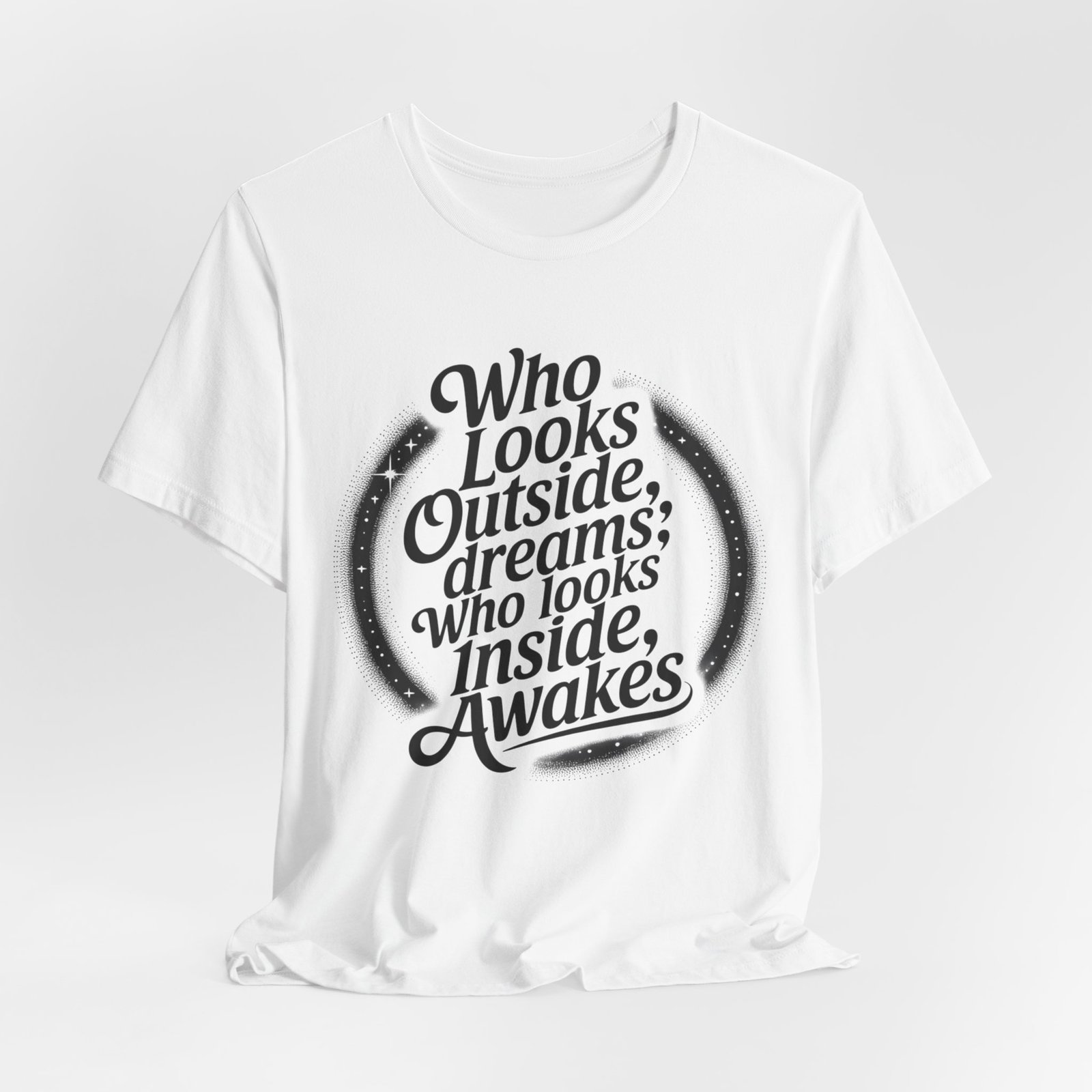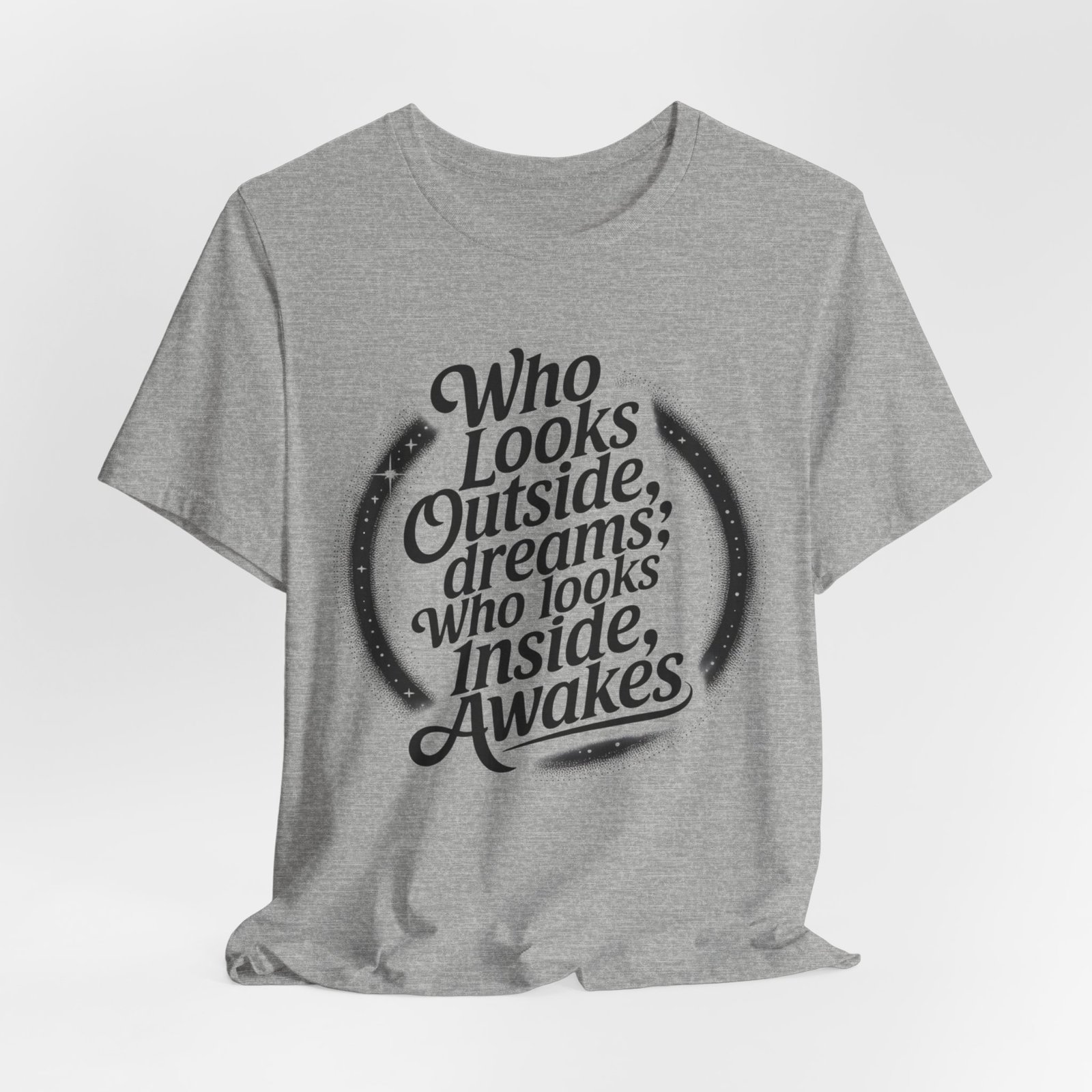 This lightweight jersey tee carries a quietly inspiring message for those who live between outward curiosity and inner reflection. The soft, breathable cotton feels gentle against the skin while the clean crew neckline and retail fit keep the silhouette casual and neat. A centered, typographic design—framed by a subtle circular motif—reads like a reminder to balance exploration with self-awareness, making this shirt a companion for long walks, late-night journaling, or slow mornings with coffee. Durable side seams, shoulder tape, and a ribbed collar help the tee keep its shape through repeated wear and washes. Thoughtfully manufactured and REACH certified, it suits someone who cares about comfort, craft, and small daily rituals that matter.