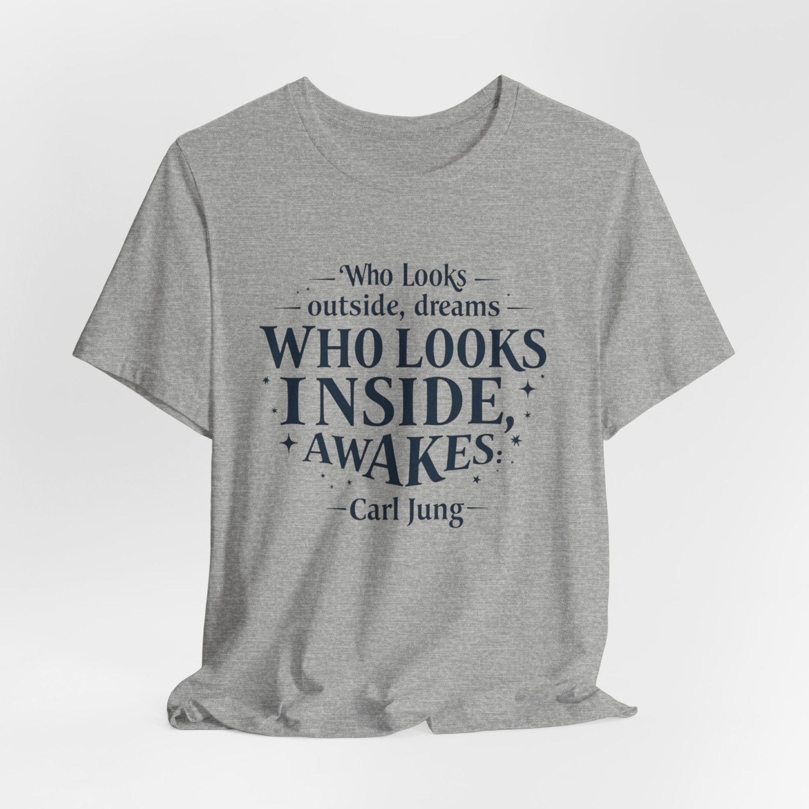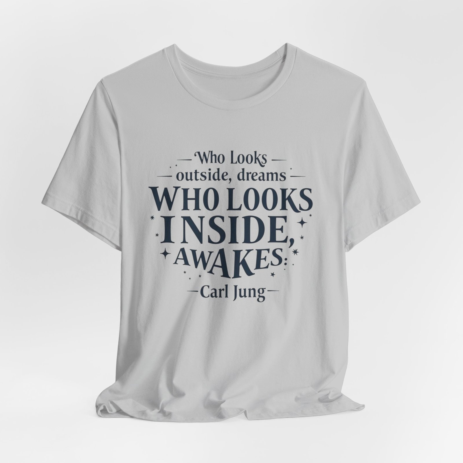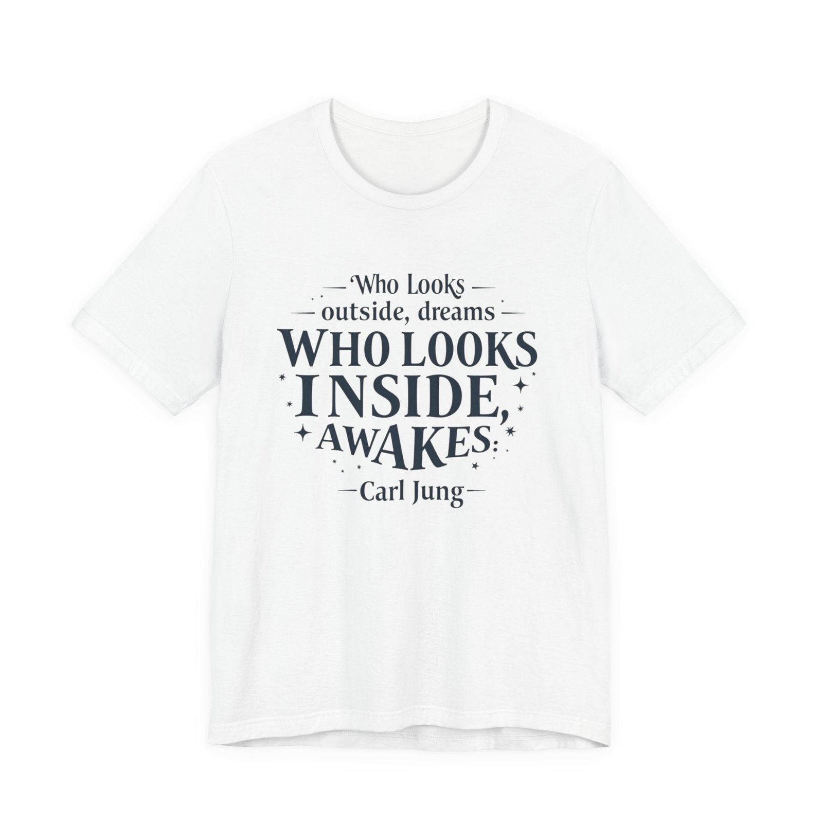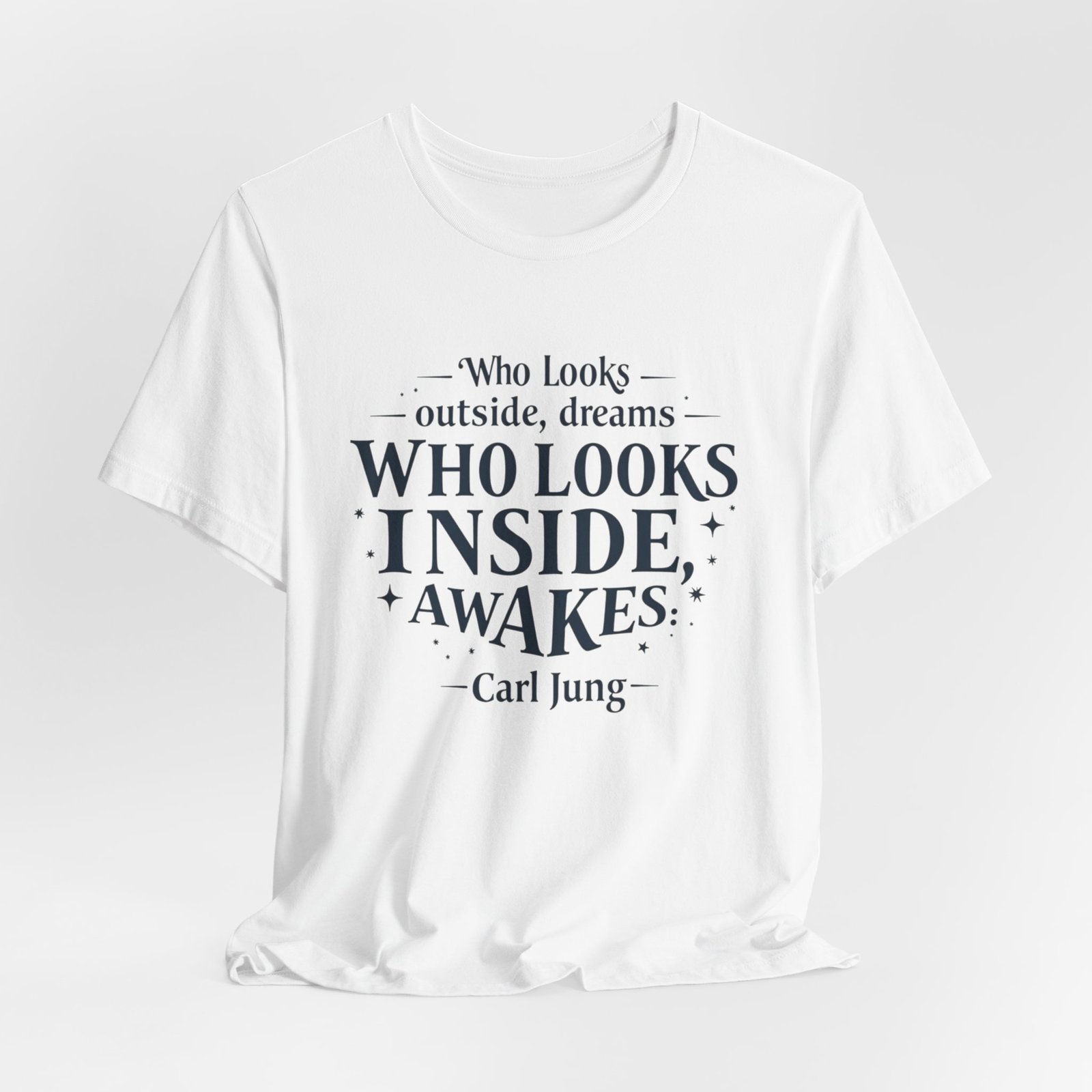 This T-Shirt features a quote by Carl Jung, perfect for those who seek inspiration and introspection. The lightweight fabric and retail fit make it ideal for casual and semi-formal settings, great for layering and accessorizing. Relevant for those interested in psychology or spiritual growth, perfect for everyday wear or as a thoughtful gift for birthdays or self-care occasions.