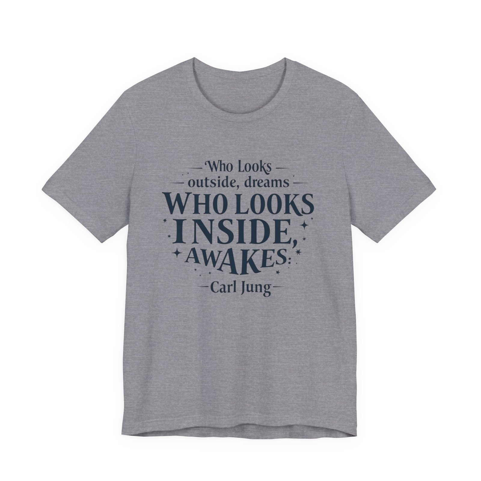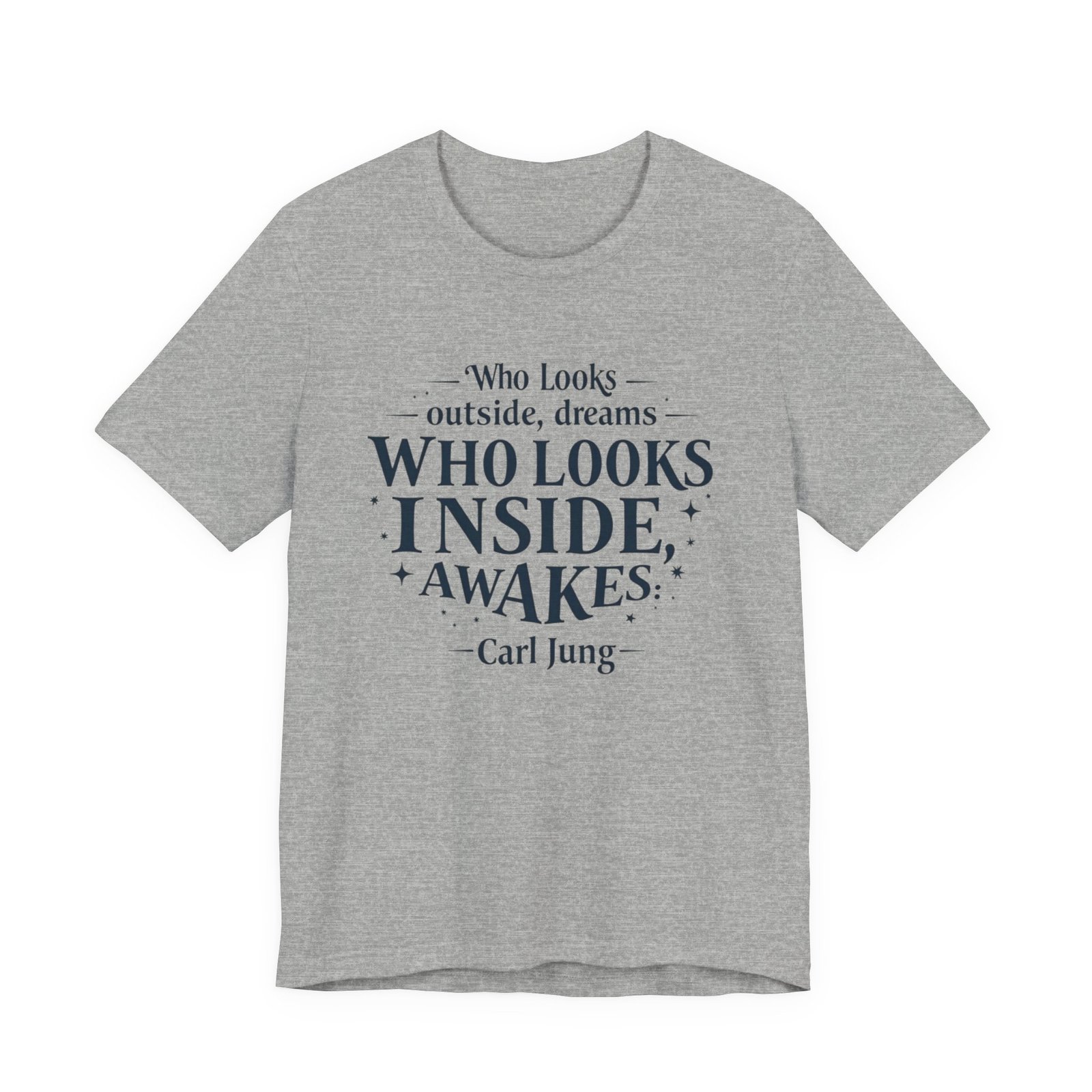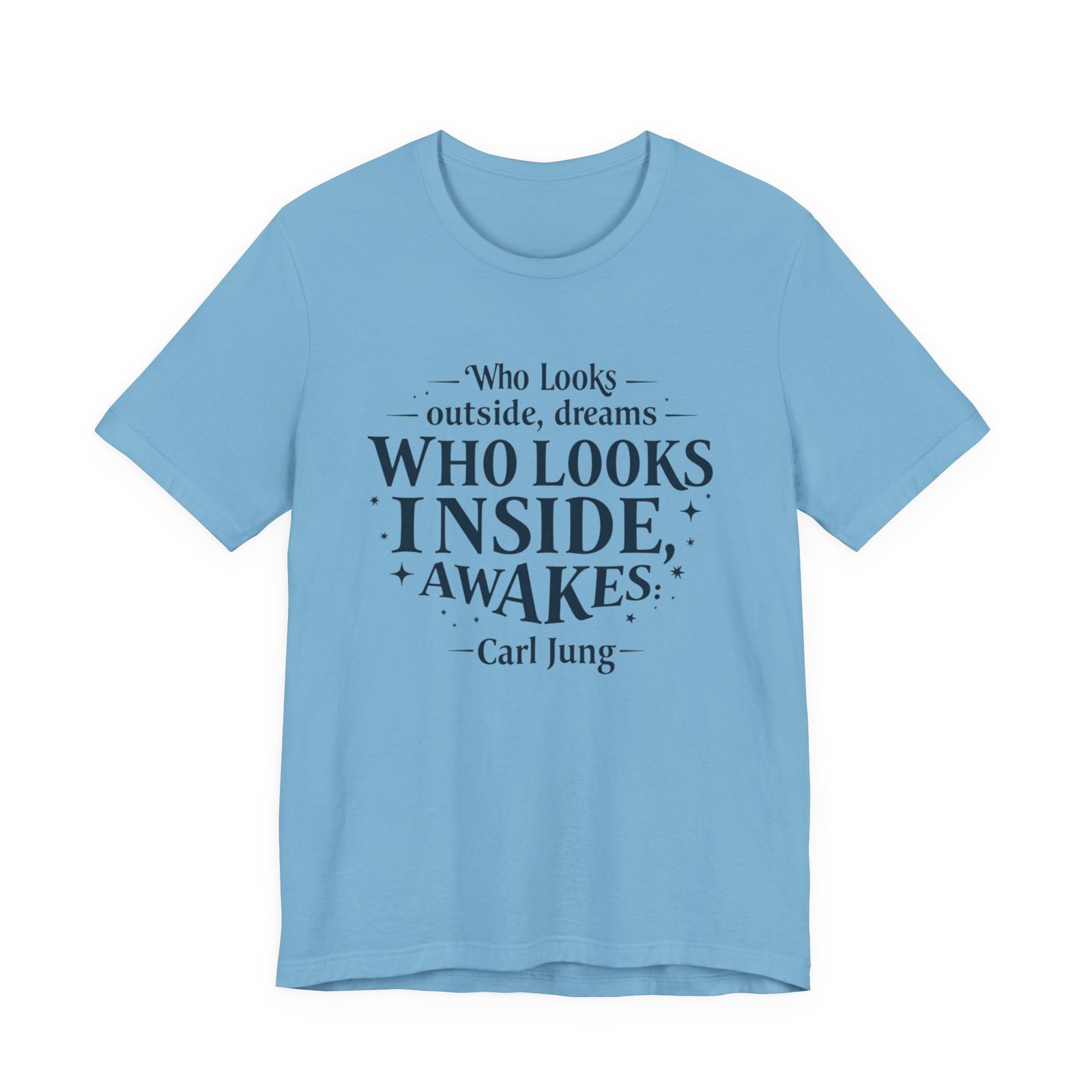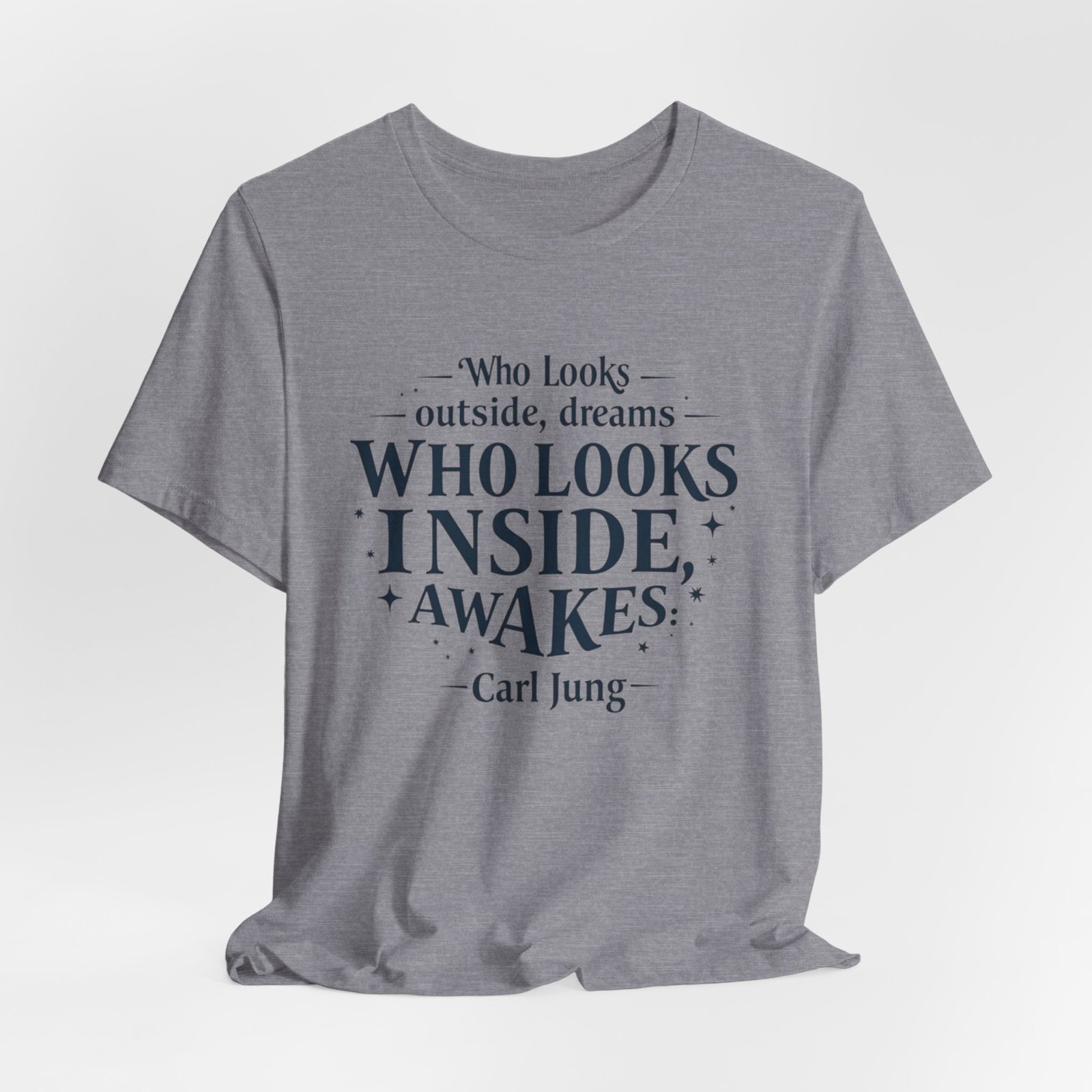 This T-Shirt features a quote by Carl Jung, perfect for those who seek inspiration and introspection. The lightweight fabric and retail fit make it ideal for casual and semi-formal settings, great for layering and accessorizing. Relevant for those interested in psychology or spiritual growth, perfect for everyday wear or as a thoughtful gift for birthdays or self-care occasions.