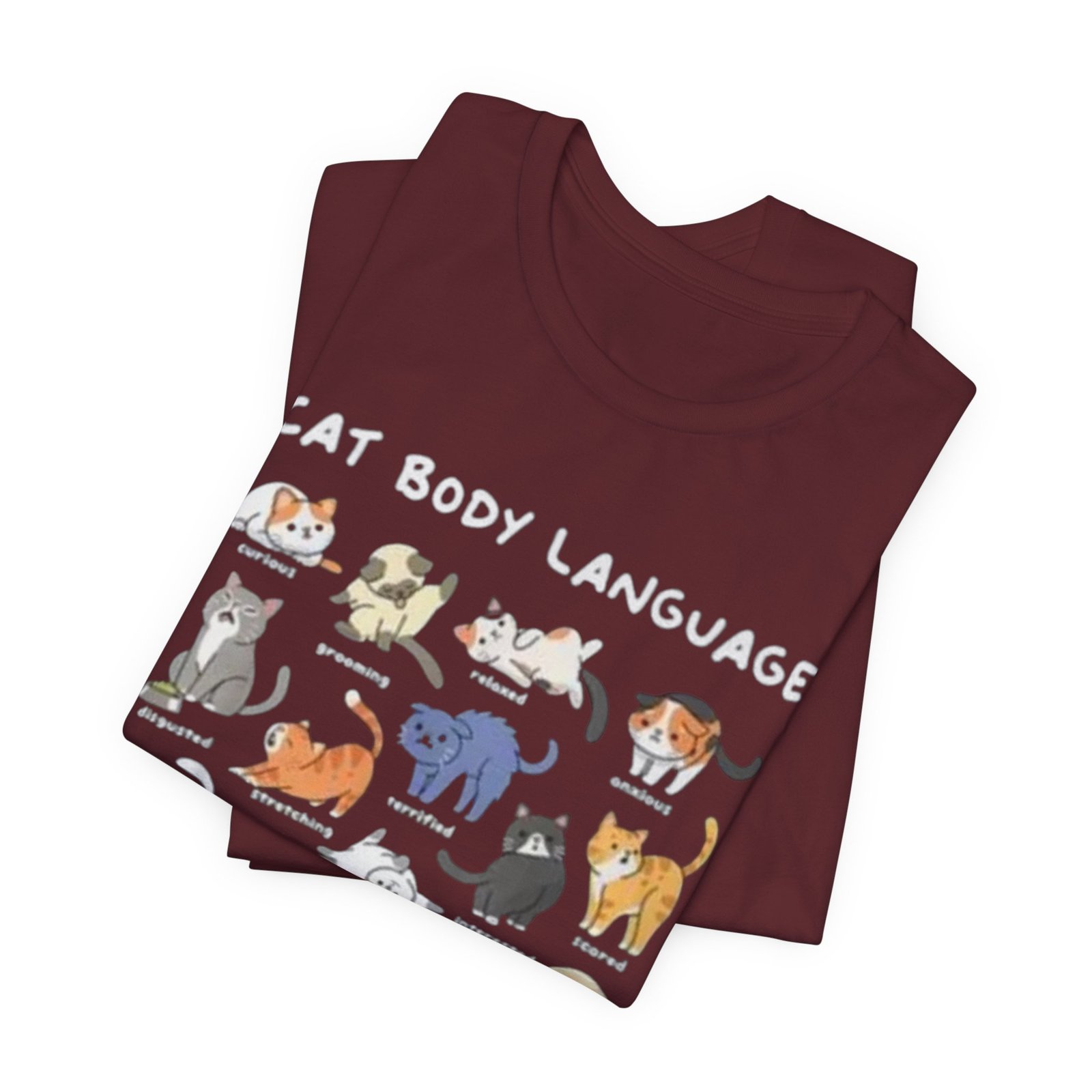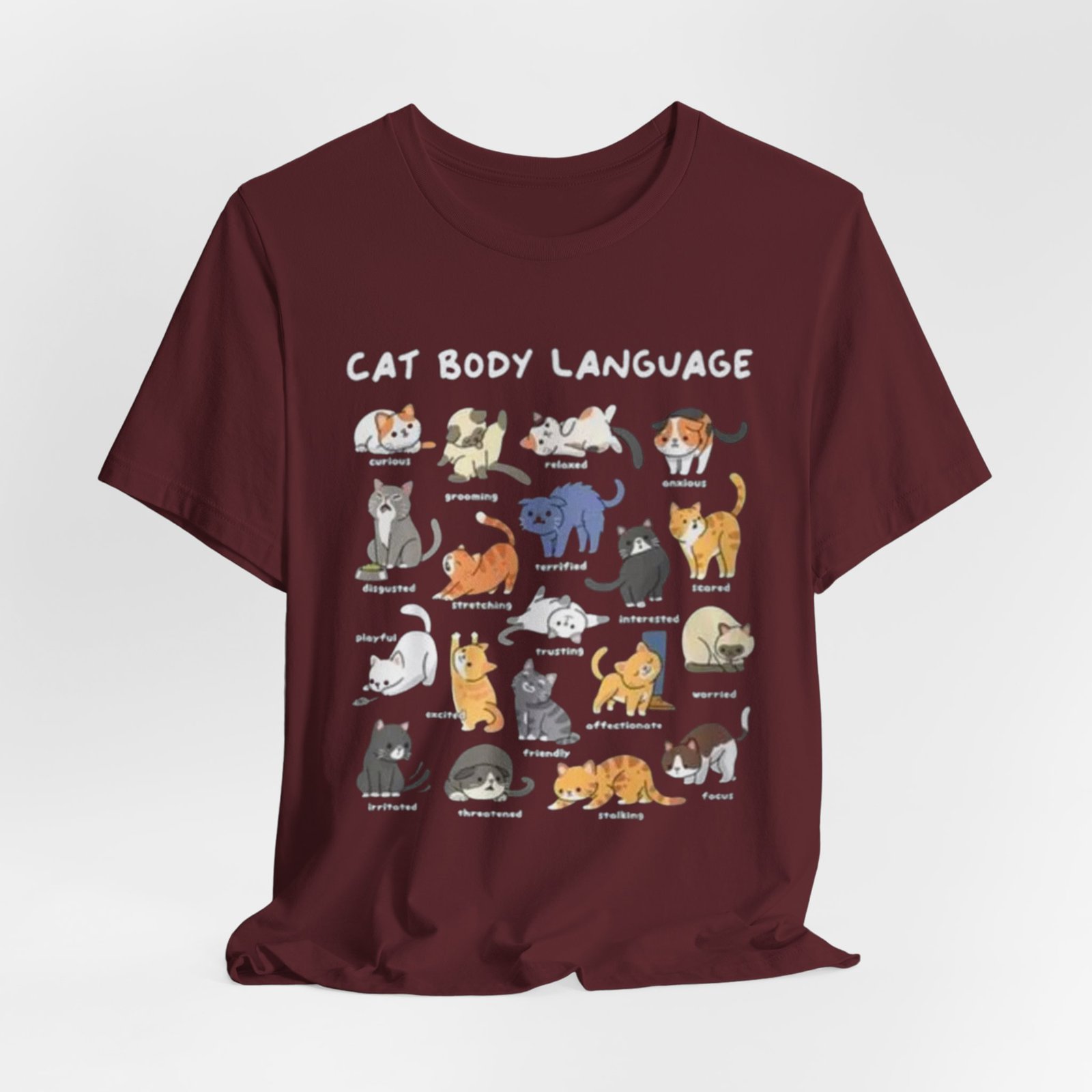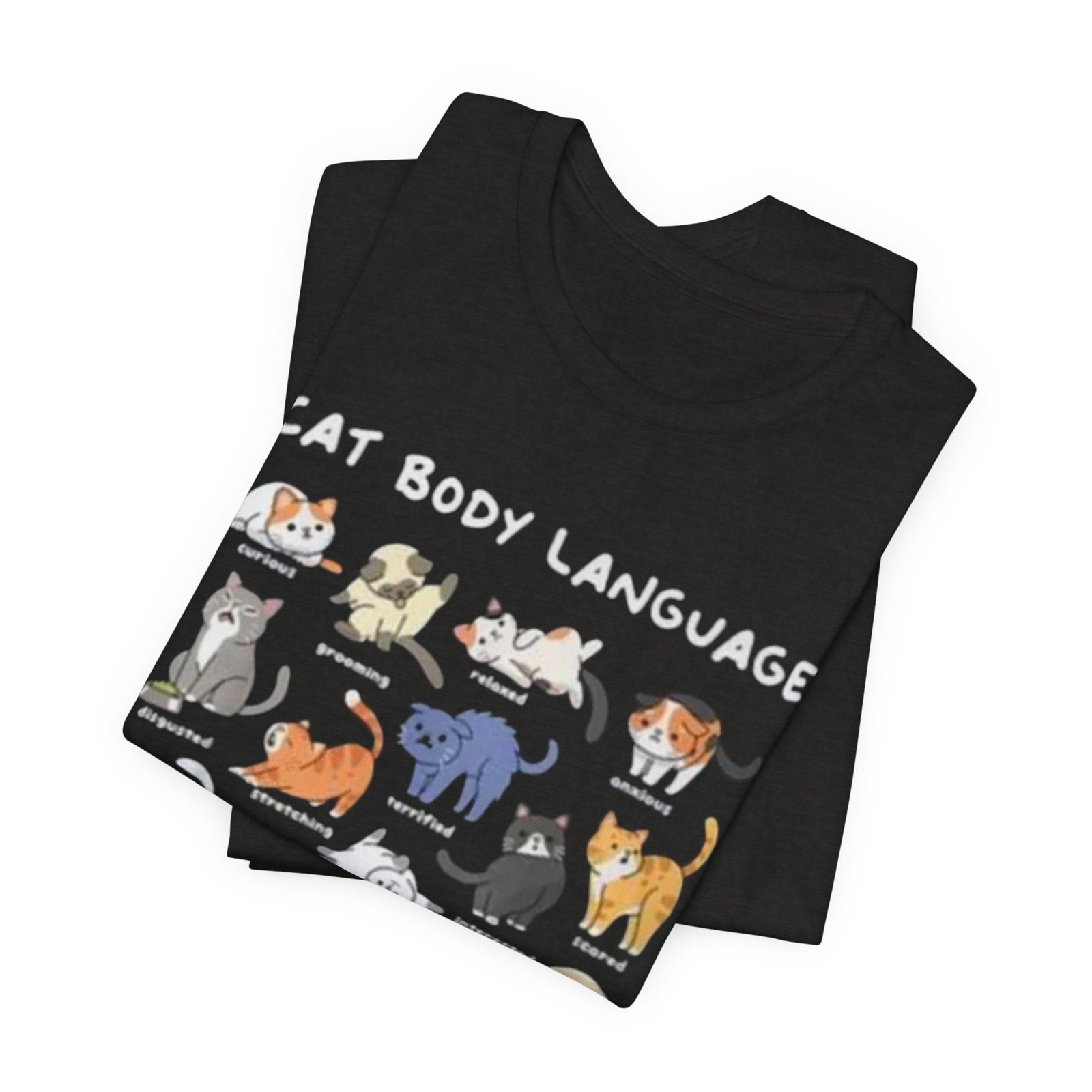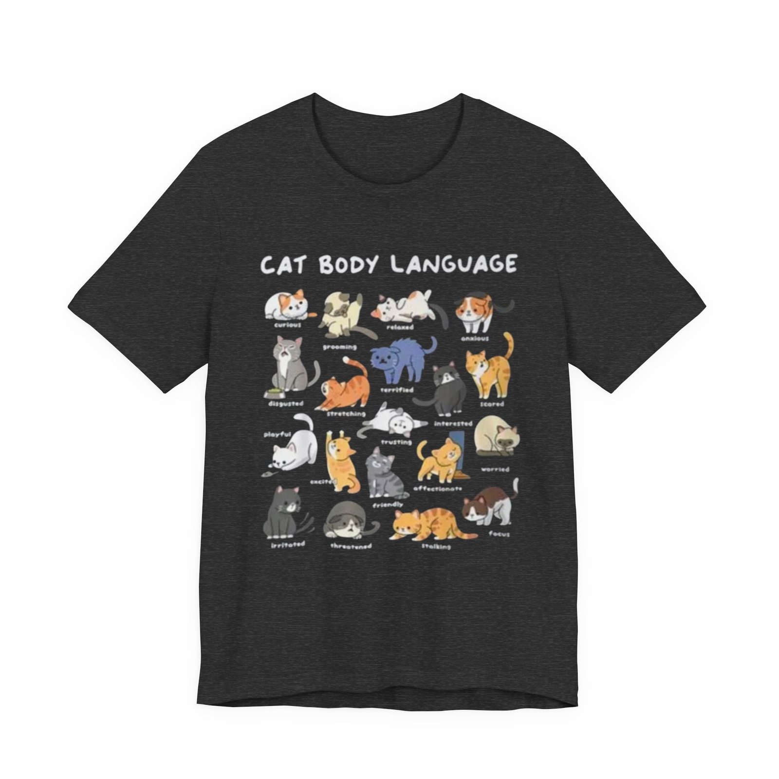 Soft, breathable tee that speaks cat person fluently. This lightweight crewneck features an illustrated “Cat Body Language” print across the chest — a playful chart of feline poses and moods rendered in warm, hand-drawn colors. It drapes easily for everyday wear, layerable under a cardigan or worn solo while you monitor the litter box, the sunny windowsill, or late-night zoom cuddle sessions. The tear-away label keeps it comfy against sensitive skin, and the side seams and ribbed collar help the shirt hold its shape after many wash cycles. Wear it to cat meetups, vet visits, or lazy mornings curled with a purring friend — it’s that quiet nod to the rituals and inside jokes only fellow cat lovers get.