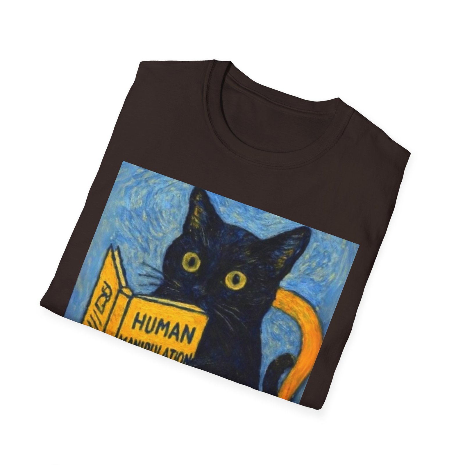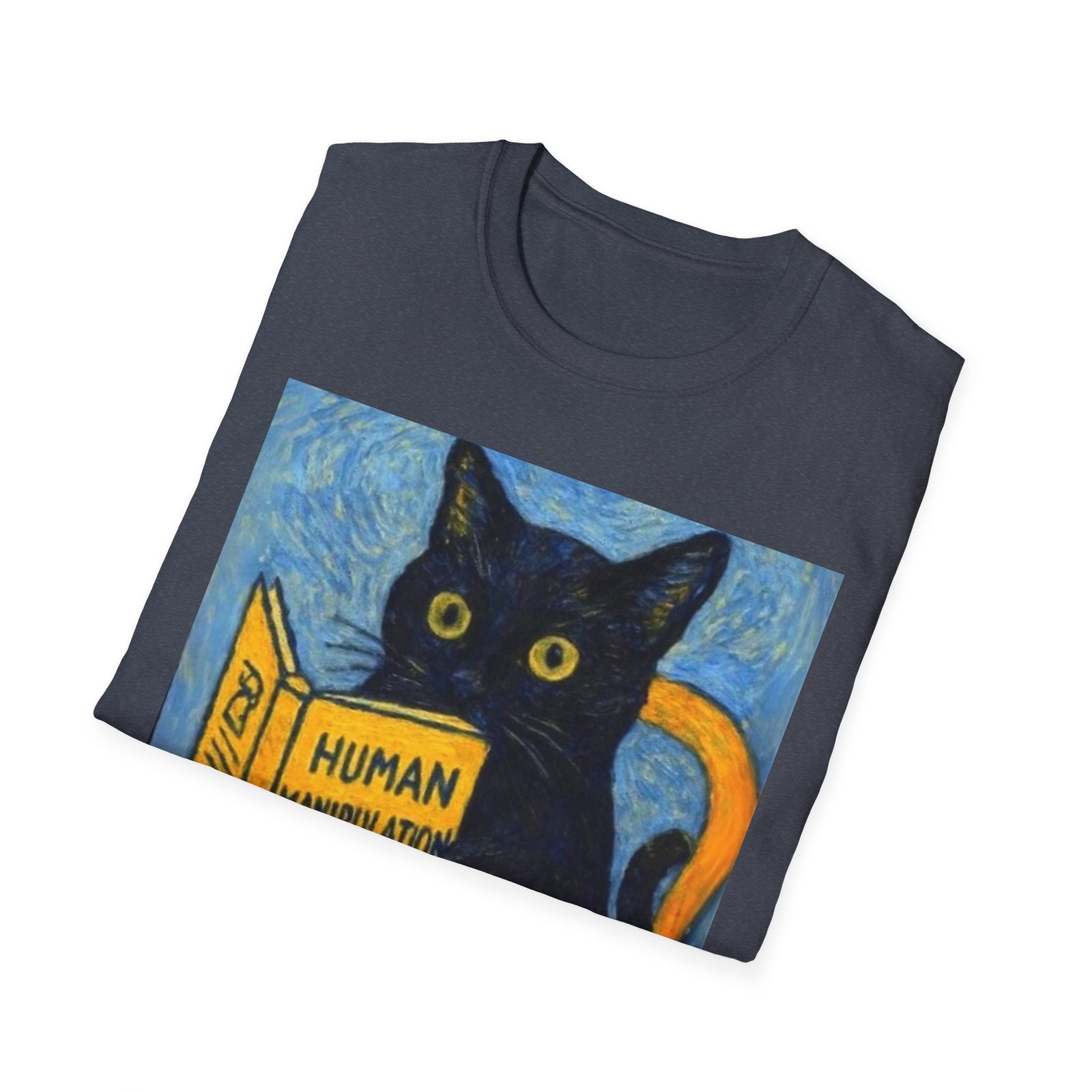 This lightweight crewneck tee features a playful, artful print of a wide-eyed black cat reading “Human Manipulation 101.” Soft, smooth ring-spun cotton gives the shirt a cozy, lived-in feel while the bold illustration adds a smart, mischievous touch to everyday wear. It sits comfortably in a classic fit with a durable ribbed collar and tear-away label for easy comfort. Wear it when you want to wink at the absurdity of human behavior, start conversations at coffee shops, or add a clever layer to a casual outfit. The print’s painterly colors pop against the clean shirt surface, making the design the focal point without overpowering your look.