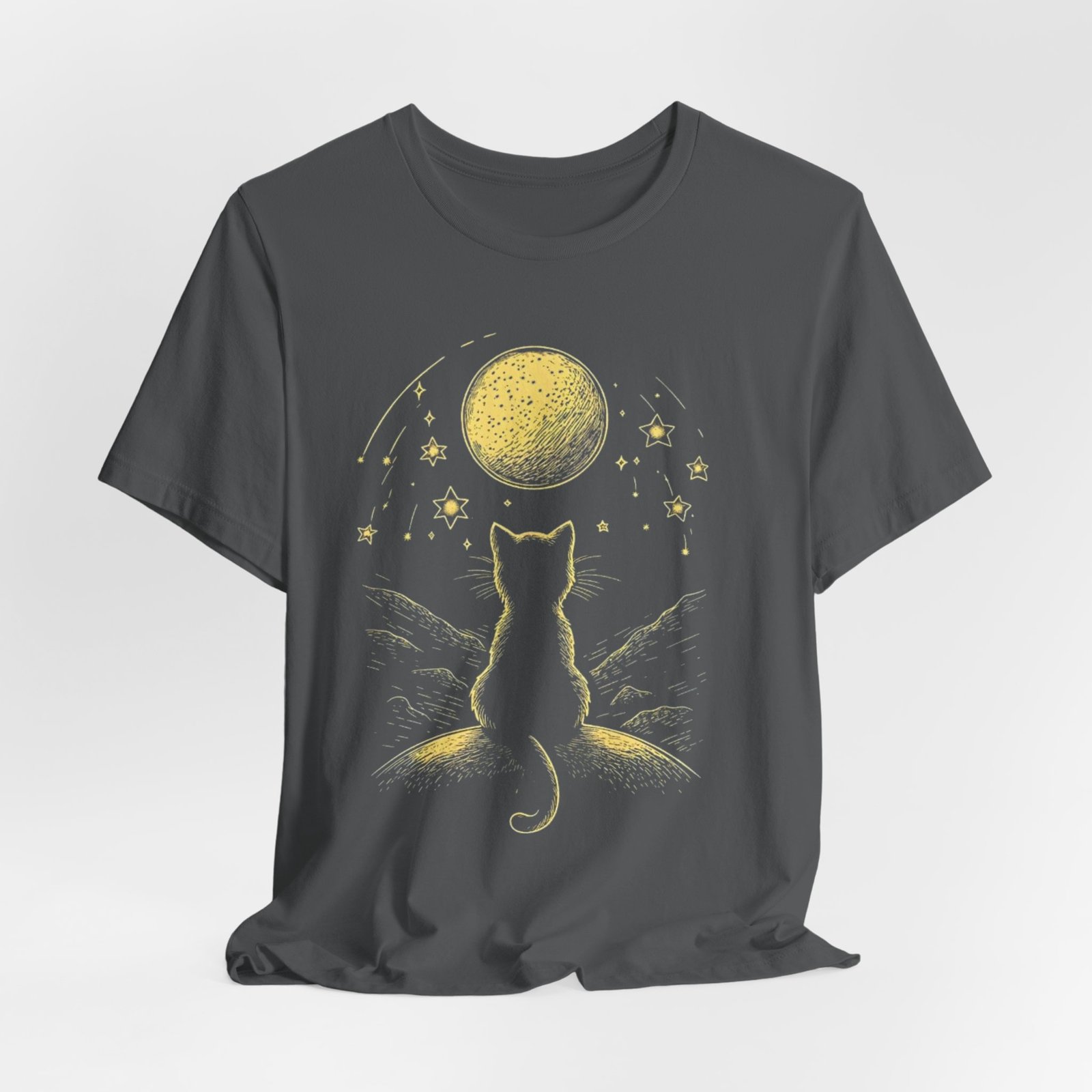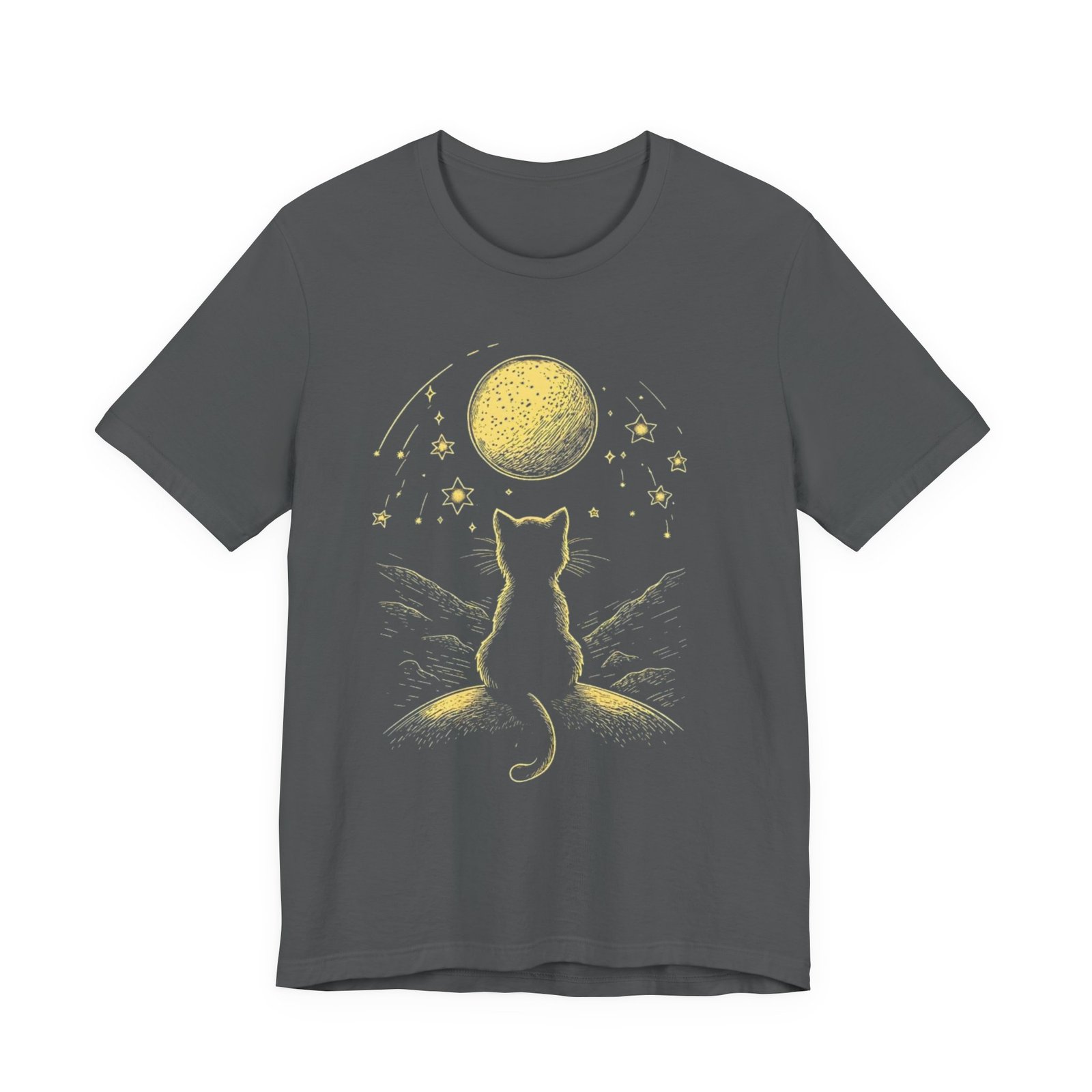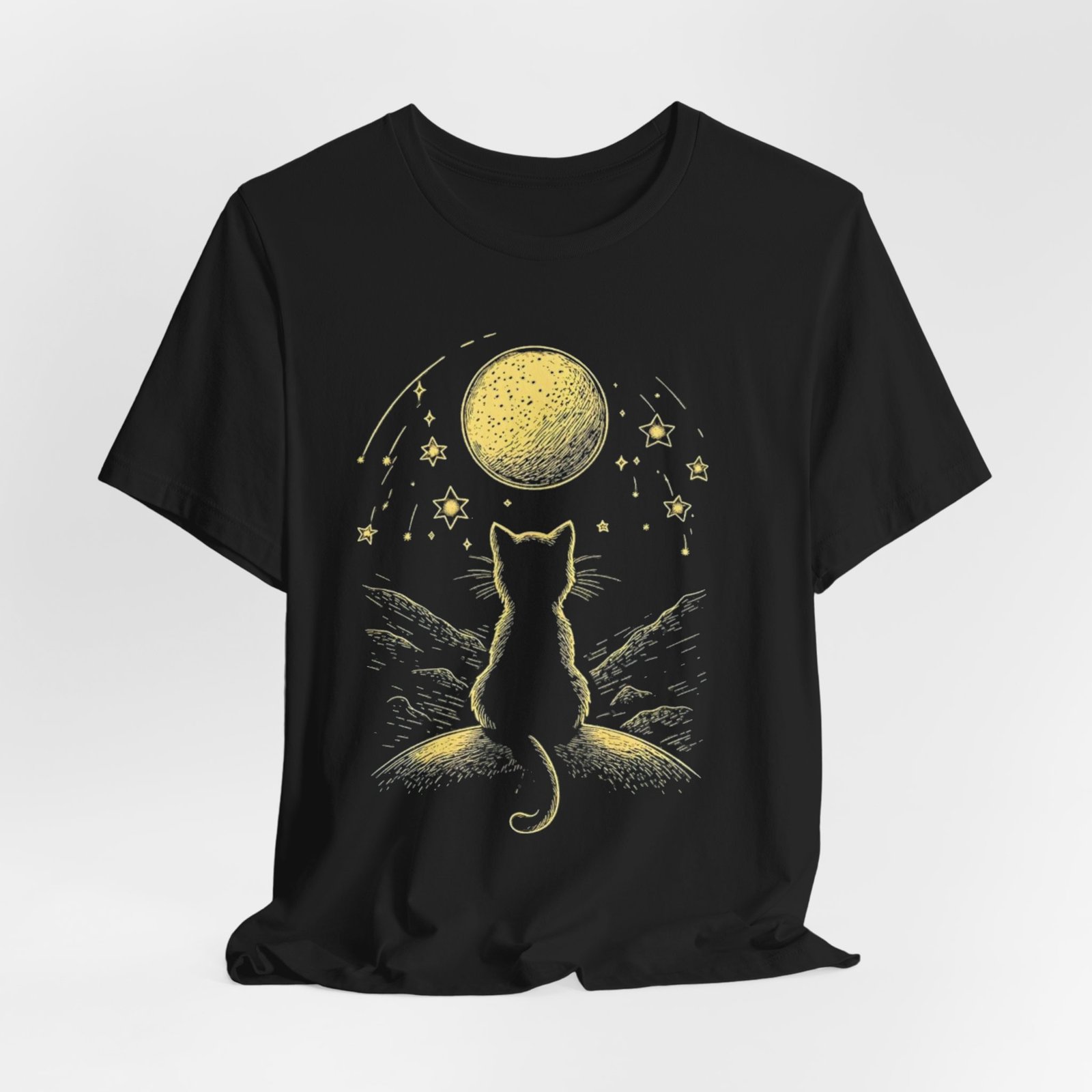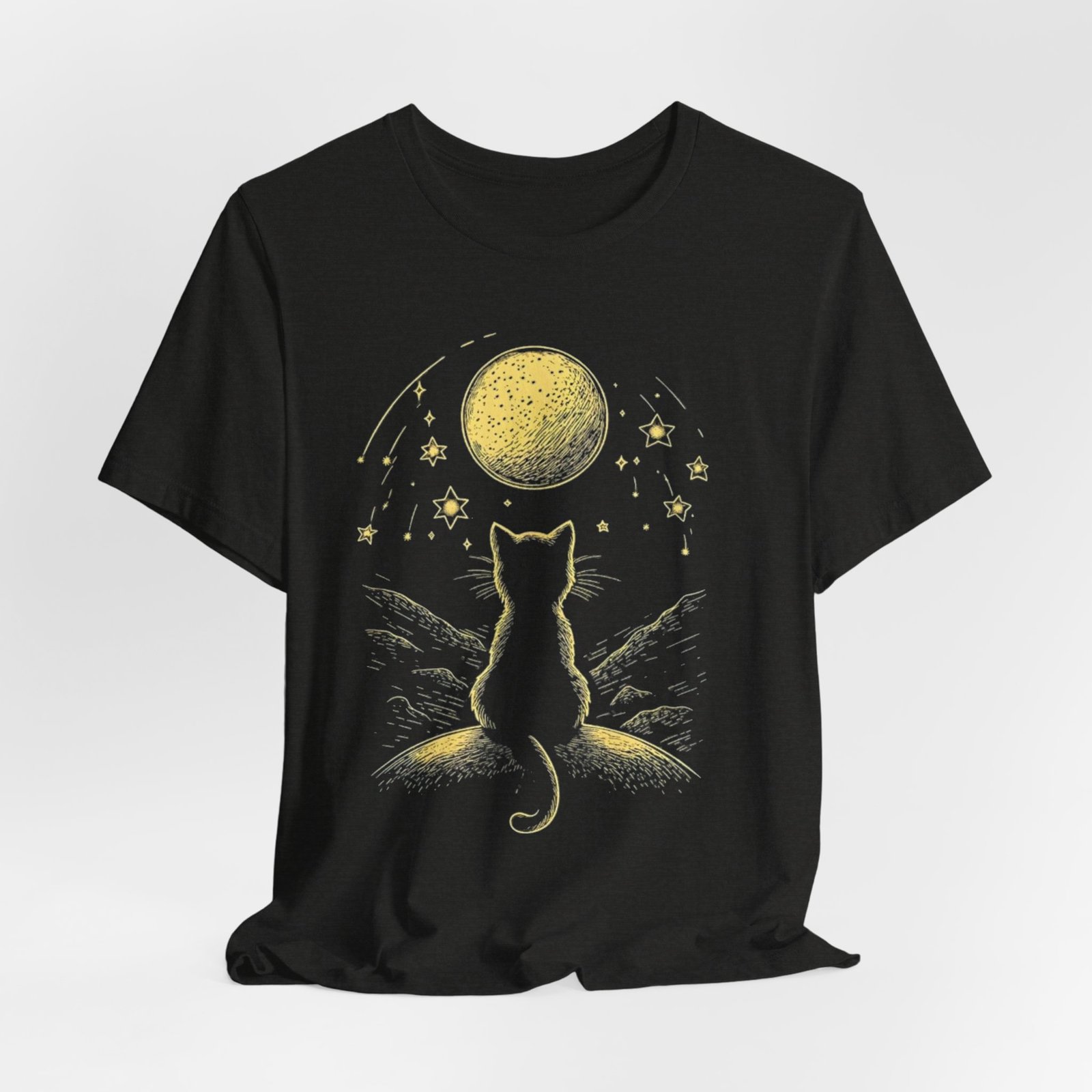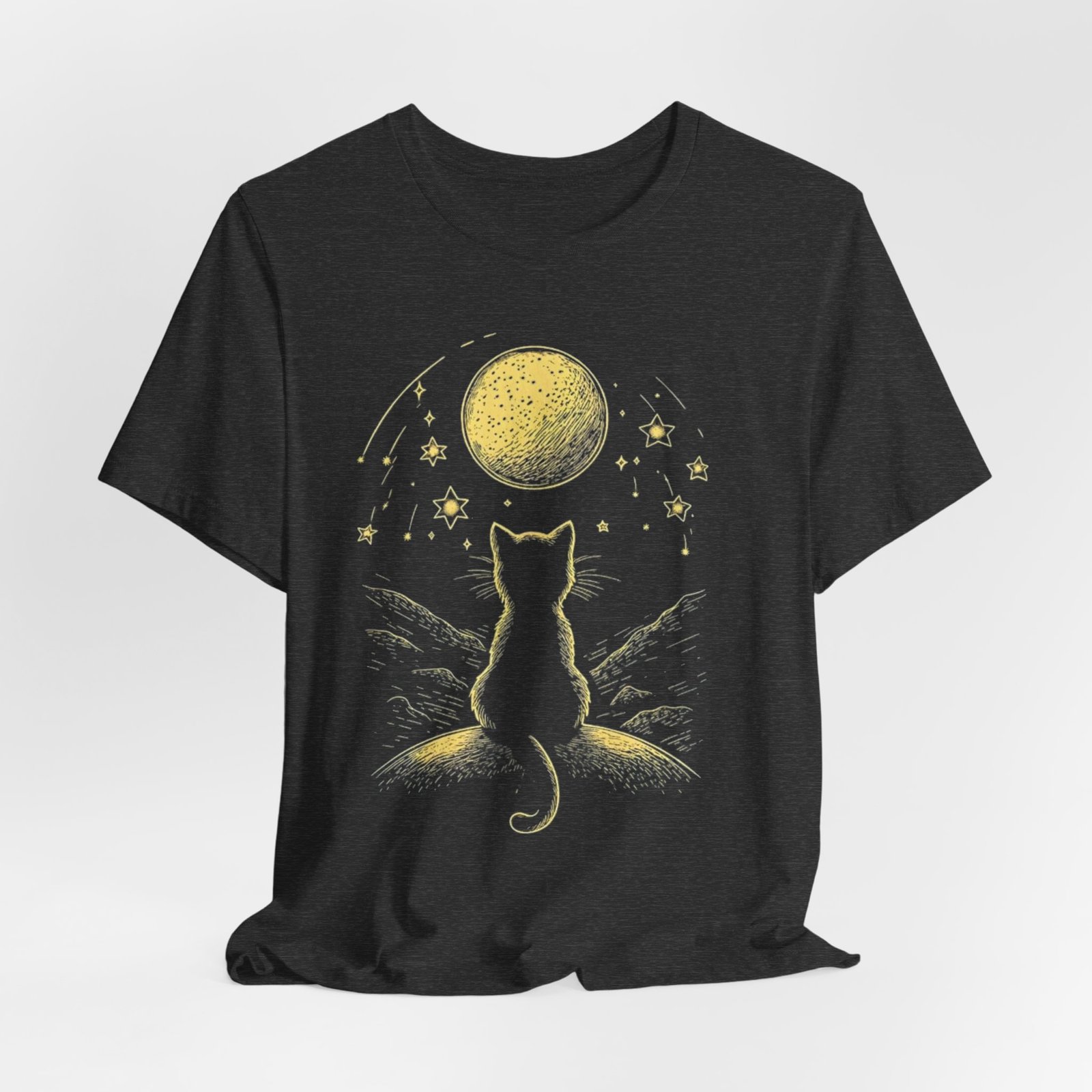 A soft, breathable tee that carries quiet wonder in its design. A silhouetted cat sits on a moonlit ridge, gazing at a luminous full moon and falling stars—an image that feels like a private midnight ritual. Lightweight Airlume cotton keeps the shirt cool and comfortable whether you’re layering under a jacket or wearing it solo on a calm evening walk. The retail fit and crew neckline give a neat, wearable silhouette that pairs easily with jeans, cardigans, or lounging shorts. Thoughtful details like side seams and shoulder tape help the shirt keep its shape through washes, while a tear-away label removes irritation so the artwork stays the focus. REACH certified and responsibly manufactured, this tee blends cozy everyday wear with a small, celestial moment you can carry everywhere.