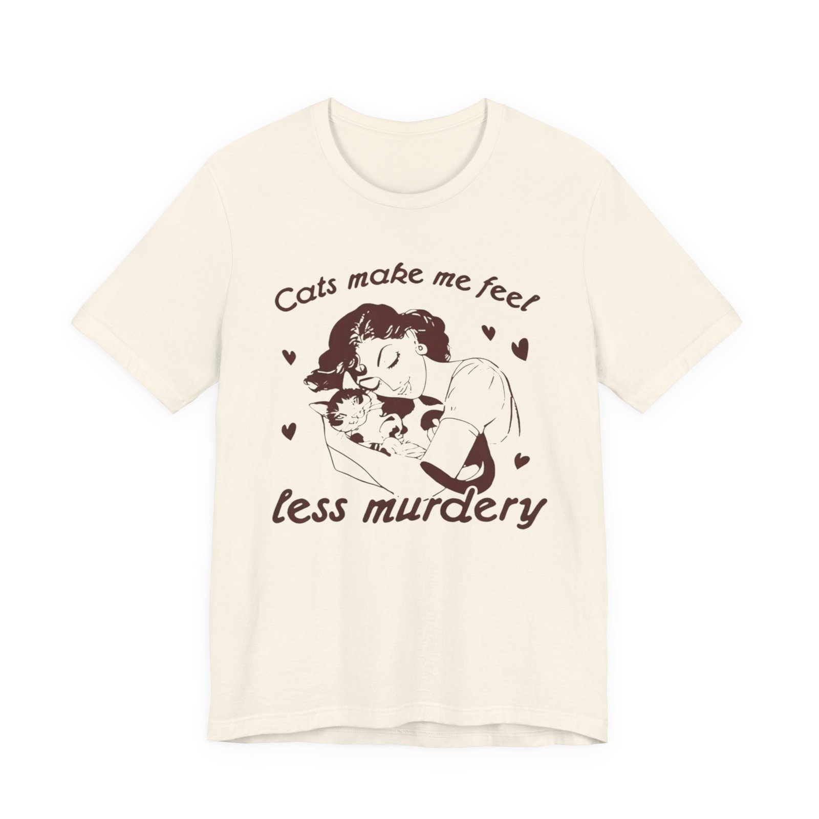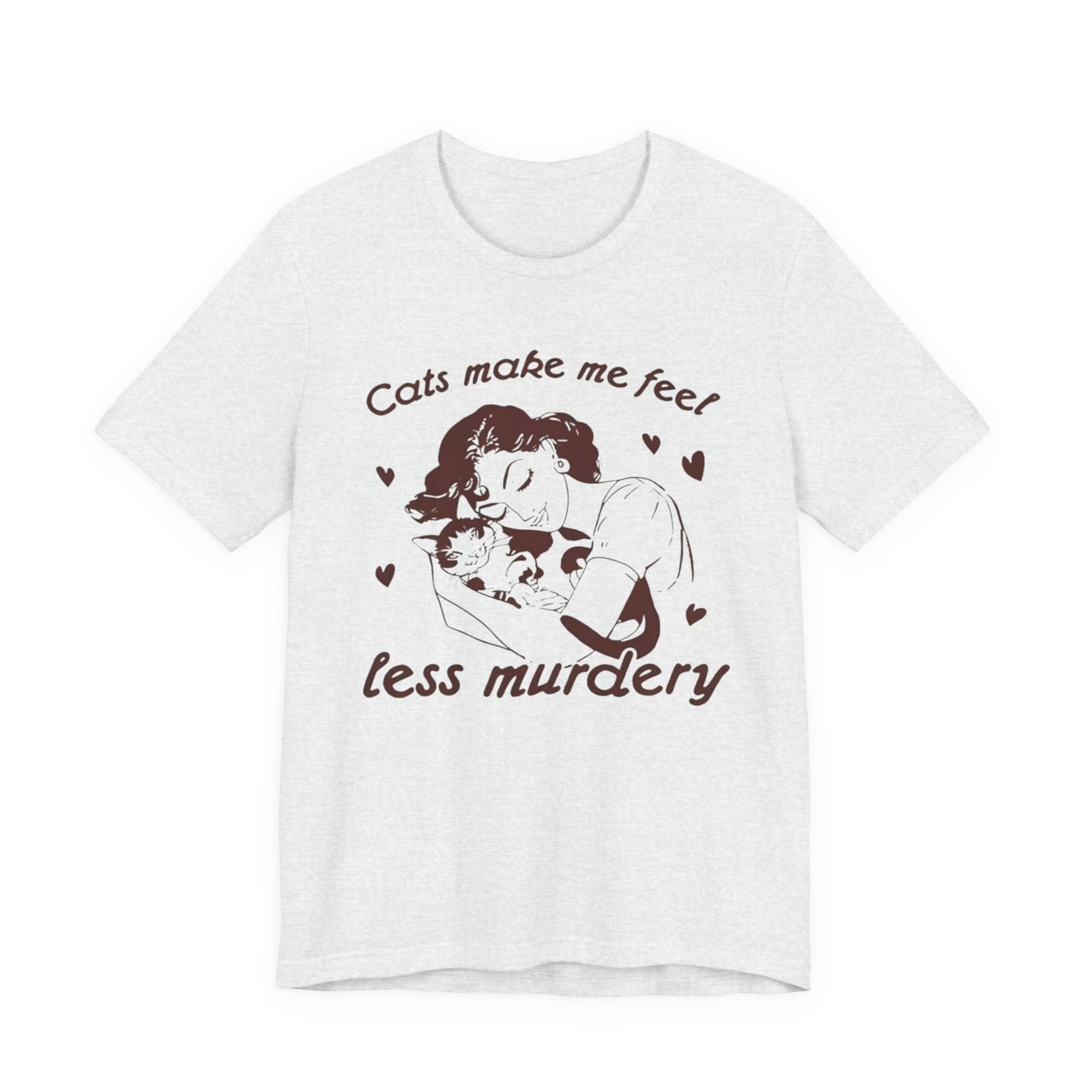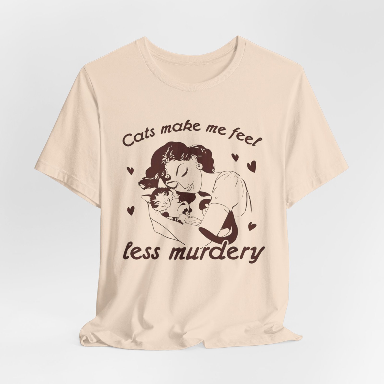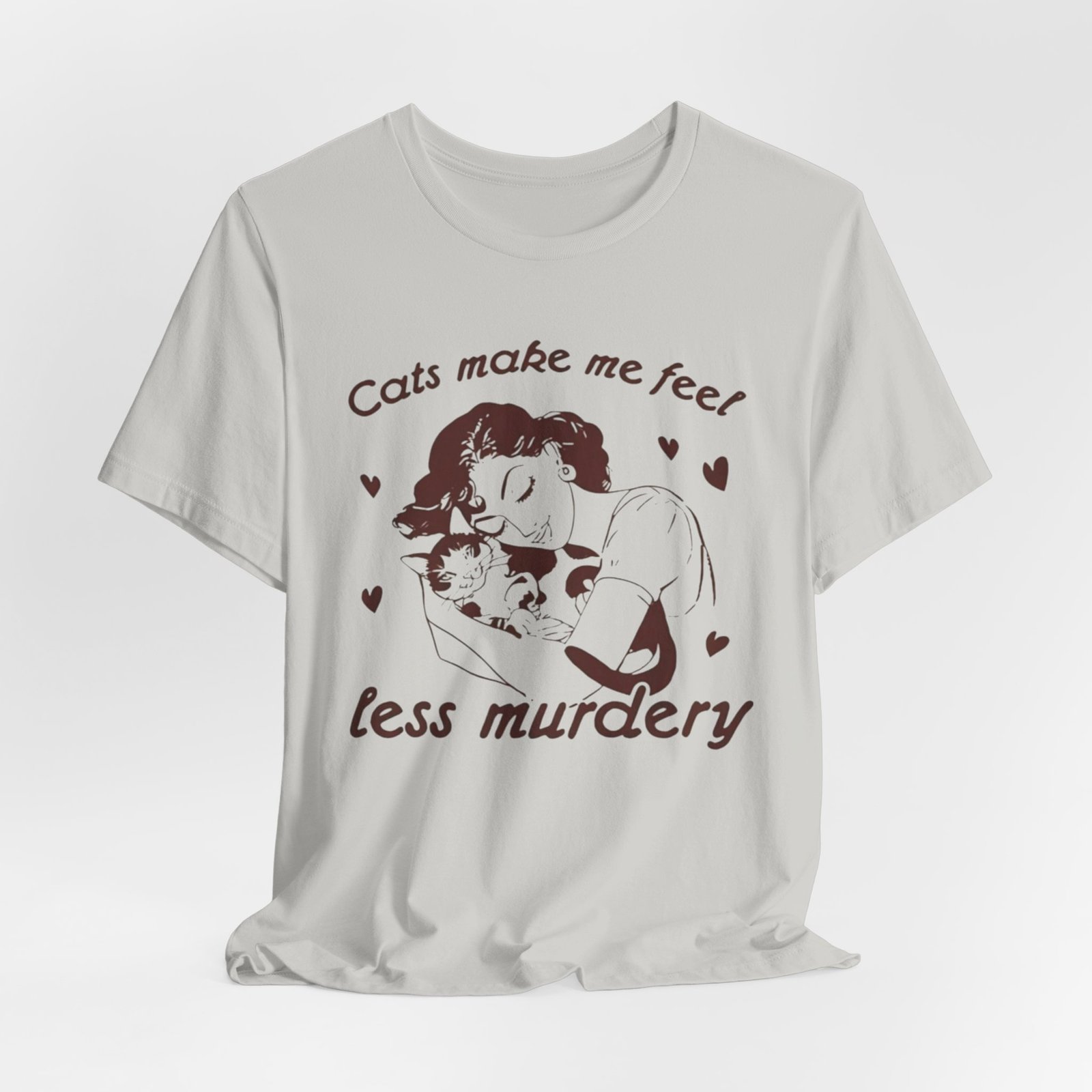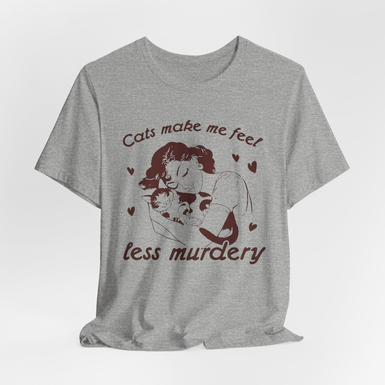 Soft, breathable cotton with a cheeky, cat-lover attitude. This lightweight tee wears like a favorite old shirt — airy at the shoulders, easy to layer, and gentle next to skin thanks to Airlume combed and ring-spun cotton. The front shows a warm, slightly dark-humor illustration of a person cuddling a content cat with the phrase “Cats make me feel less murdery,” blending cozy domestic comfort with wry personality. Thoughtful construction — side seams, ribbed knit collar, shoulder tape and a tear-away label — keeps the shirt comfortable and long-lasting. Ethically produced blanks and REACH compliance add peace of mind for shoppers who care about sourcing.