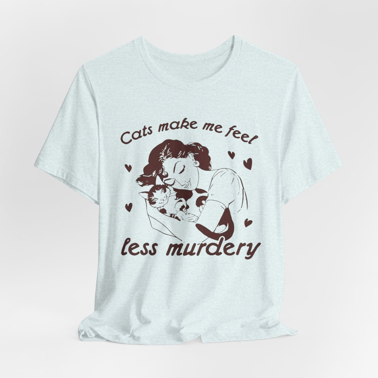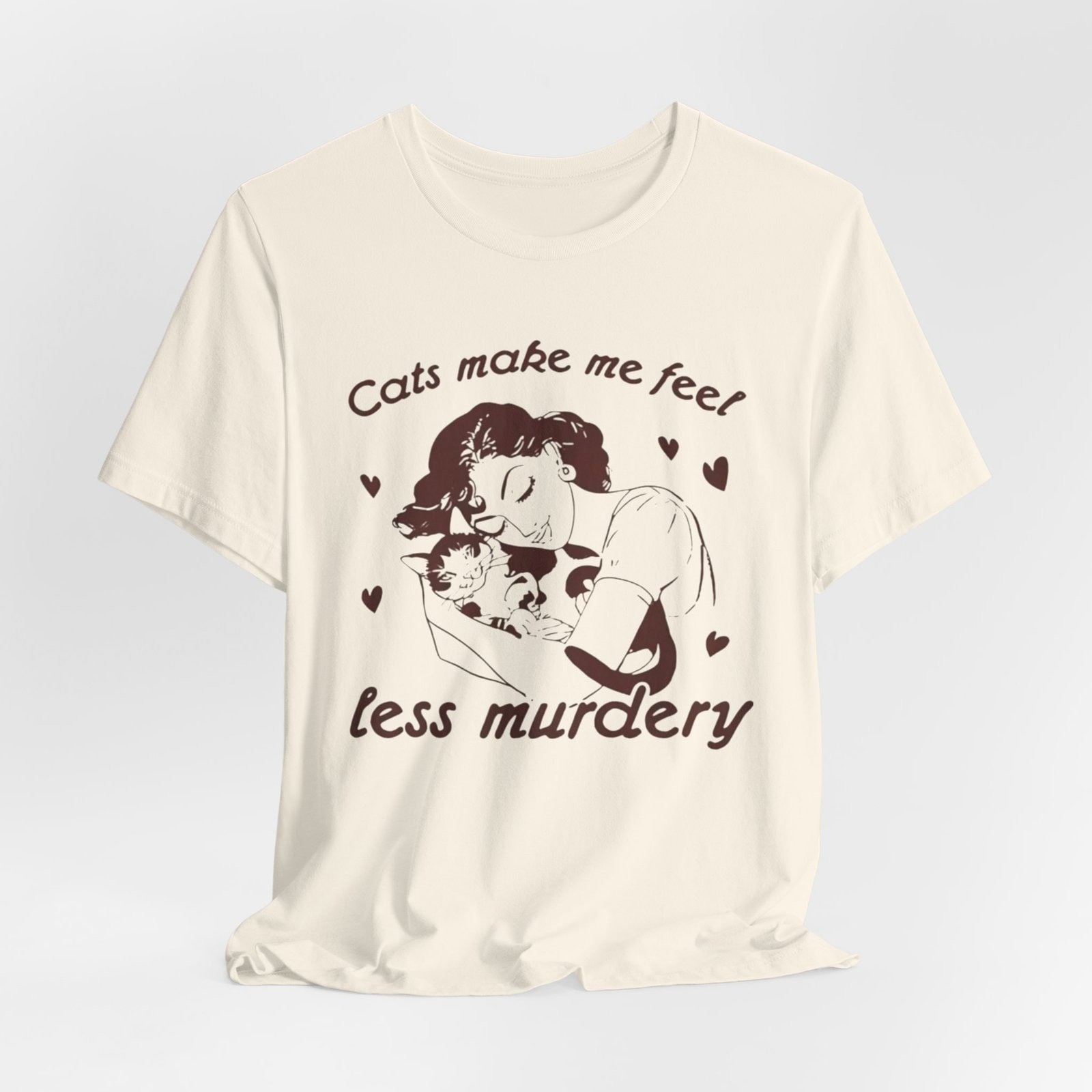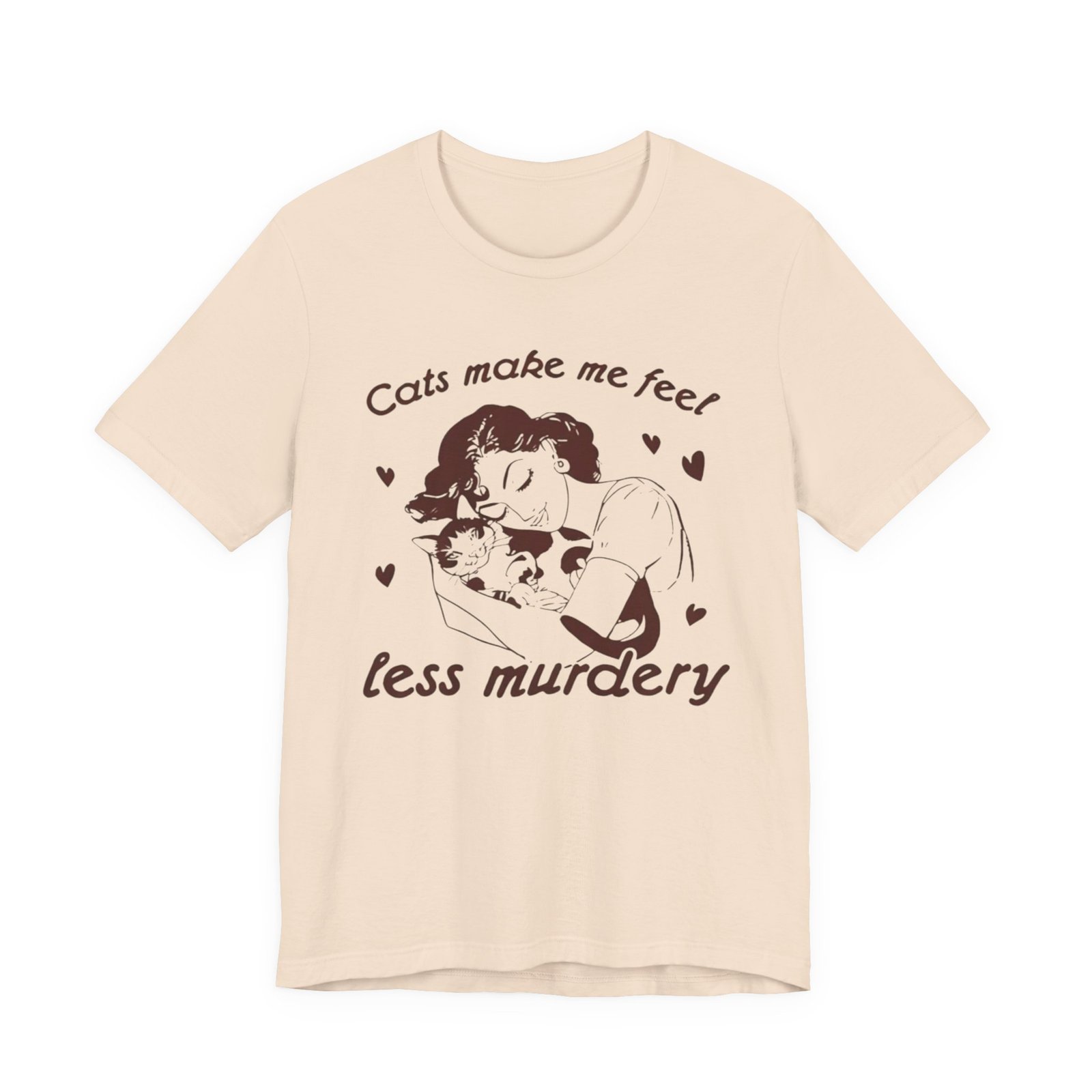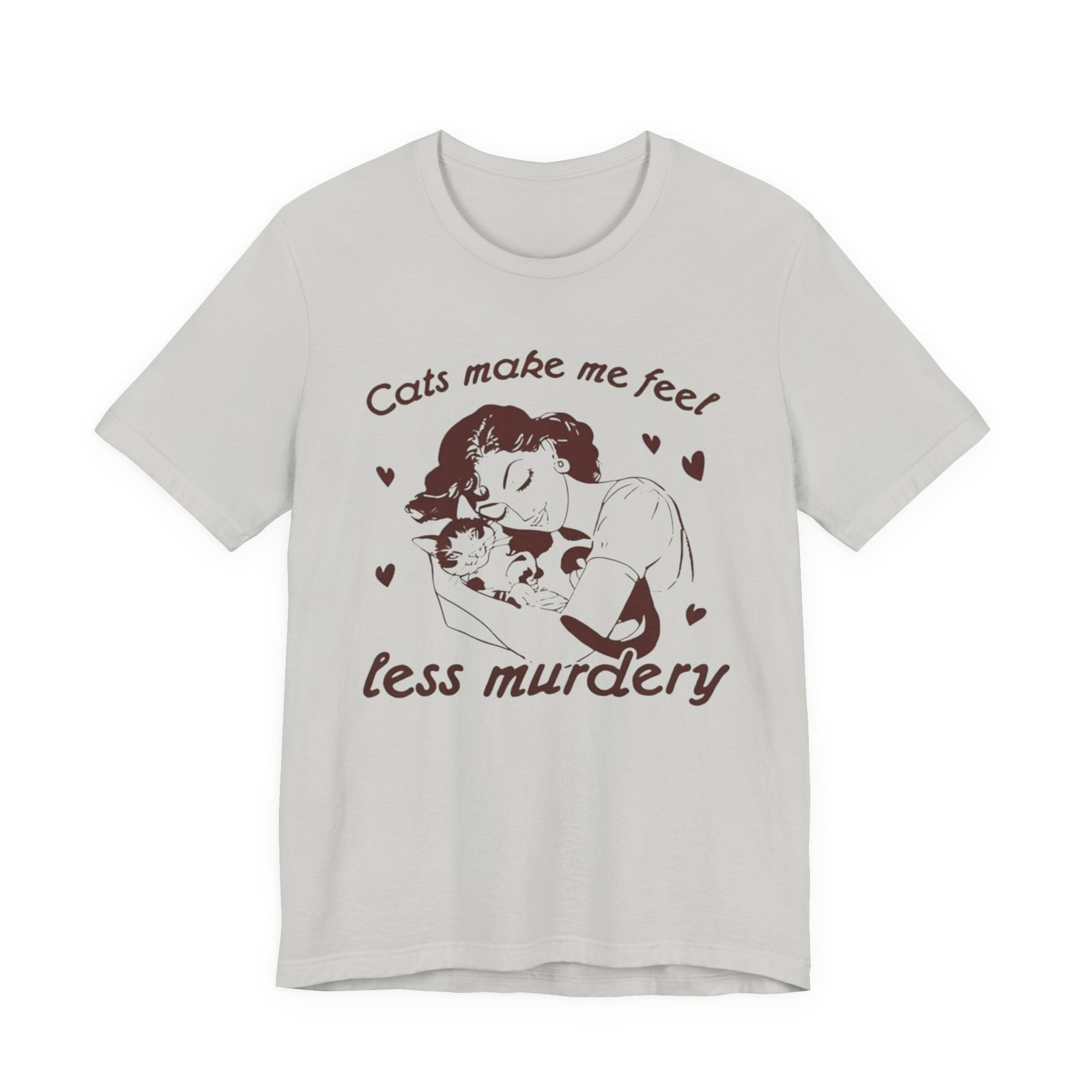 Soft, breathable cotton with a cheeky, cat-lover attitude. This lightweight tee wears like a favorite old shirt — airy at the shoulders, easy to layer, and gentle next to skin thanks to Airlume combed and ring-spun cotton. The front shows a warm, slightly dark-humor illustration of a person cuddling a content cat with the phrase “Cats make me feel less murdery,” blending cozy domestic comfort with wry personality. Thoughtful construction — side seams, ribbed knit collar, shoulder tape and a tear-away label — keeps the shirt comfortable and long-lasting. Ethically produced blanks and REACH compliance add peace of mind for shoppers who care about sourcing.