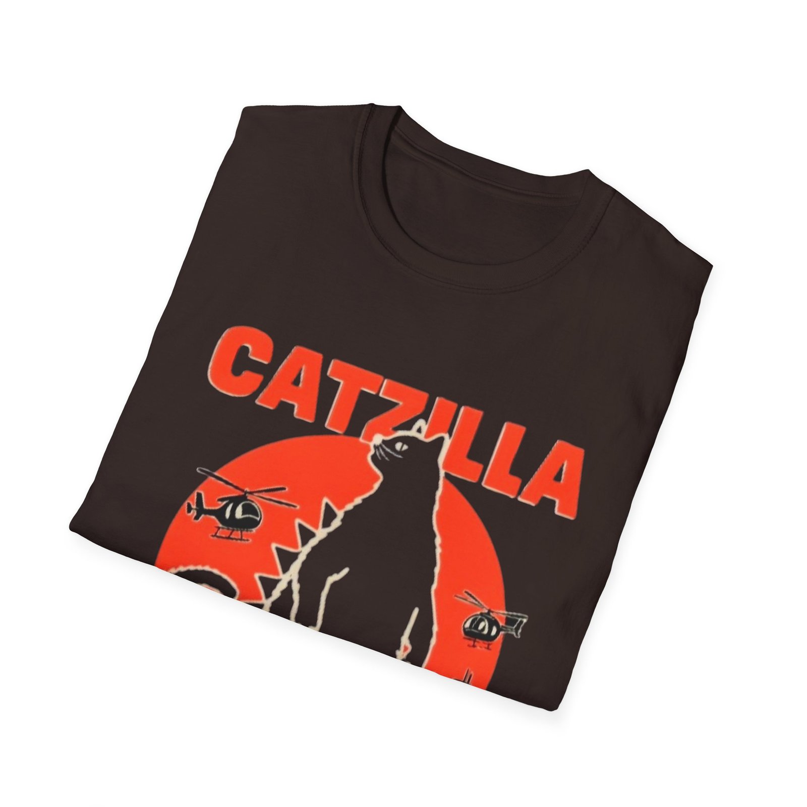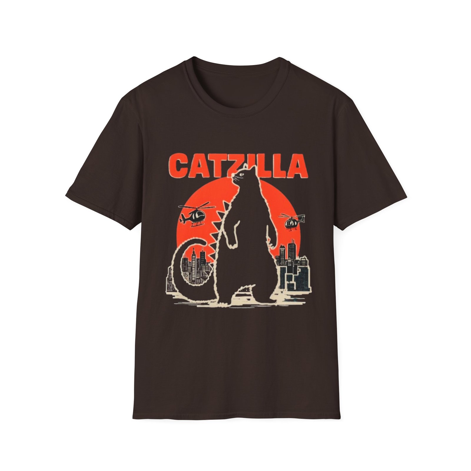 A bold, playful tee that channels city-smashing fun into everyday wear. The silhouette of a giant cat towers over a vintage sun backdrop, helicopters buzzing and skyline ruins sketched in distressed ink. The graphic sits strong on a smooth, lightweight black cotton, giving off an offbeat, retro-monster-movie vibe that’s equal parts ironic and affectionate. Wear it when you want to break the quiet of a coffee shop, start a grin on a subway car, or pair with a denim jacket for late-night wanderings — it reads like a wink from someone who loves pop-culture humor and streetwise style.