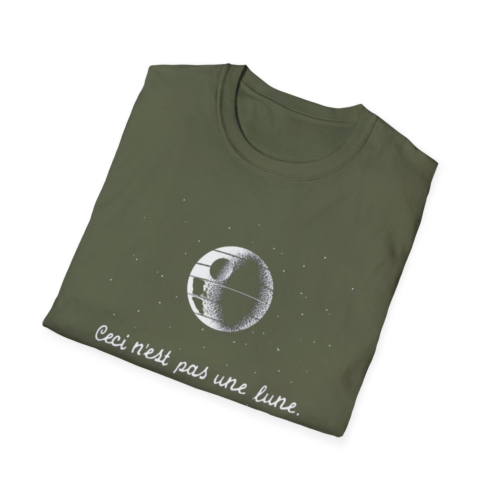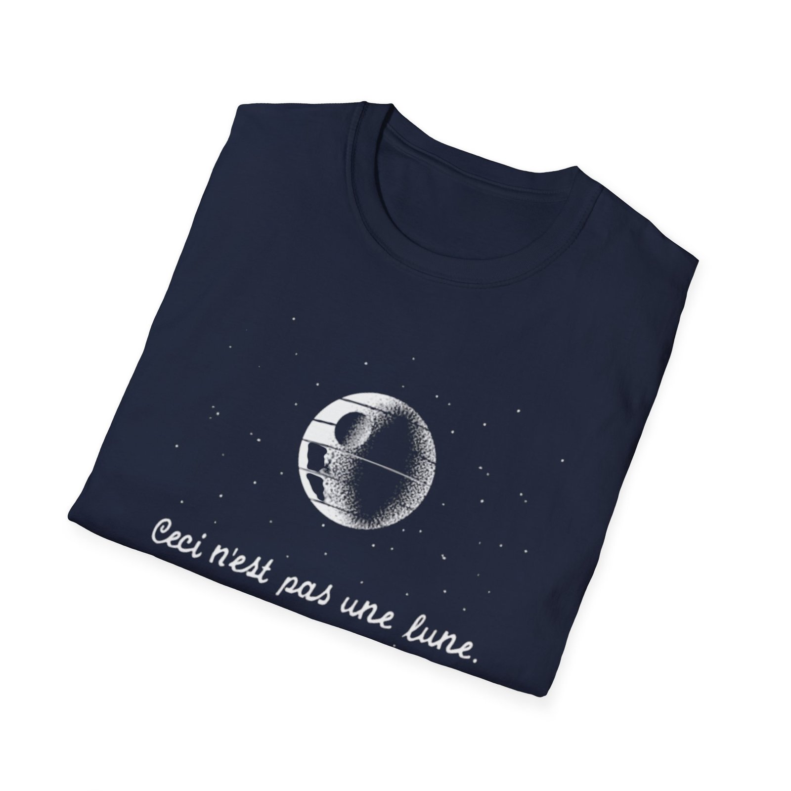 A soft, everyday tee made for people who love clever visuals and quiet humor. The shirt features a distressed, vintage-style illustration of a moon-like sphere with the phrase “Ceci n’est pas une lune.” beneath it — a wink to both art lovers and sci-fi fans. Lightweight and smooth, the fabric sits comfortably against the skin and holds printed details with crisp clarity. Wear it to gallery nights, casual meetups, or those low-key movie marathons when you want your shirt to start conversations without shouting. The understated black canvas keeps the artwork as the focus while delivering easy, all-season wear.