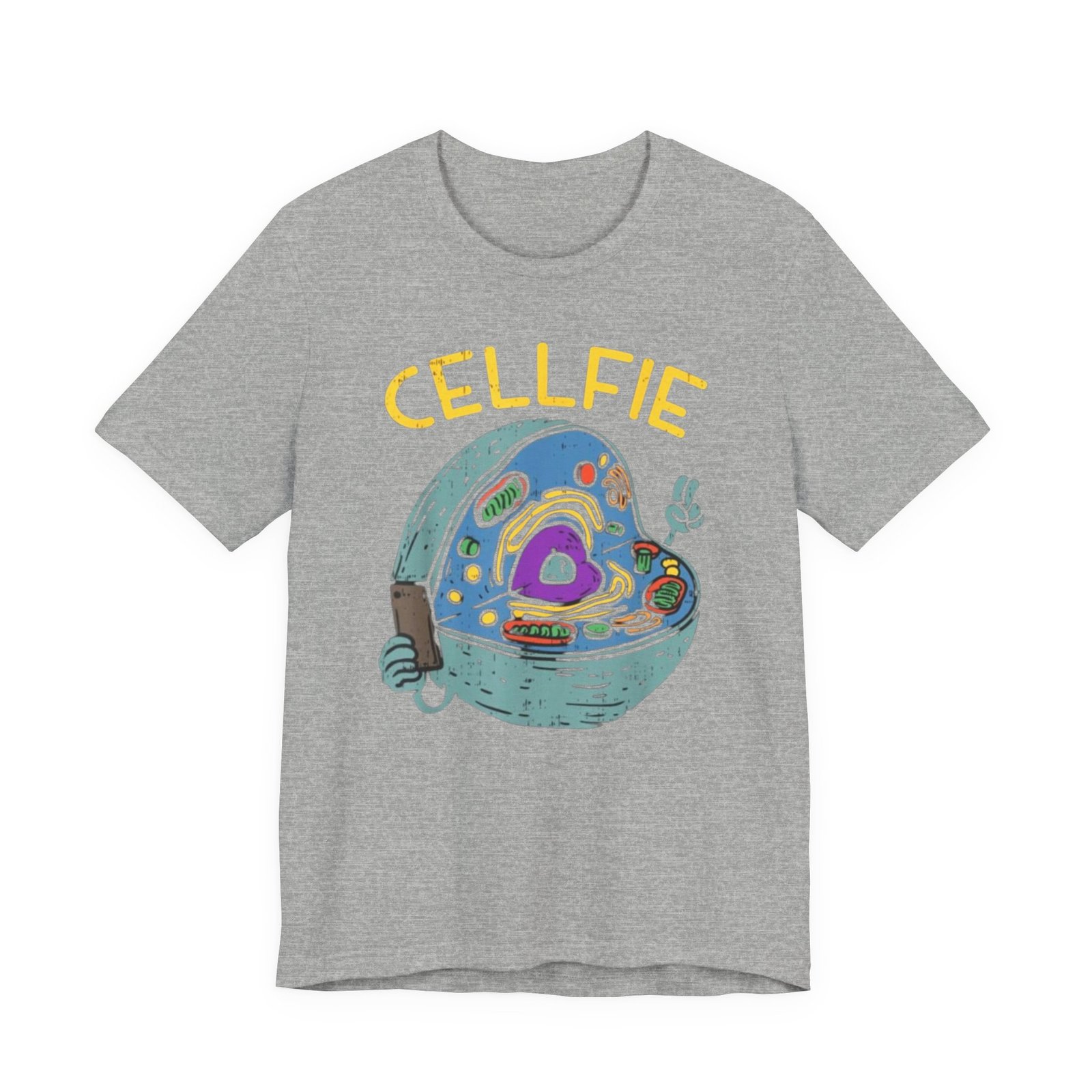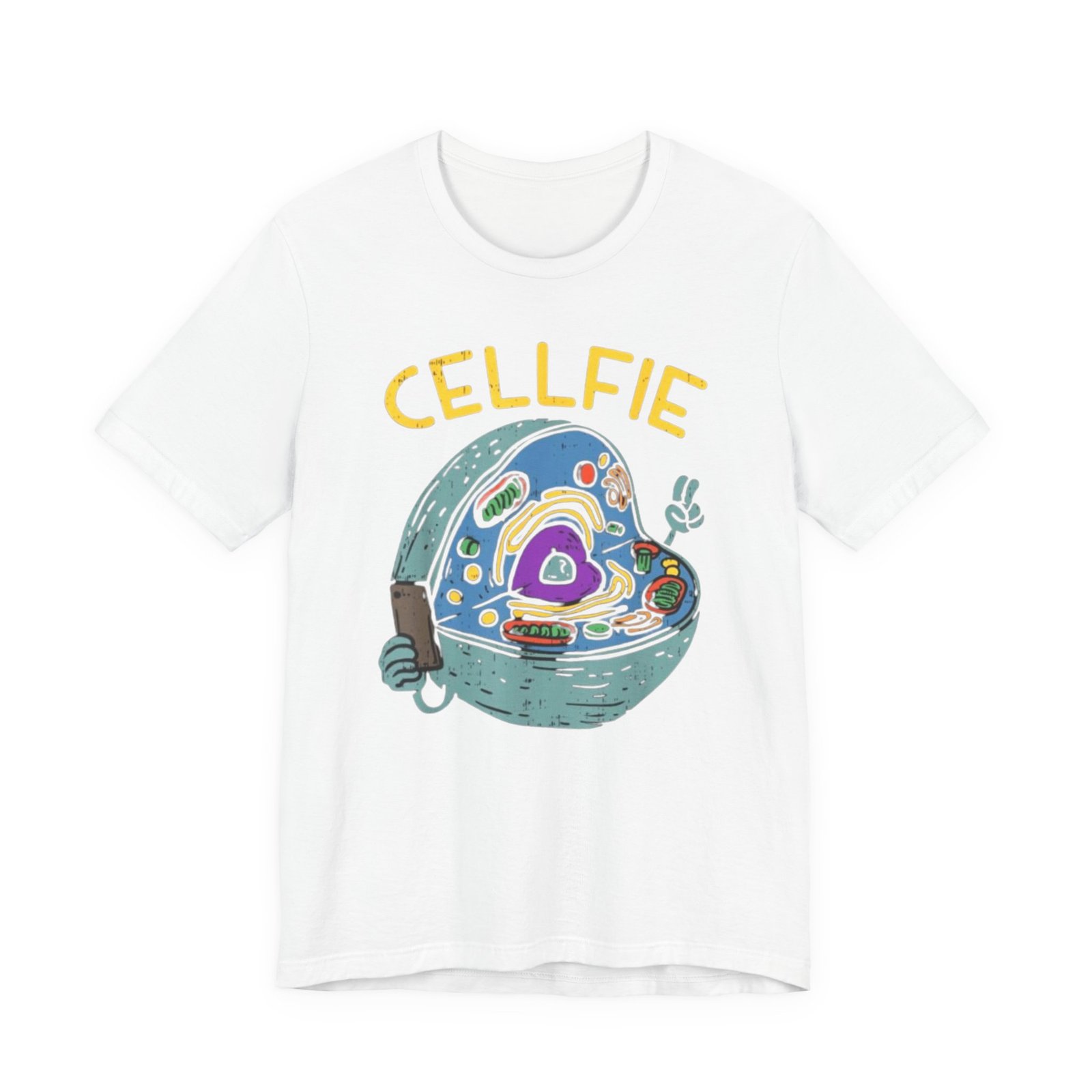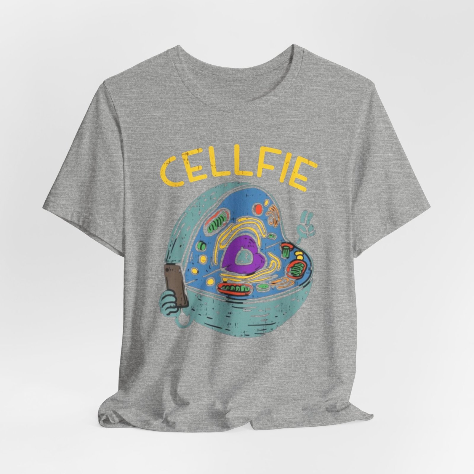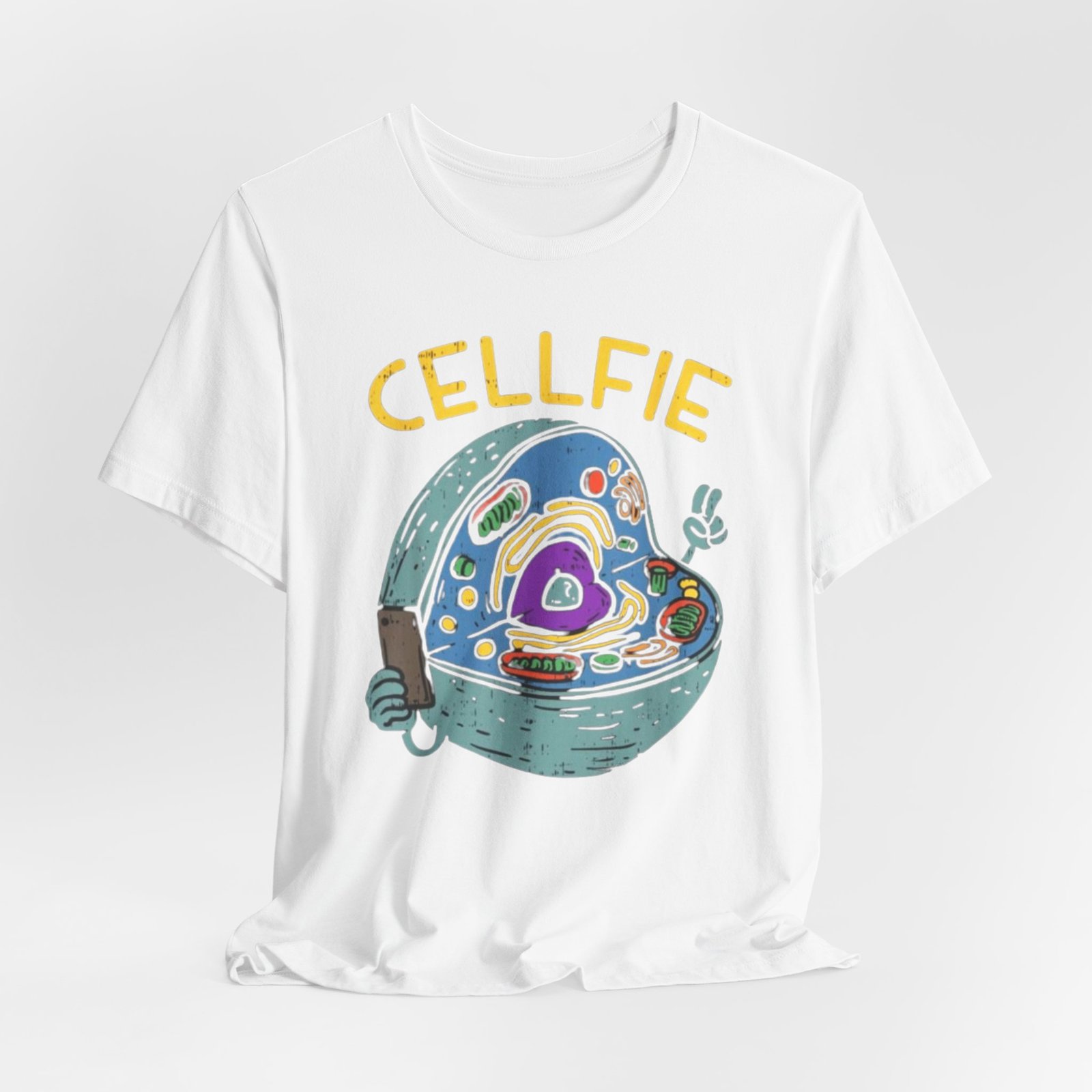 This lightweight jersey tee brings a wink of science and a playful sense of humor to everyday wear. The front graphic shows a whimsical cross-section of a cell taking a ‘cellfie’—bright, hand-drawn organelles and a tiny phone in a friendly, cartoon style. It feels casual and slightly nerdy, the kind of shirt you grab for coffee runs, lab days, or laid-back campus hours. Breathable Airlume cotton keeps you cool while the retail crew neckline and side seams hold a tidy silhouette. Wear it with jeans, a cardigan, or under a lab coat to quietly announce your love of biology with a smile.