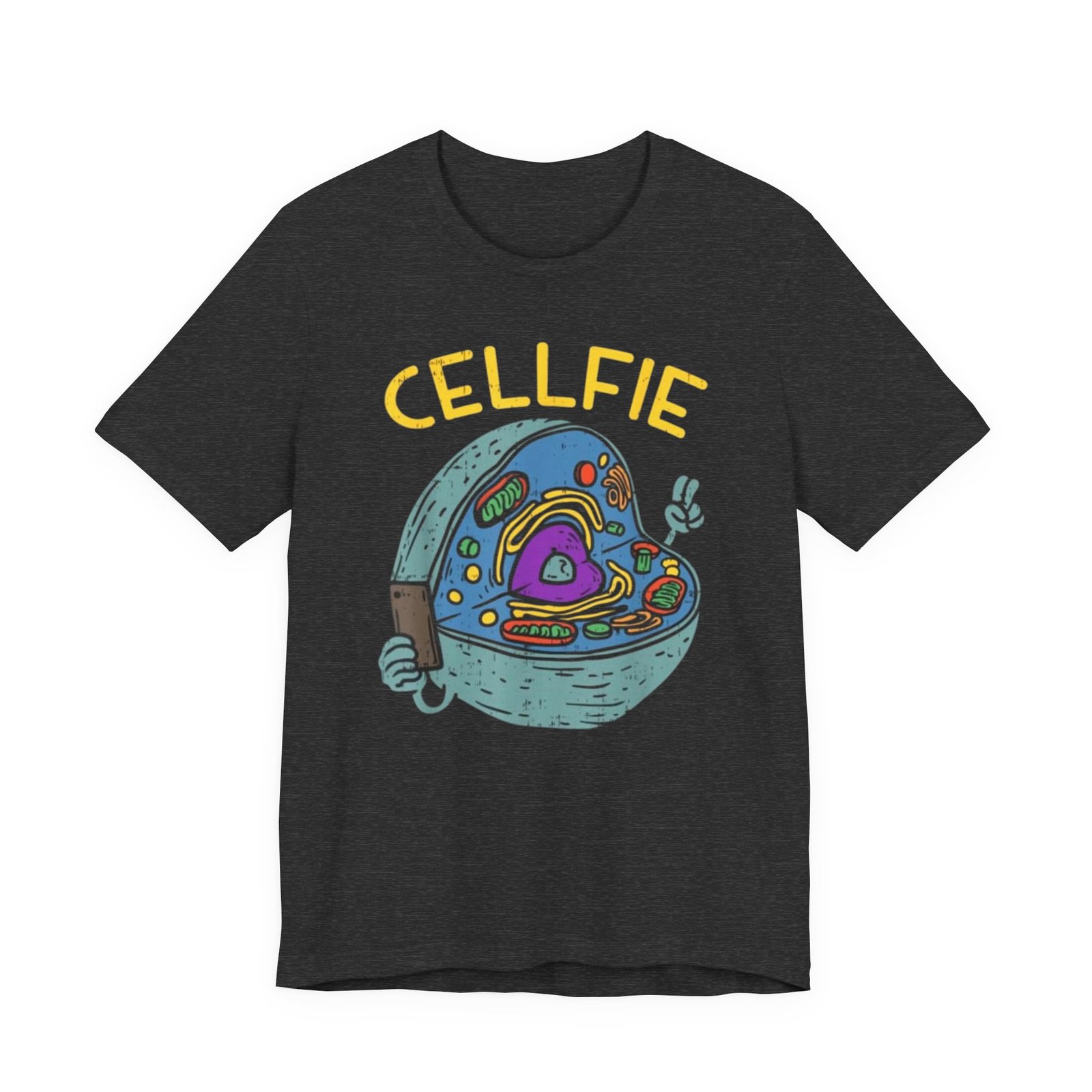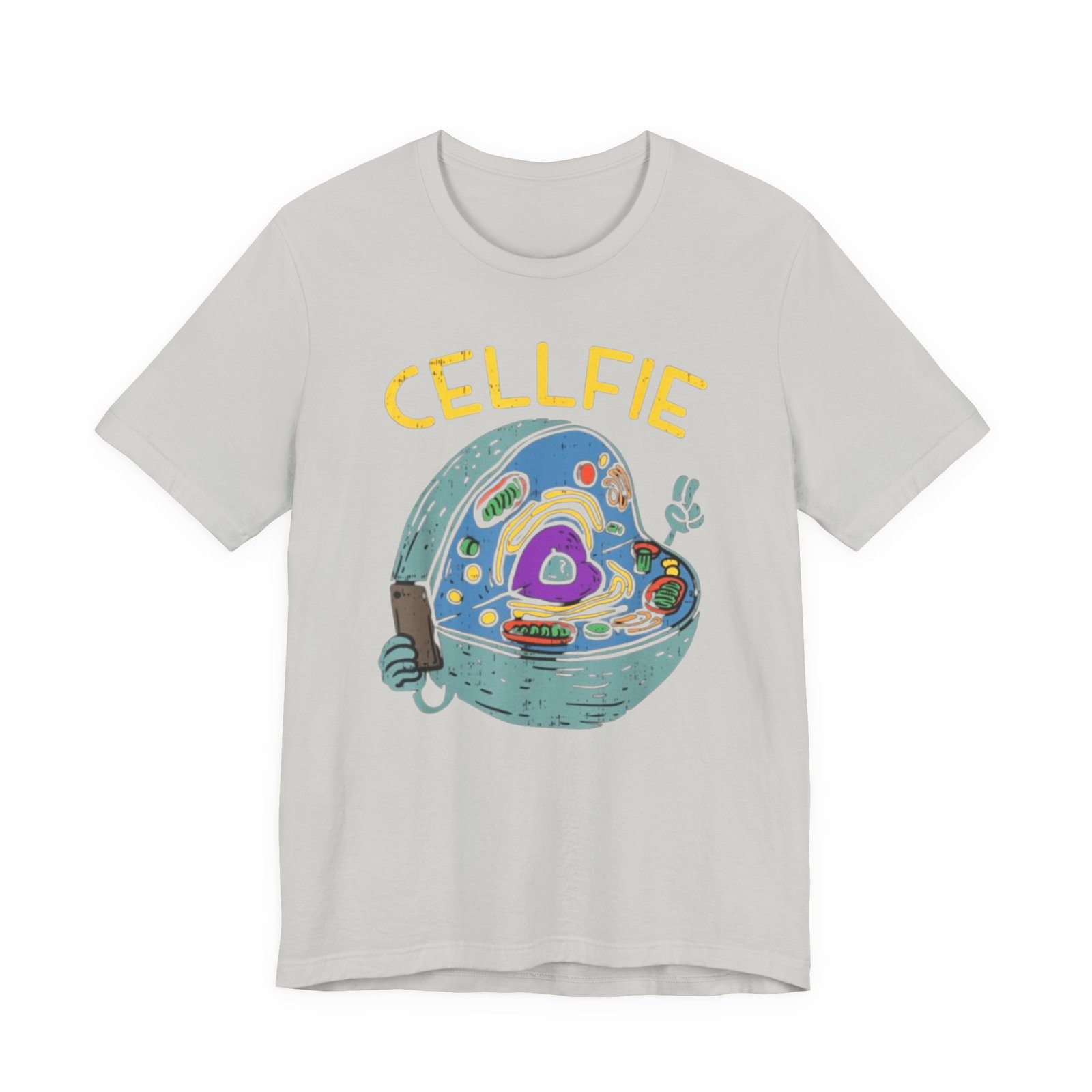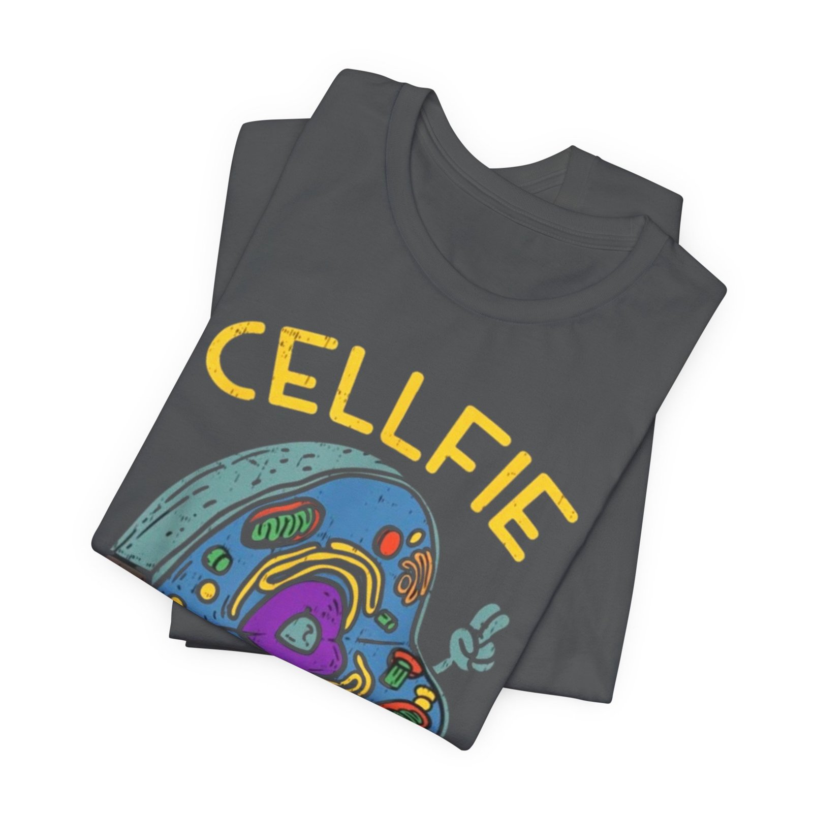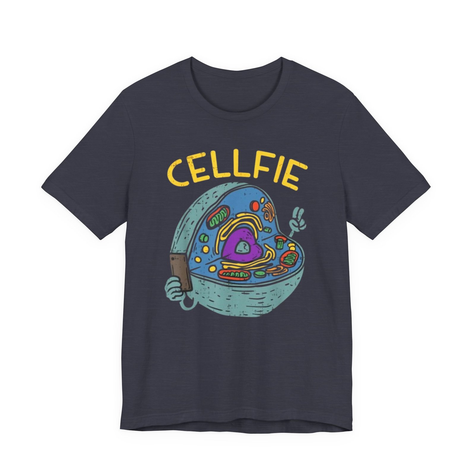 This lightweight jersey tee brings a wink of science and a playful sense of humor to everyday wear. The front graphic shows a whimsical cross-section of a cell taking a ‘cellfie’—bright, hand-drawn organelles and a tiny phone in a friendly, cartoon style. It feels casual and slightly nerdy, the kind of shirt you grab for coffee runs, lab days, or laid-back campus hours. Breathable Airlume cotton keeps you cool while the retail crew neckline and side seams hold a tidy silhouette. Wear it with jeans, a cardigan, or under a lab coat to quietly announce your love of biology with a smile.