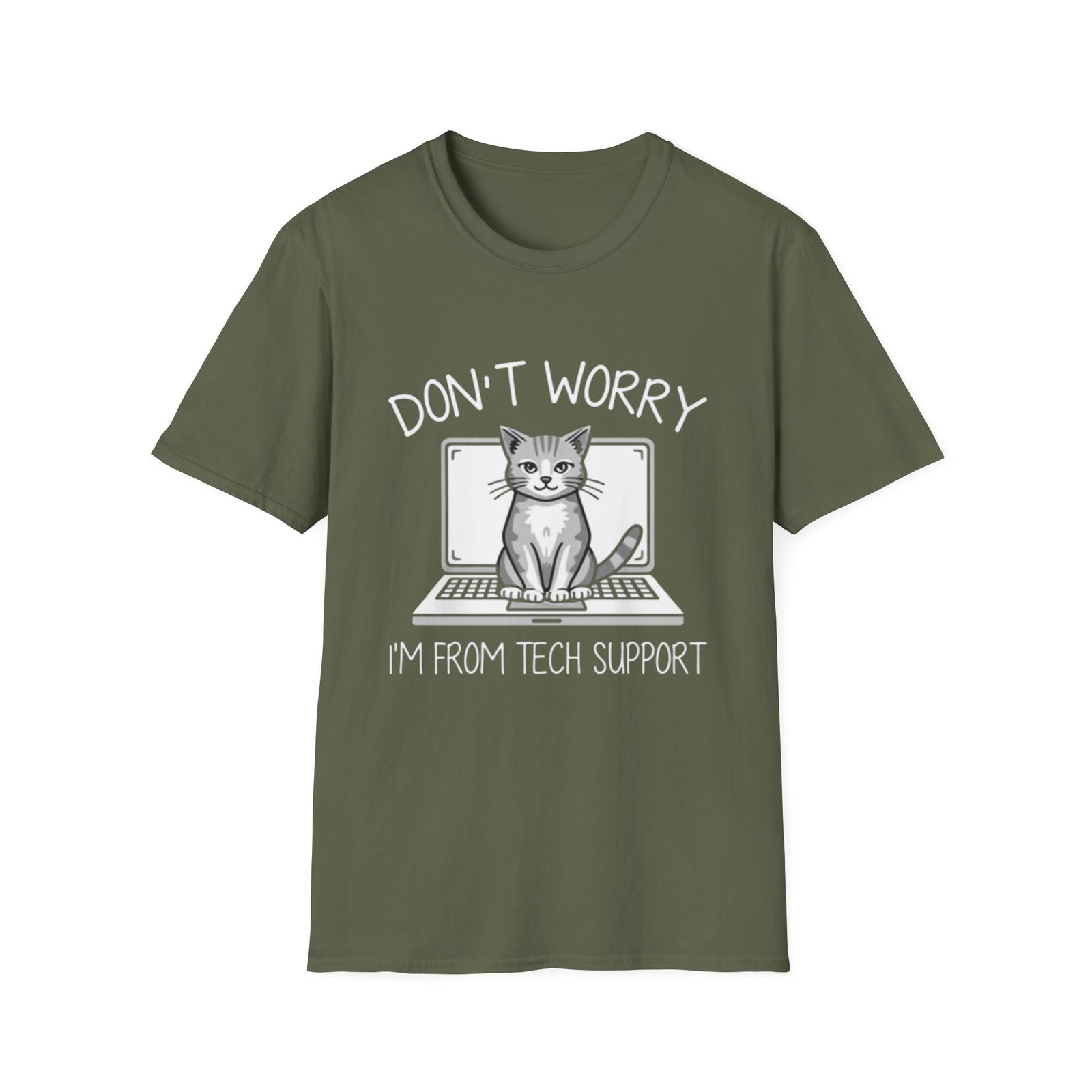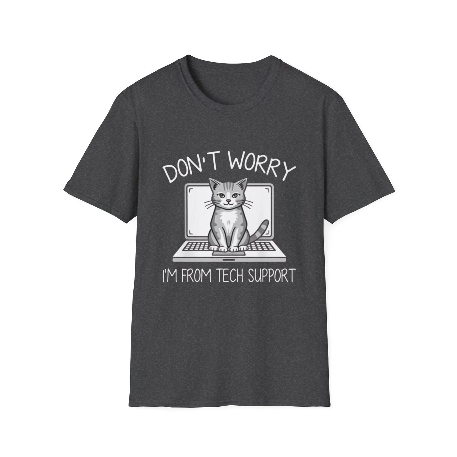 This lightweight crewneck tee brings soft, everyday comfort with a playful tech-loving vibe. A calm, confident cat sits in front of a laptop with the cheeky line “Don’t worry — I’m from tech support,” making the shirt a quiet conversation starter whether you’re debugging code, leading a support call, or lounging at a weekend meetup. The smooth, ring-spun cotton feels gentle on the skin and holds printed details clearly, while the ribbed collar and shoulder tape keep the shape and fit through repeated wear. Subtle natural flecks appear on undyed colorways, adding character to an otherwise clean, minimalist black canvas. It’s made to move with you — breathable, durable, and easy to layer under a hoodie or blazer for casual office days or remote standups.