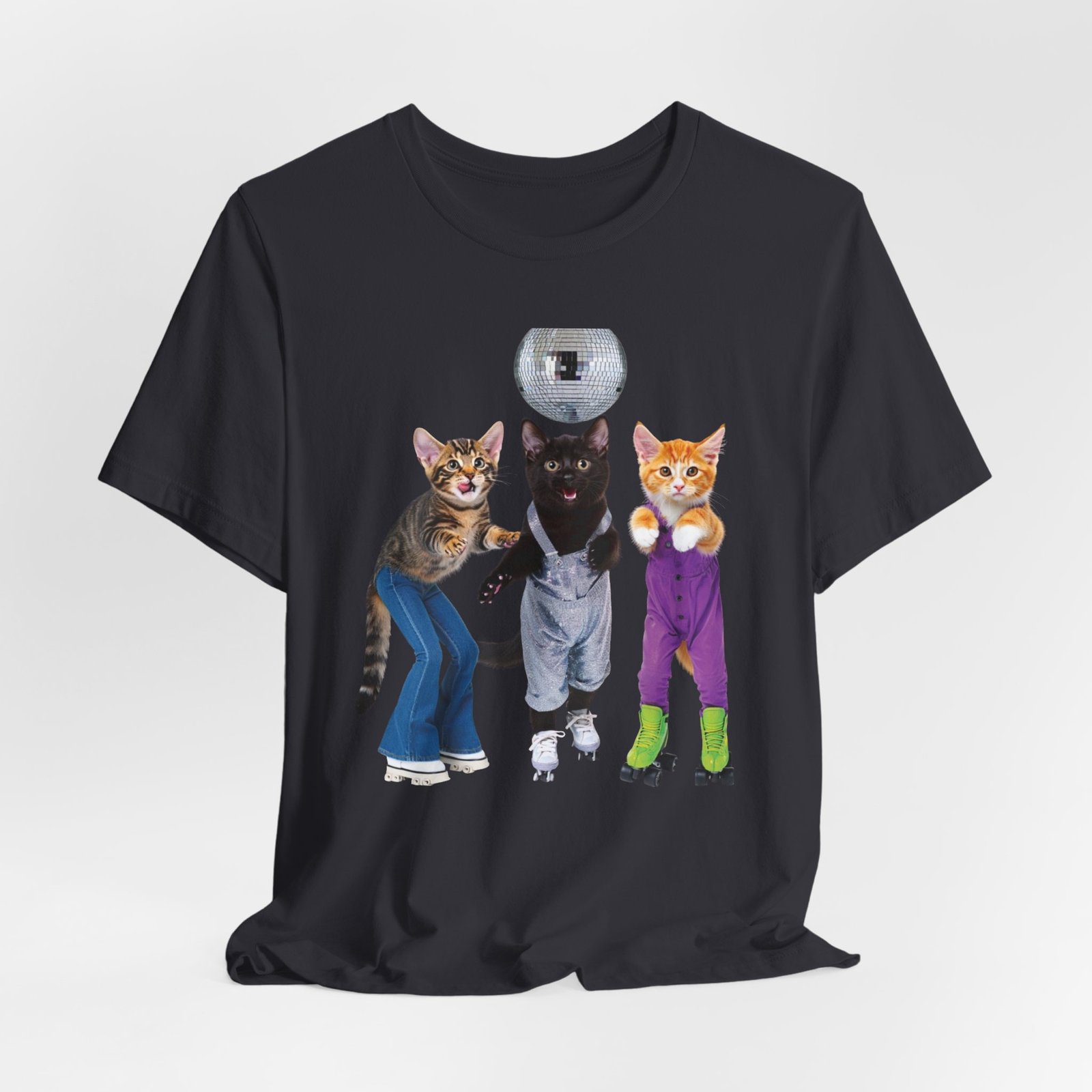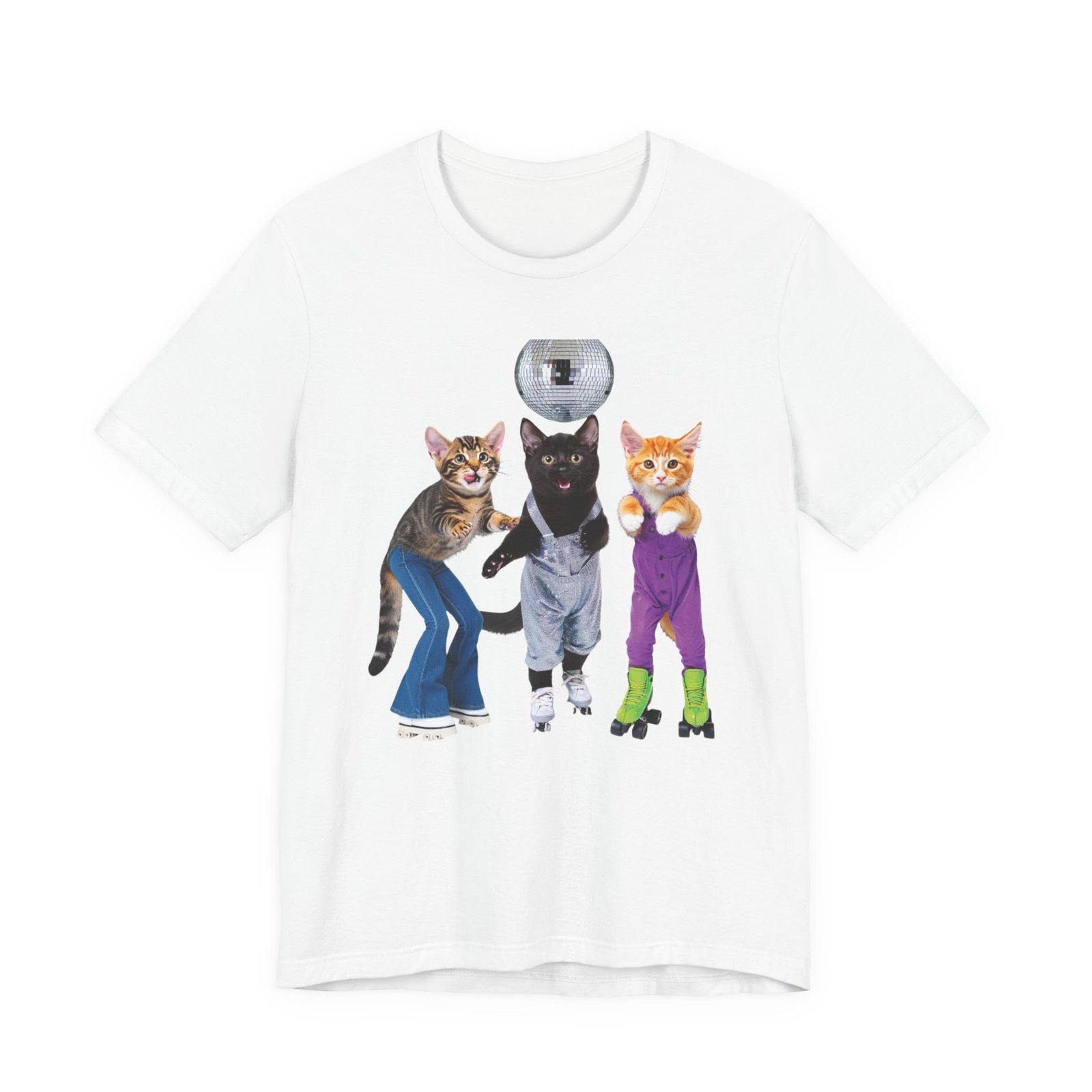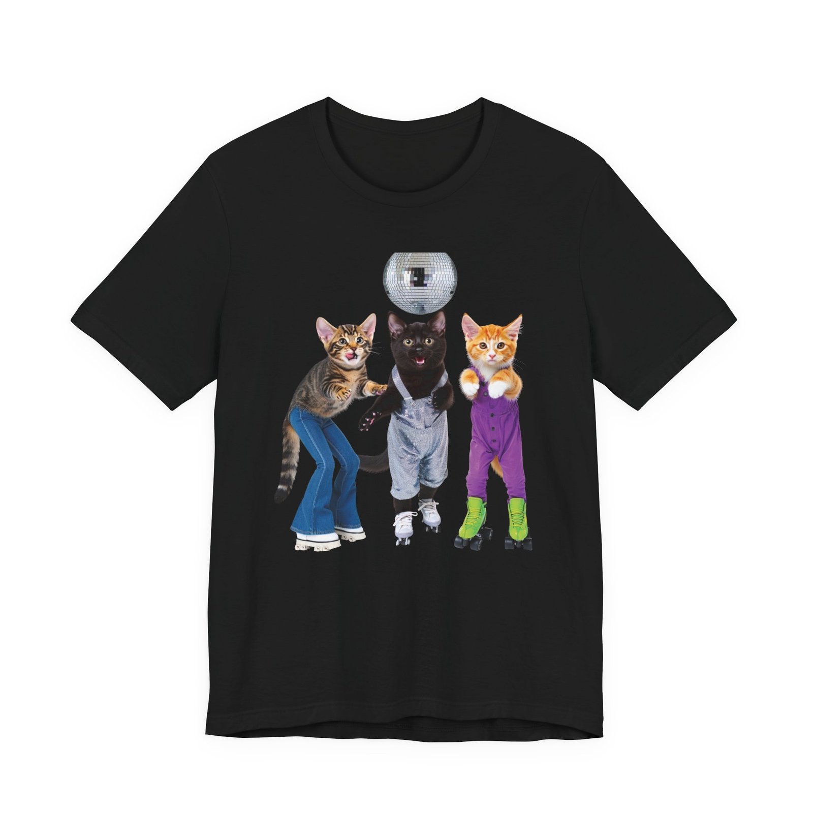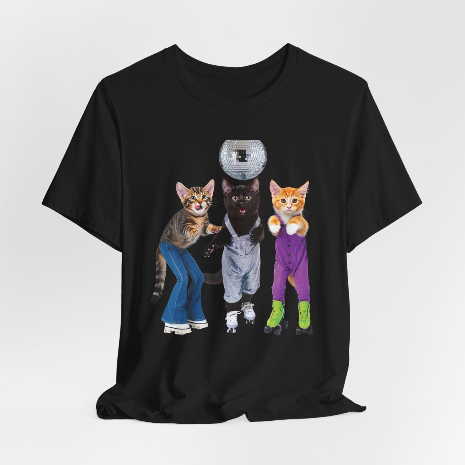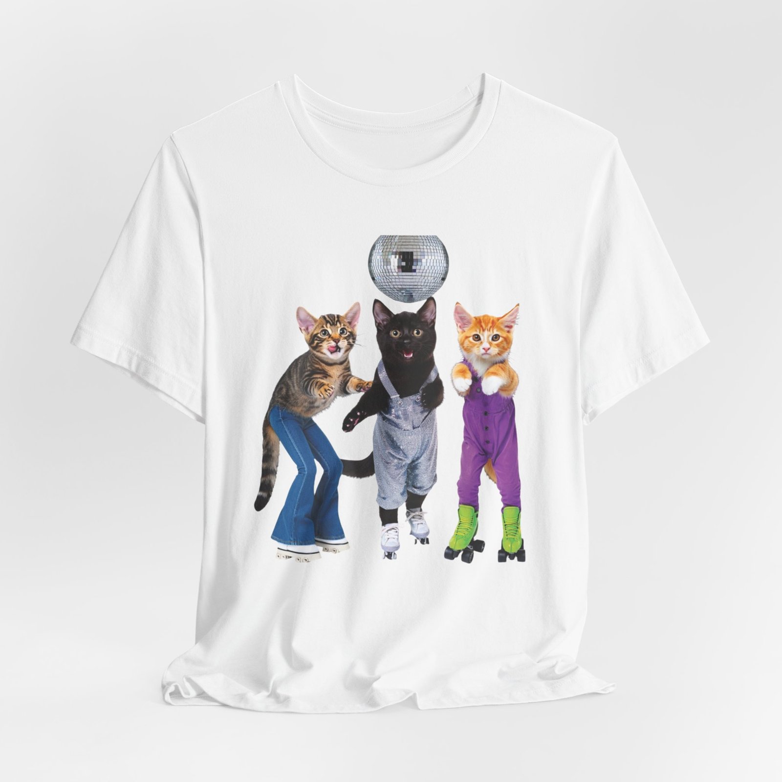 Three disco-ready kittens strike a pose on a soft, breathable tee — one in flared jeans, one in roller skates, and a confident middle cat balancing a disco ball. This shirt brings playful nostalgia and a sense of joyful mischief to everyday wear. The lightweight cotton feels cool against the skin and layers easily under jackets or over long sleeves. Wear it to bring a smile on morning errands, to a laid-back skate night, or whenever you want to show off a quirky, fun side. The clean crew neck and structured seams keep the silhouette neat while the printed label and sleeve details keep the focus on comfort and durability.