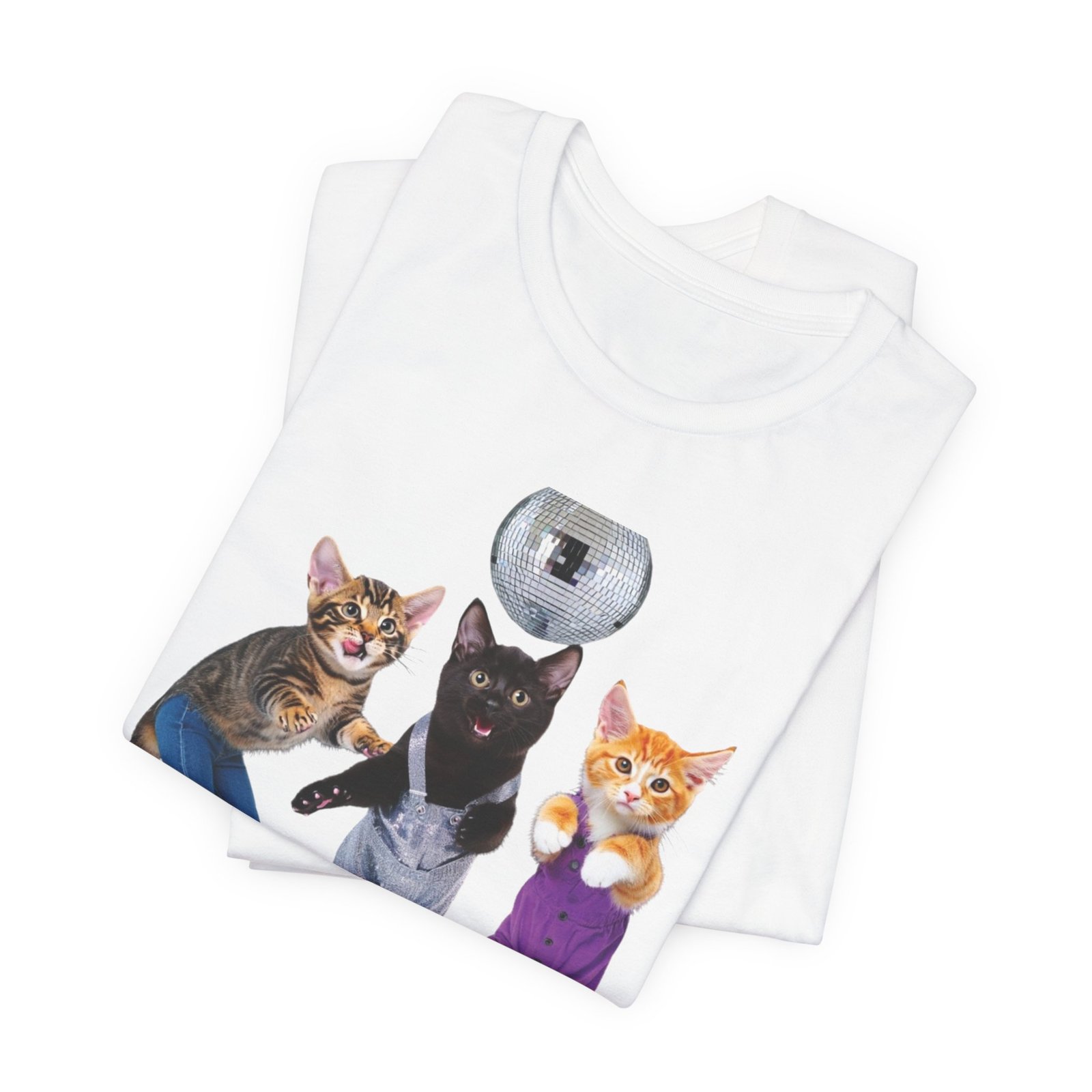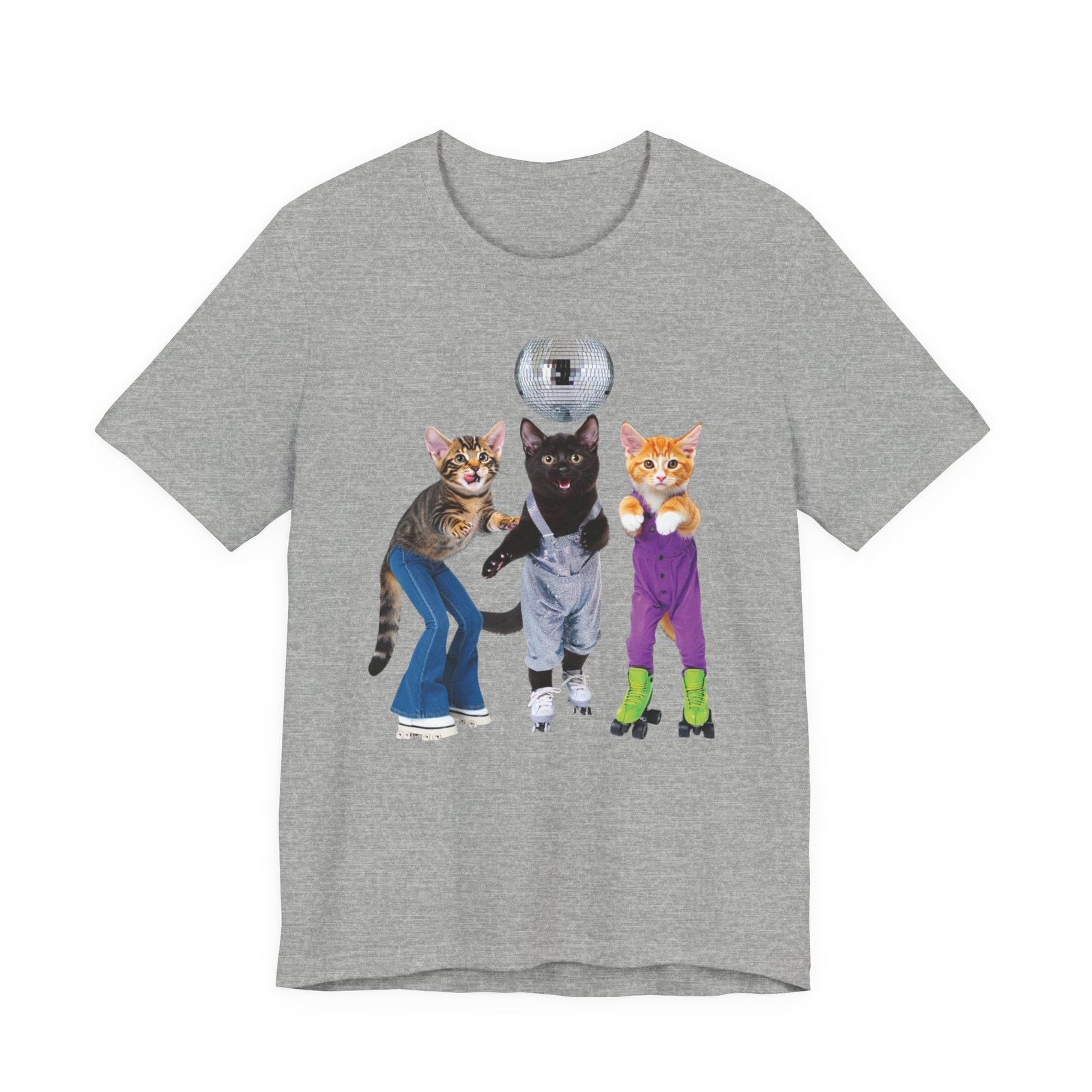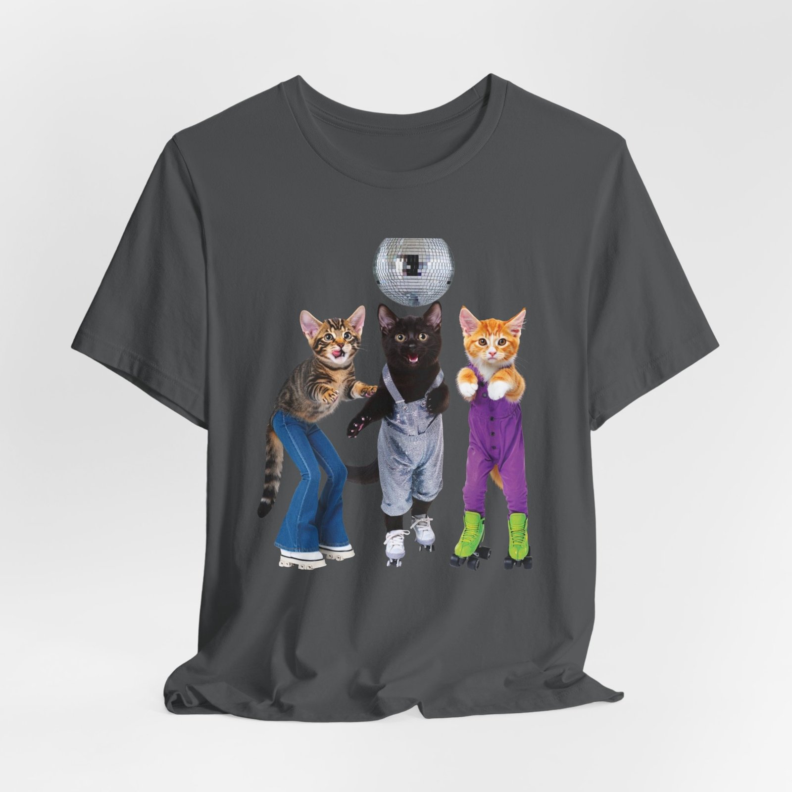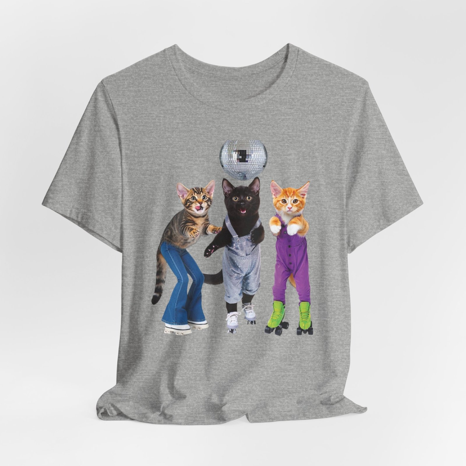 Three disco-ready kittens strike a pose on a soft, breathable tee — one in flared jeans, one in roller skates, and a confident middle cat balancing a disco ball. This shirt brings playful nostalgia and a sense of joyful mischief to everyday wear. The lightweight cotton feels cool against the skin and layers easily under jackets or over long sleeves. Wear it to bring a smile on morning errands, to a laid-back skate night, or whenever you want to show off a quirky, fun side. The clean crew neck and structured seams keep the silhouette neat while the printed label and sleeve details keep the focus on comfort and durability.