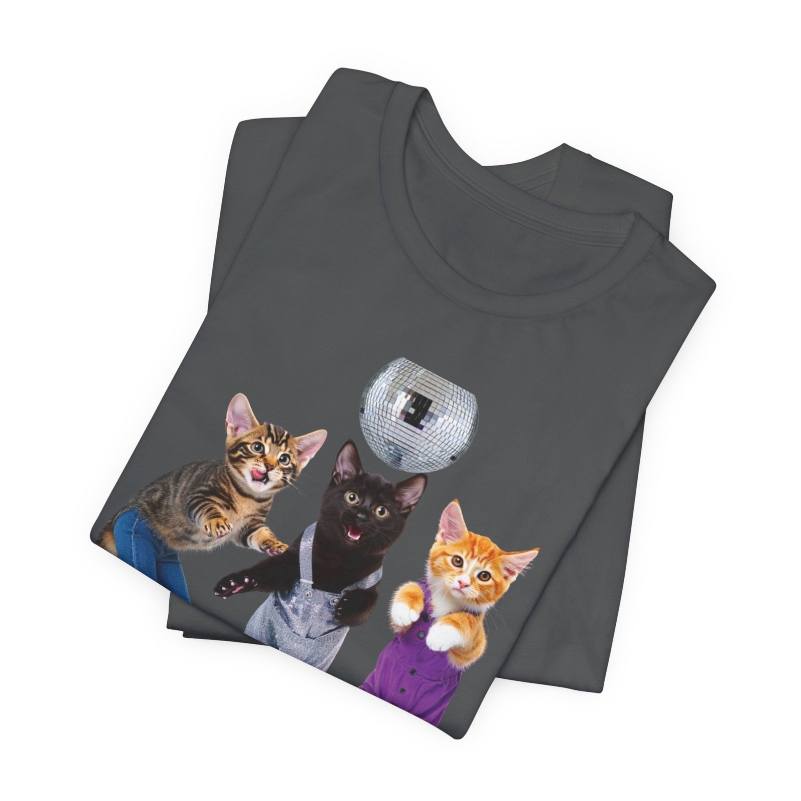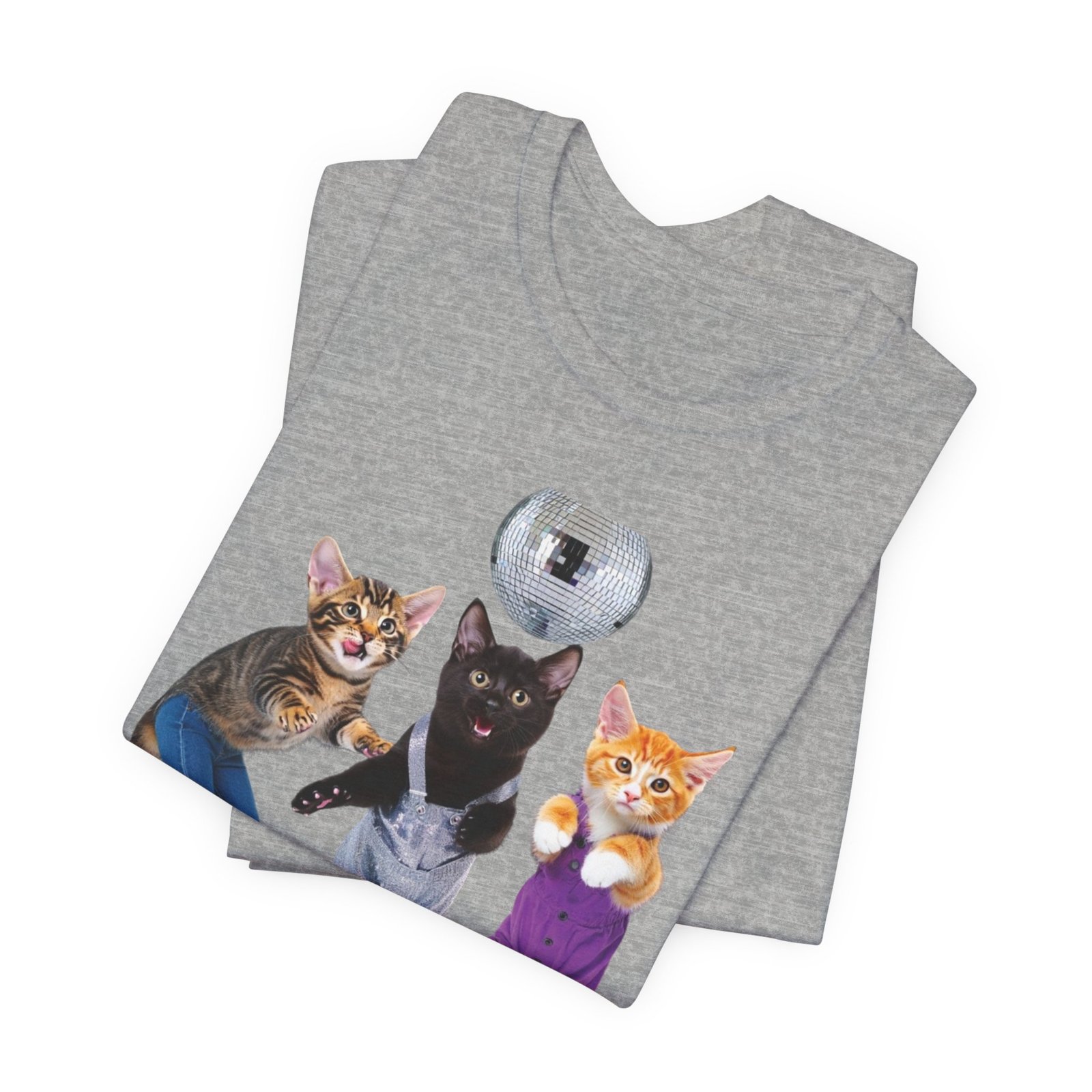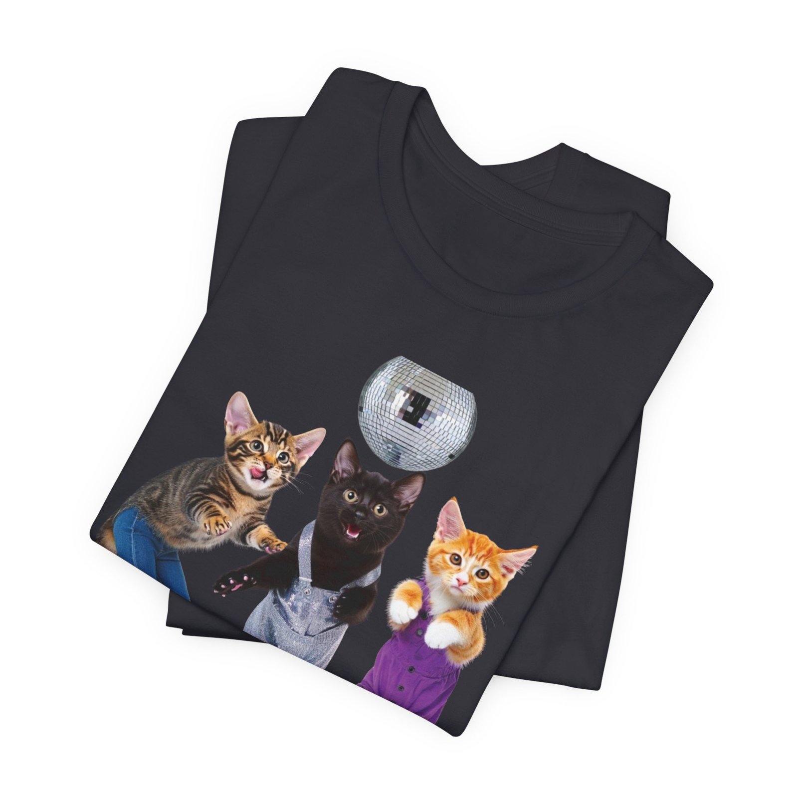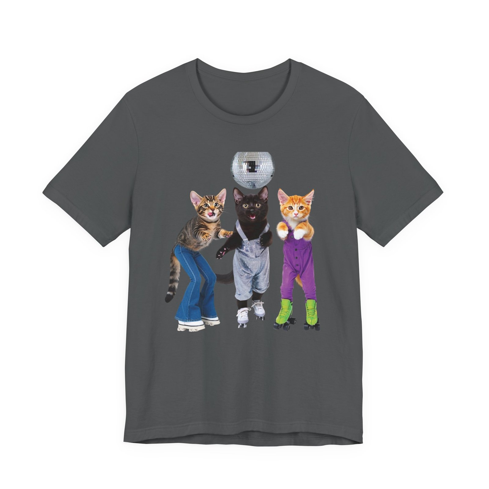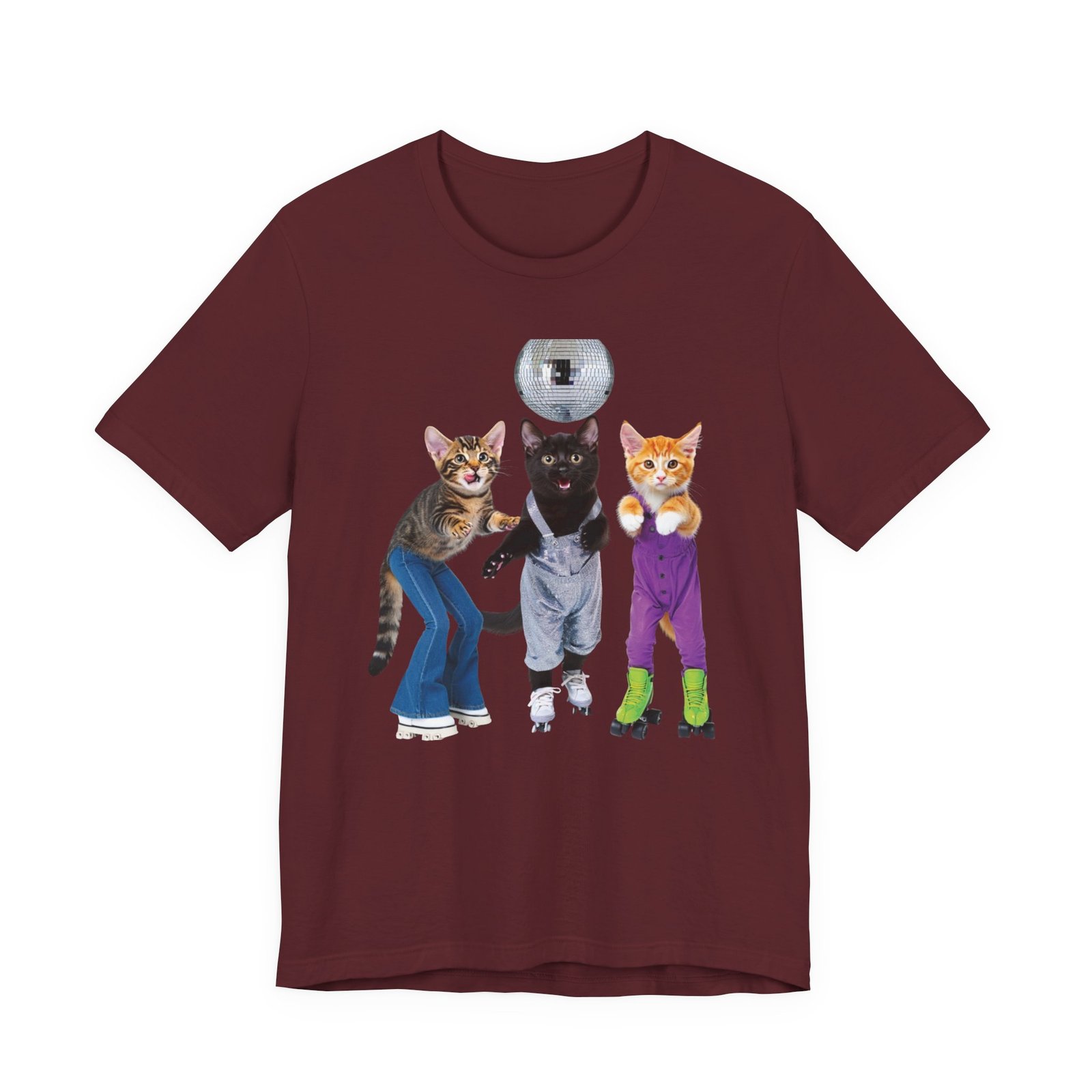 Three disco-ready kittens strike a pose on a soft, breathable tee — one in flared jeans, one in roller skates, and a confident middle cat balancing a disco ball. This shirt brings playful nostalgia and a sense of joyful mischief to everyday wear. The lightweight cotton feels cool against the skin and layers easily under jackets or over long sleeves. Wear it to bring a smile on morning errands, to a laid-back skate night, or whenever you want to show off a quirky, fun side. The clean crew neck and structured seams keep the silhouette neat while the printed label and sleeve details keep the focus on comfort and durability.