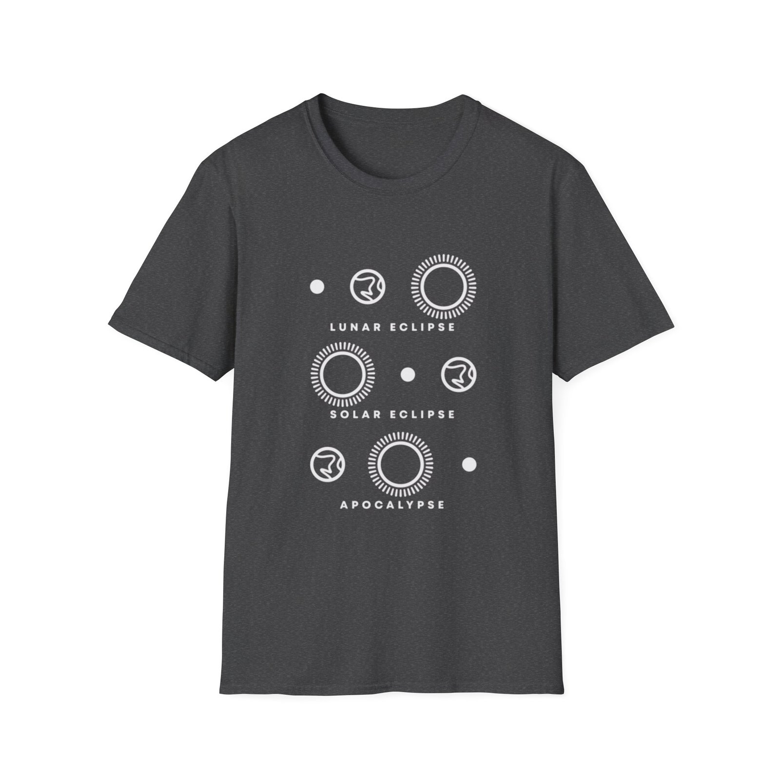 Under a quiet, dark sky this lightweight tee carries a small, curious story: three minimalist diagrams chart the lunar eclipse, the solar eclipse, and the tongue-in-cheek ‘apocalypse’—each rendered in clean white on deep black. It feels like a pocketable nightwatch; the shirt reads like a scientist’s notebook crossed with an indie zine. Wear it to late-night stargazing, to a lecture on celestial mechanics, or when you want a subtle, thoughtful graphic that sparks conversation without shouting. The soft ring-spun cotton sits close to the skin and moves easily, so the design becomes part of ordinary evenings and memorable nights alike.