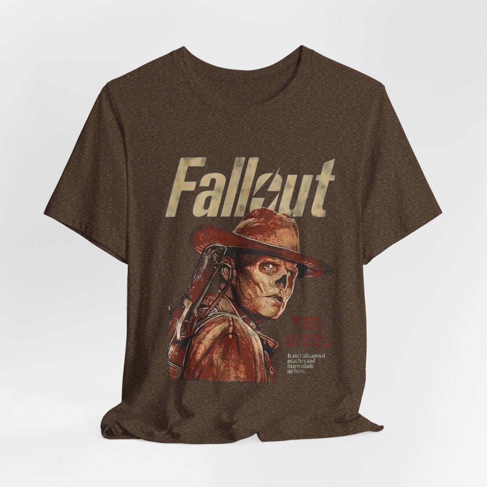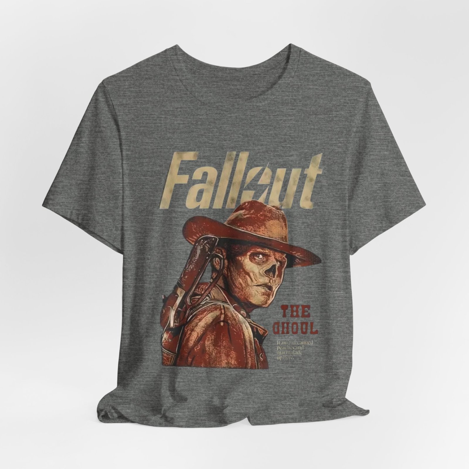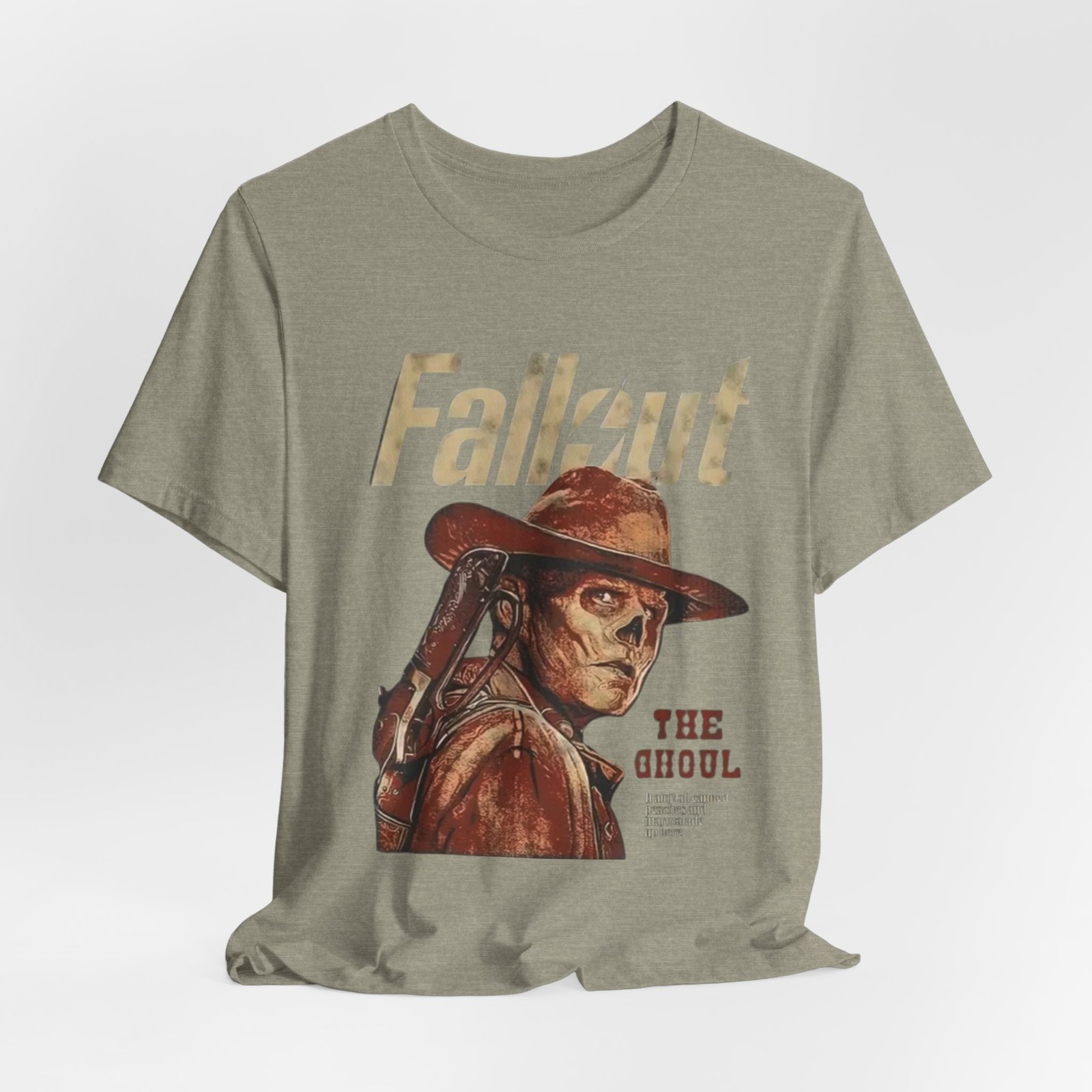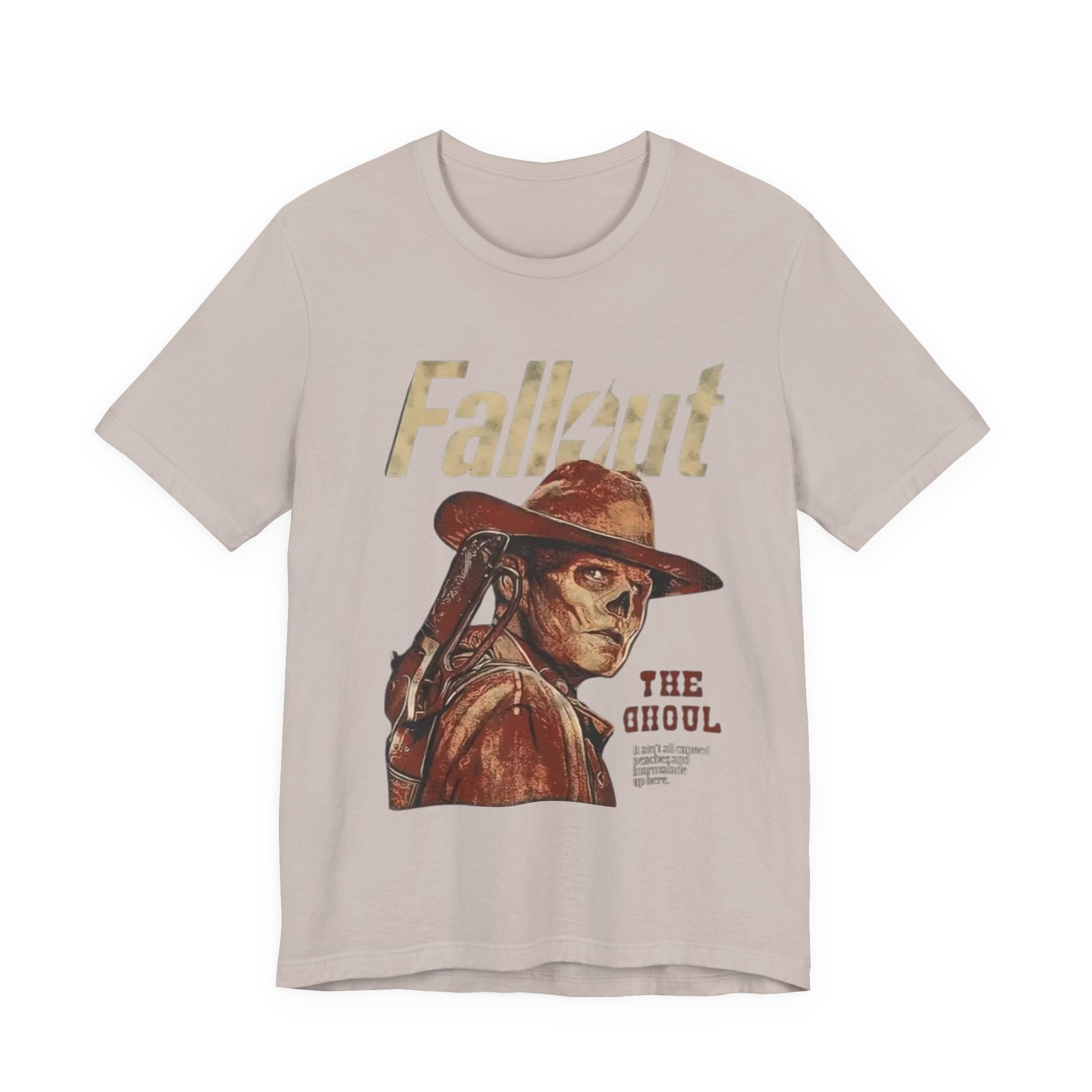 This soft, breathable tee wears like a lived-in favorite. The muted, dusty canvas color and vintage-style illustration of a lone ghoul in a wide-brim hat evoke long highway drives through sun-bleached deserts and slow evenings at retro arcades. Lightweight Airlume combed cotton makes it easy to layer under a jacket or wear on its own while the retail crew neck keeps the silhouette tidy and simple. It settles into weekend routines — late-night game sessions, meetups with fellow fans, or quiet moments of collecting art books — and reads as a subtle nod to anyone who loves post-apocalyptic worlds without shouting for attention. The design’s distressed print and earth-toned palette pair naturally with worn denim, cargo pants, or a faded flannel for that thoughtful, off-duty look.