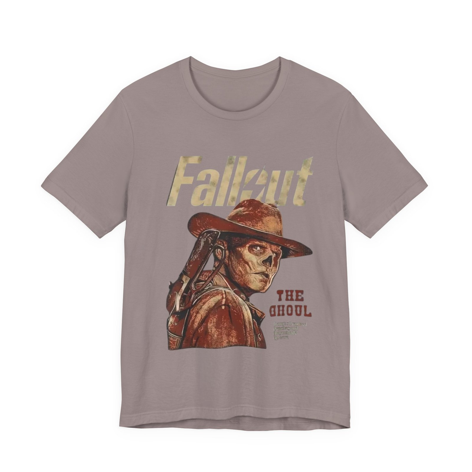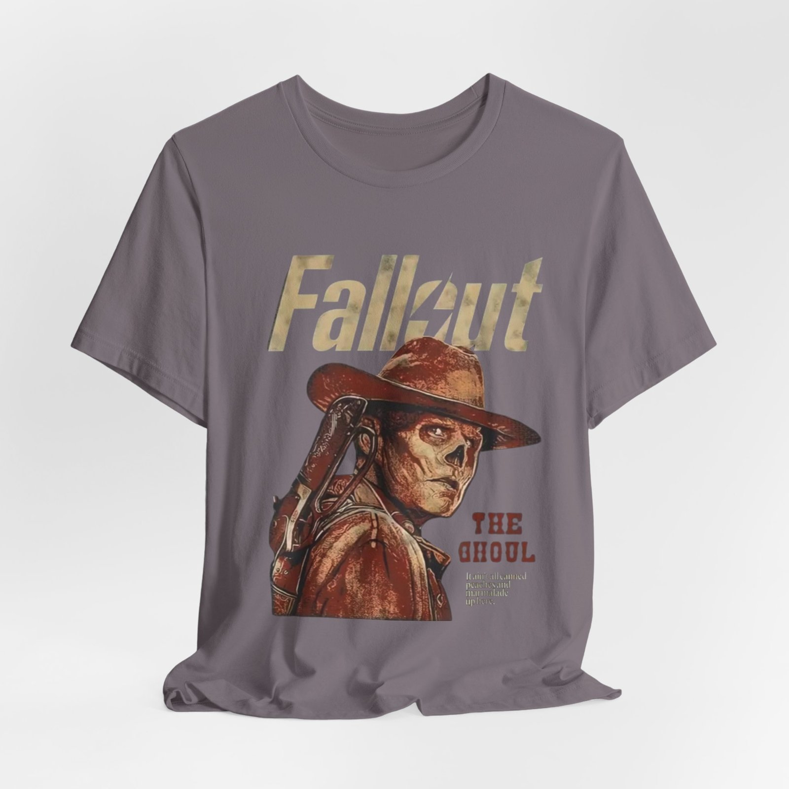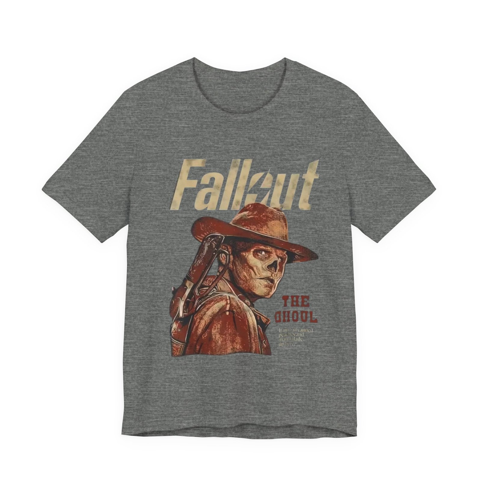 This soft, breathable tee wears like a lived-in favorite. The muted, dusty canvas color and vintage-style illustration of a lone ghoul in a wide-brim hat evoke long highway drives through sun-bleached deserts and slow evenings at retro arcades. Lightweight Airlume combed cotton makes it easy to layer under a jacket or wear on its own while the retail crew neck keeps the silhouette tidy and simple. It settles into weekend routines — late-night game sessions, meetups with fellow fans, or quiet moments of collecting art books — and reads as a subtle nod to anyone who loves post-apocalyptic worlds without shouting for attention. The design’s distressed print and earth-toned palette pair naturally with worn denim, cargo pants, or a faded flannel for that thoughtful, off-duty look.