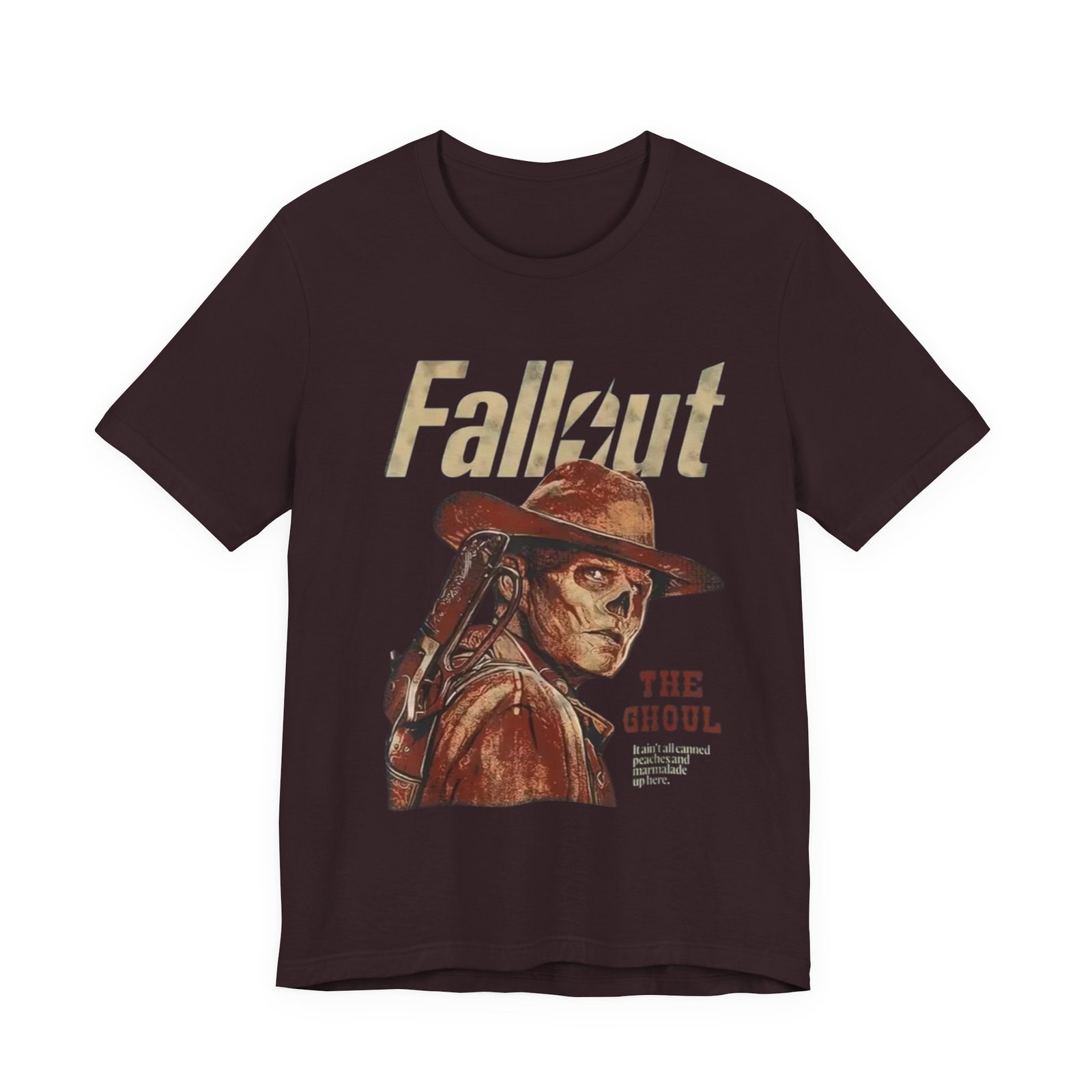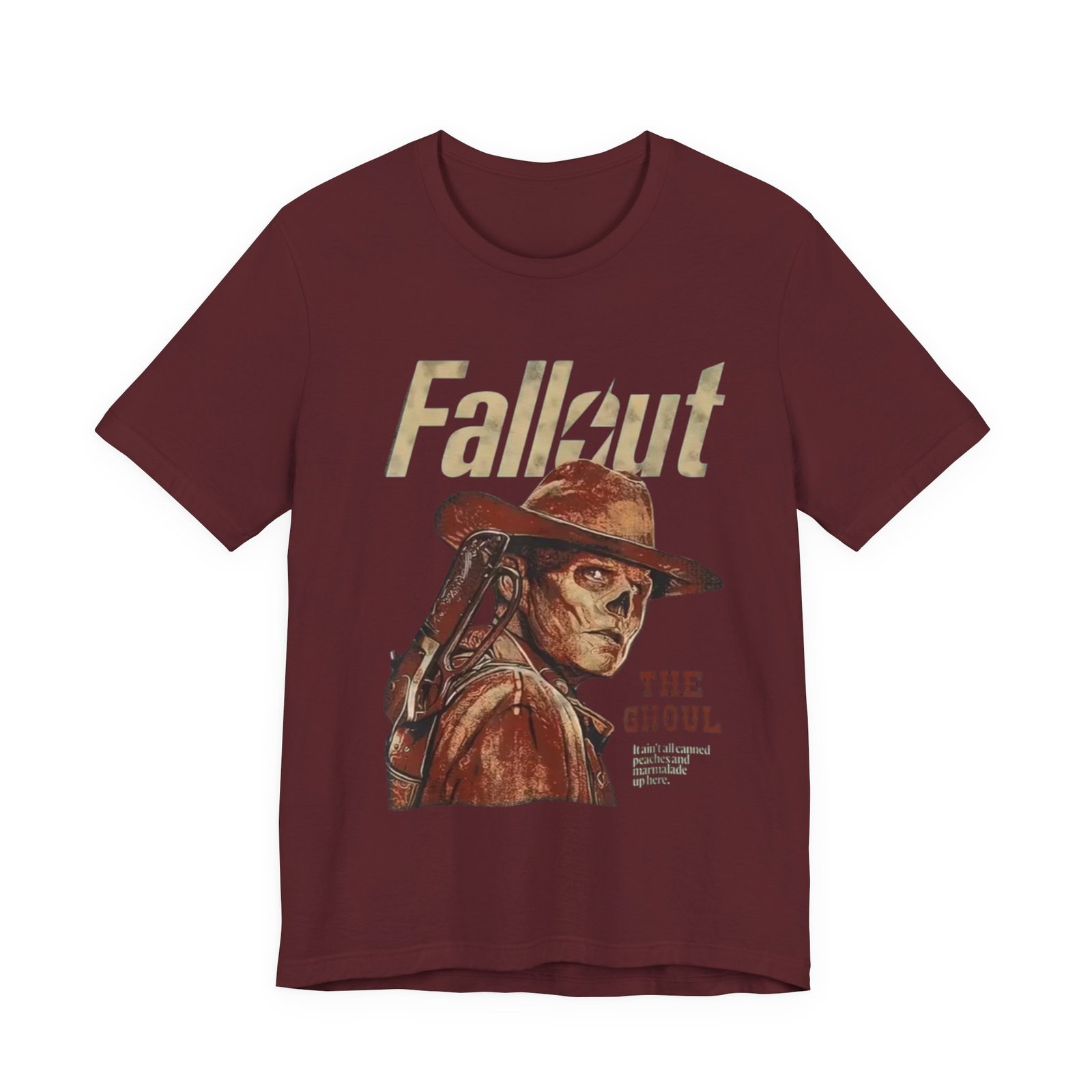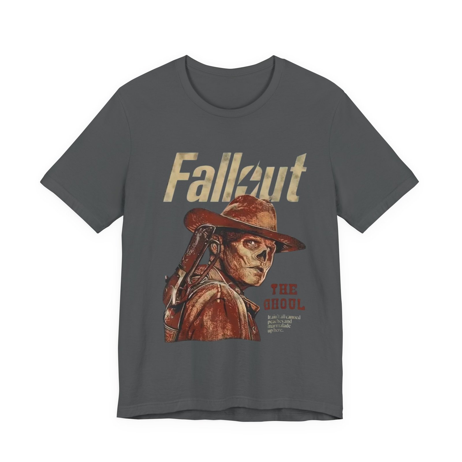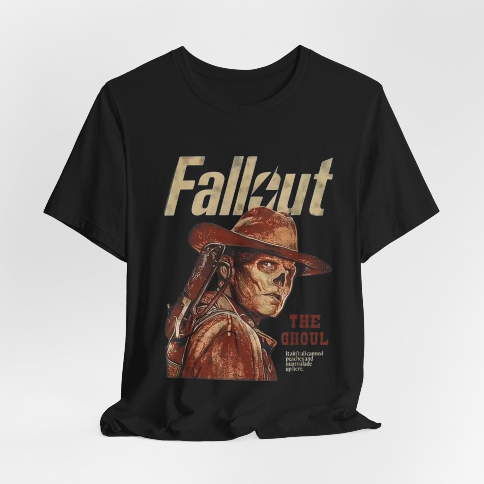 This soft, breathable tee wears like a lived-in favorite. The muted, dusty canvas color and vintage-style illustration of a lone ghoul in a wide-brim hat evoke long highway drives through sun-bleached deserts and slow evenings at retro arcades. Lightweight Airlume combed cotton makes it easy to layer under a jacket or wear on its own while the retail crew neck keeps the silhouette tidy and simple. It settles into weekend routines — late-night game sessions, meetups with fellow fans, or quiet moments of collecting art books — and reads as a subtle nod to anyone who loves post-apocalyptic worlds without shouting for attention. The design’s distressed print and earth-toned palette pair naturally with worn denim, cargo pants, or a faded flannel for that thoughtful, off-duty look.