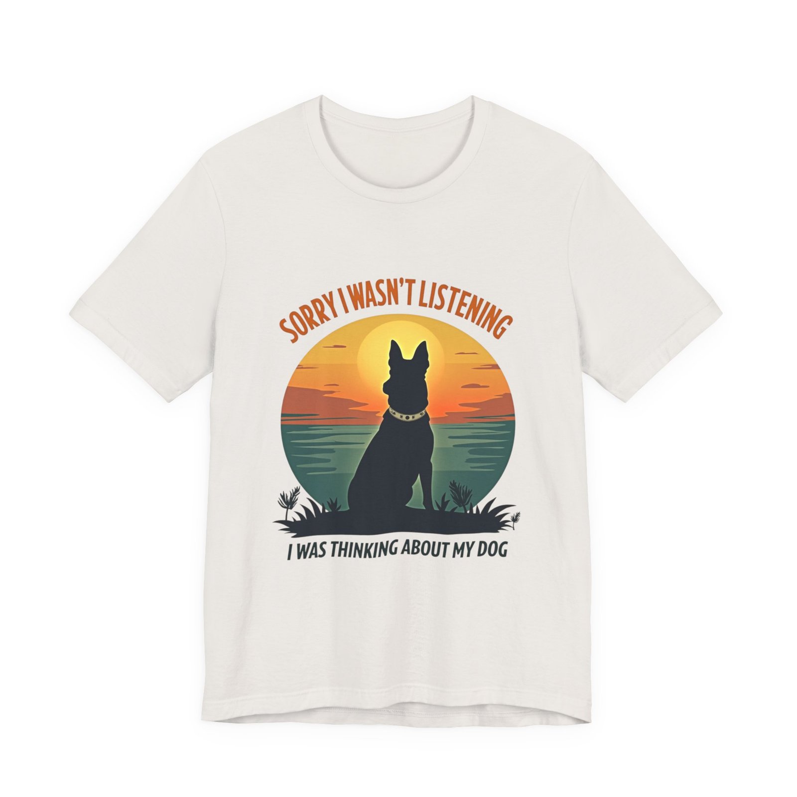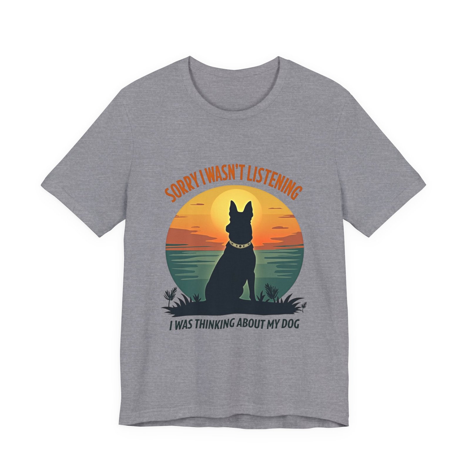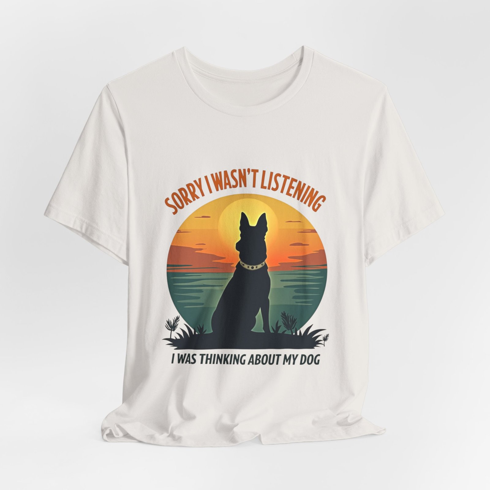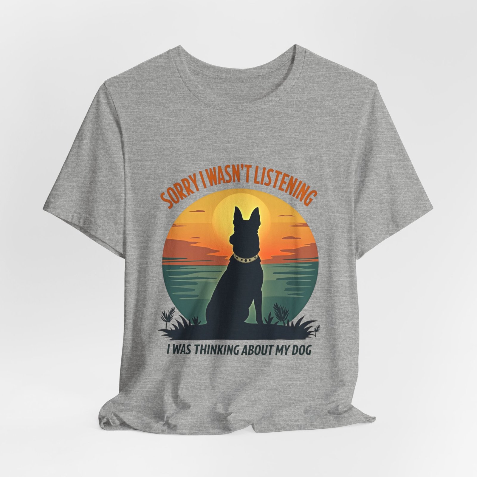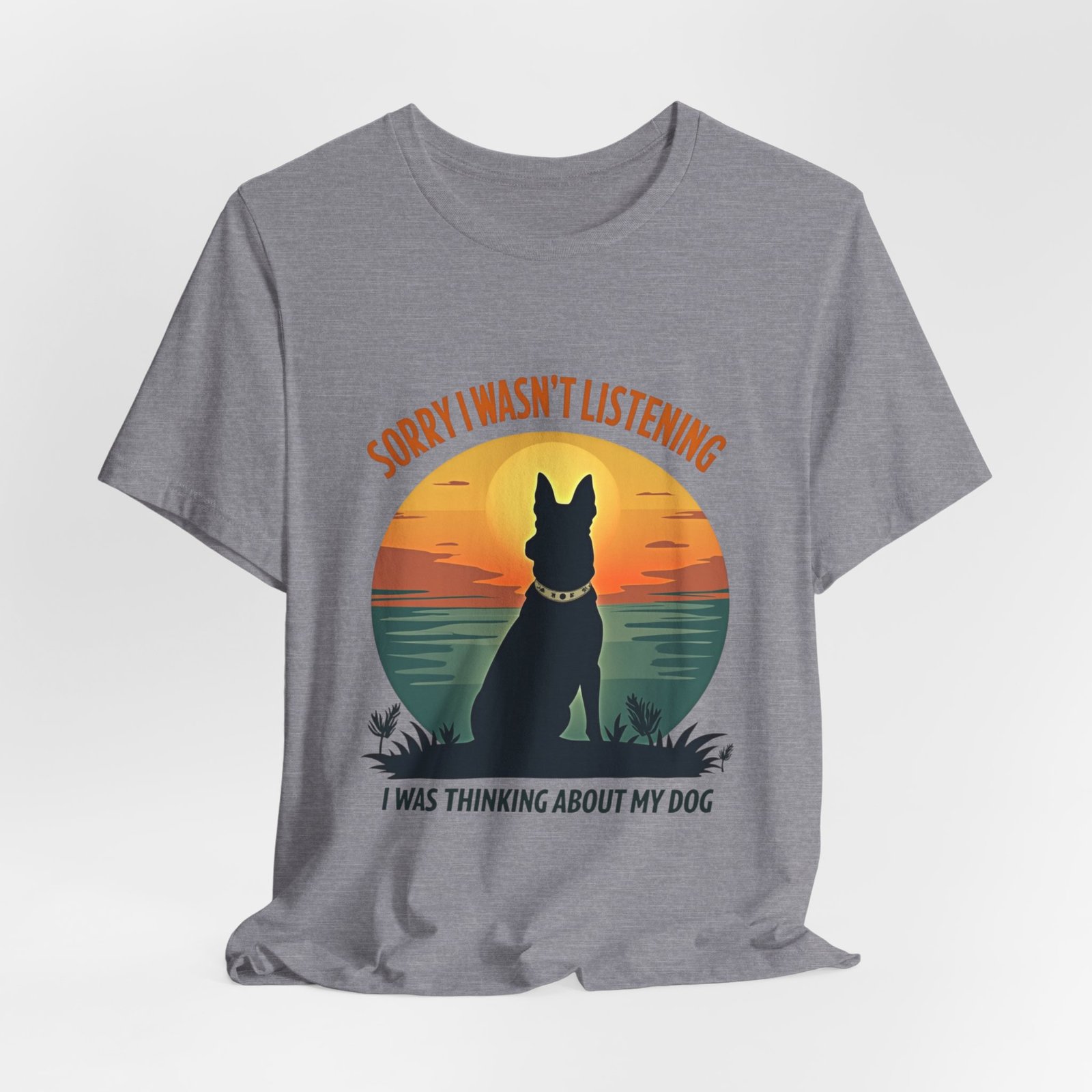A funny dog T-shirt with the phrase “Sorry I wasn’t listening, I was thinking about my dog”. This T-shirt gives off a laid-back and humorous vibe, perfect for dog lovers to wear casually or as loungewear. Ideal for dog owners, pet lovers, and those who enjoy witty and playful designs. Relevant for dog-related holidays and occasions.
