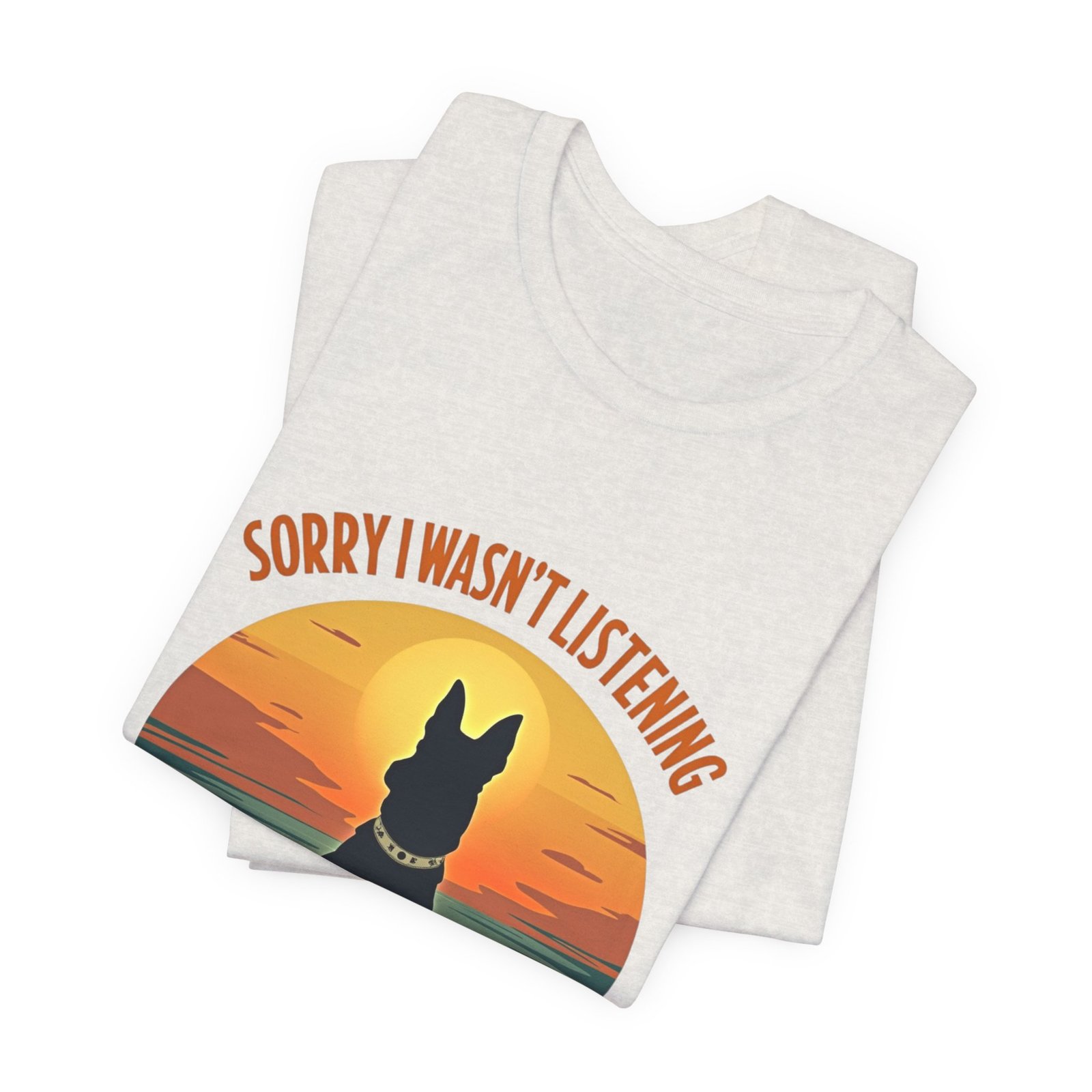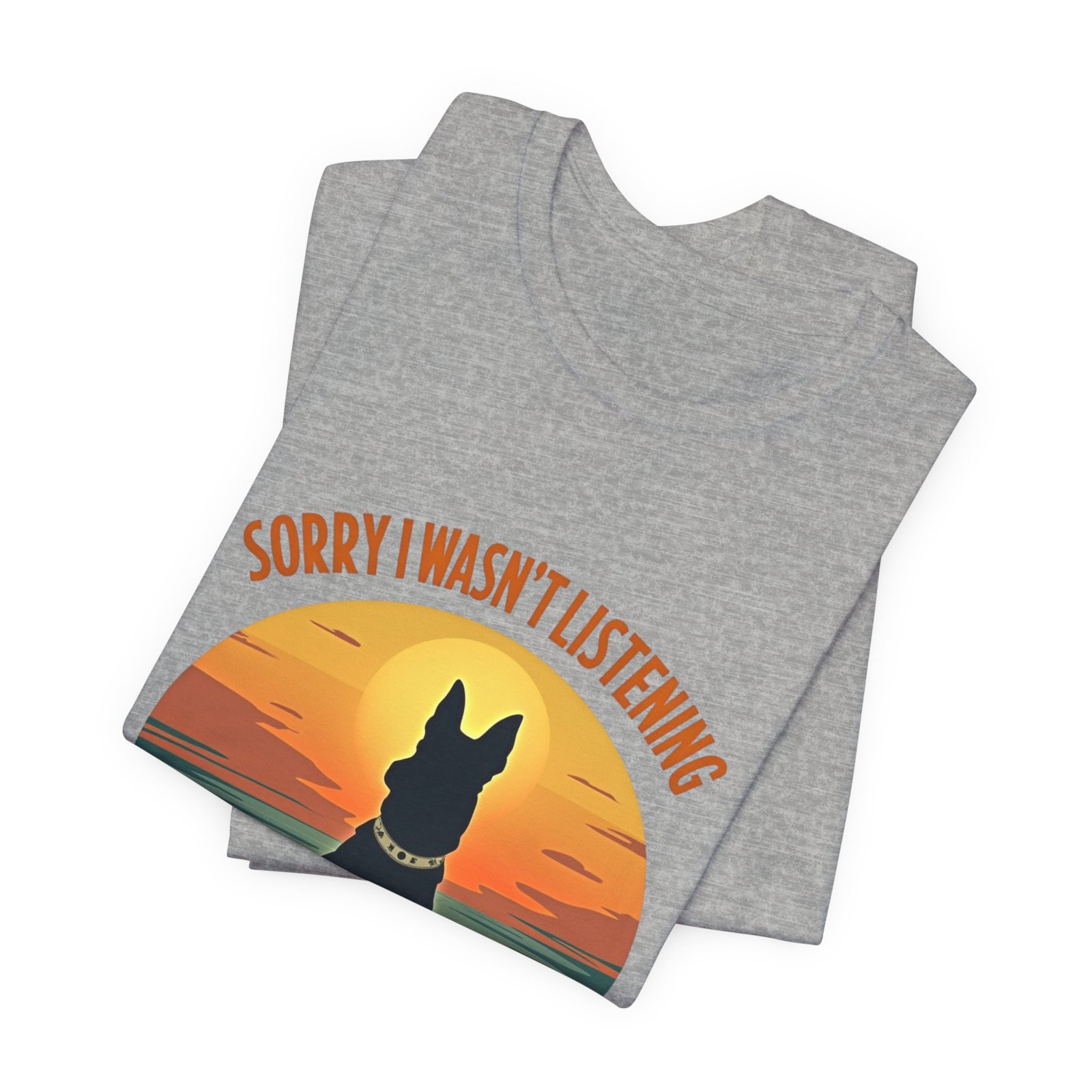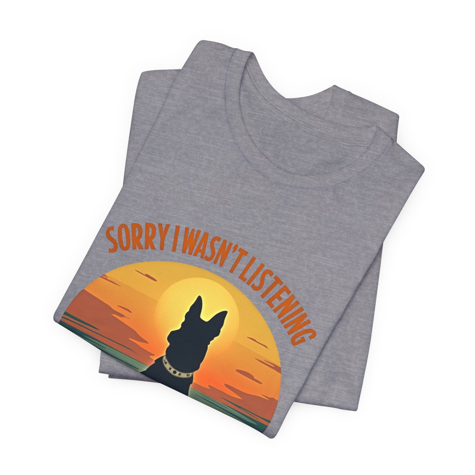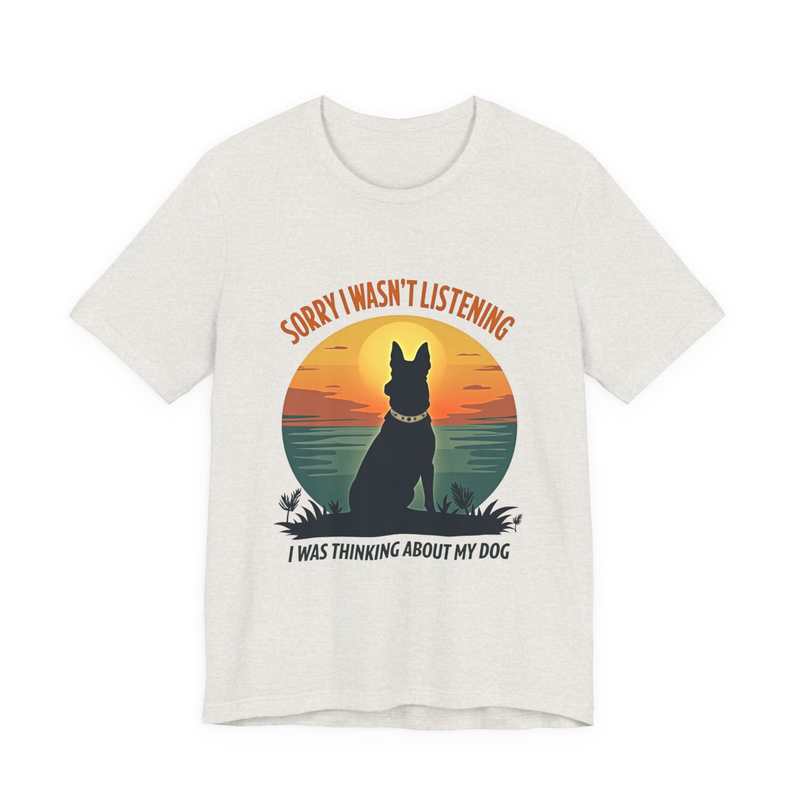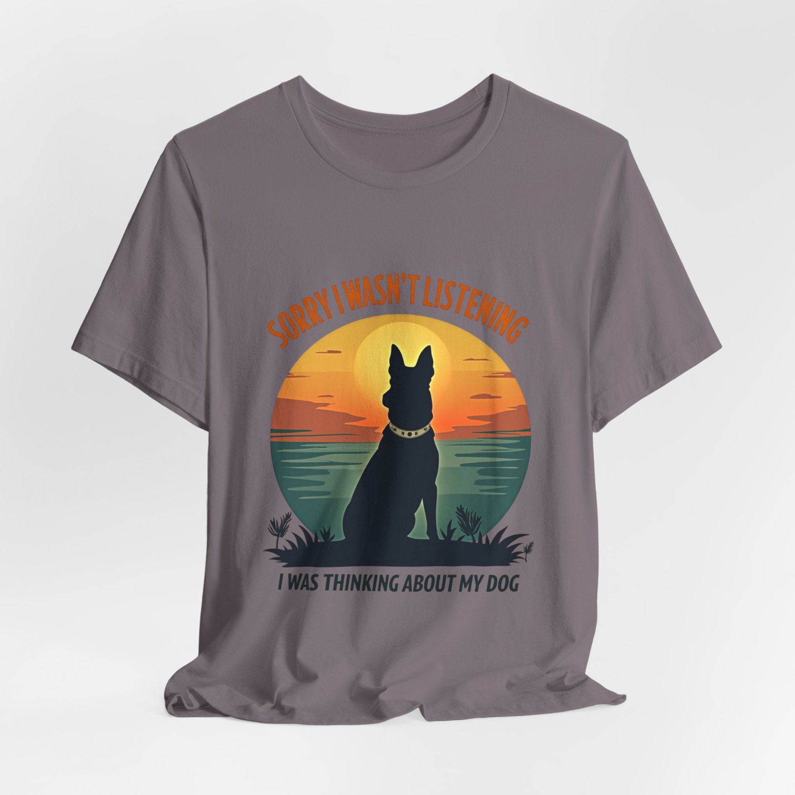 A funny dog T-shirt with the phrase “Sorry I wasn’t listening, I was thinking about my dog”. This T-shirt gives off a laid-back and humorous vibe, perfect for dog lovers to wear casually or as loungewear. Ideal for dog owners, pet lovers, and those who enjoy witty and playful designs. Relevant for dog-related holidays and occasions.