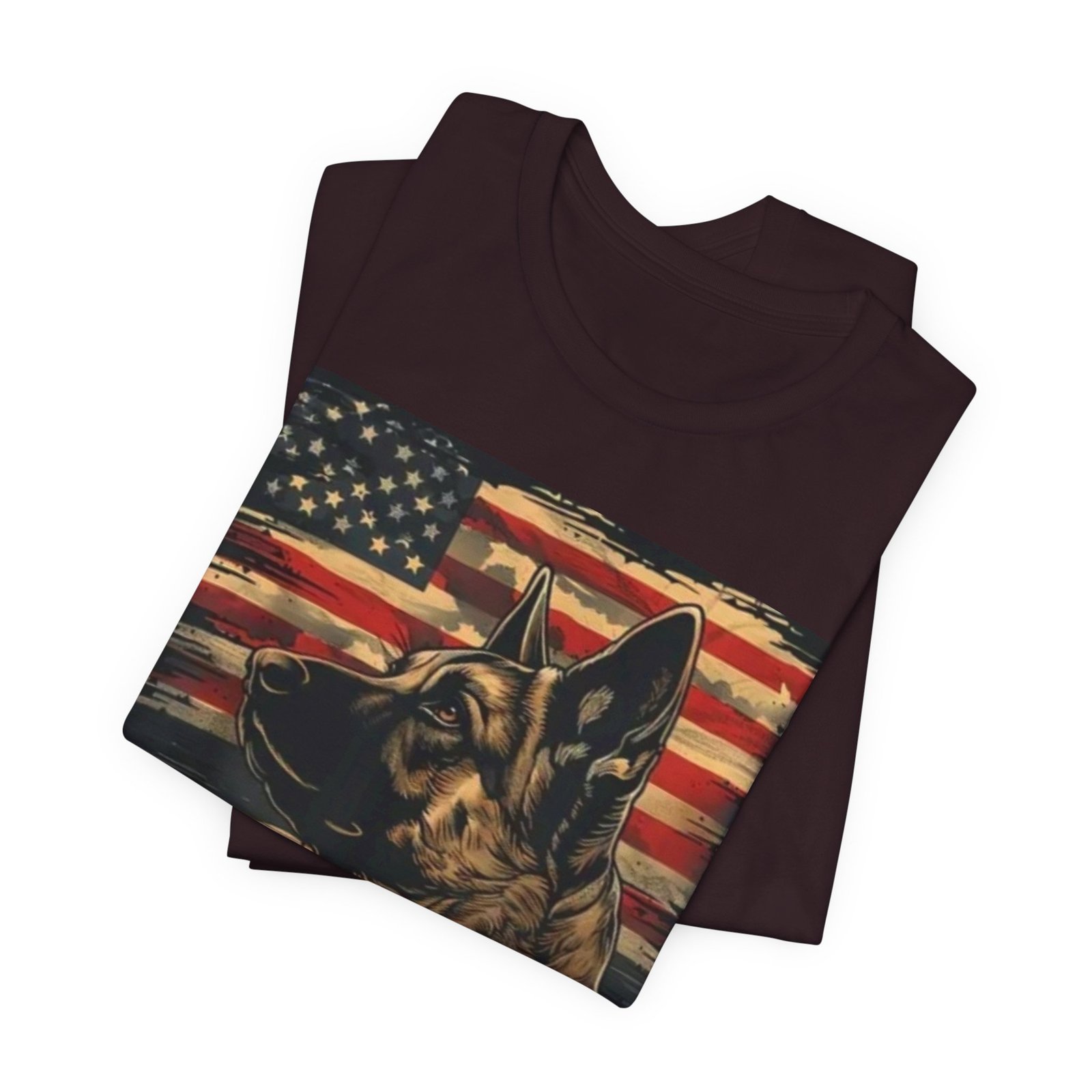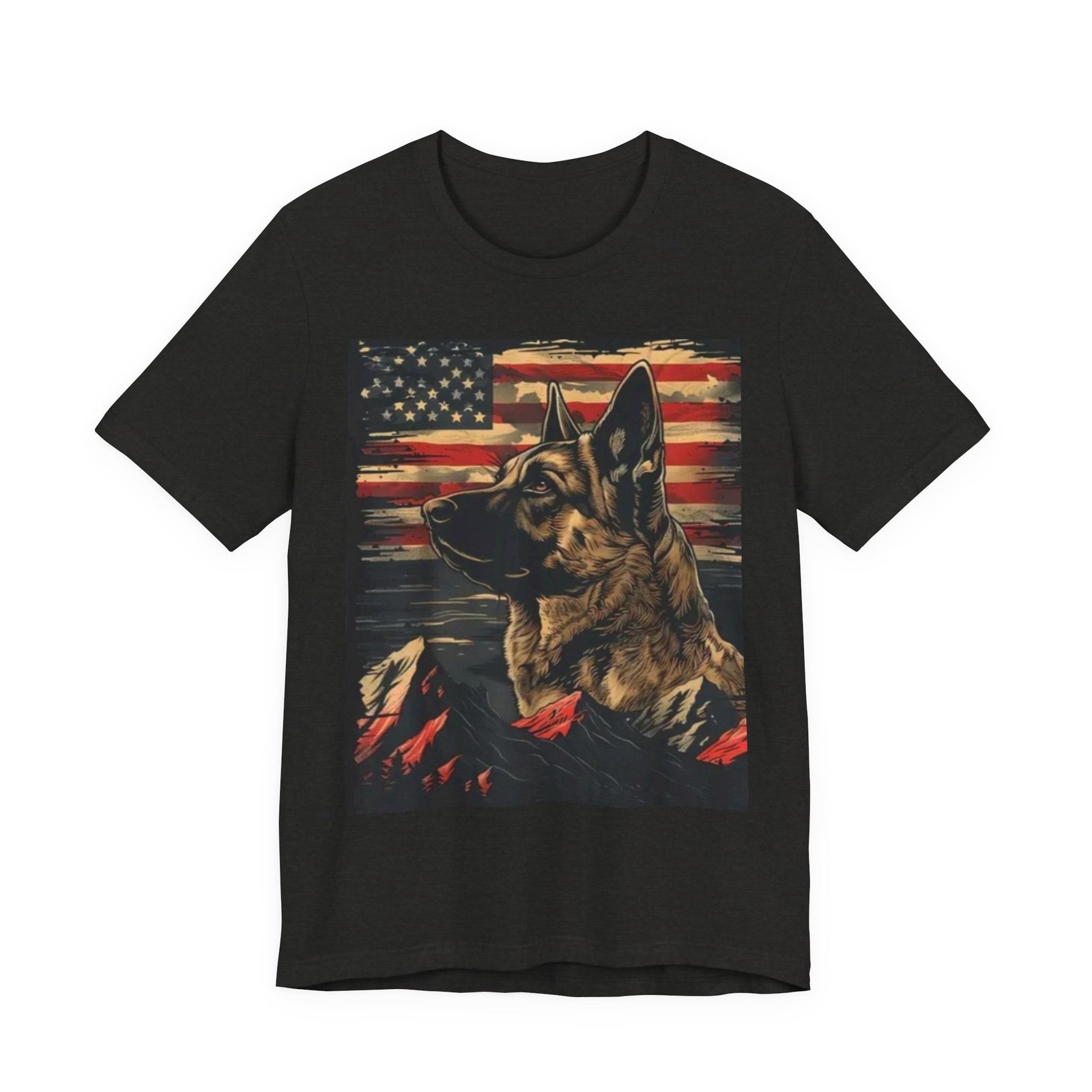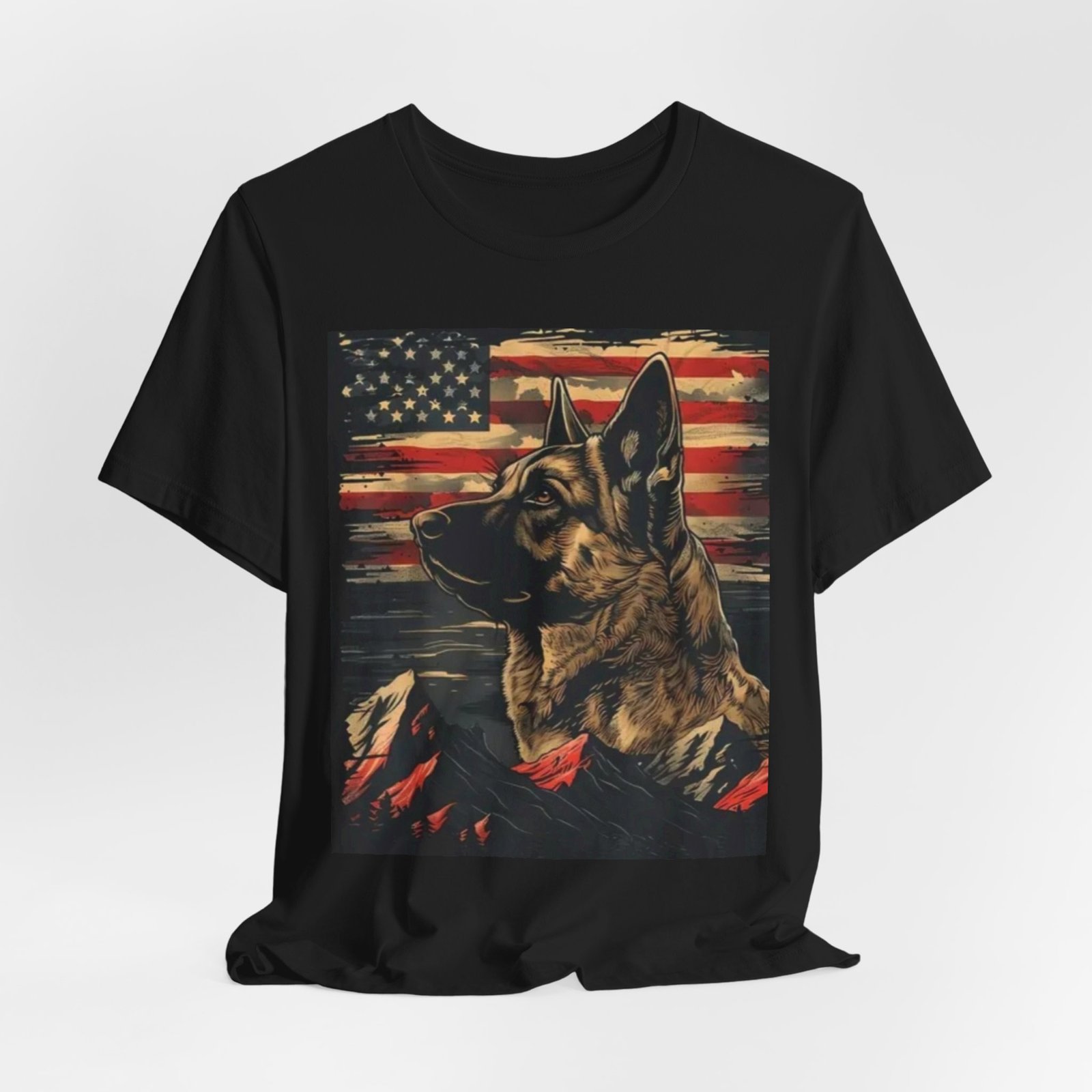 This soft, breathable tee pairs Americana grit with canine loyalty: a bold German Shepherd portrait set against a weathered US flag and rugged mountain peaks. The black background lets the vintage-inspired reds and muted neutrals pop, creating a look that’s both rugged and reverent. Wear it on hikes, at casual meetups, or when you want to quietly honor service dogs and outdoor life. The lightweight, retail-fit silhouette layers easily under jackets or stands on its own for everyday wear — comfortable, low-fuss, and built to keep its shape through regular use.
