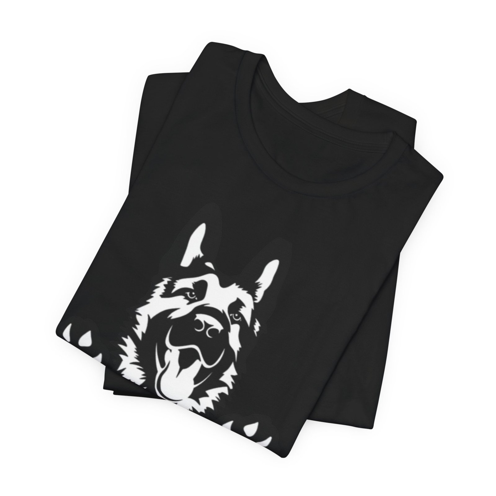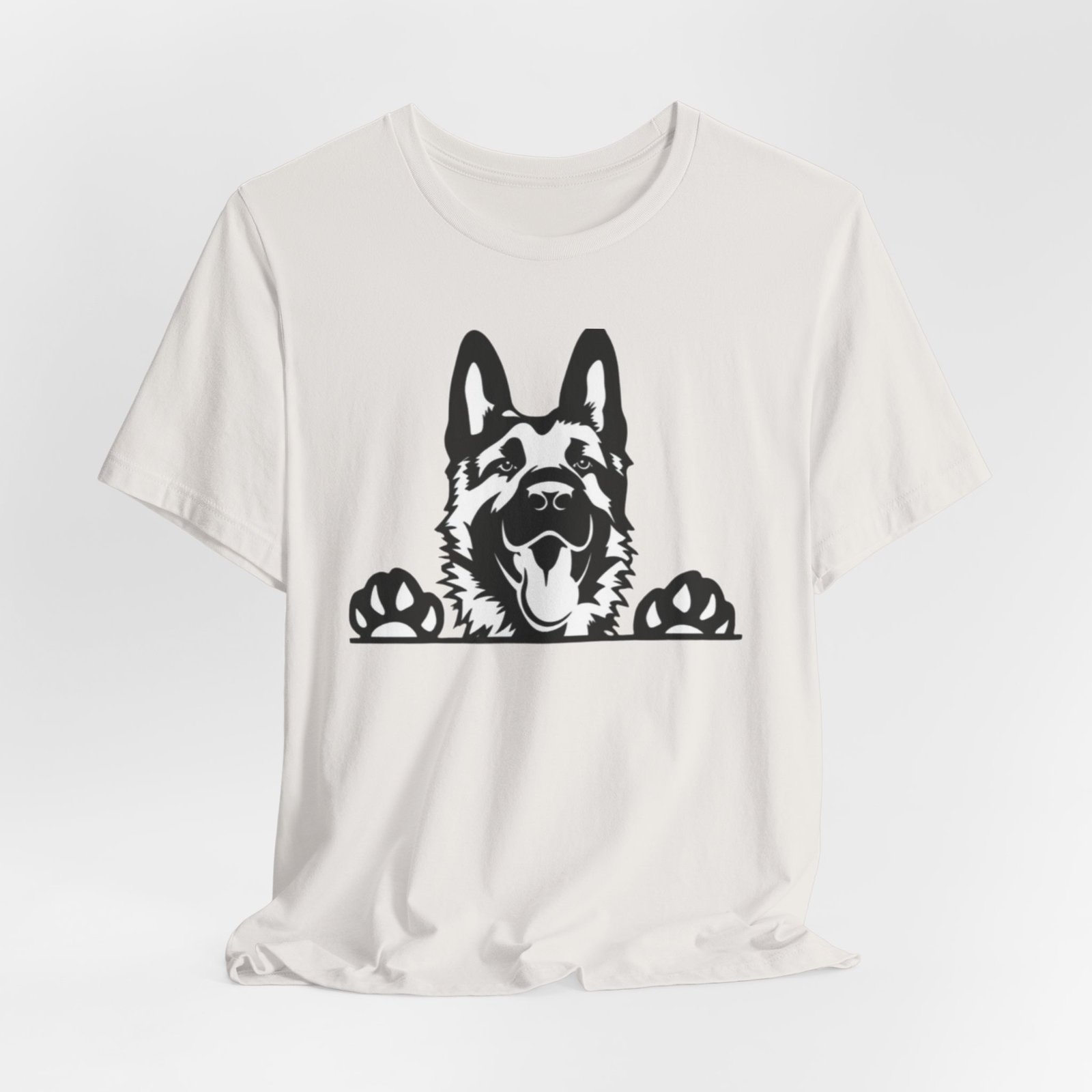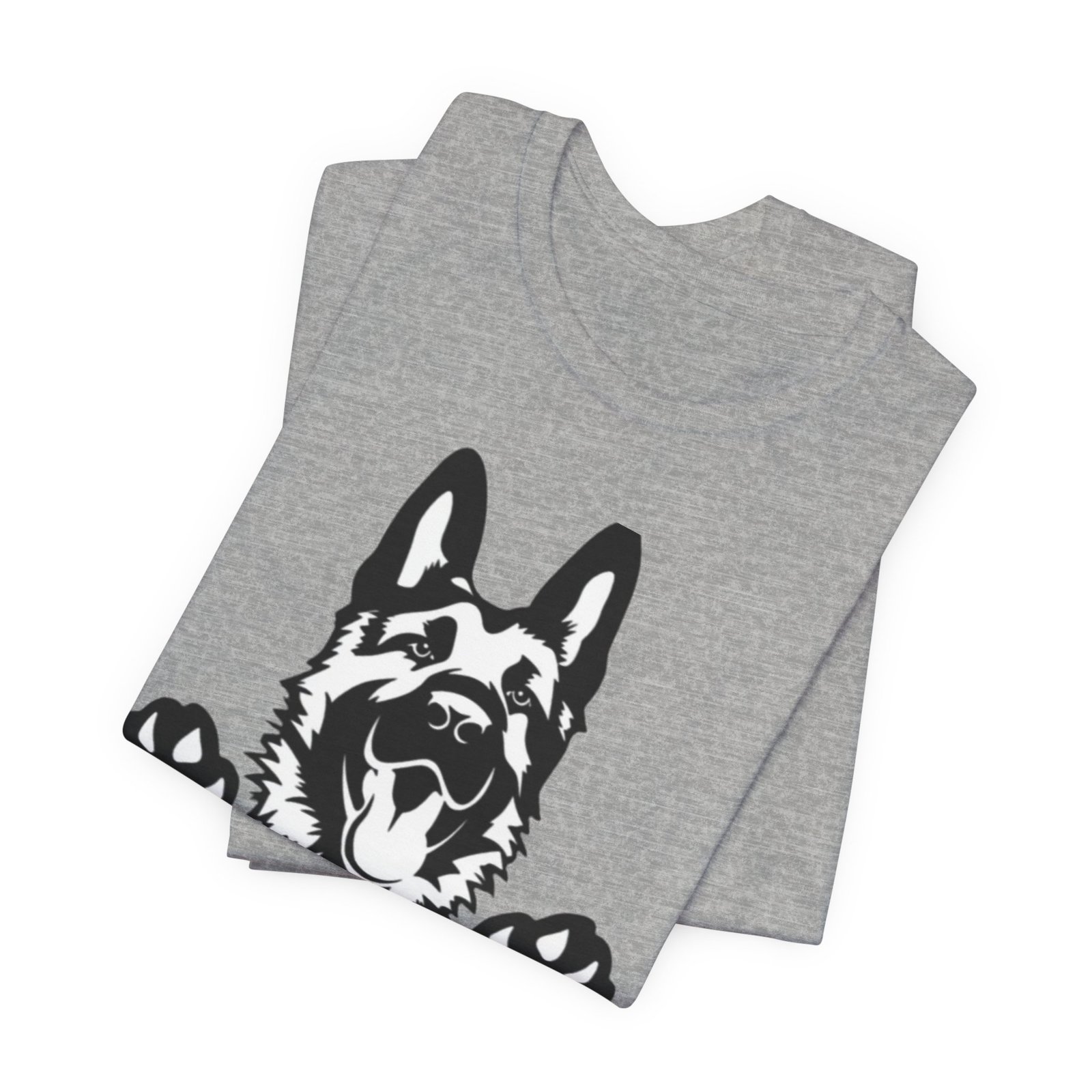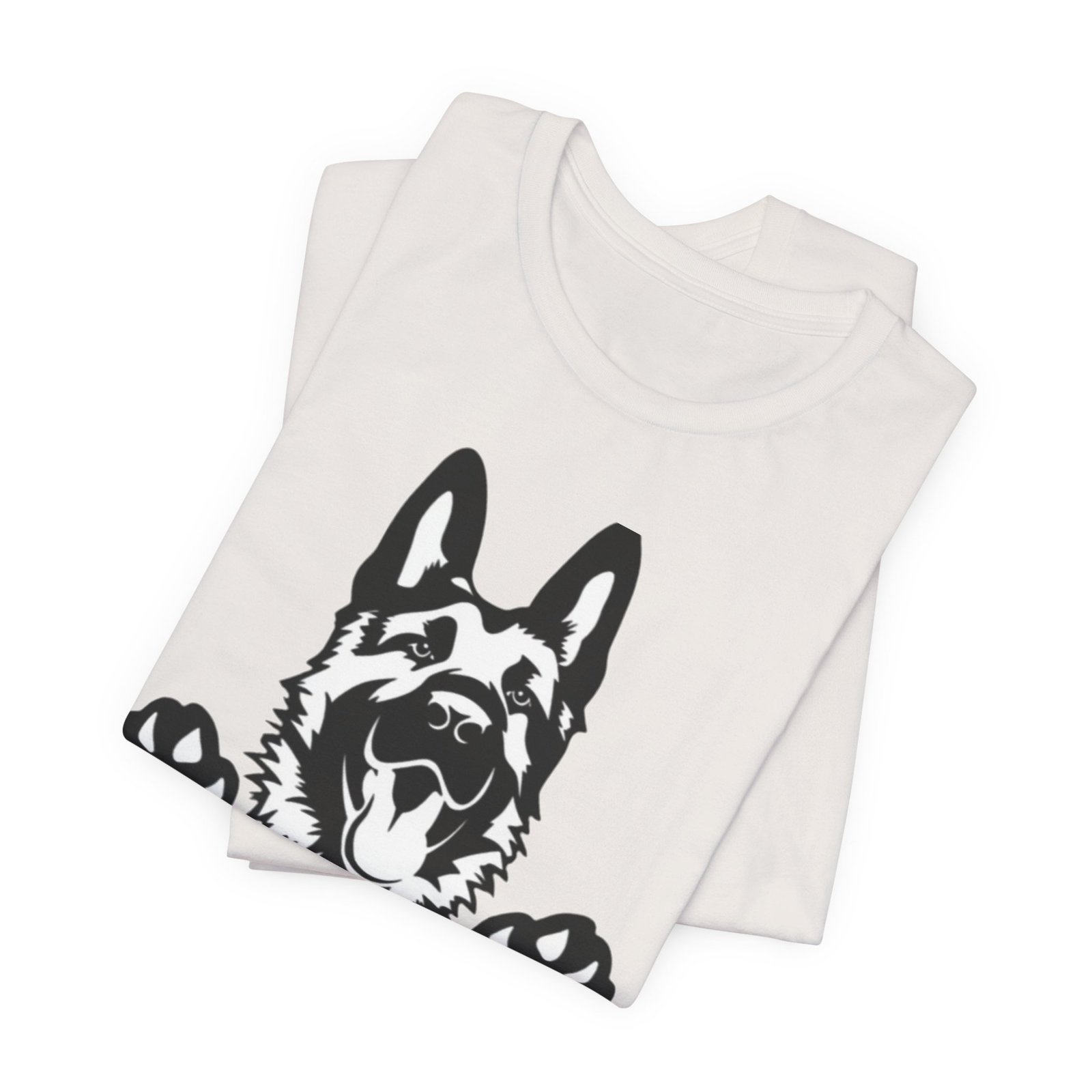 Soft, breathable, and responsibly made — this tee carries a bold, joyful silhouette of a German Shepherd peeking over paw prints. Wear it on dog-walk mornings, at training class, or when you want to broadcast that unmistakable canine energy without saying a word. The lightweight Airlume cotton feels cool against the skin and layers easily under jackets for crisp, casual looks. Subtle construction details — side seams, ribbed collar, shoulder tape, and a tear-away label — keep the fit stable and comfortable through repeated wear. REACH-certified and produced with ethical manufacturing standards, this shirt is built to move with you and celebrate the bond you share with your dog.