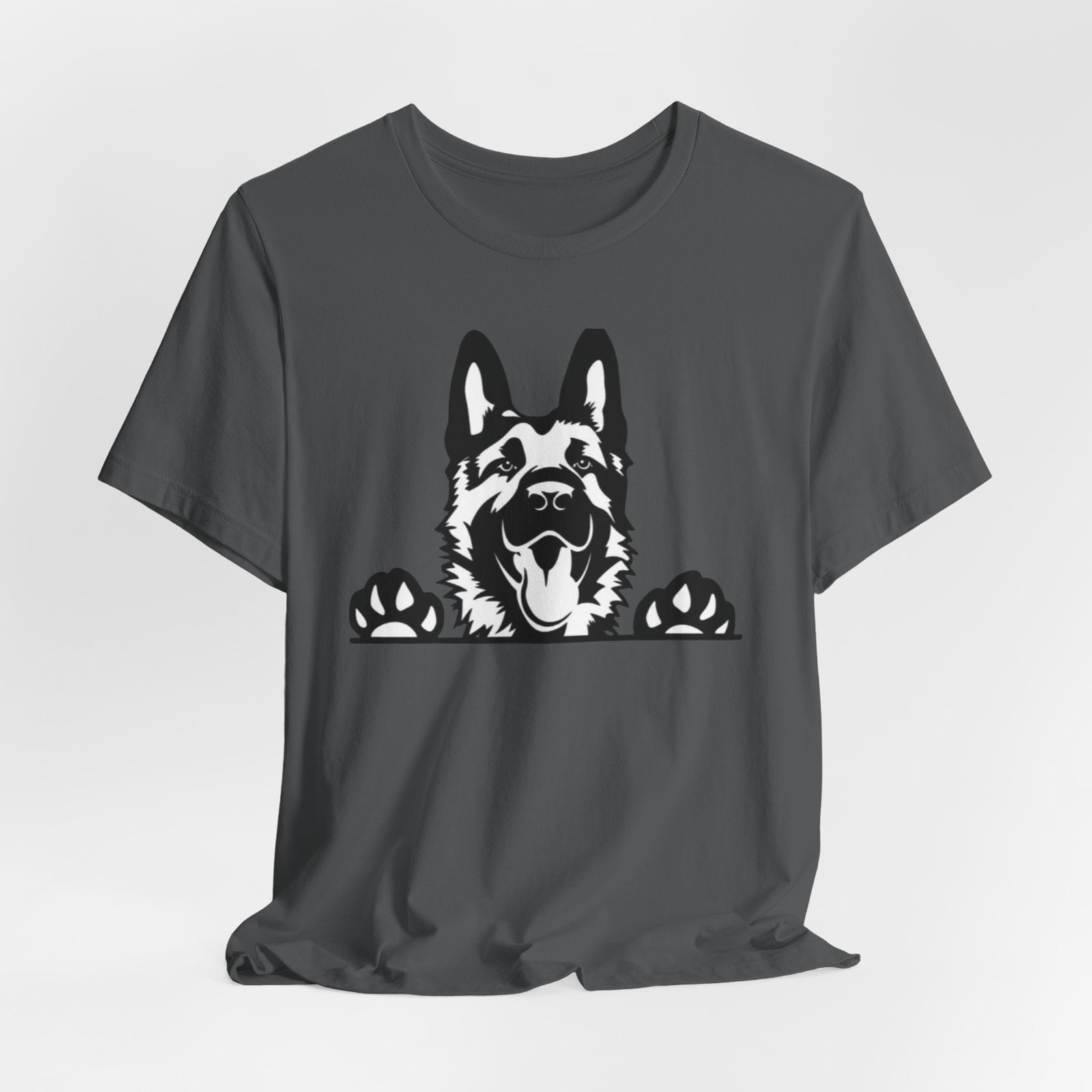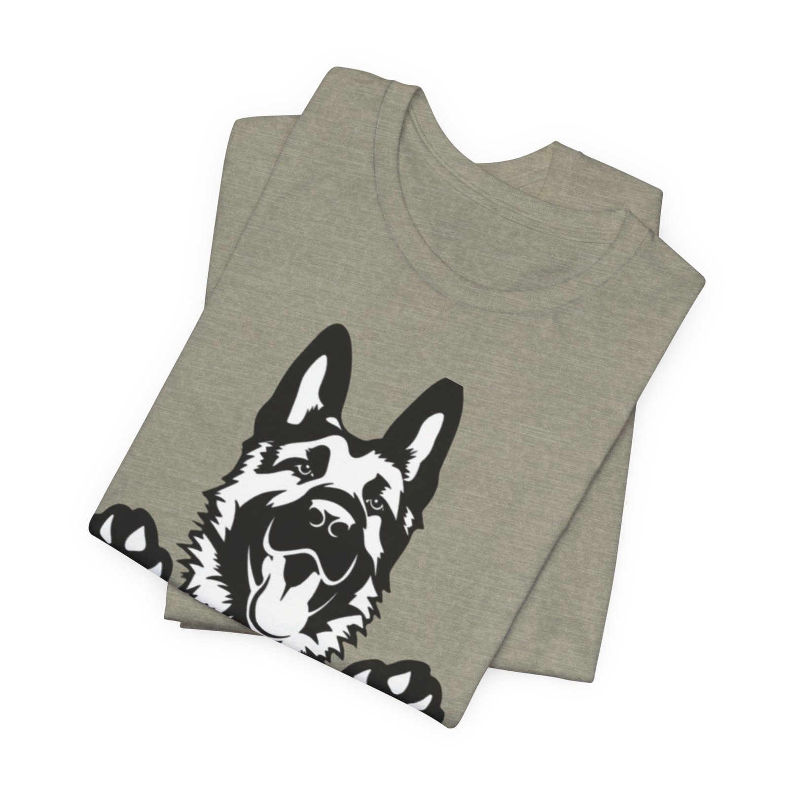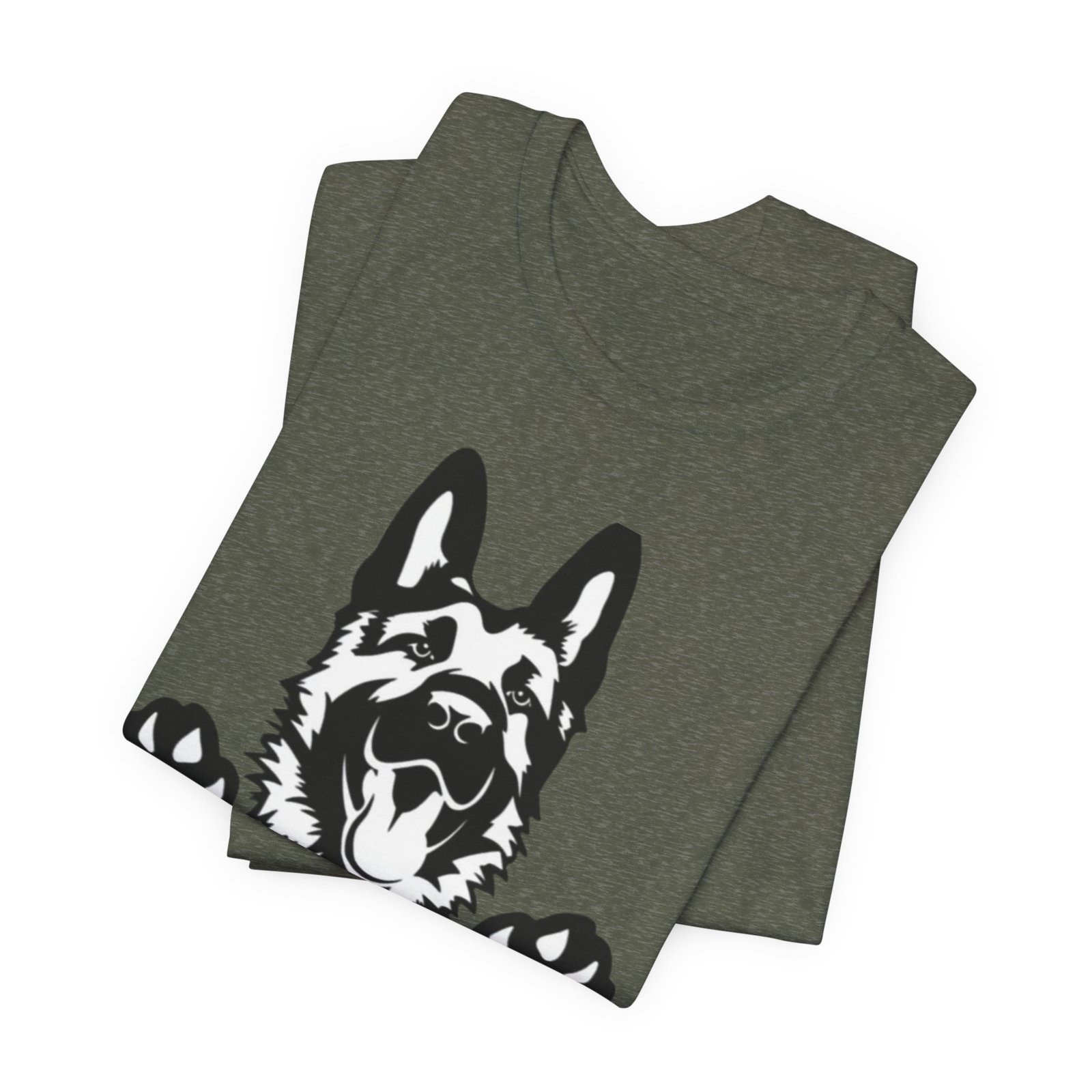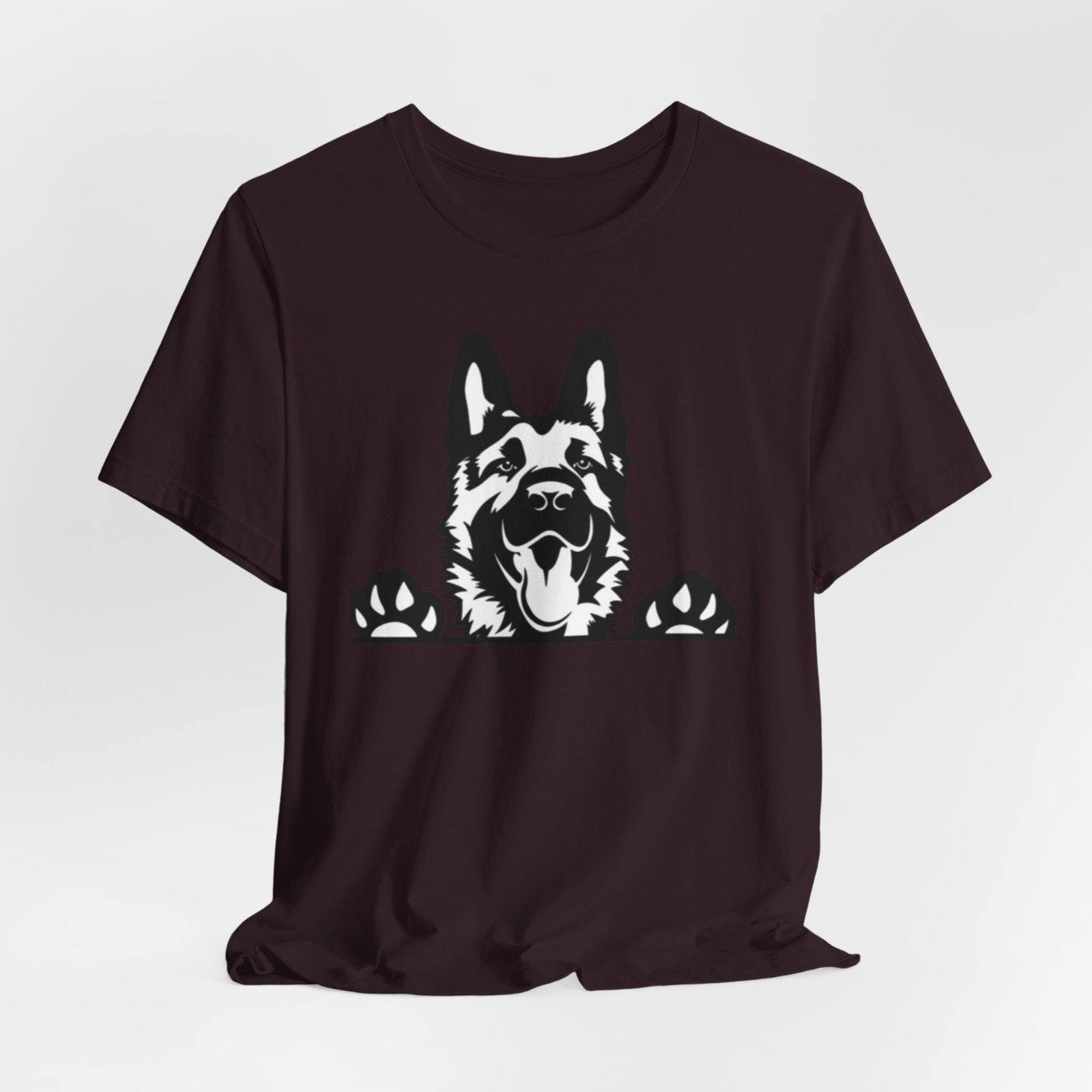 Soft, breathable, and responsibly made — this tee carries a bold, joyful silhouette of a German Shepherd peeking over paw prints. Wear it on dog-walk mornings, at training class, or when you want to broadcast that unmistakable canine energy without saying a word. The lightweight Airlume cotton feels cool against the skin and layers easily under jackets for crisp, casual looks. Subtle construction details — side seams, ribbed collar, shoulder tape, and a tear-away label — keep the fit stable and comfortable through repeated wear. REACH-certified and produced with ethical manufacturing standards, this shirt is built to move with you and celebrate the bond you share with your dog.