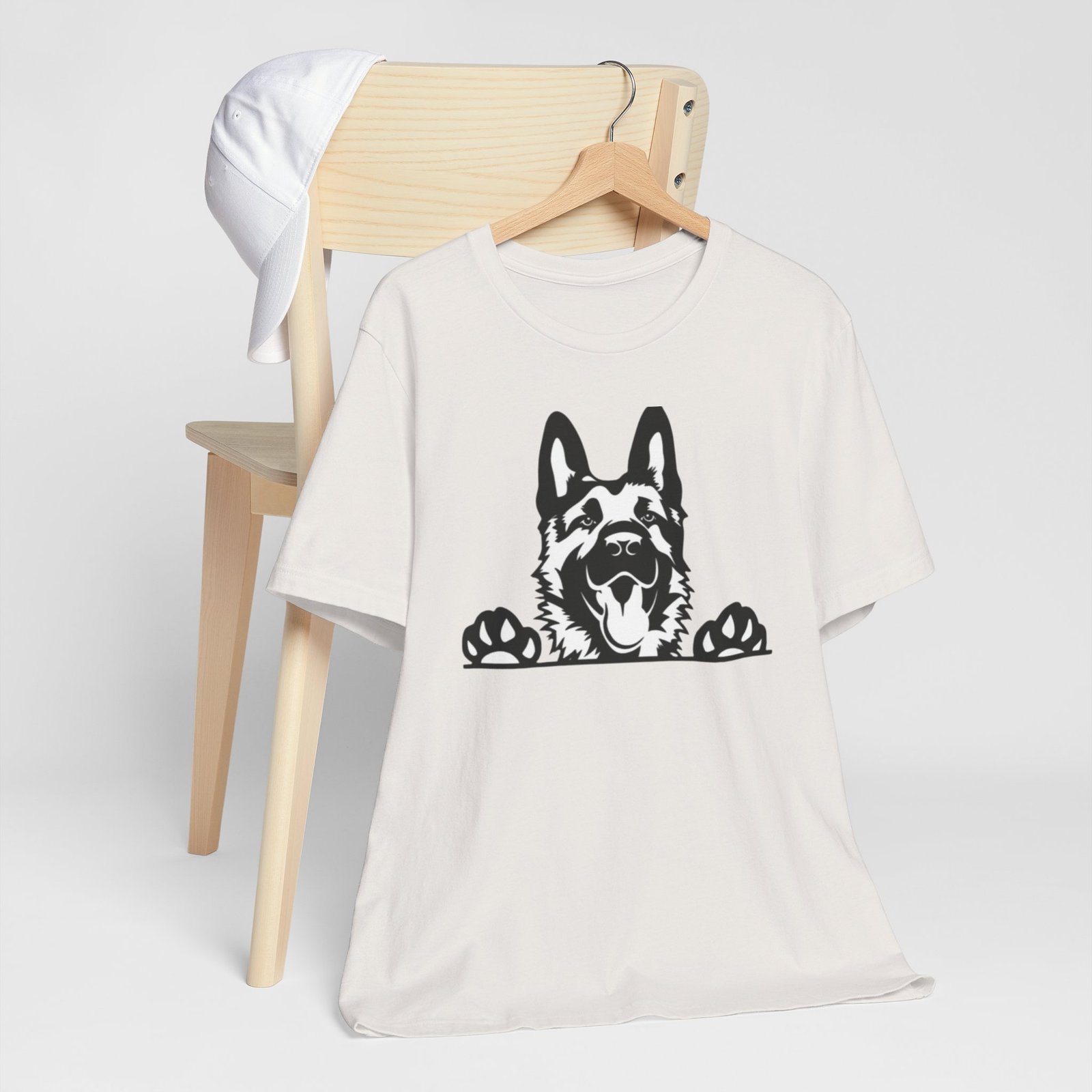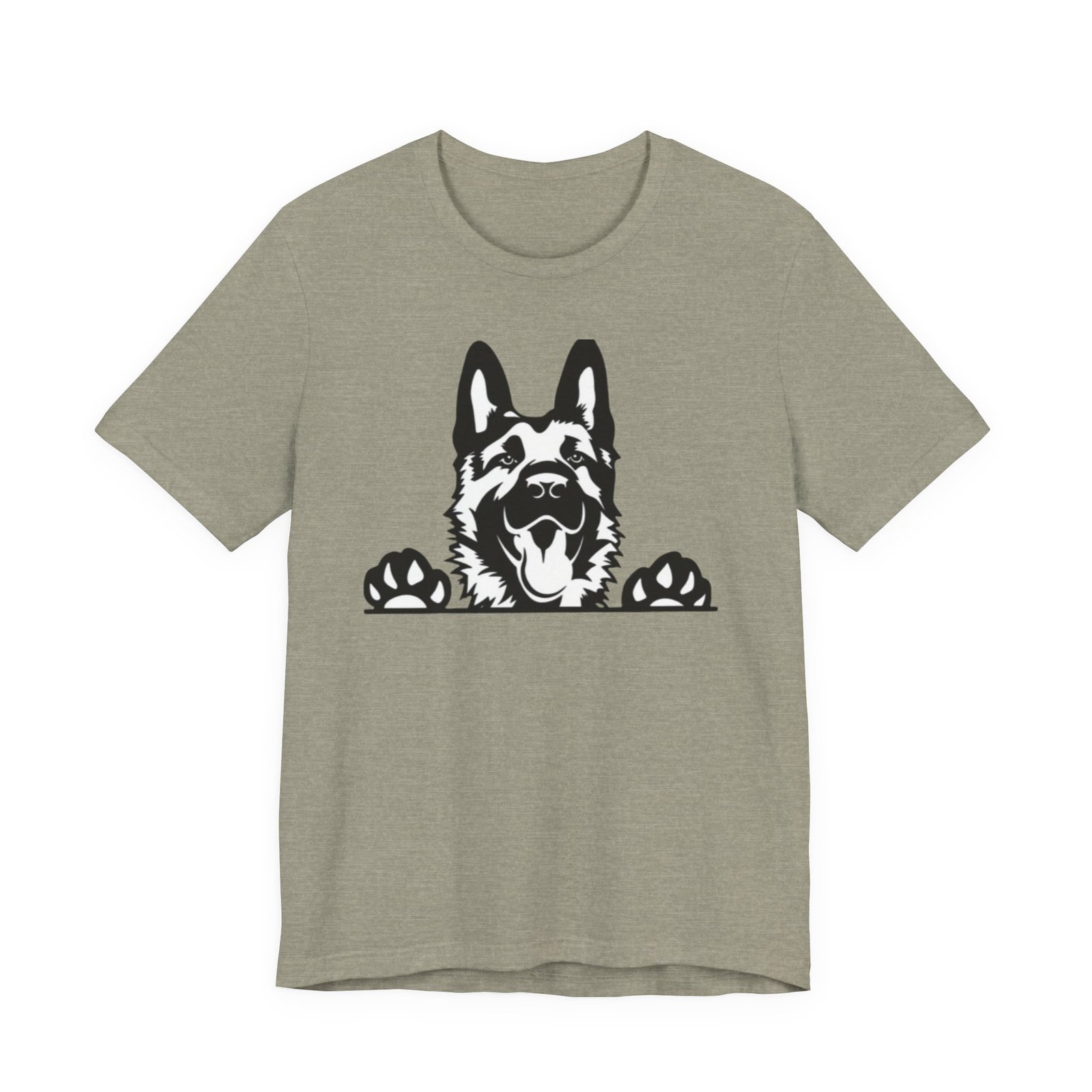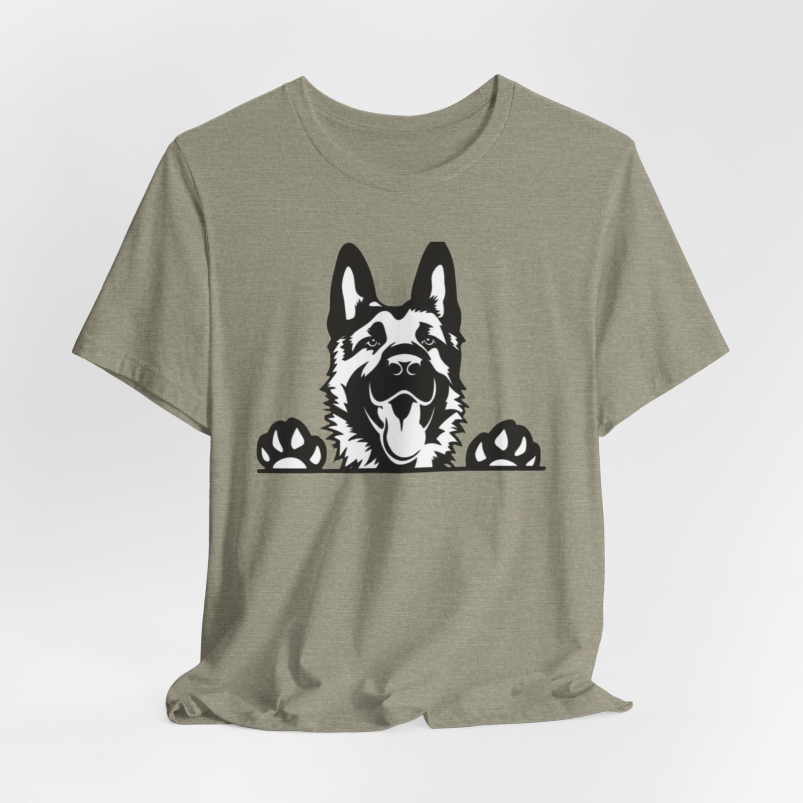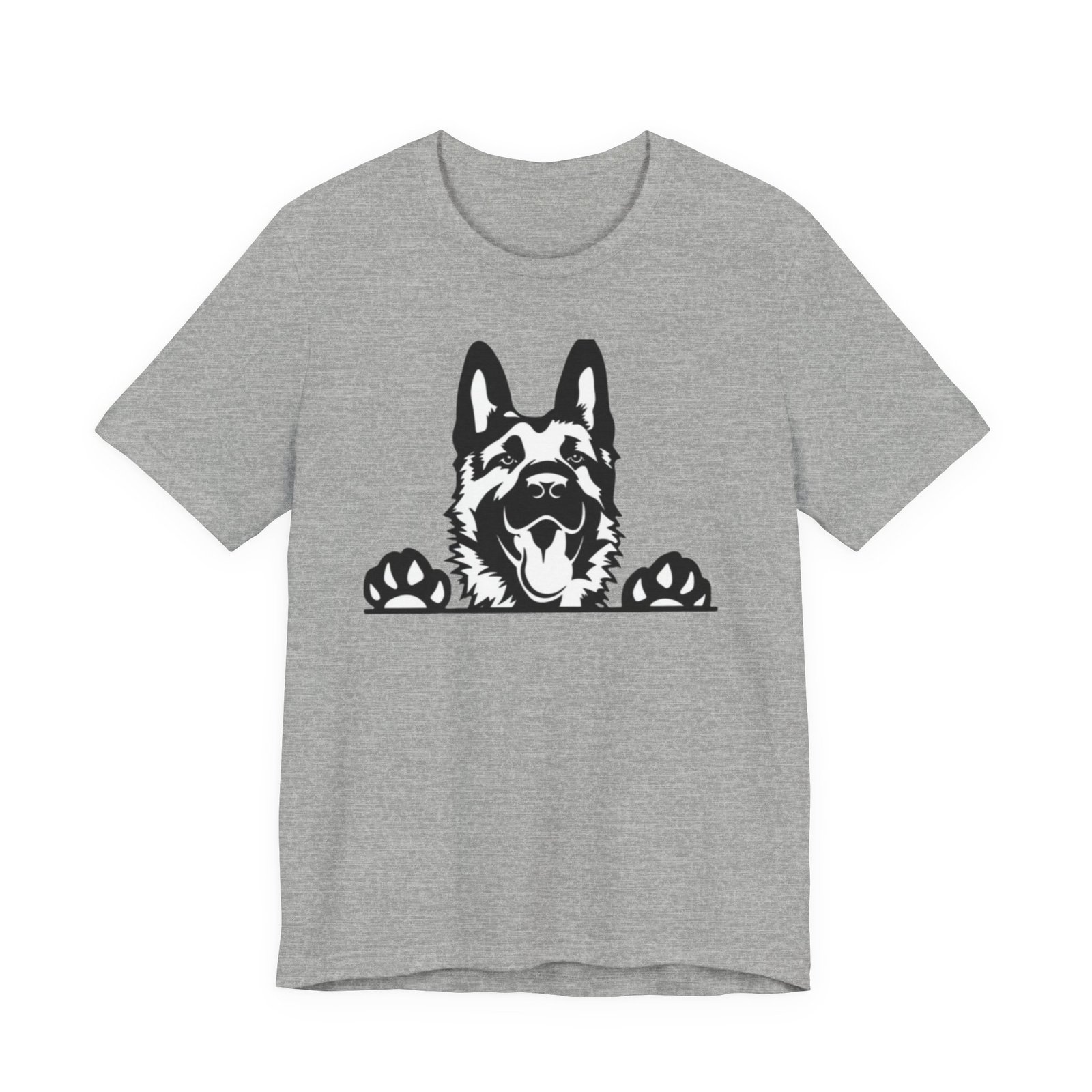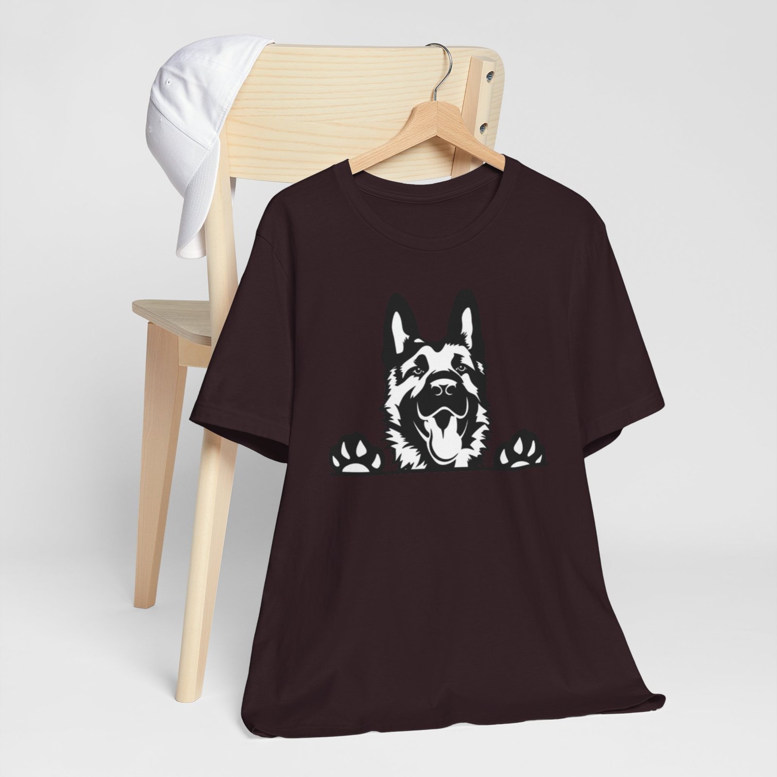 Soft, breathable, and responsibly made — this tee carries a bold, joyful silhouette of a German Shepherd peeking over paw prints. Wear it on dog-walk mornings, at training class, or when you want to broadcast that unmistakable canine energy without saying a word. The lightweight Airlume cotton feels cool against the skin and layers easily under jackets for crisp, casual looks. Subtle construction details — side seams, ribbed collar, shoulder tape, and a tear-away label — keep the fit stable and comfortable through repeated wear. REACH-certified and produced with ethical manufacturing standards, this shirt is built to move with you and celebrate the bond you share with your dog.