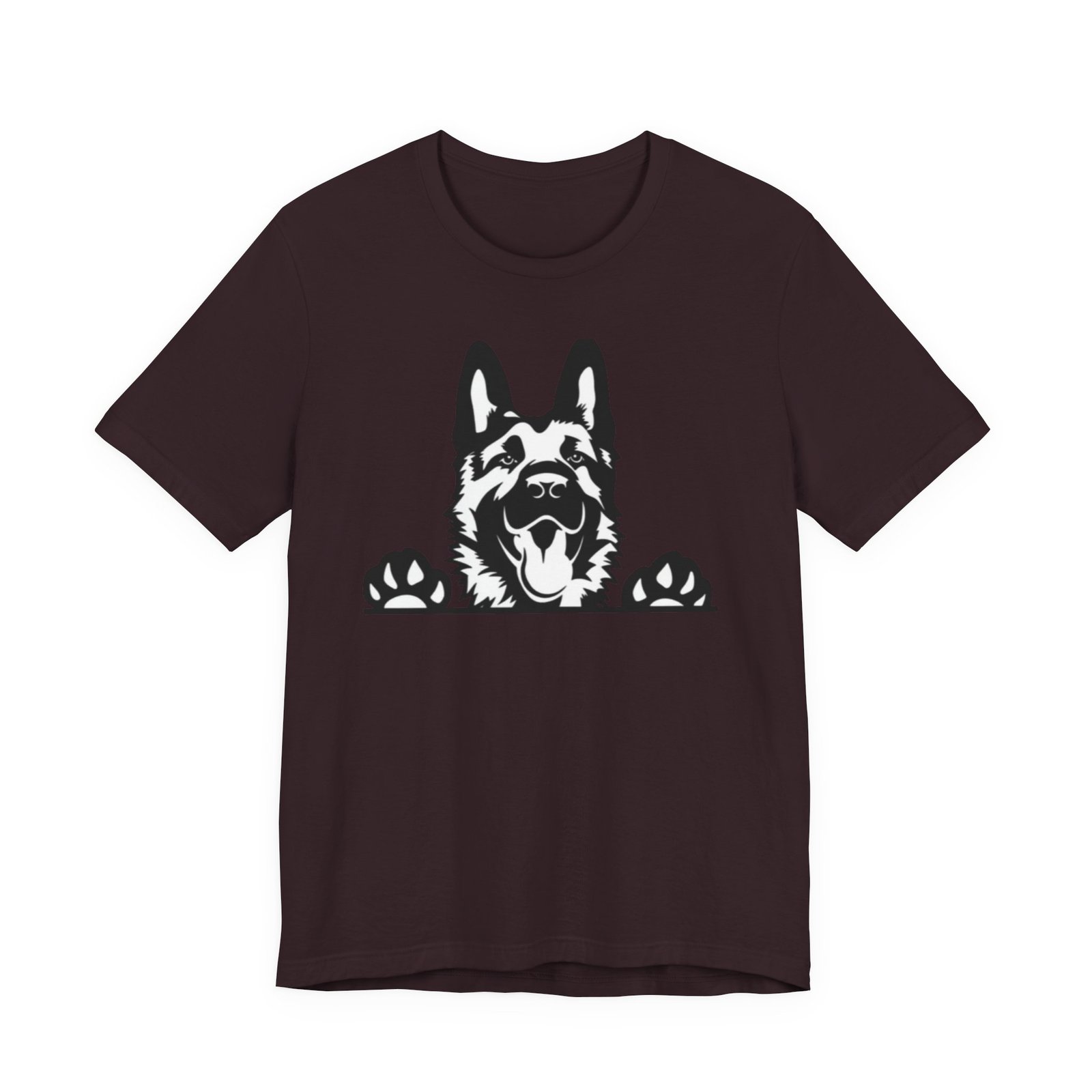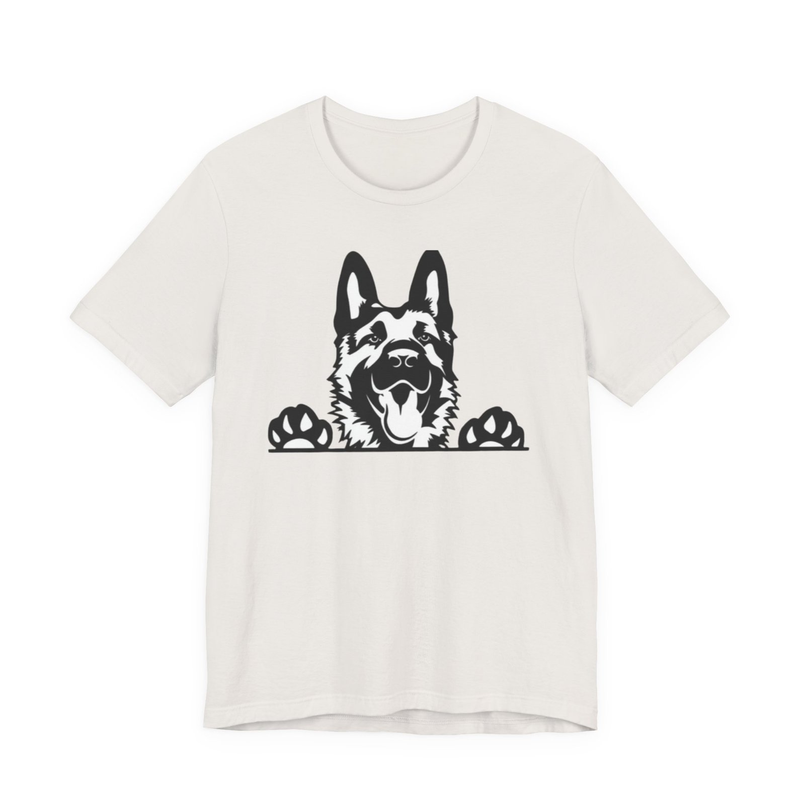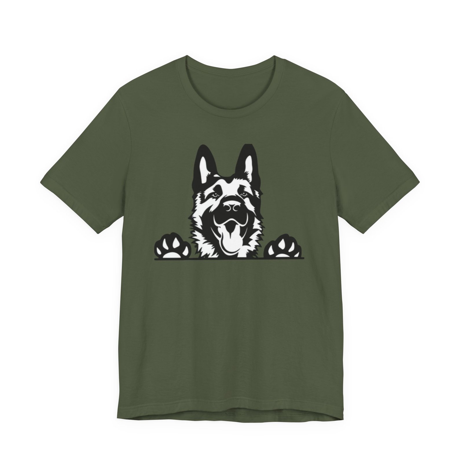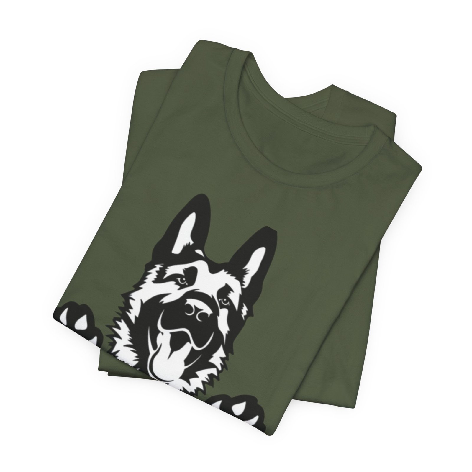 Soft, breathable, and responsibly made — this tee carries a bold, joyful silhouette of a German Shepherd peeking over paw prints. Wear it on dog-walk mornings, at training class, or when you want to broadcast that unmistakable canine energy without saying a word. The lightweight Airlume cotton feels cool against the skin and layers easily under jackets for crisp, casual looks. Subtle construction details — side seams, ribbed collar, shoulder tape, and a tear-away label — keep the fit stable and comfortable through repeated wear. REACH-certified and produced with ethical manufacturing standards, this shirt is built to move with you and celebrate the bond you share with your dog.