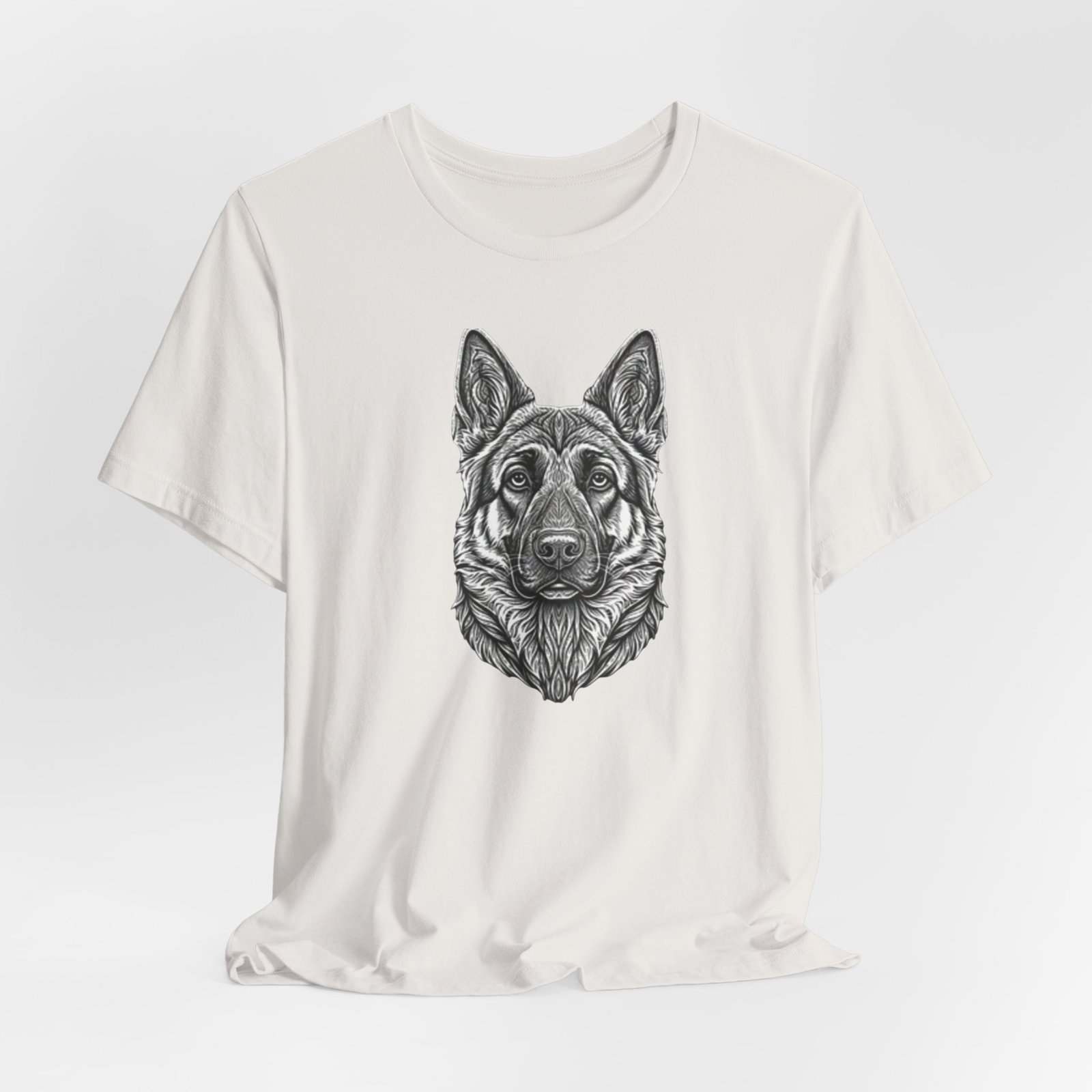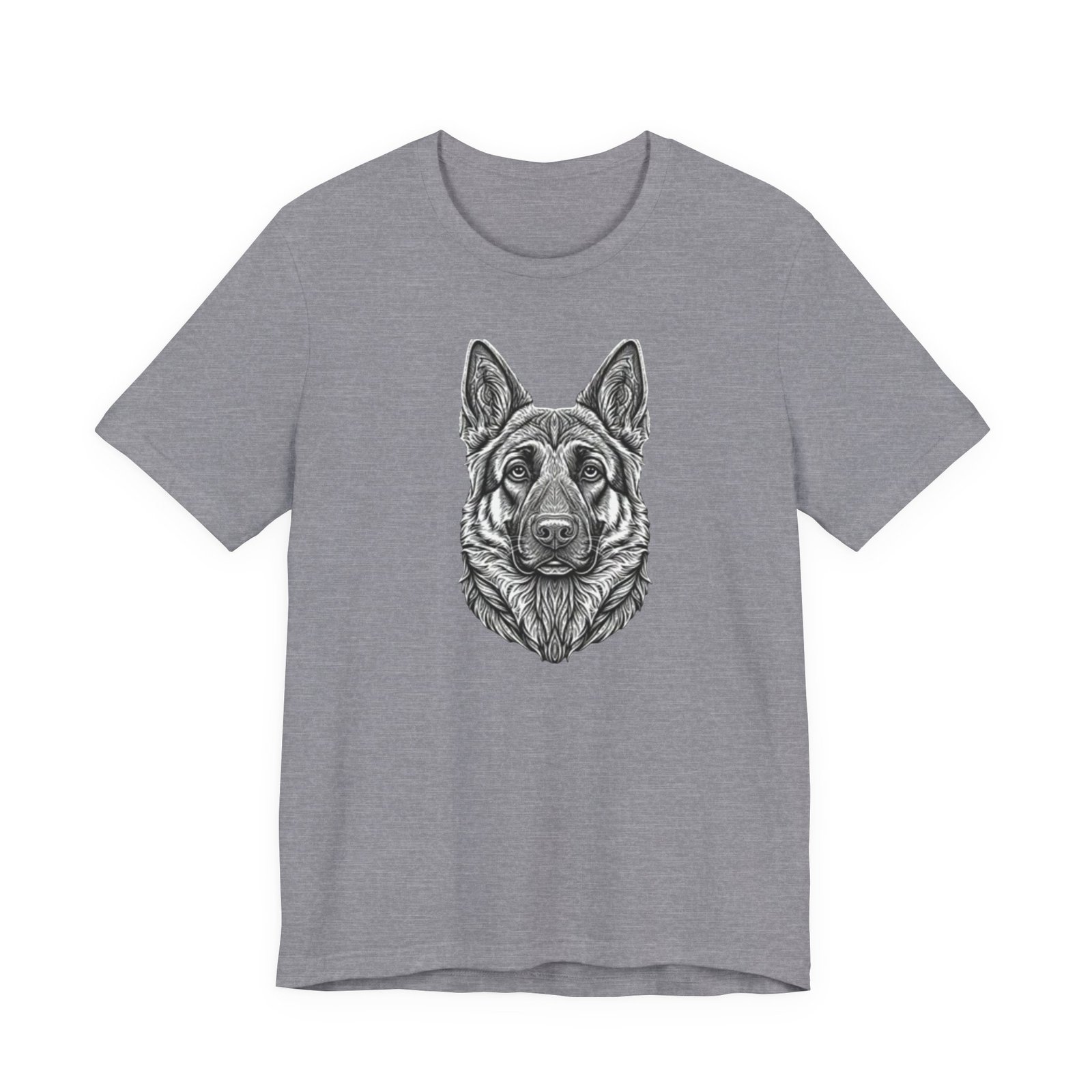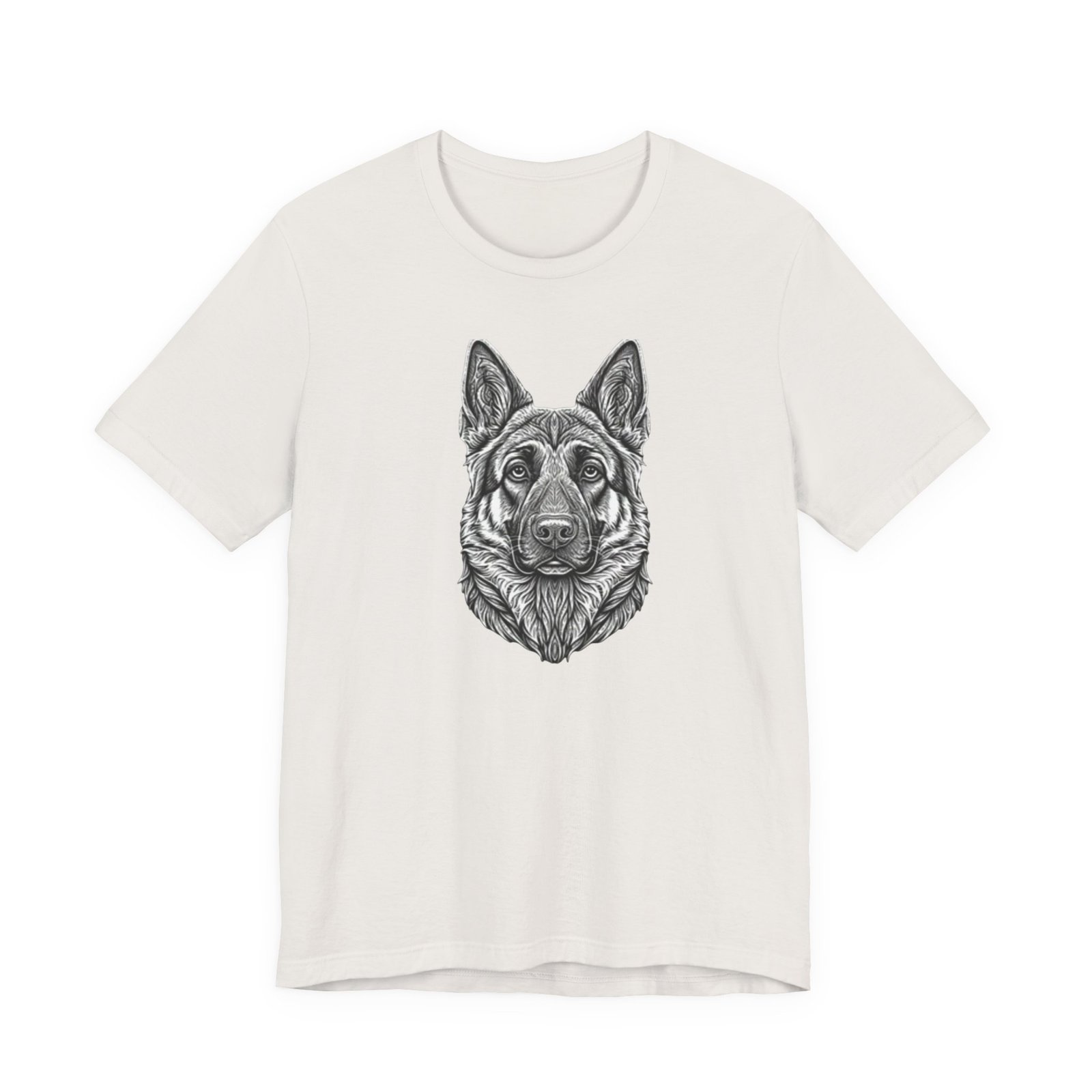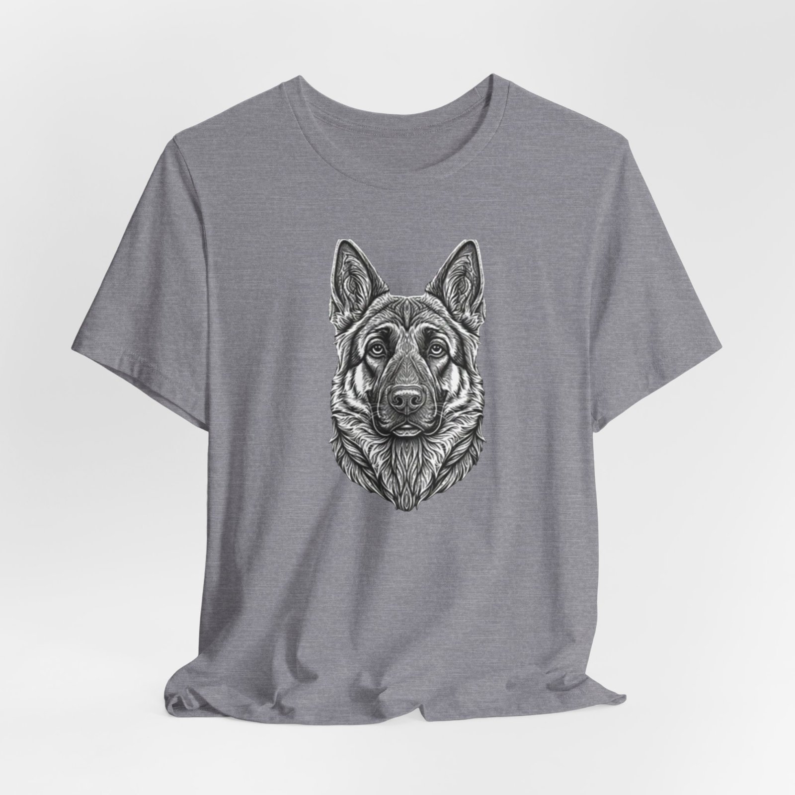 This lightweight jersey tee carries a hand-drawn German Shepherd portrait at the center — a quiet, confident statement for anyone who lives for loyal companions and outdoor moments. The soft, breathable Airlume combed cotton feels cool against the skin on long walks, training sessions, or layered under a jacket for weekend wanderings. The detailed monochrome illustration sits cleanly on a neat crew neckline, offering an artful, slightly rugged look that blends into everyday wear. Built with thoughtful construction — side seams, ribbed collar, and shoulder tape — it keeps its shape through frequent wear and washes. Choose this tee when you want to wear a reminder of that steady, watchful presence at your side.