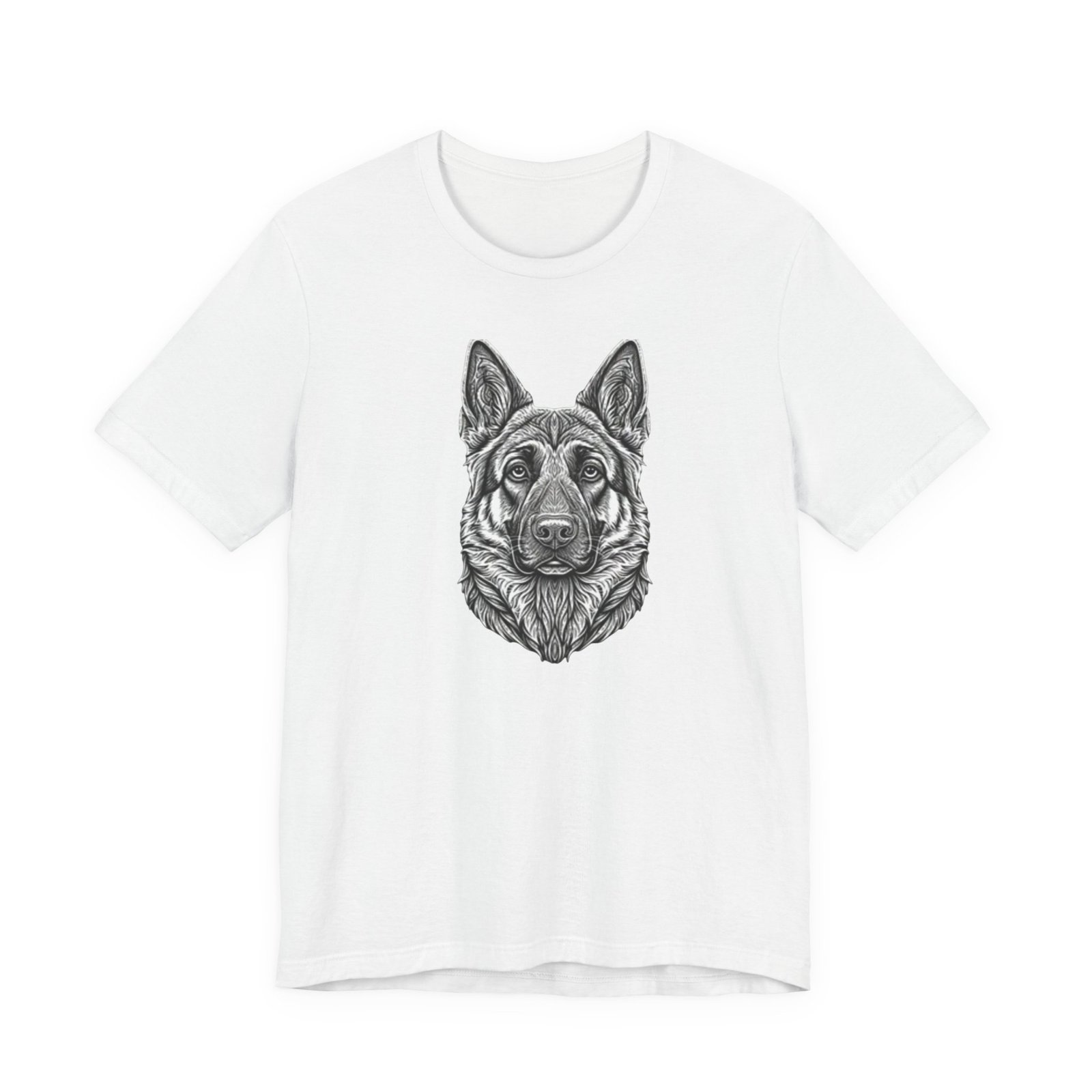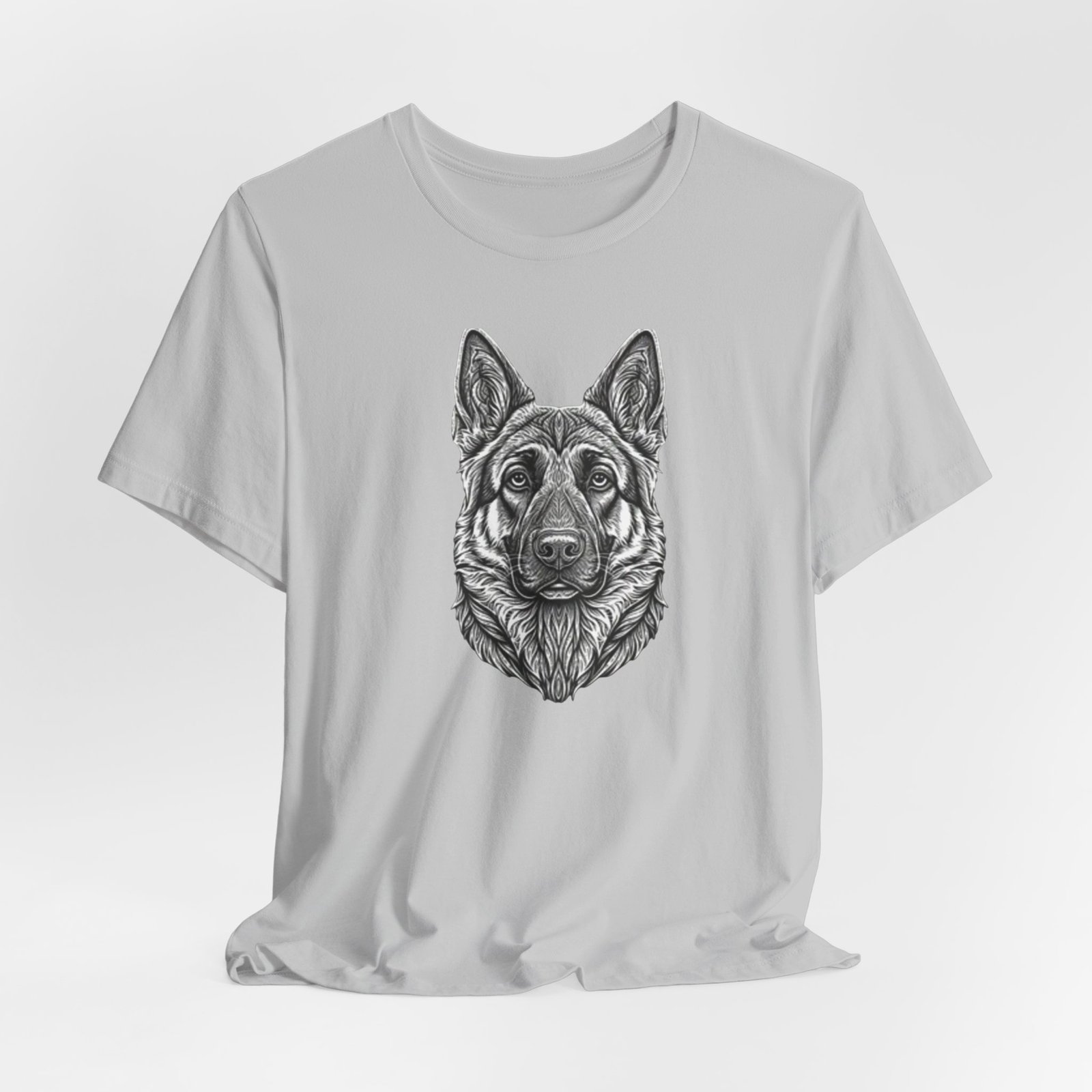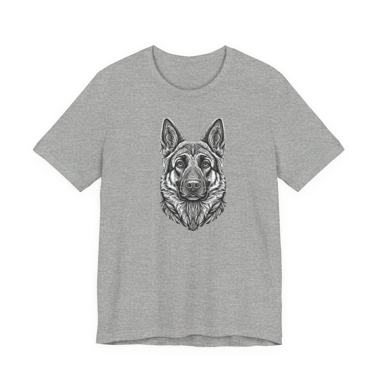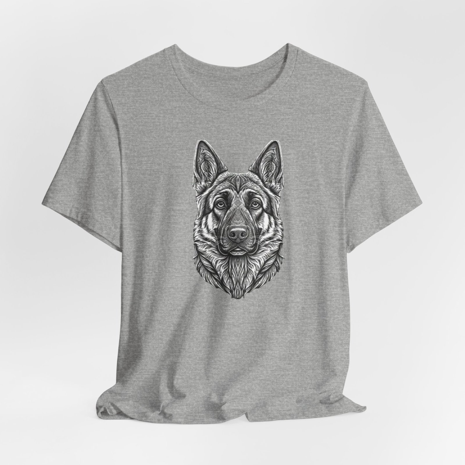 This lightweight jersey tee carries a hand-drawn German Shepherd portrait at the center — a quiet, confident statement for anyone who lives for loyal companions and outdoor moments. The soft, breathable Airlume combed cotton feels cool against the skin on long walks, training sessions, or layered under a jacket for weekend wanderings. The detailed monochrome illustration sits cleanly on a neat crew neckline, offering an artful, slightly rugged look that blends into everyday wear. Built with thoughtful construction — side seams, ribbed collar, and shoulder tape — it keeps its shape through frequent wear and washes. Choose this tee when you want to wear a reminder of that steady, watchful presence at your side.