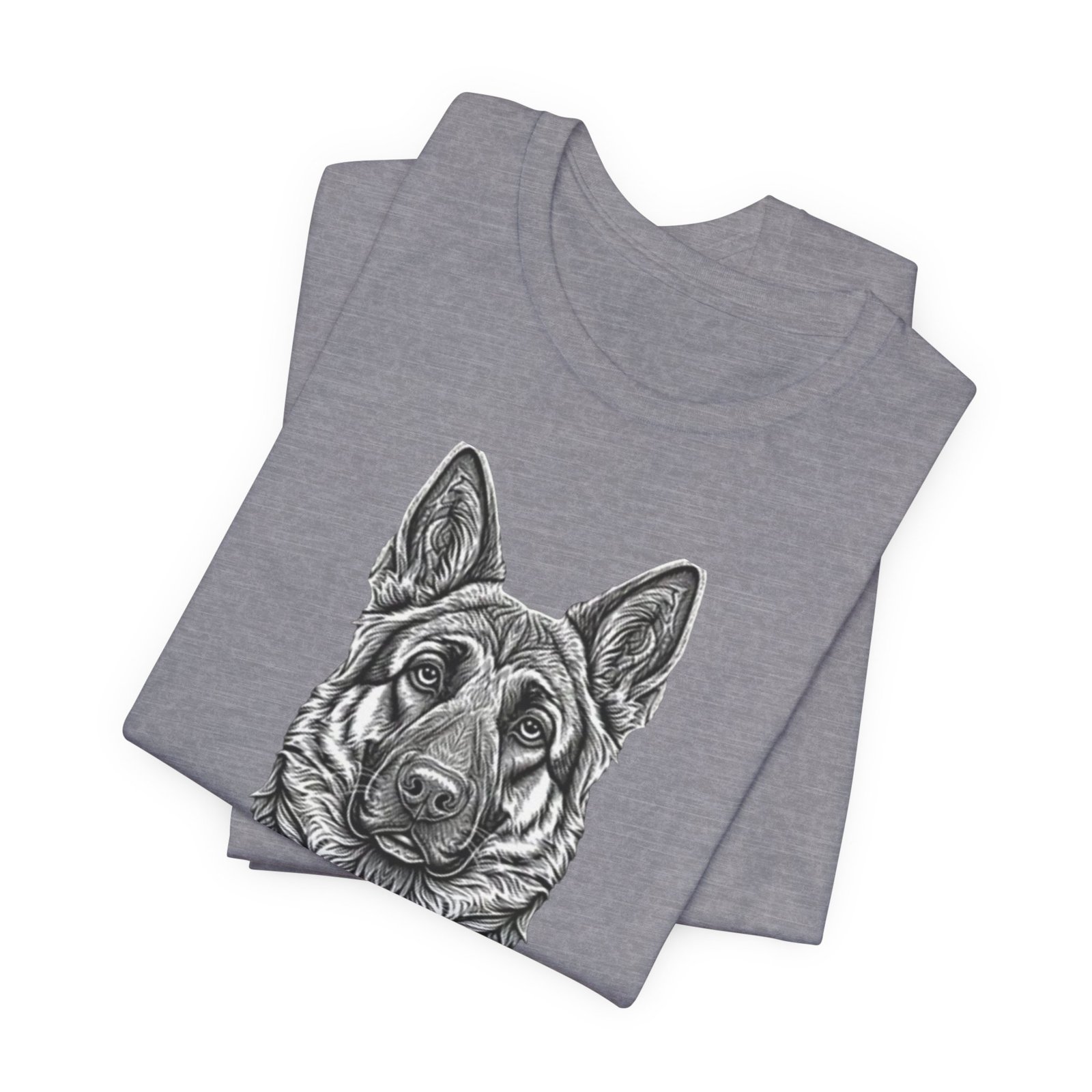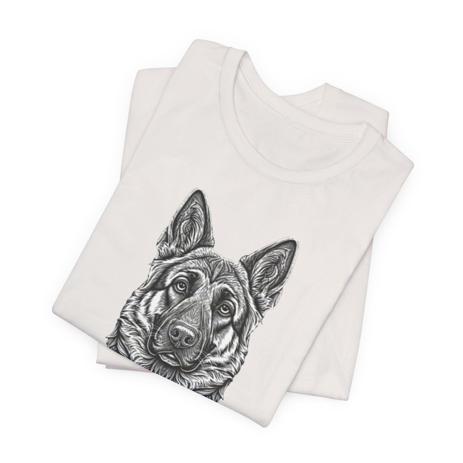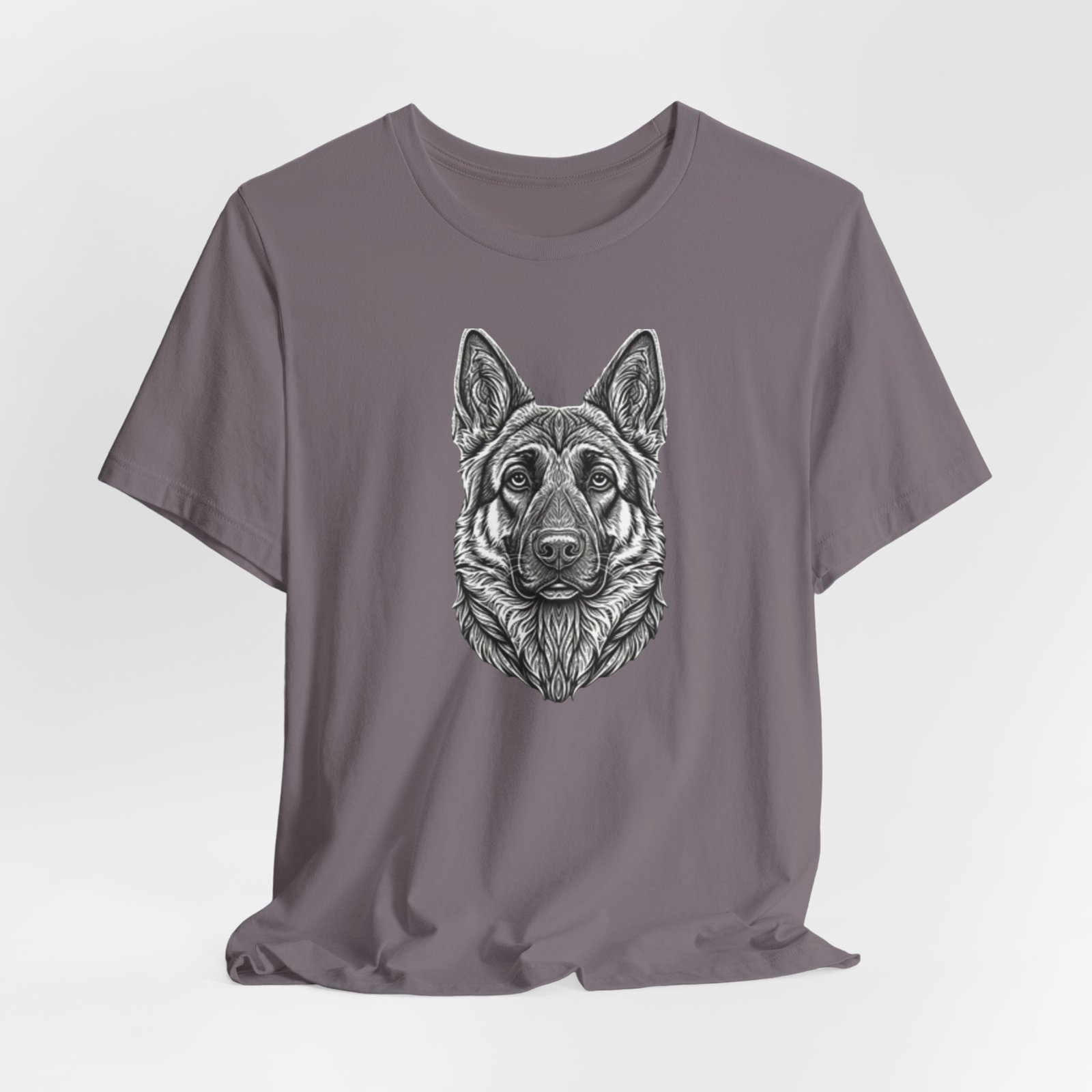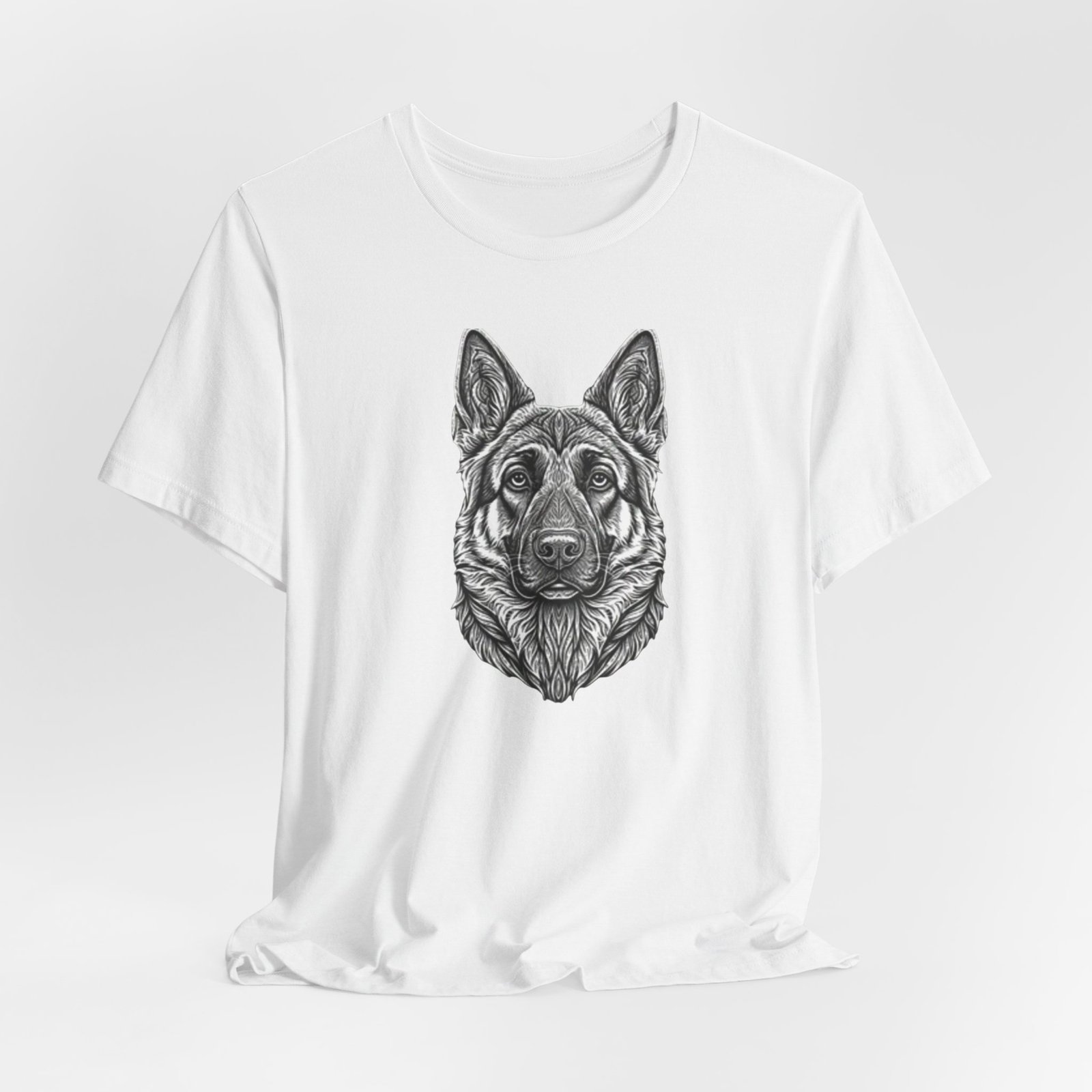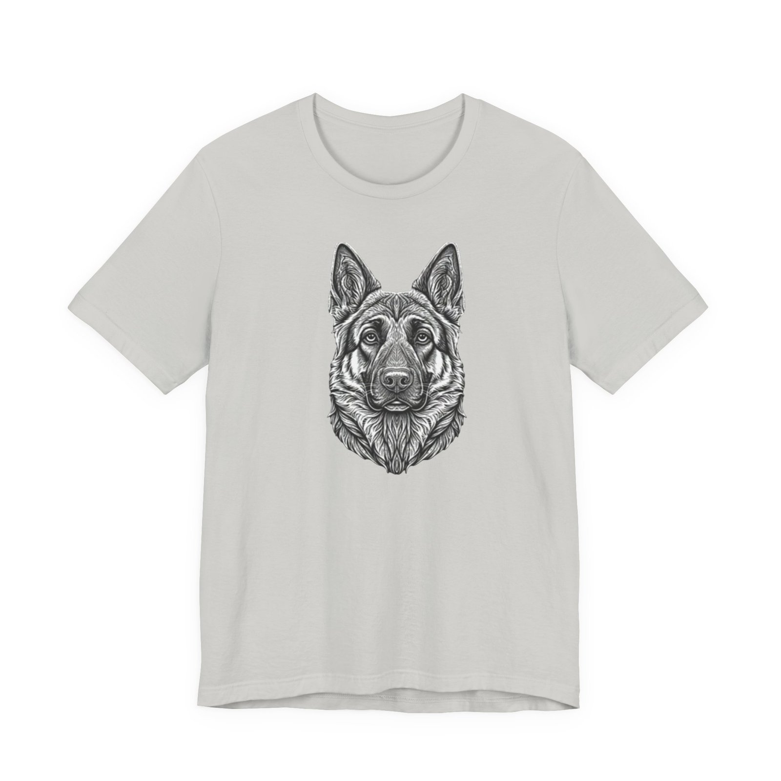This lightweight jersey tee carries a hand-drawn German Shepherd portrait at the center — a quiet, confident statement for anyone who lives for loyal companions and outdoor moments. The soft, breathable Airlume combed cotton feels cool against the skin on long walks, training sessions, or layered under a jacket for weekend wanderings. The detailed monochrome illustration sits cleanly on a neat crew neckline, offering an artful, slightly rugged look that blends into everyday wear. Built with thoughtful construction — side seams, ribbed collar, and shoulder tape — it keeps its shape through frequent wear and washes. Choose this tee when you want to wear a reminder of that steady, watchful presence at your side.