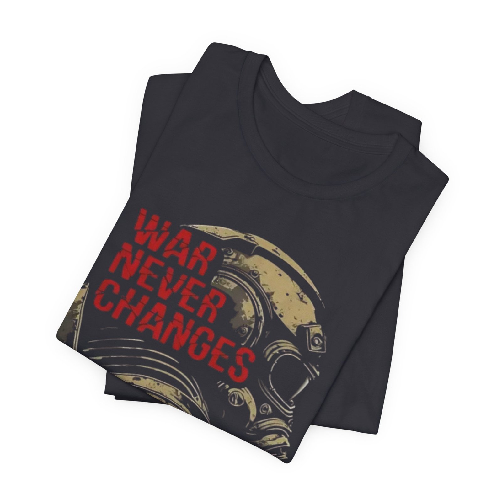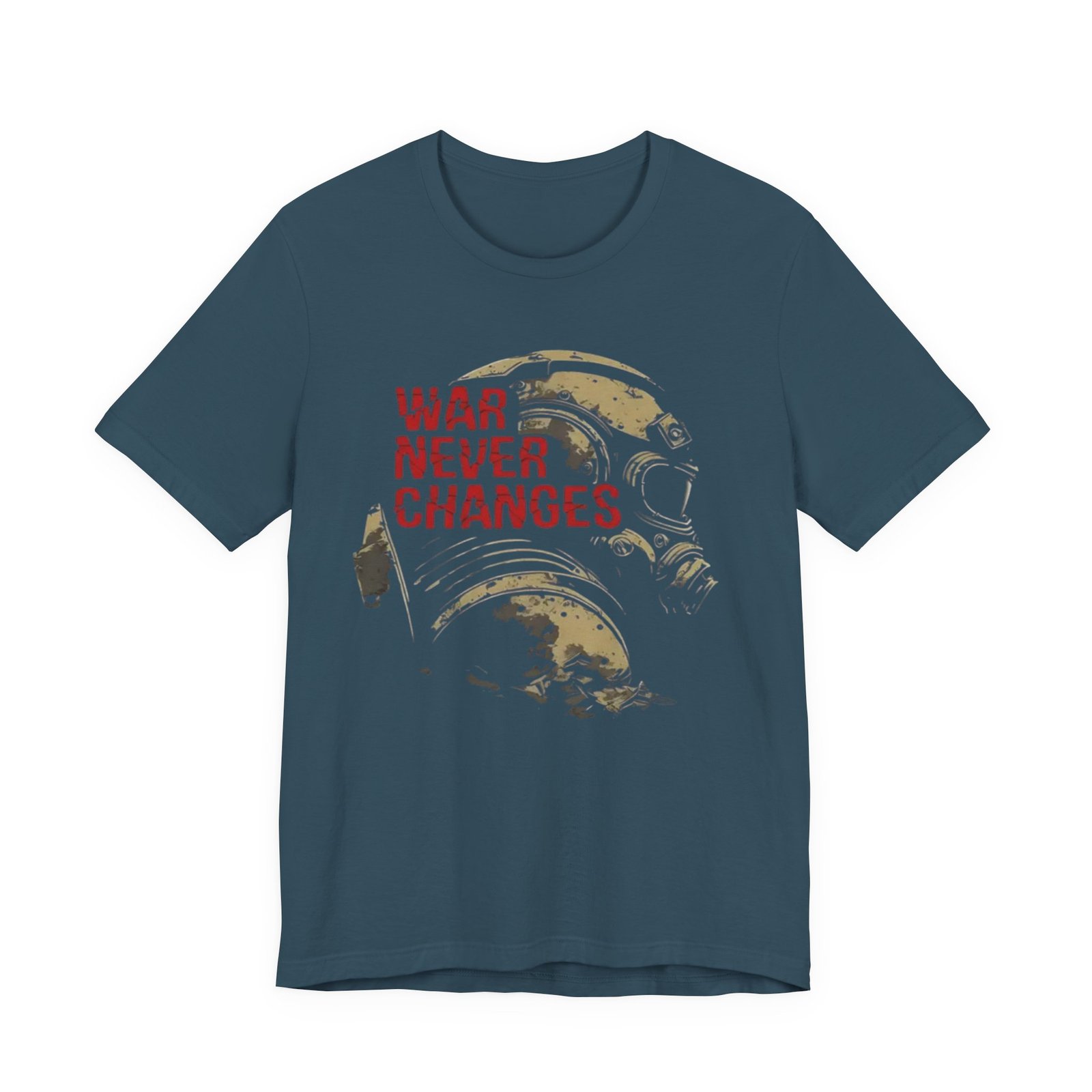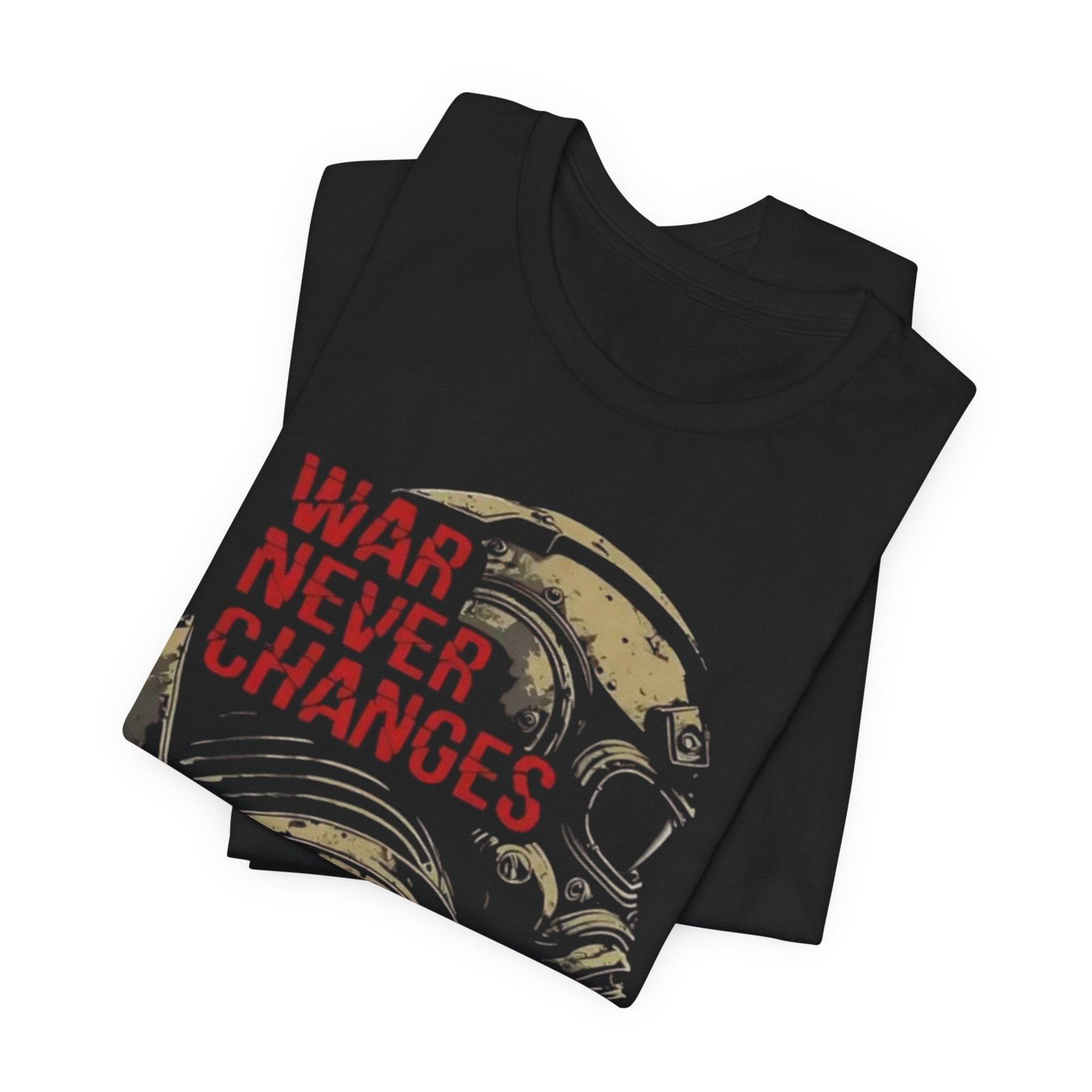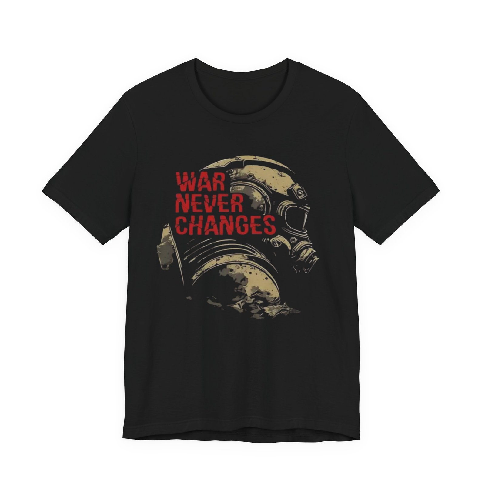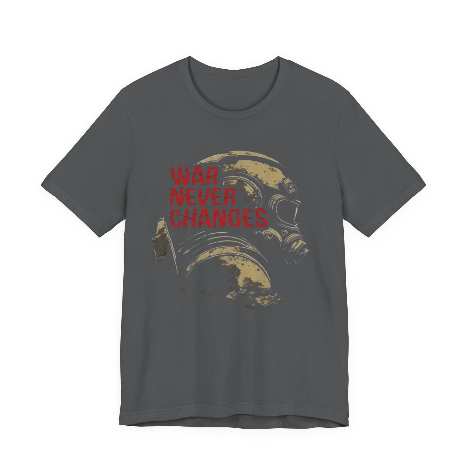 Graphic Tee “War Never Changes” — Retro Gas Mask Military Shirt