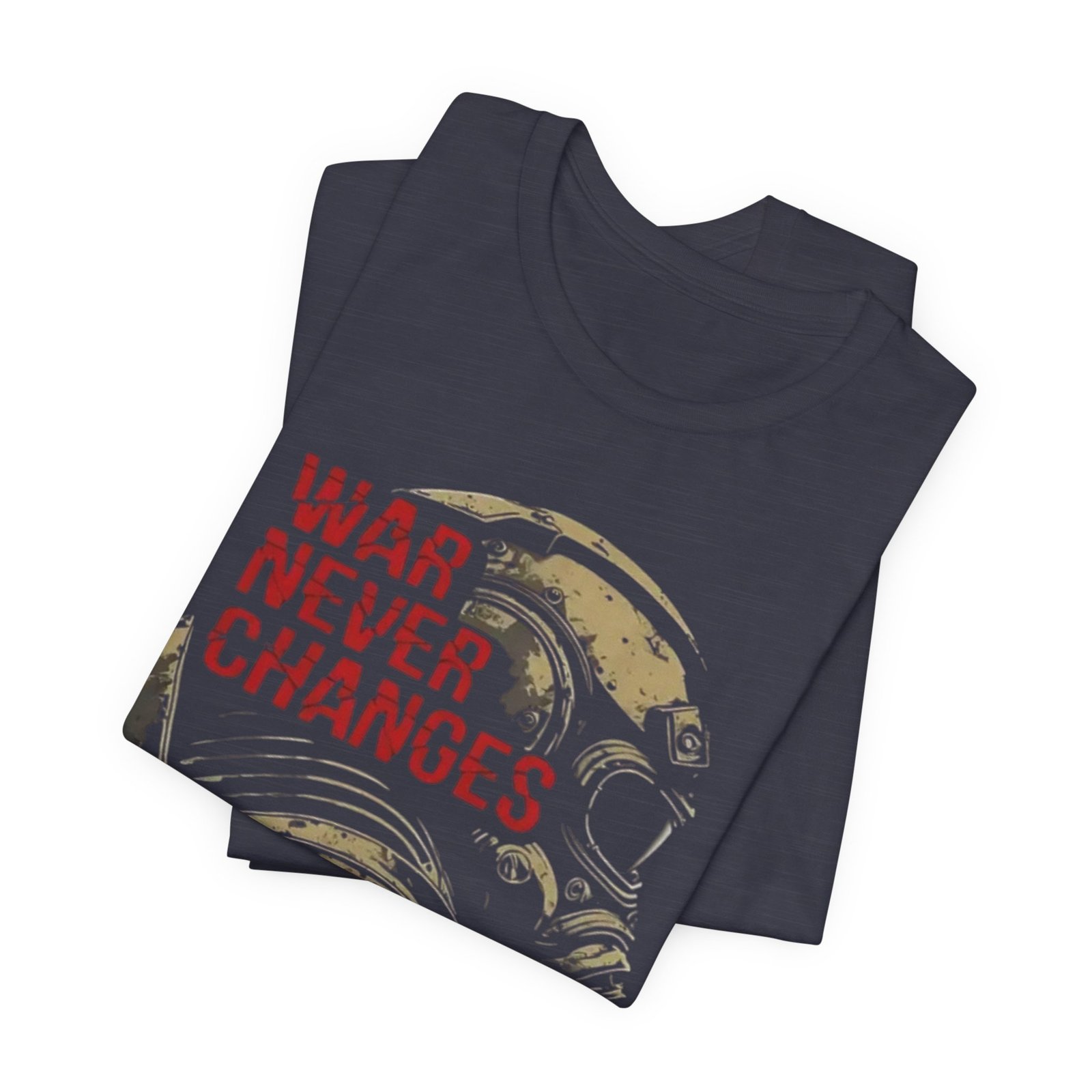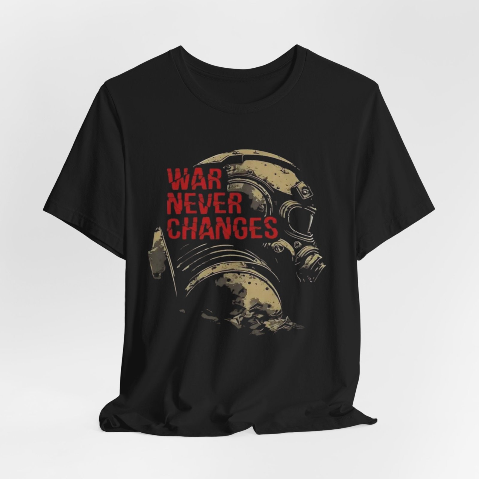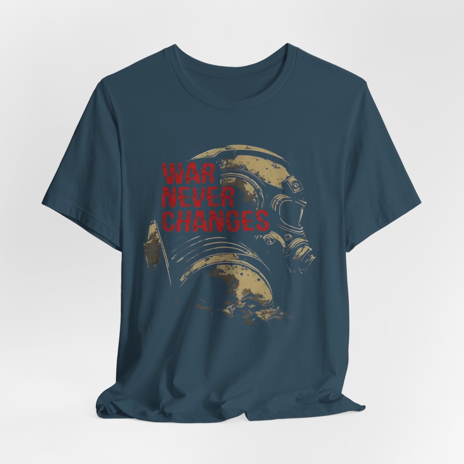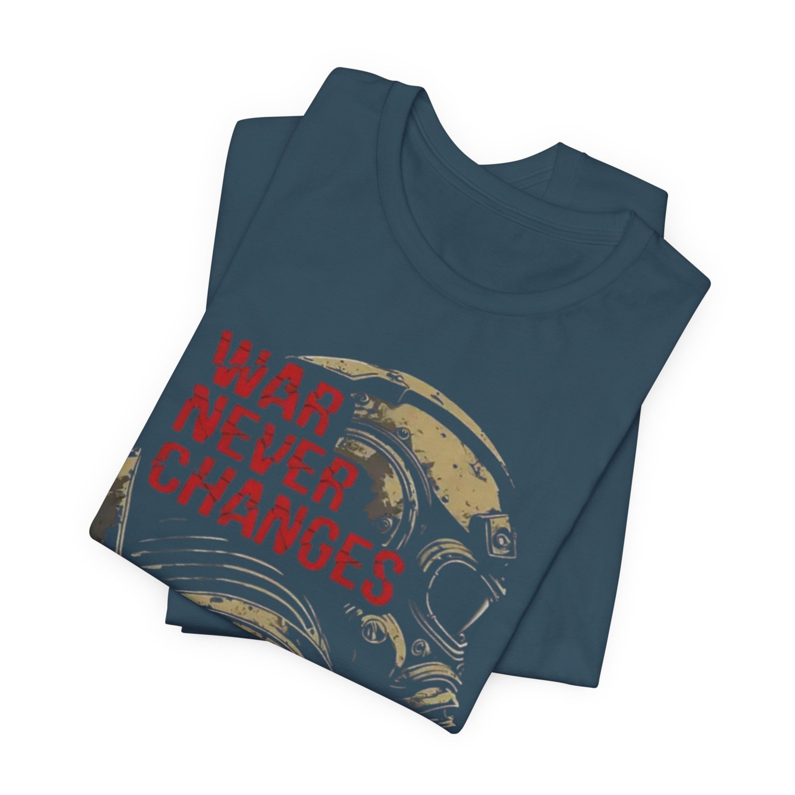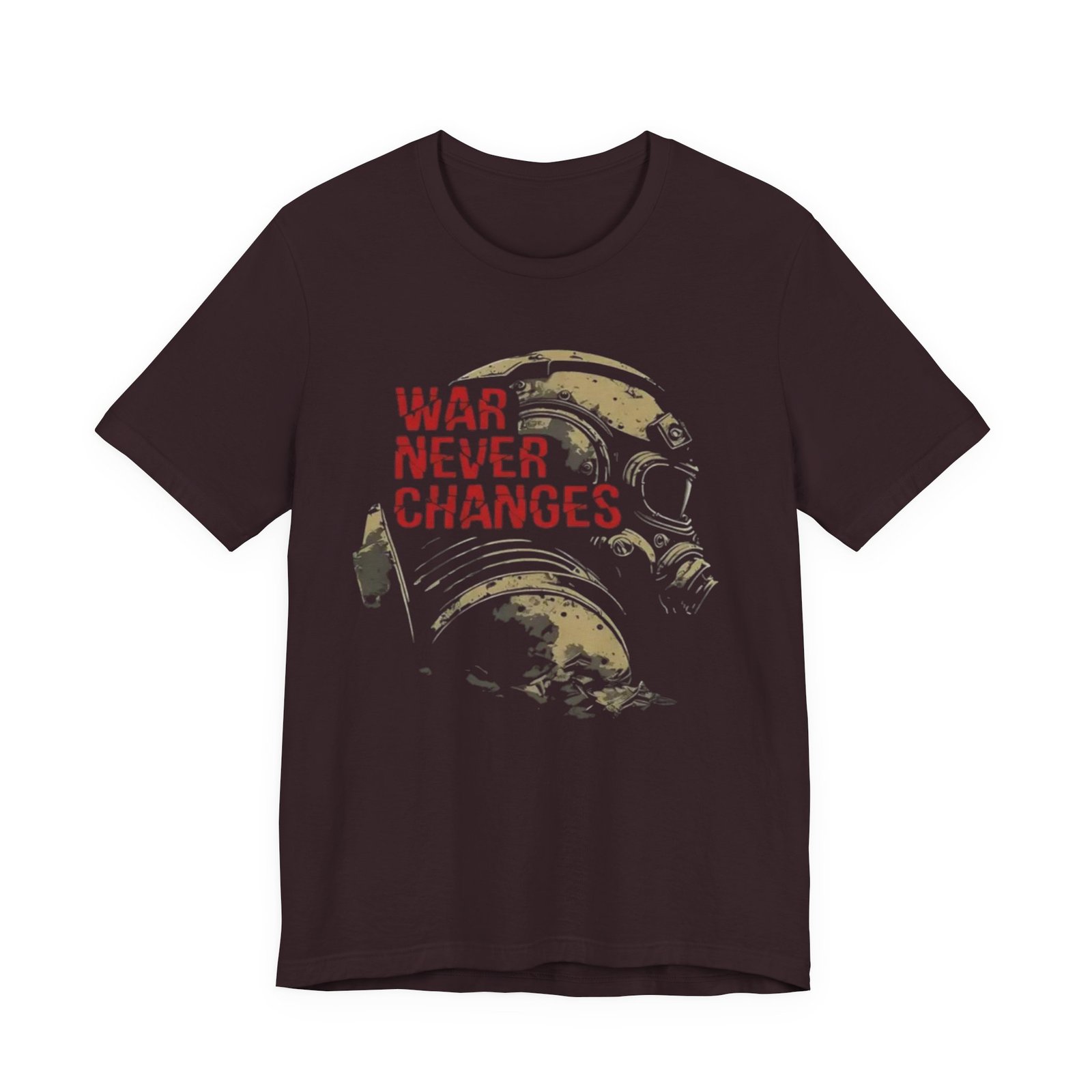 Graphic Tee “War Never Changes” — Retro Gas Mask Military Shirt