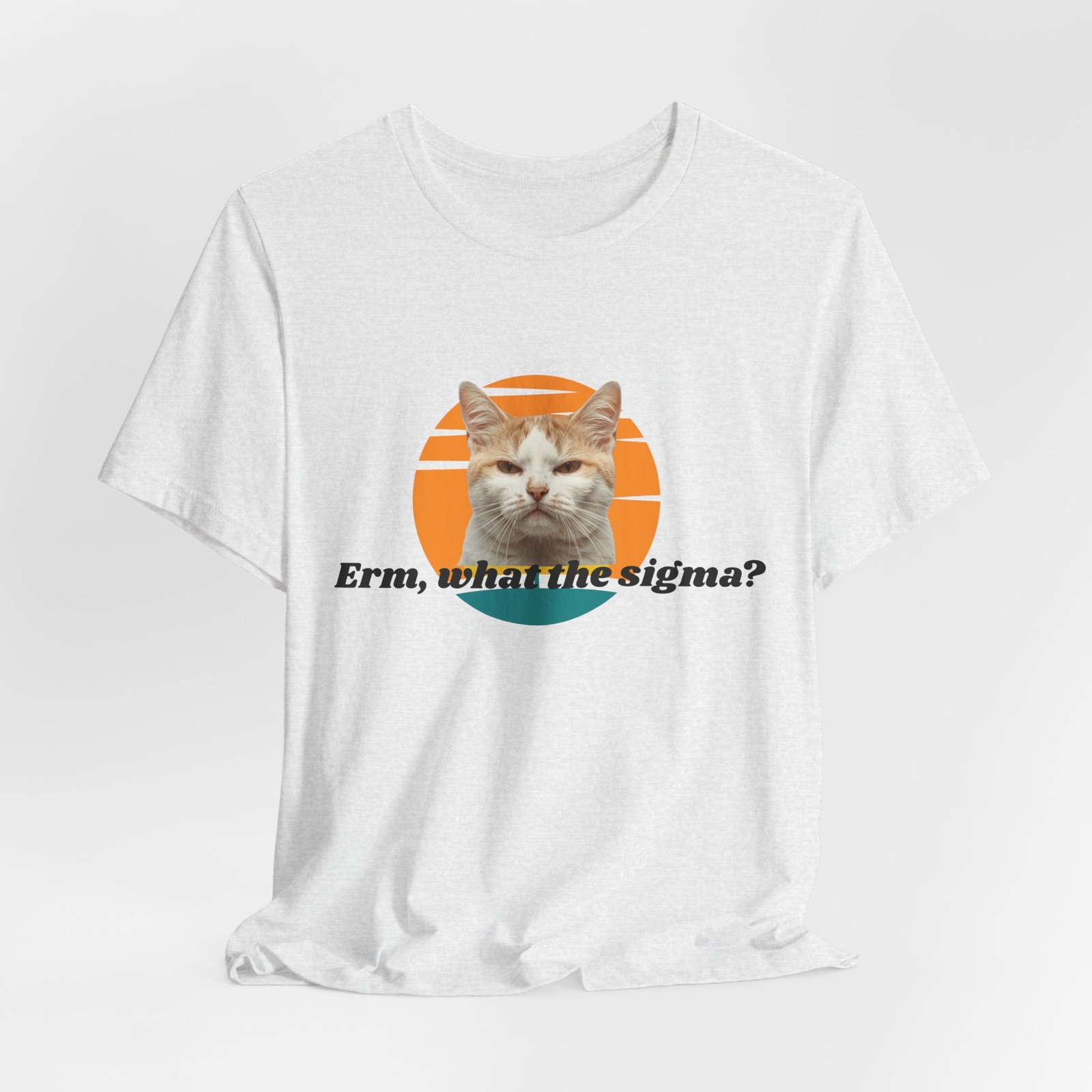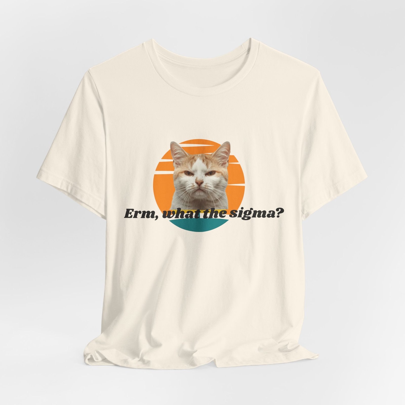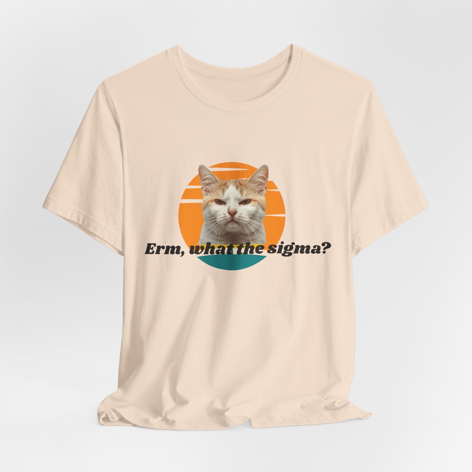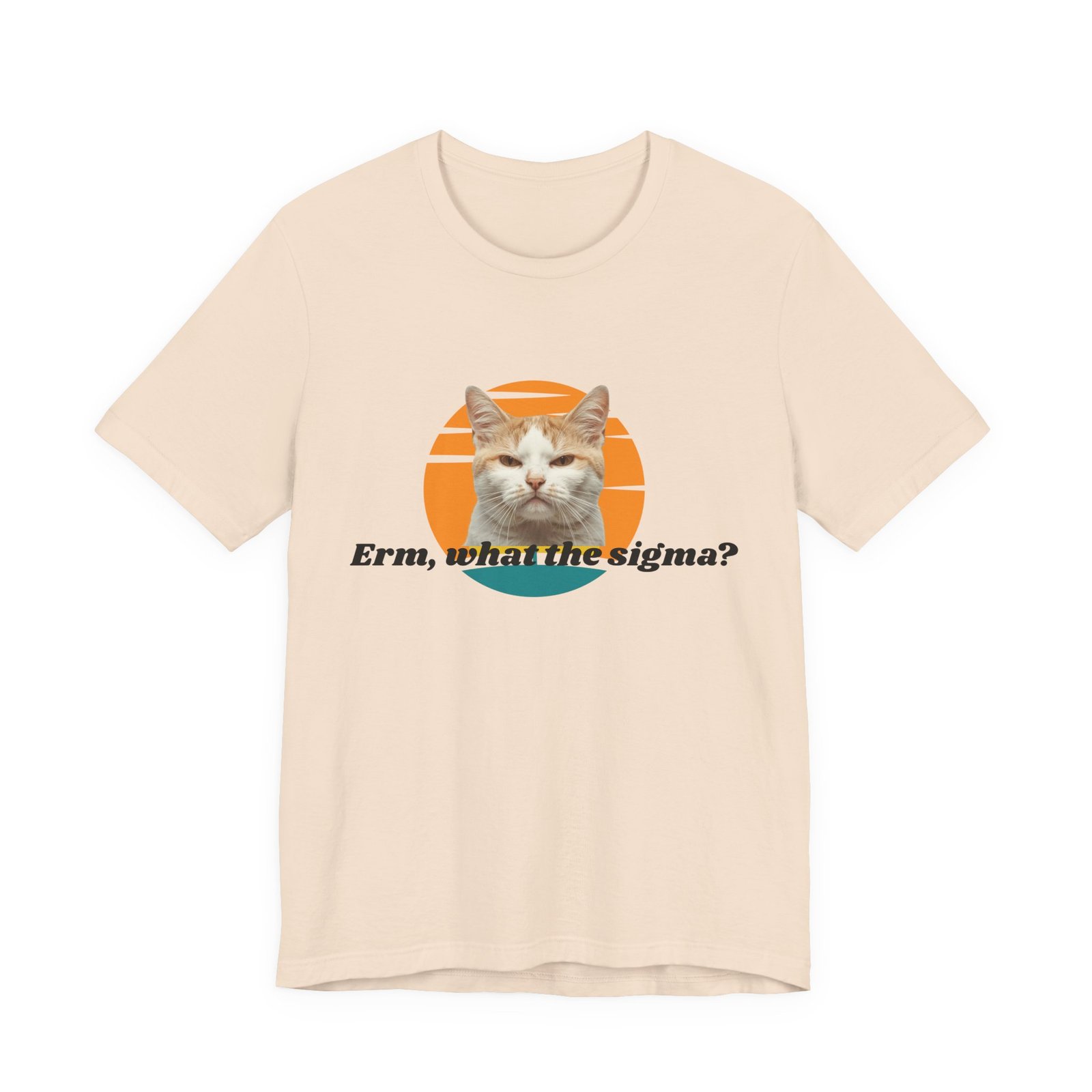 Soft, breathable cotton meets deadpan humor. This lightweight jersey tee features a laid-back cat portrait set against a vintage sun stripe, captioned “Erm, what the sigma?” — a wink for anyone who loves nerdy math jokes and sleepy feline energy. The retail fit and crew neckline keep the silhouette neat for everyday wear; the airy fabric layers easily for cooler mornings. Wear it to study sessions, casual meetings with friends, or lazy weekends when you want comfort with a low-key laugh. The design reads like an inside joke shared between statistics students and cat people — familiar, slightly absurd, and quietly confident.