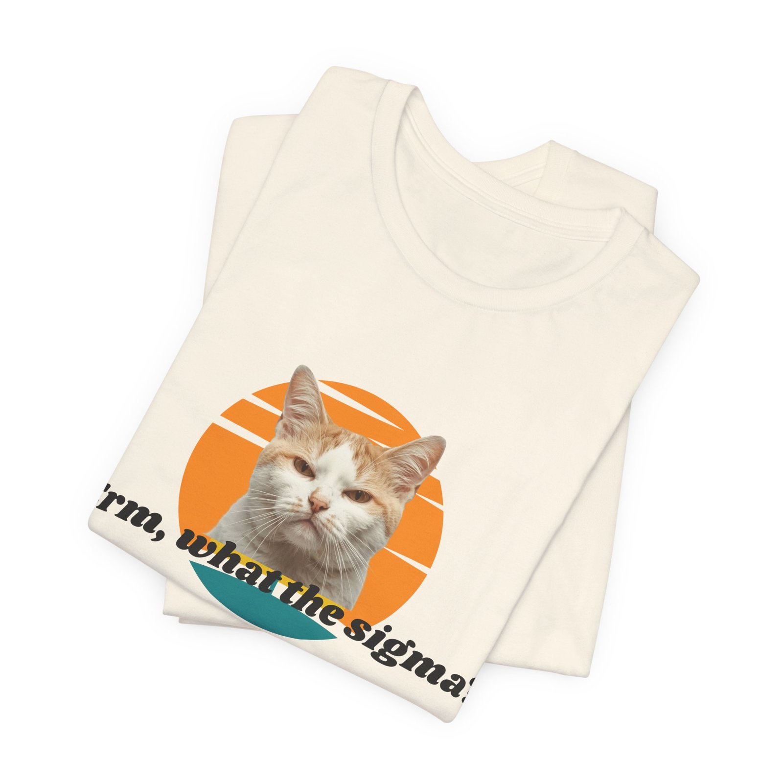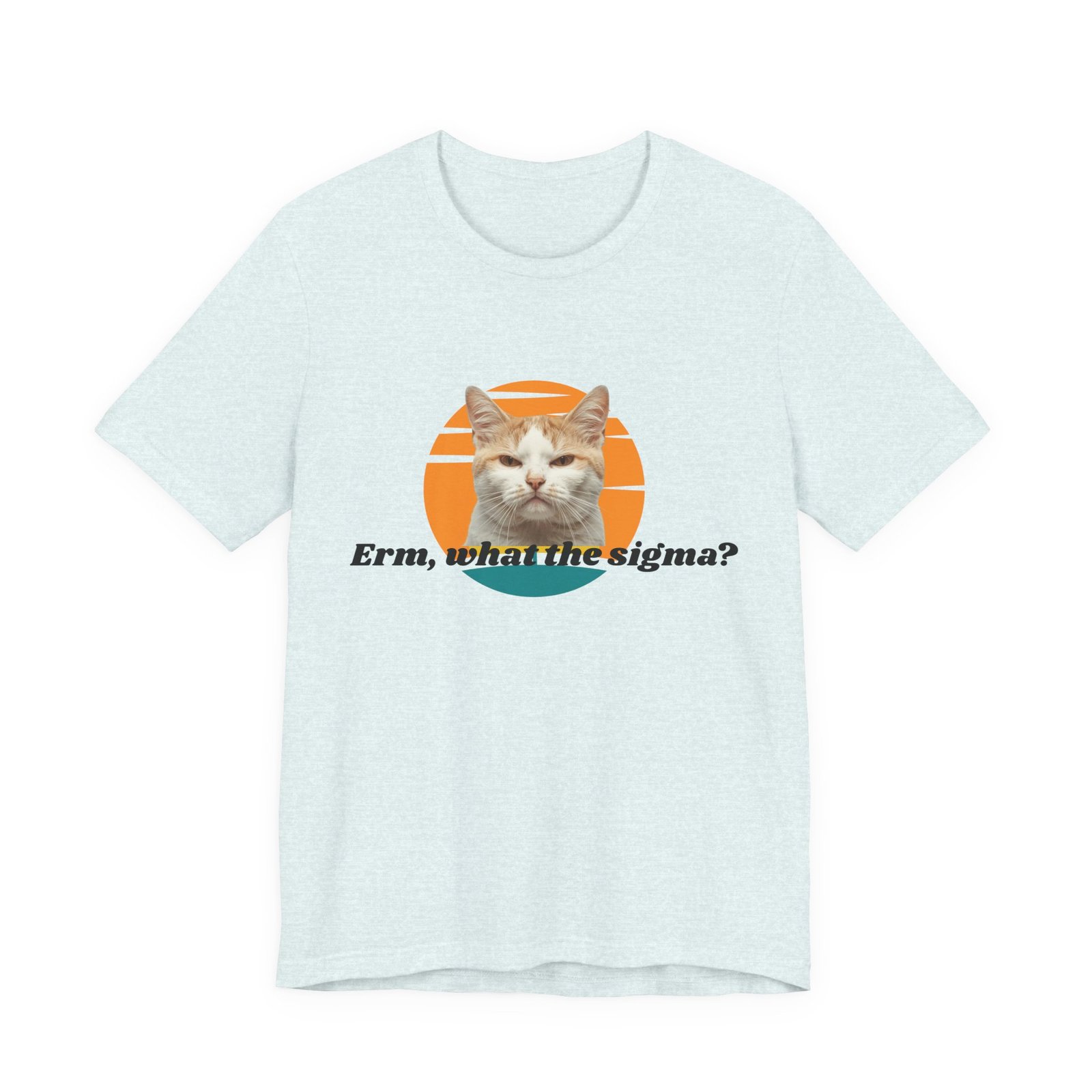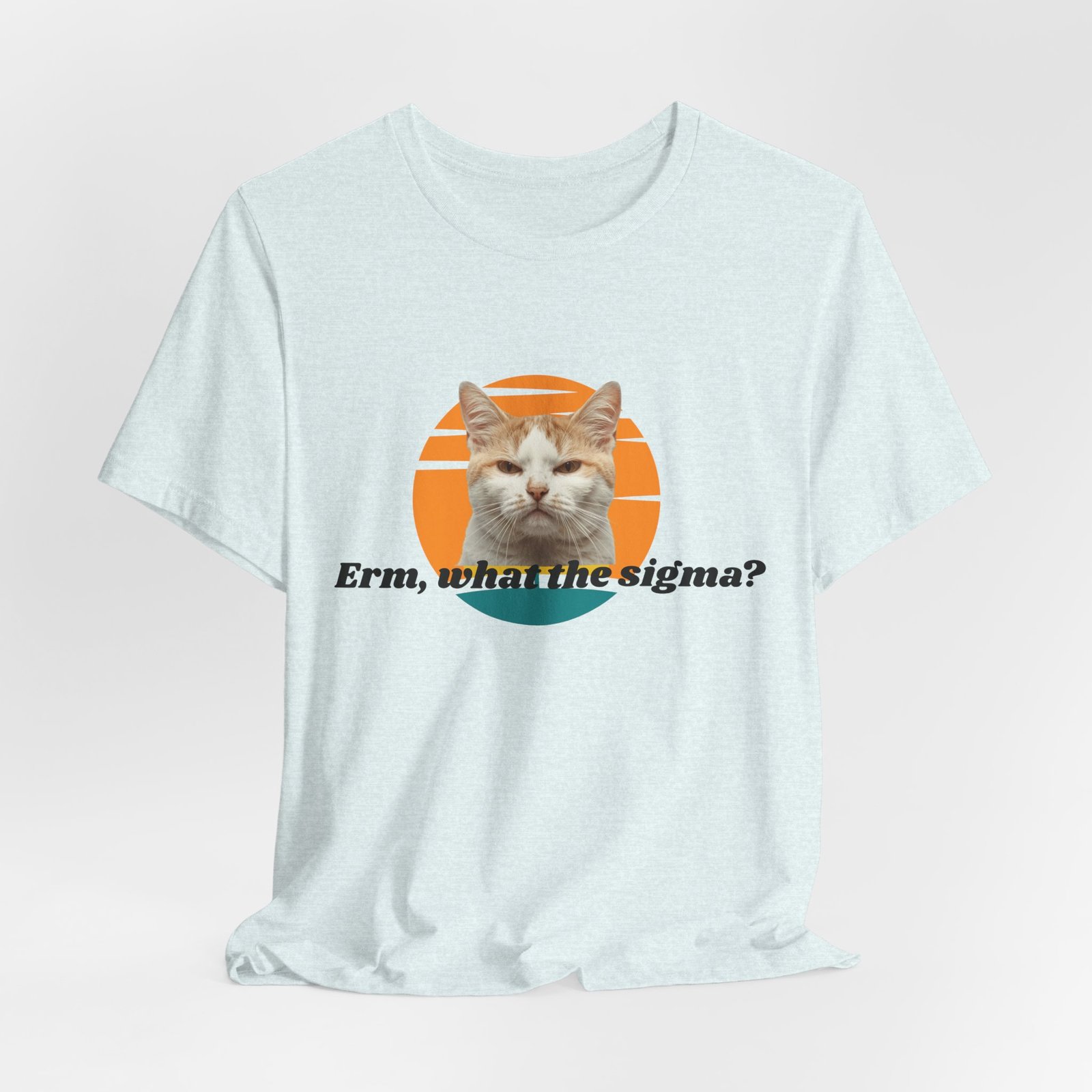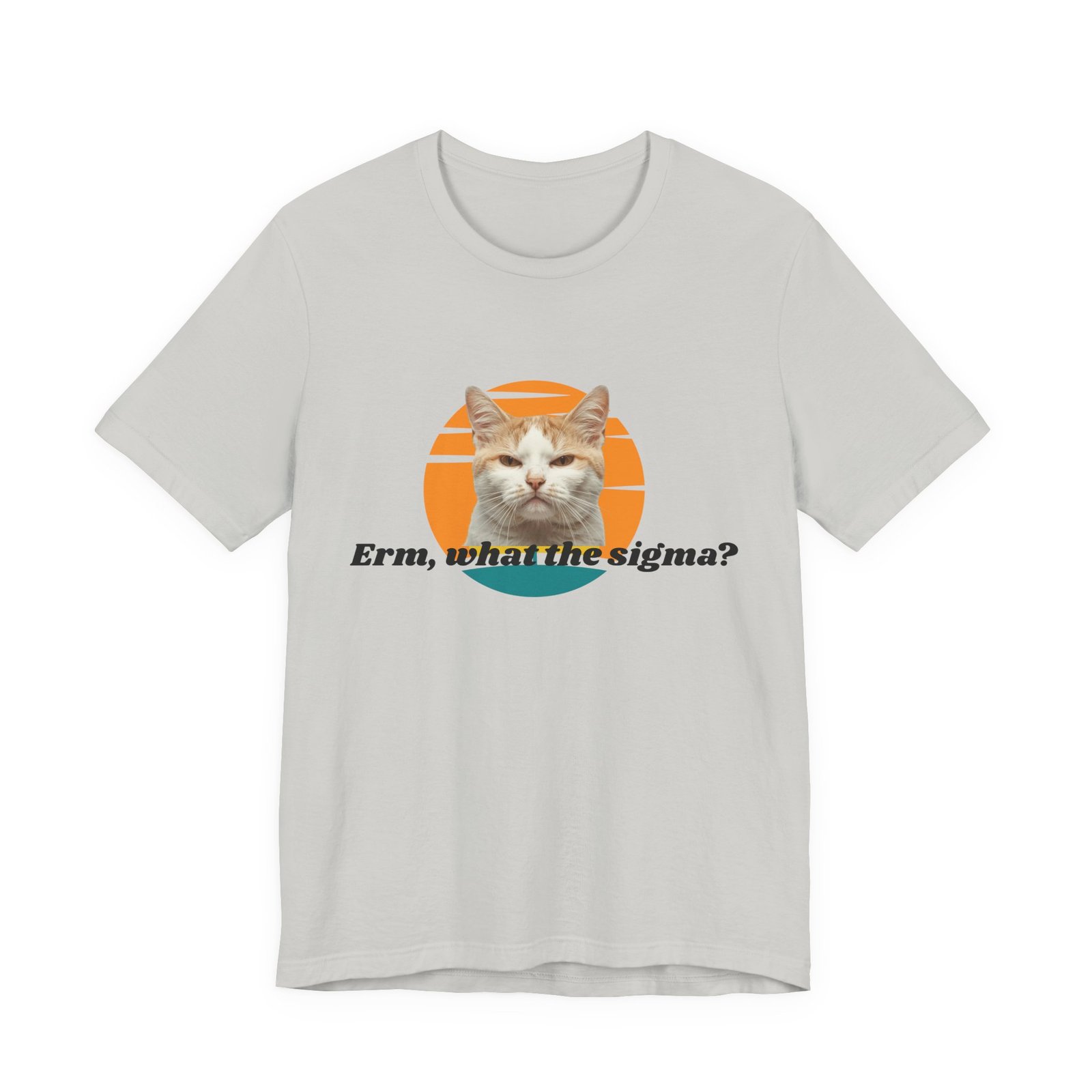 Soft, breathable cotton meets deadpan humor. This lightweight jersey tee features a laid-back cat portrait set against a vintage sun stripe, captioned “Erm, what the sigma?” — a wink for anyone who loves nerdy math jokes and sleepy feline energy. The retail fit and crew neckline keep the silhouette neat for everyday wear; the airy fabric layers easily for cooler mornings. Wear it to study sessions, casual meetings with friends, or lazy weekends when you want comfort with a low-key laugh. The design reads like an inside joke shared between statistics students and cat people — familiar, slightly absurd, and quietly confident.