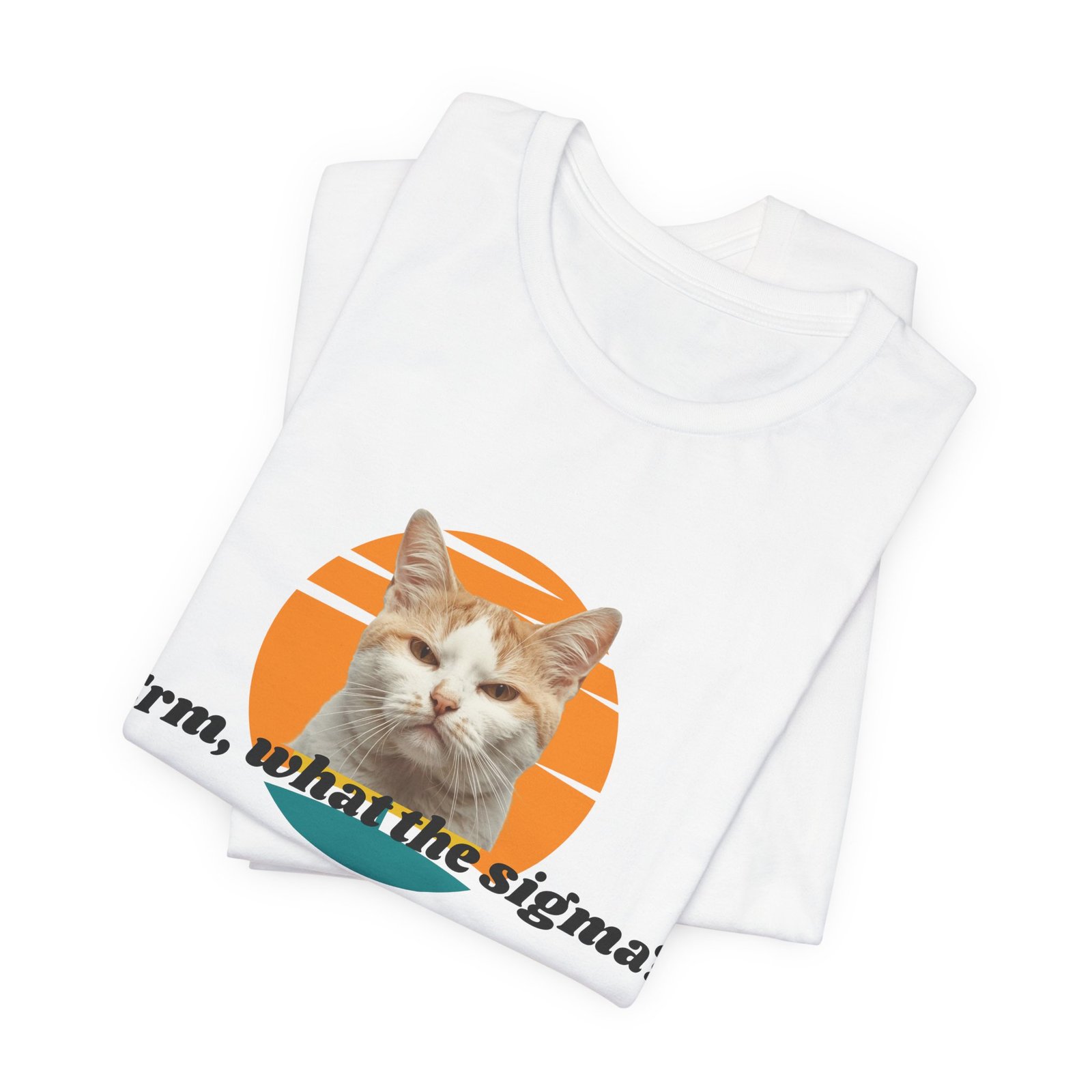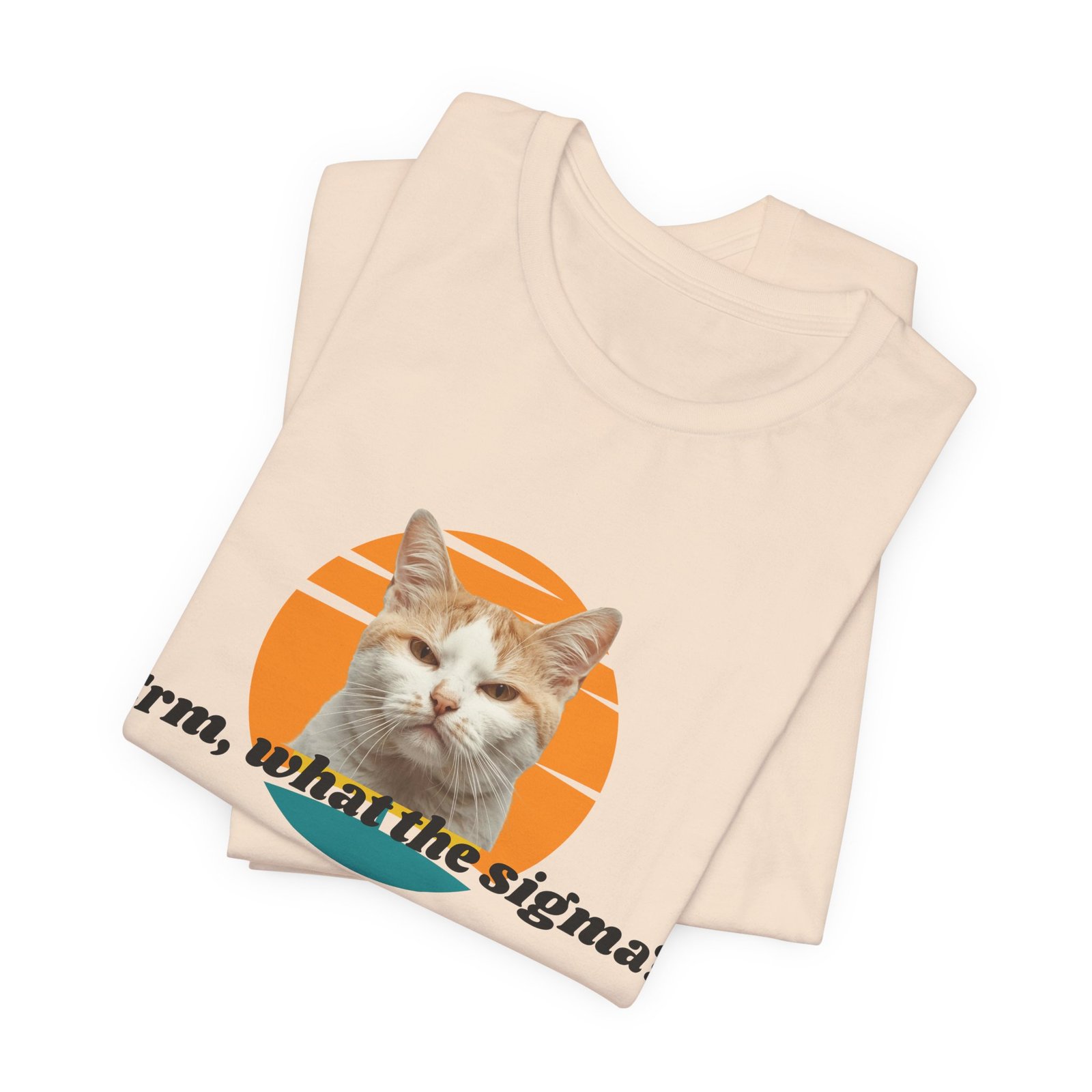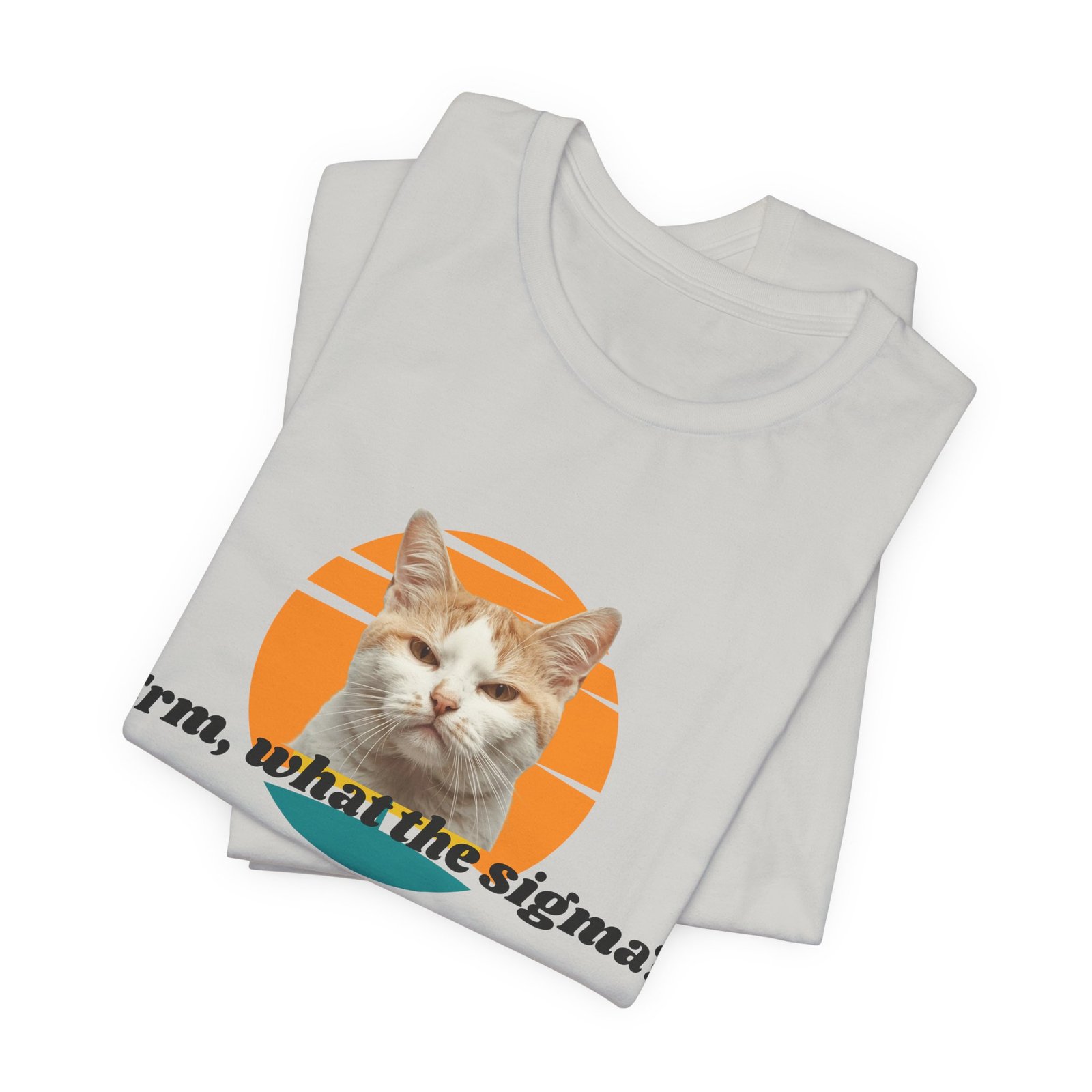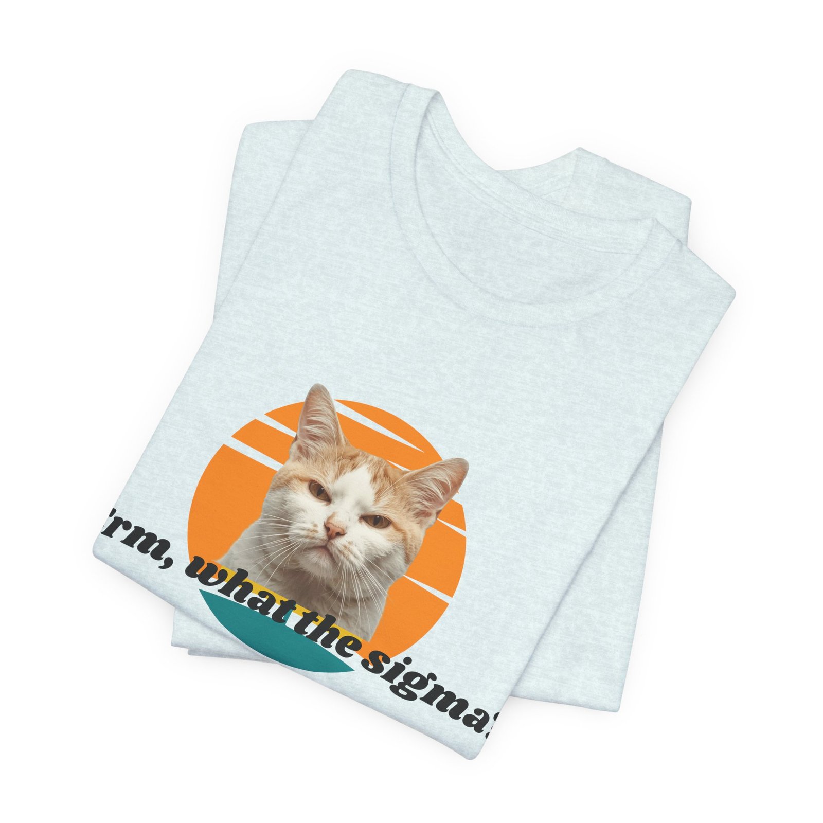Soft, breathable cotton meets deadpan humor. This lightweight jersey tee features a laid-back cat portrait set against a vintage sun stripe, captioned “Erm, what the sigma?” — a wink for anyone who loves nerdy math jokes and sleepy feline energy. The retail fit and crew neckline keep the silhouette neat for everyday wear; the airy fabric layers easily for cooler mornings. Wear it to study sessions, casual meetings with friends, or lazy weekends when you want comfort with a low-key laugh. The design reads like an inside joke shared between statistics students and cat people — familiar, slightly absurd, and quietly confident.