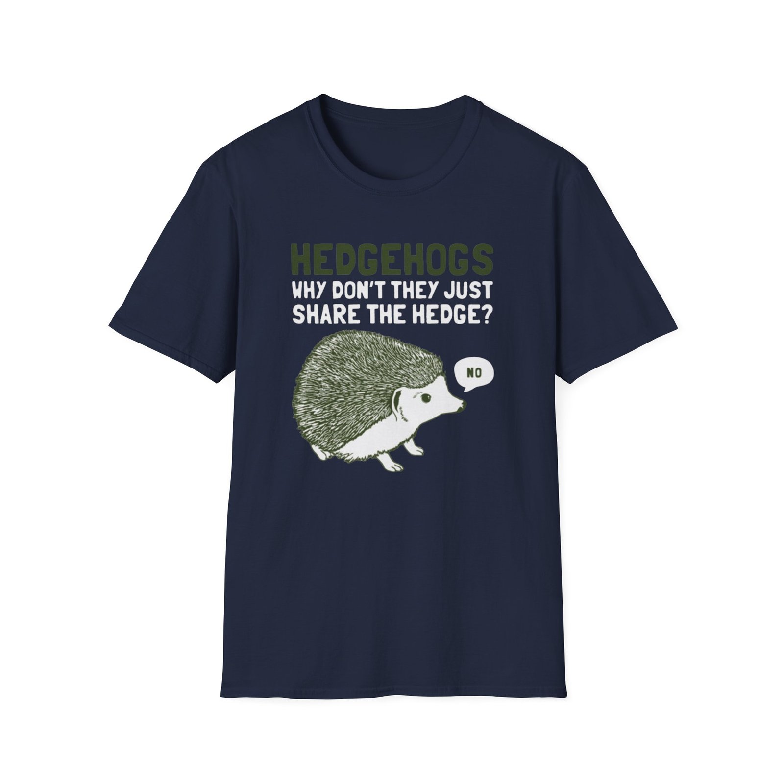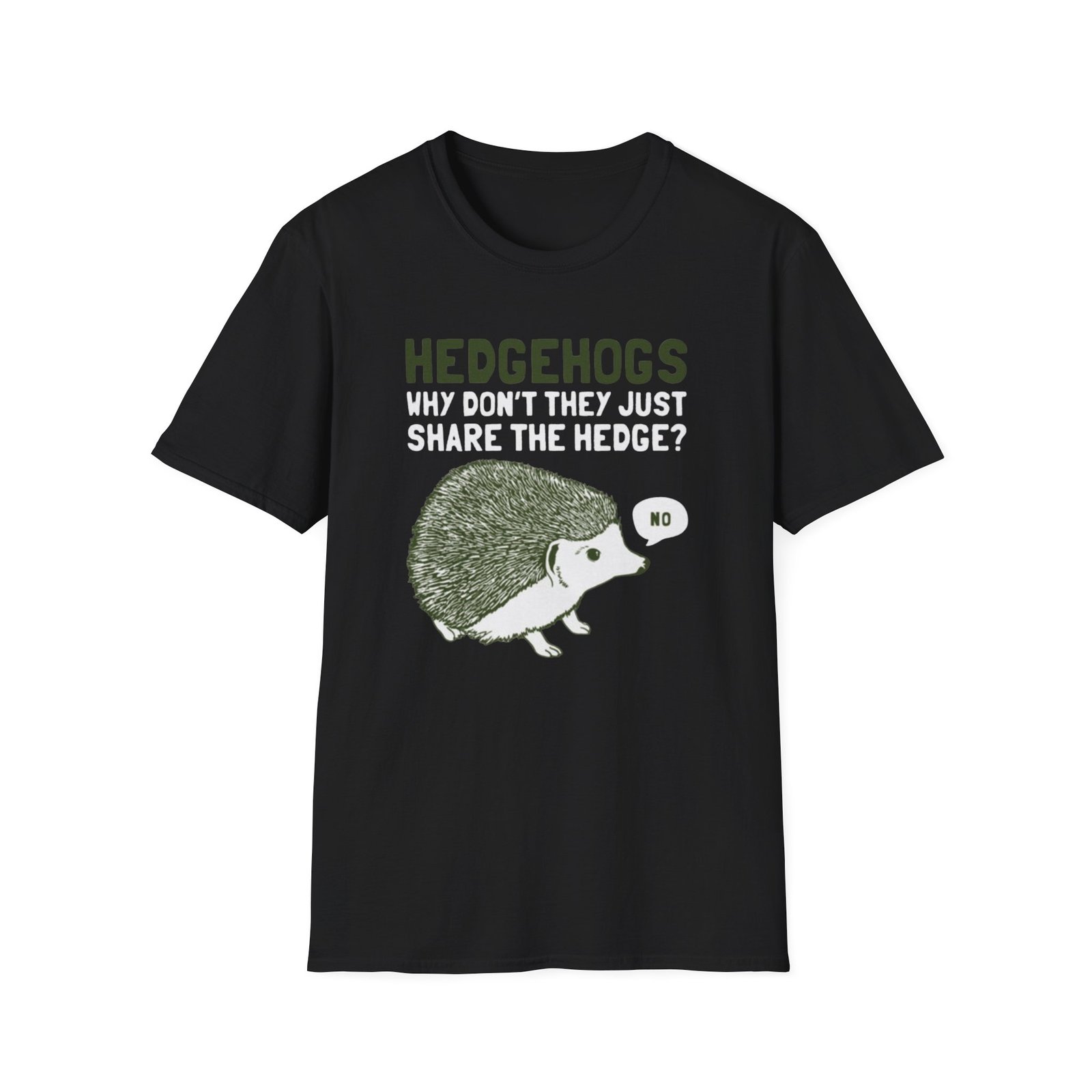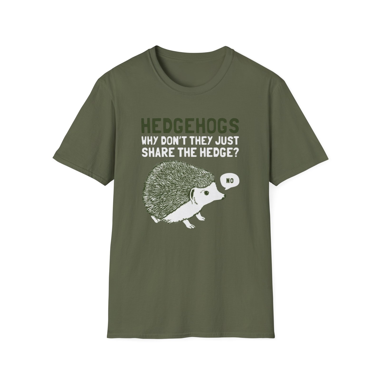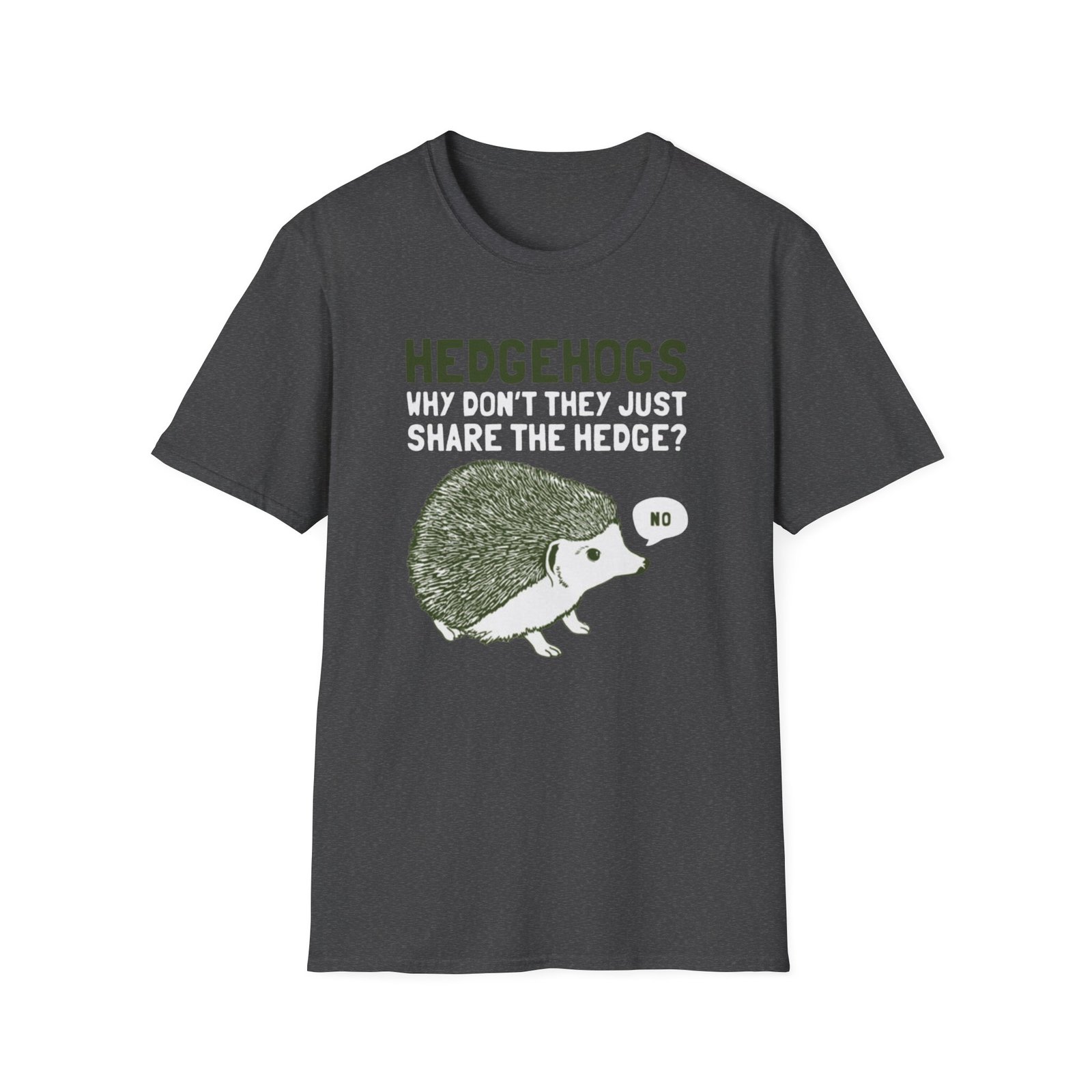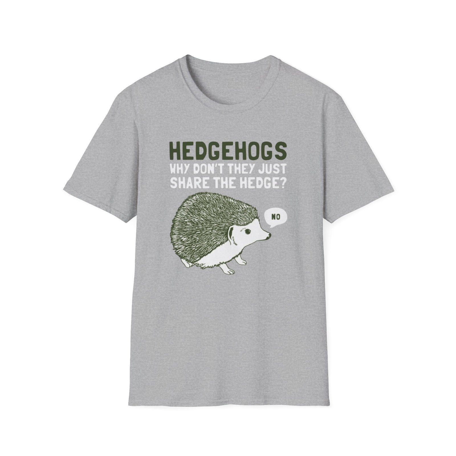 Soft, witty, and quietly charming — this lightweight tee carries a cheeky woodland joke that slips easily into everyday wear. The front print shows a grumpy hedgehog alongside the line “HEDGEHOGS — WHY DON’T THEY JUST SHARE THE HEDGE? — NO,” rendered in textured greens and off-white for a vintage, hand-printed feel. It drapes lightly over the body without cling, so the graphic sits comfortably whether you’re out for a quick walk, running errands, or settling in with a book. Breathable ring-spun cotton keeps you cool; the ribbed crew neck and shoulder tape mean the shape stays true wash after wash. Wear it with faded jeans, layer under a flannel, or keep it as your go-to casual top when you want a little nature-humor in your day.