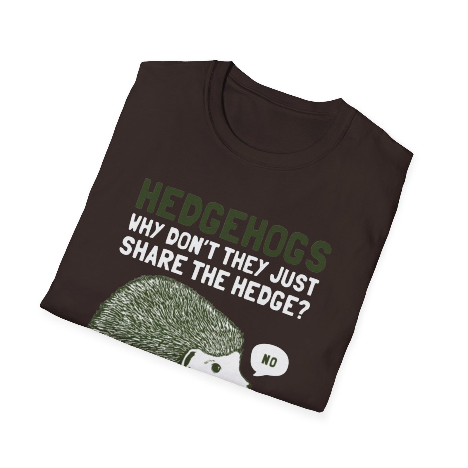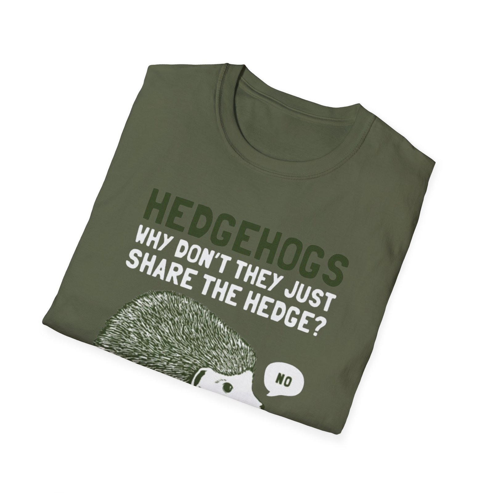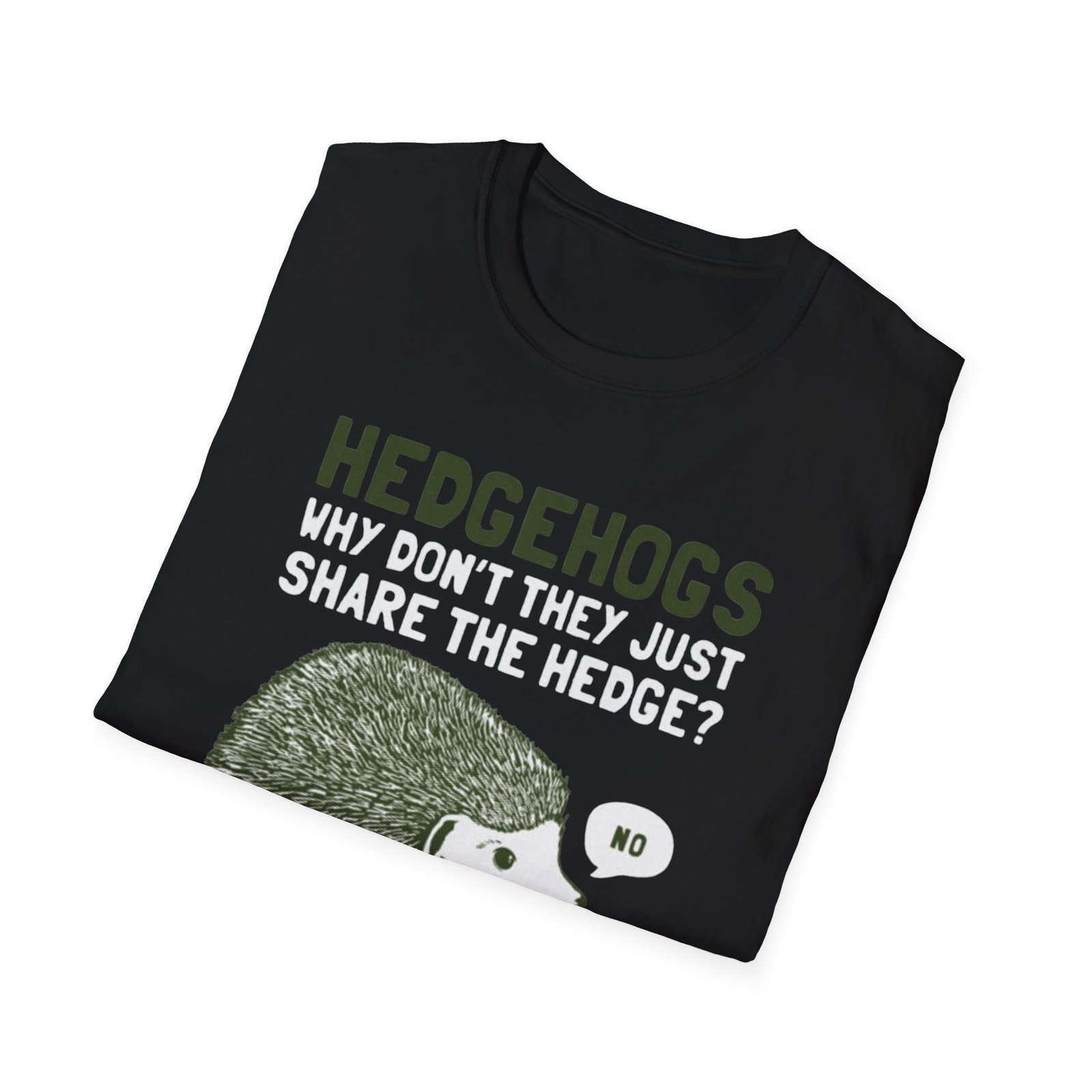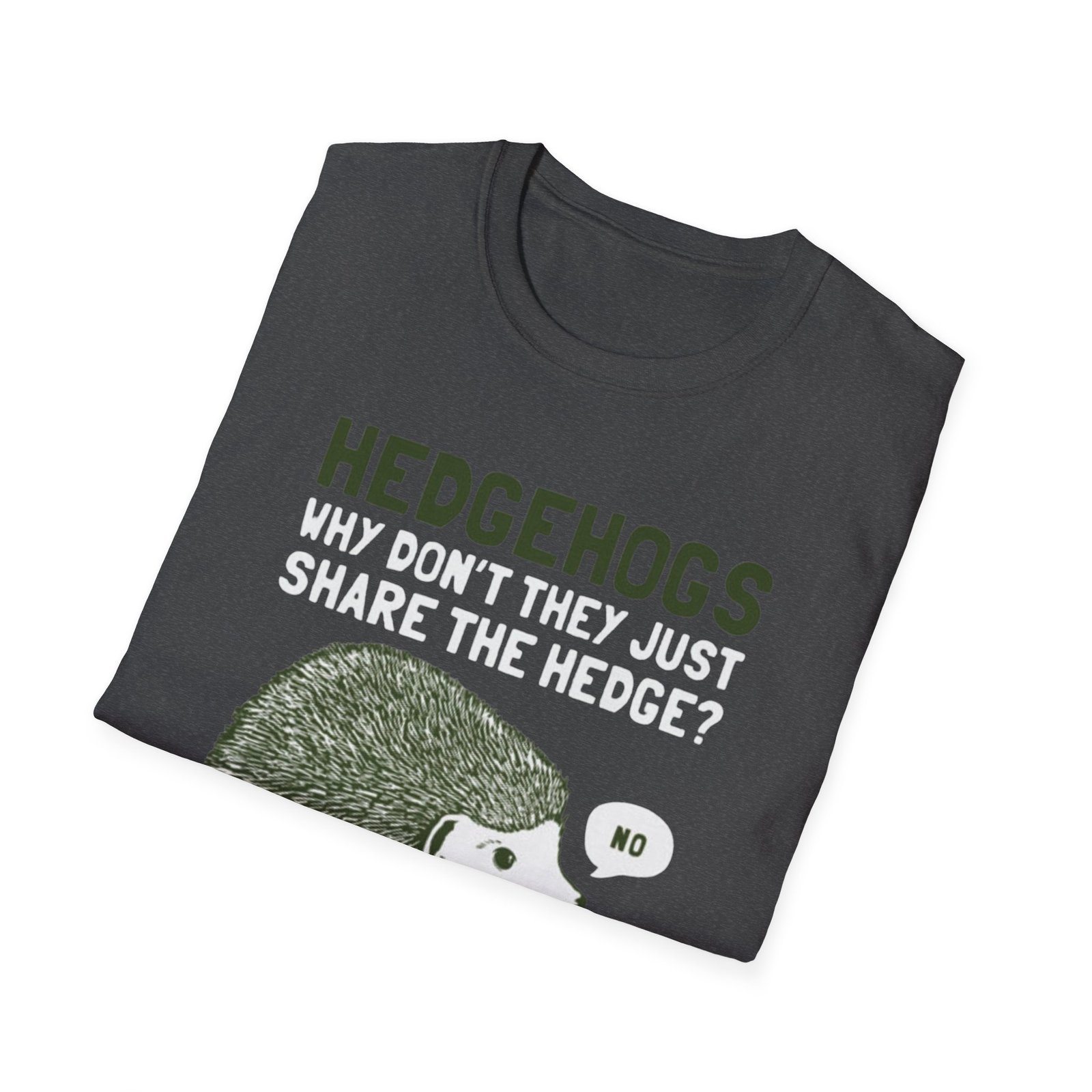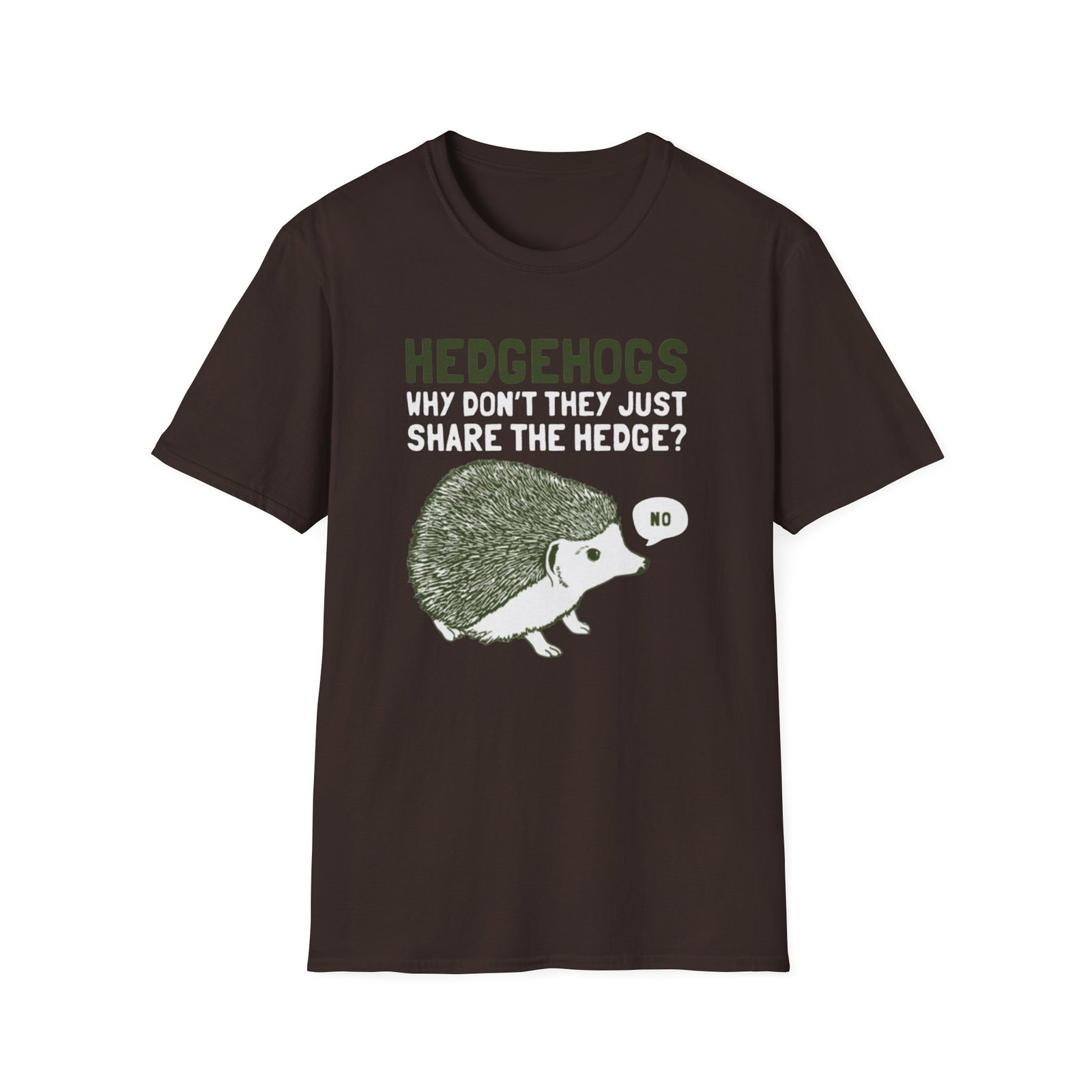Soft, witty, and quietly charming — this lightweight tee carries a cheeky woodland joke that slips easily into everyday wear. The front print shows a grumpy hedgehog alongside the line “HEDGEHOGS — WHY DON’T THEY JUST SHARE THE HEDGE? — NO,” rendered in textured greens and off-white for a vintage, hand-printed feel. It drapes lightly over the body without cling, so the graphic sits comfortably whether you’re out for a quick walk, running errands, or settling in with a book. Breathable ring-spun cotton keeps you cool; the ribbed crew neck and shoulder tape mean the shape stays true wash after wash. Wear it with faded jeans, layer under a flannel, or keep it as your go-to casual top when you want a little nature-humor in your day.