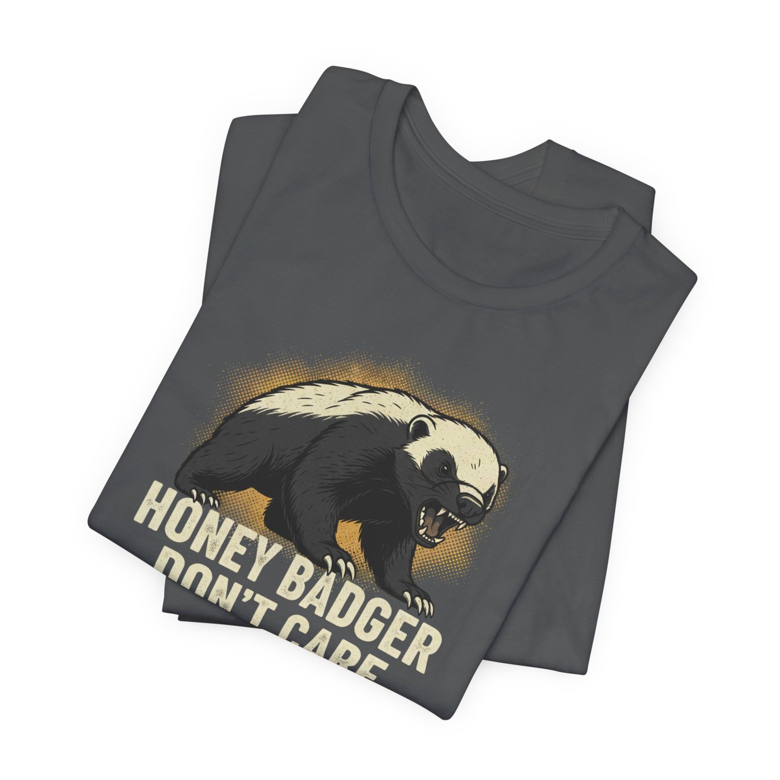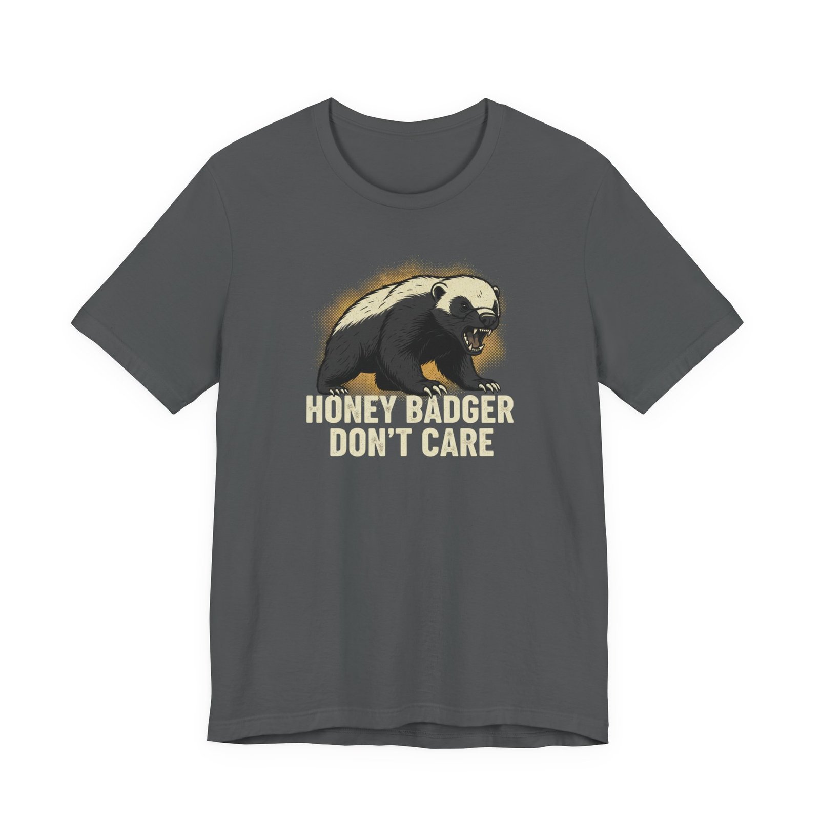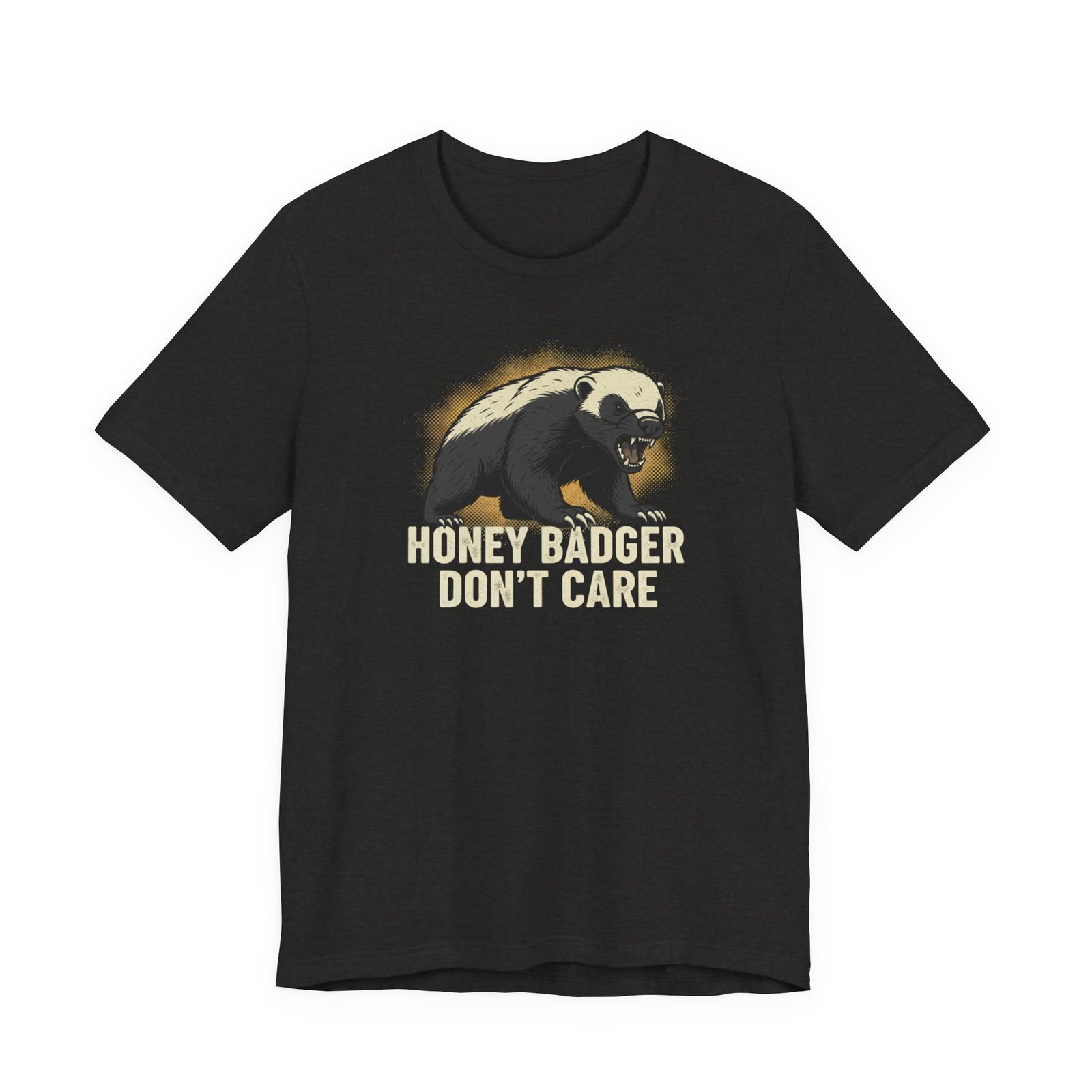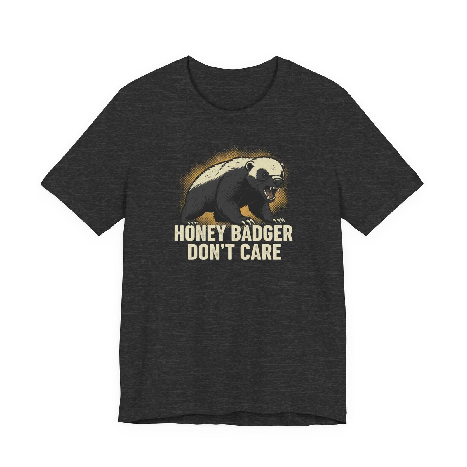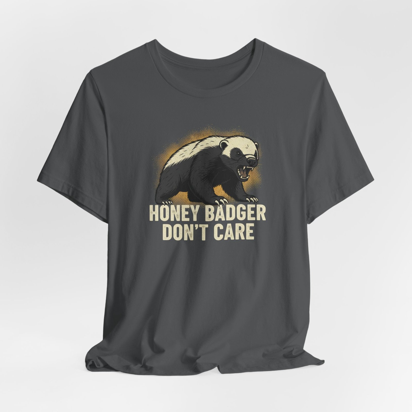 Slip into a tee that speaks in short, honest sentences. This lightweight cotton shirt carries a bold honey badger illustration and the blunt line “HONEY BADGER DON’T CARE” — a quiet badge for people who favor stubborn humor over small talk. It drapes easily for errands, hikes, or late-night hangouts, and the crew neck keeps the silhouette clean so the artwork stays the focus. Wear it when you want your attitude stated without fuss: rugged, a little cheeky, and built to last through the wash and the weekend.