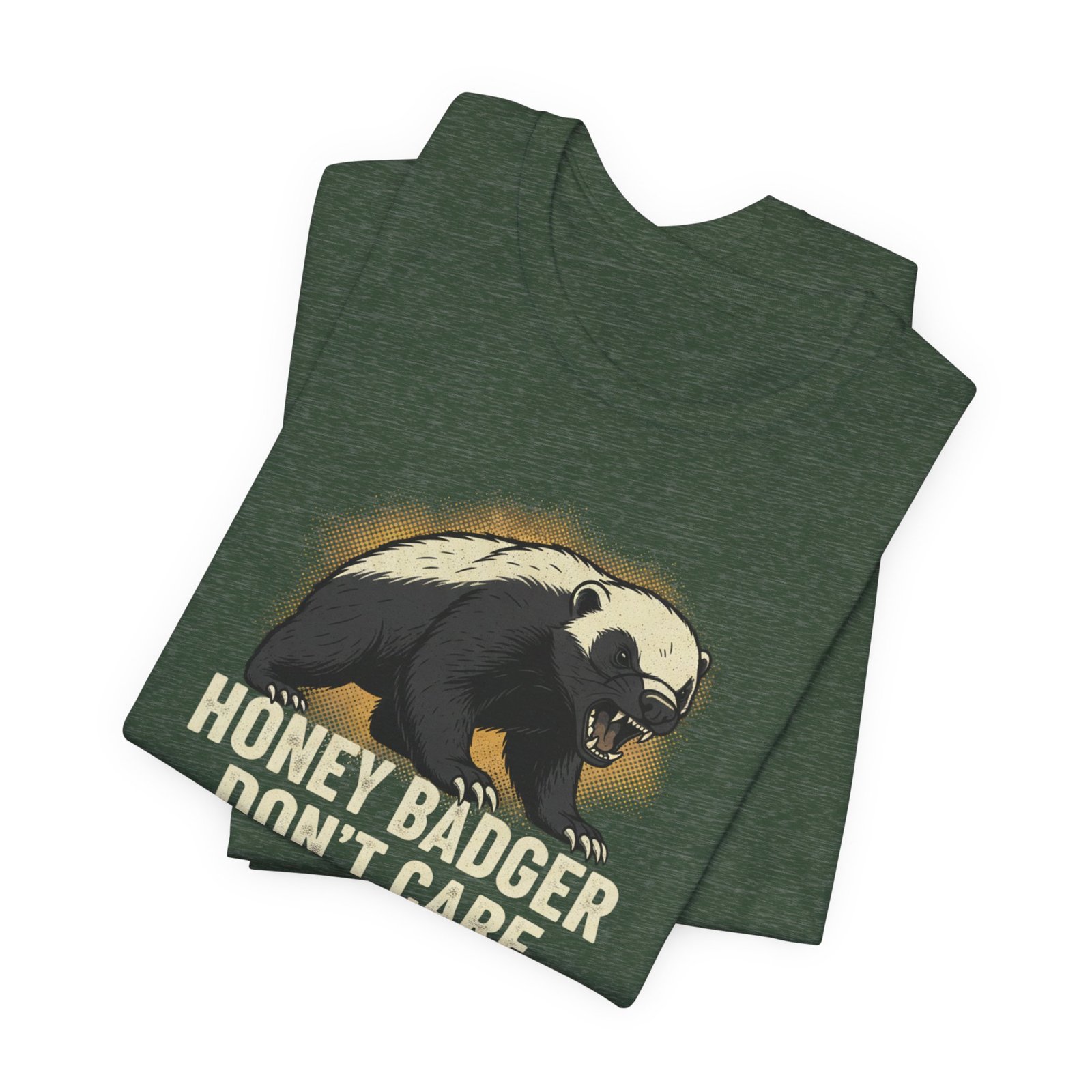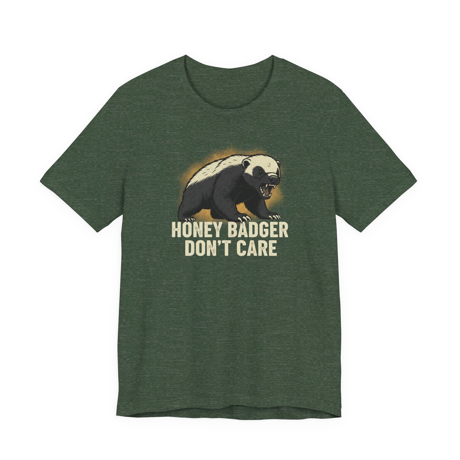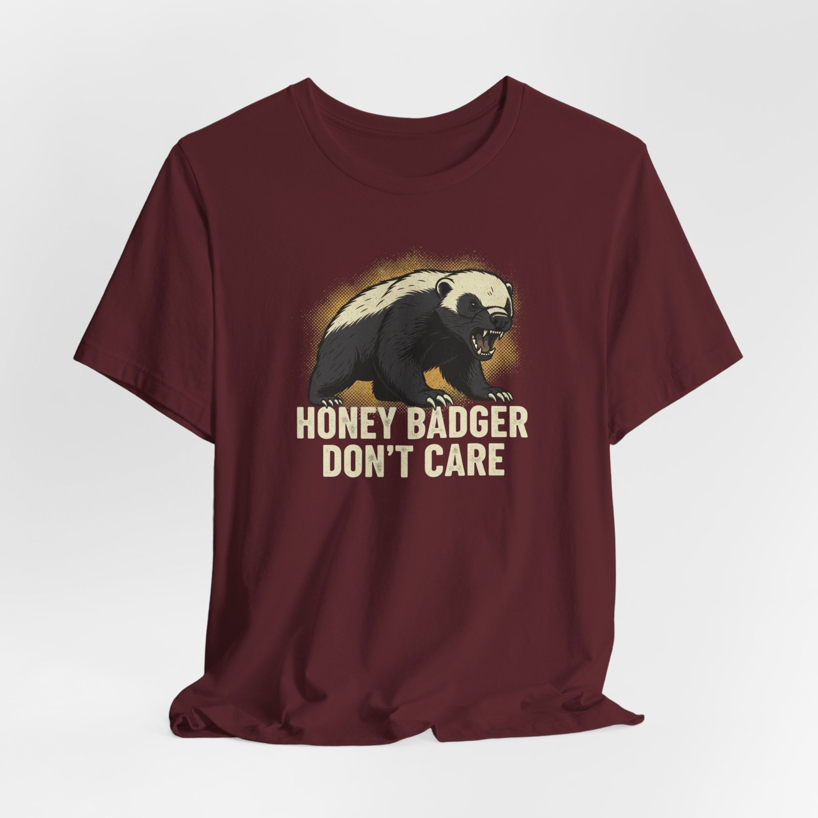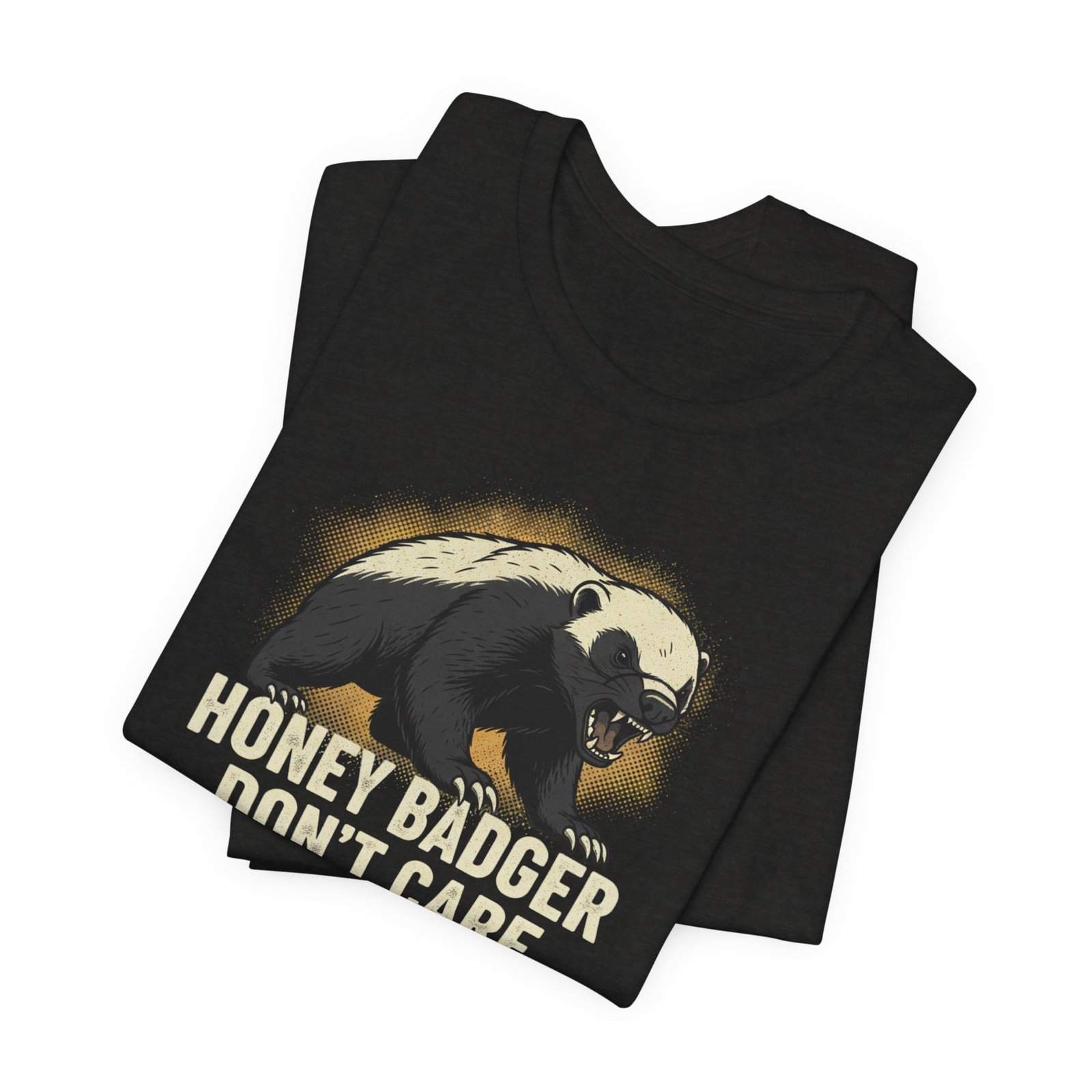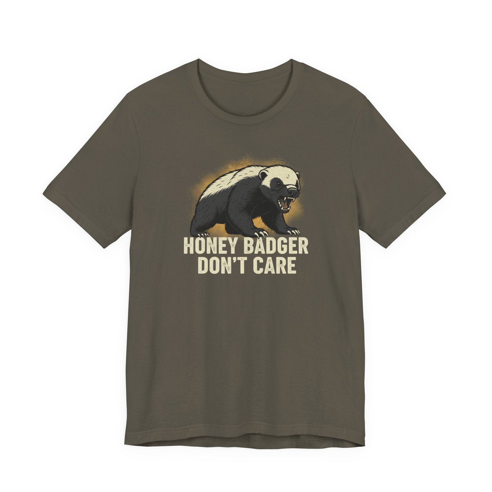 Slip into a tee that speaks in short, honest sentences. This lightweight cotton shirt carries a bold honey badger illustration and the blunt line “HONEY BADGER DON’T CARE” — a quiet badge for people who favor stubborn humor over small talk. It drapes easily for errands, hikes, or late-night hangouts, and the crew neck keeps the silhouette clean so the artwork stays the focus. Wear it when you want your attitude stated without fuss: rugged, a little cheeky, and built to last through the wash and the weekend.