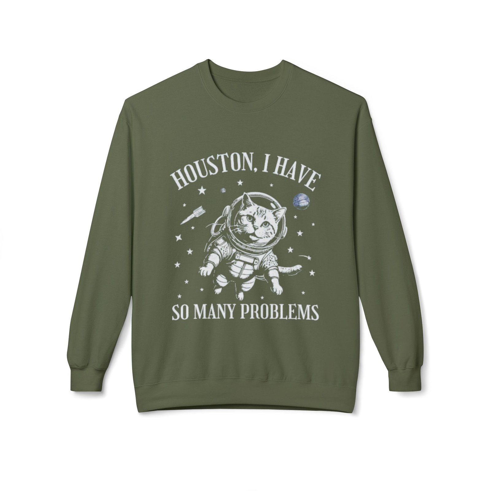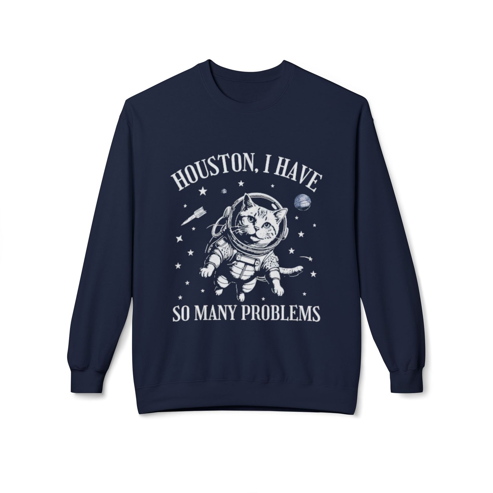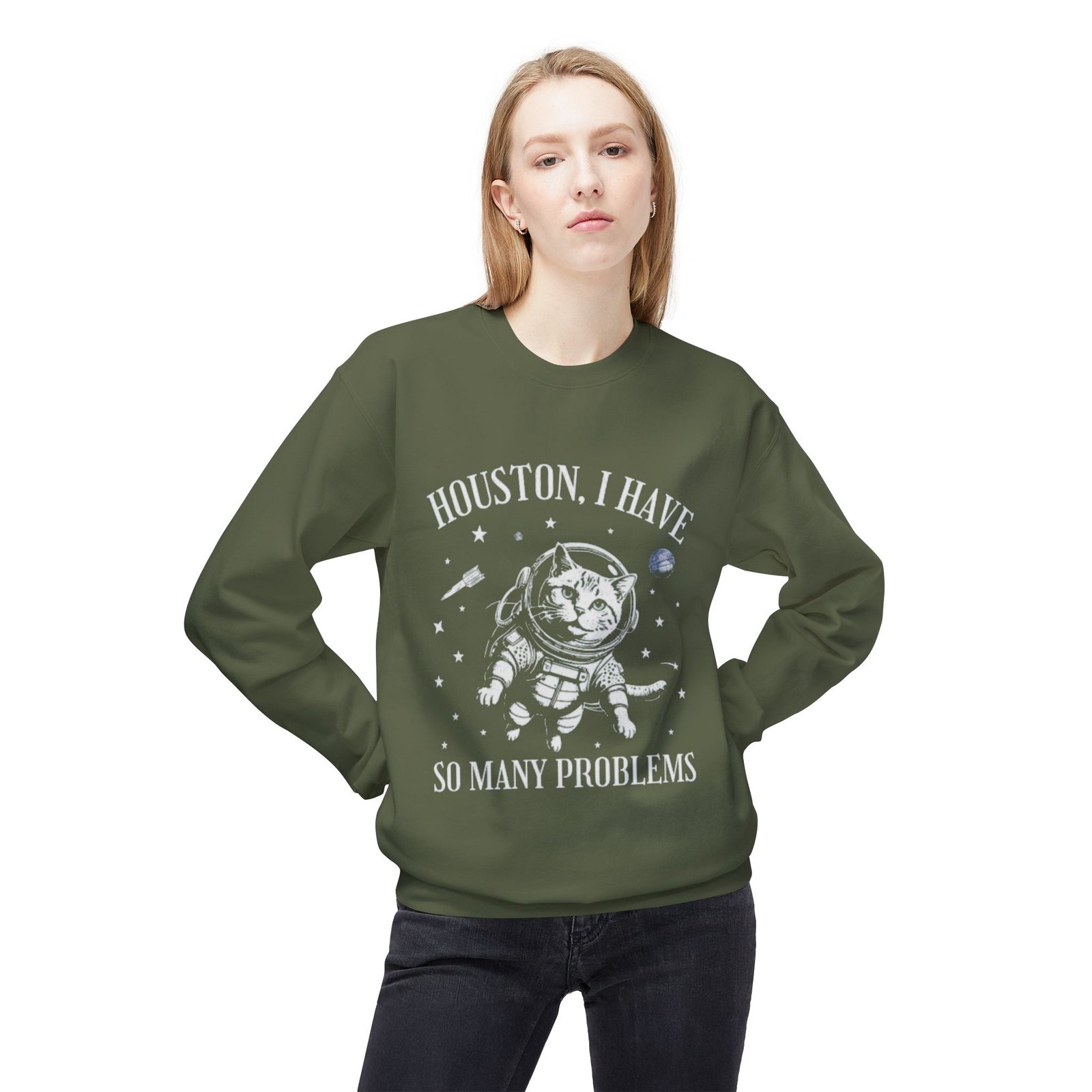 This midweight crewneck pairs cozy everyday wear with a wink of cosmic humor. A relaxed, classic-fit sweatshirt in a soft ring-spun cotton blend features a monochrome astronaut cat design and the line “Houston, I have so many problems,” making it an easy choice for laid-back evenings, late-night study sessions, or casual weekend outings. The dropped shoulders and tubular knit give it a roomy, lived-in silhouette while ribbed cuffs and hem with spandex keep the shape where it counts. It feels like the sweatshirt you reach for when you want comfort and a bit of personality—perfect for anyone who loves space, cats, or dry, self-aware humor.
